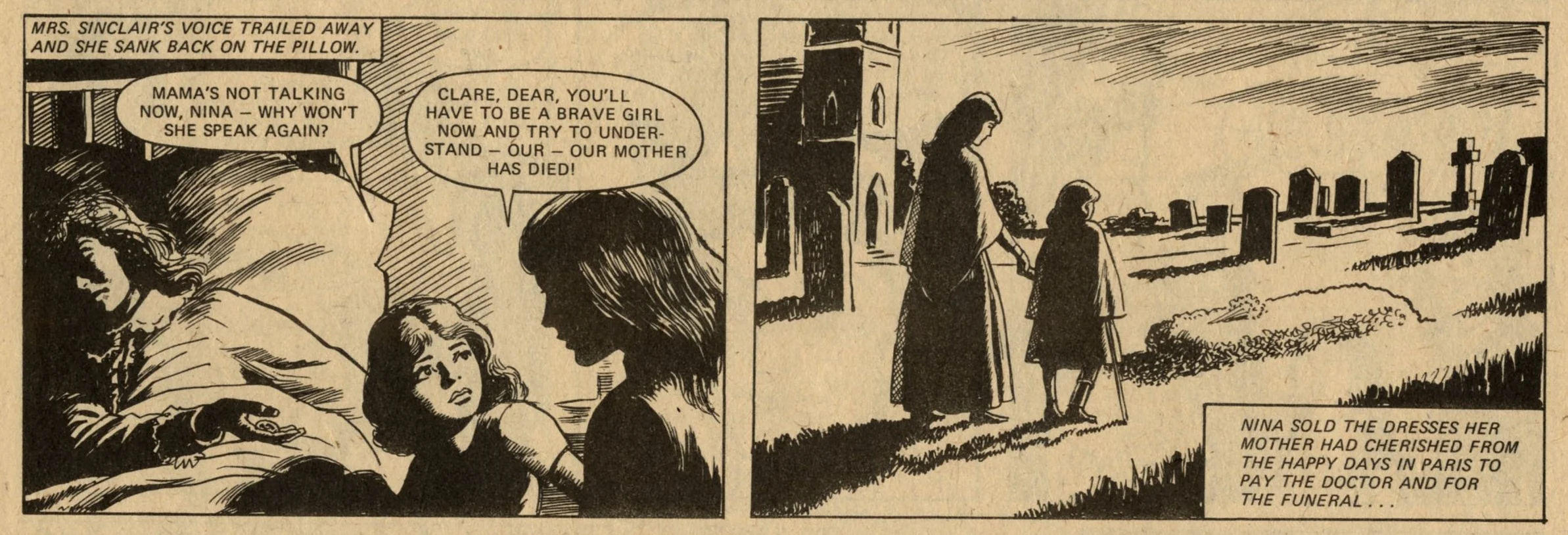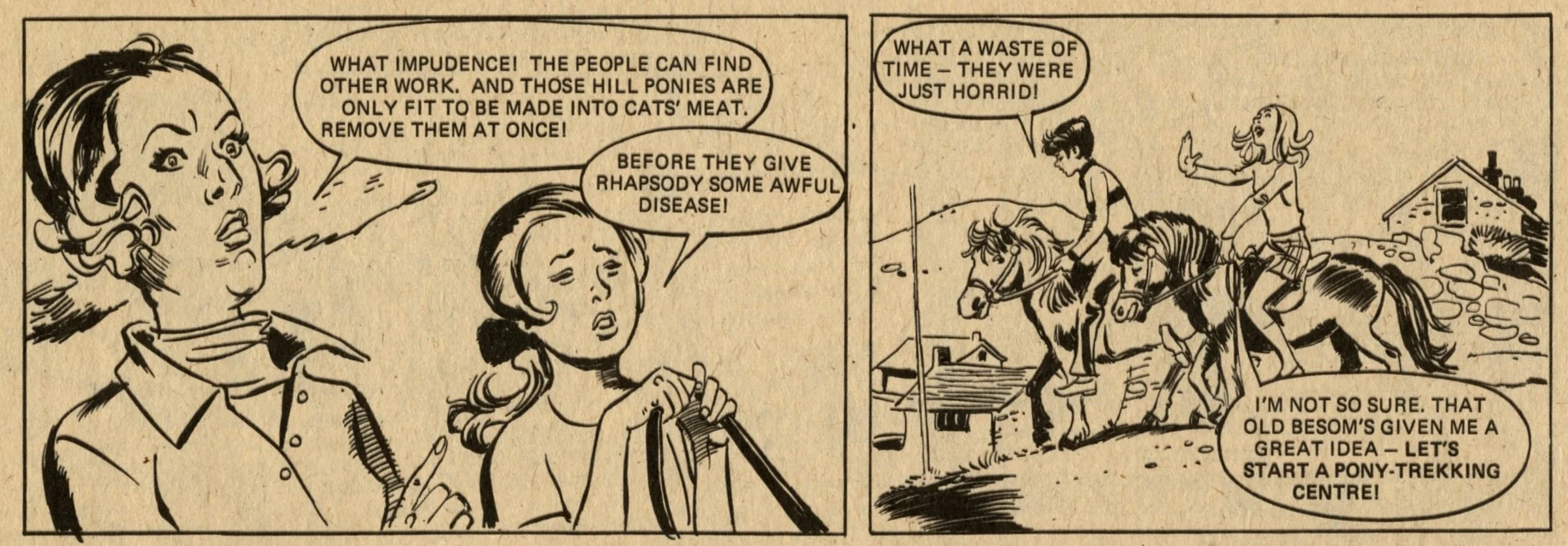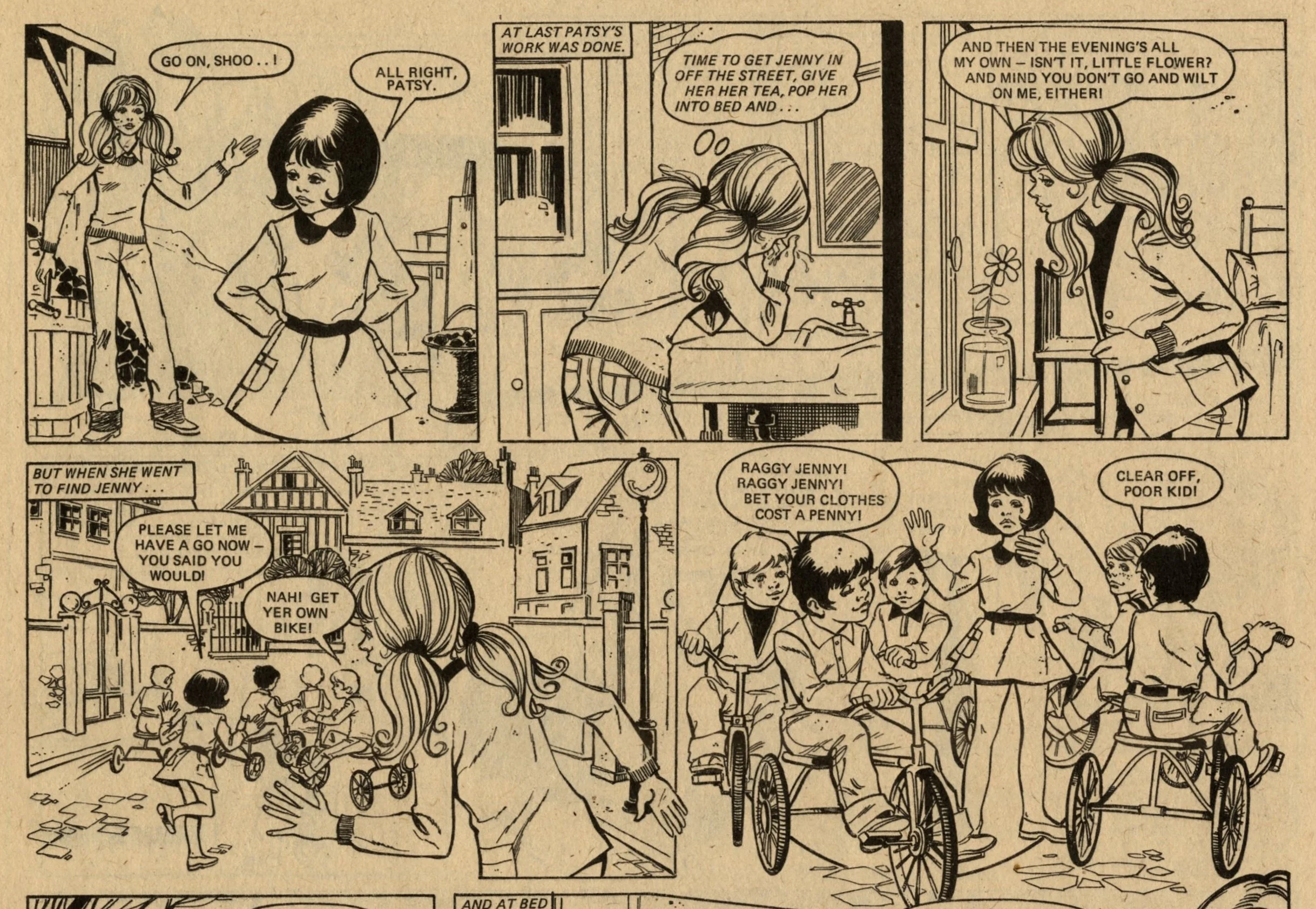 The comic strip content is similar to what was appearing in other girls comics of Lindy’s day, but more enjoyable to read due to the better print quality. Pavement Patsy and The Tin-mine Ponies are contemporary stories of girls fighting against hard times. Nina Nimble Fingers and Hard Days for Hilda are historical stories of orphan girls, also fighting against hard times. Jane’s Jeannie and Sophie’s Secret Squeezy follow the adventures of schoolgirls who discover a magical device (Jane has a genie in a tennis racquet, and Sophie has a plastic bottle that produces bubbles which give her advice about the future). More intriguing (to me) are The Last Green Valley – in the year 2000 Europe is in the grip of an Ice Age, and a group of friends set out from their village to find a legendary unfrozen valley – and properly spooky haunted house tale The House of Fear.