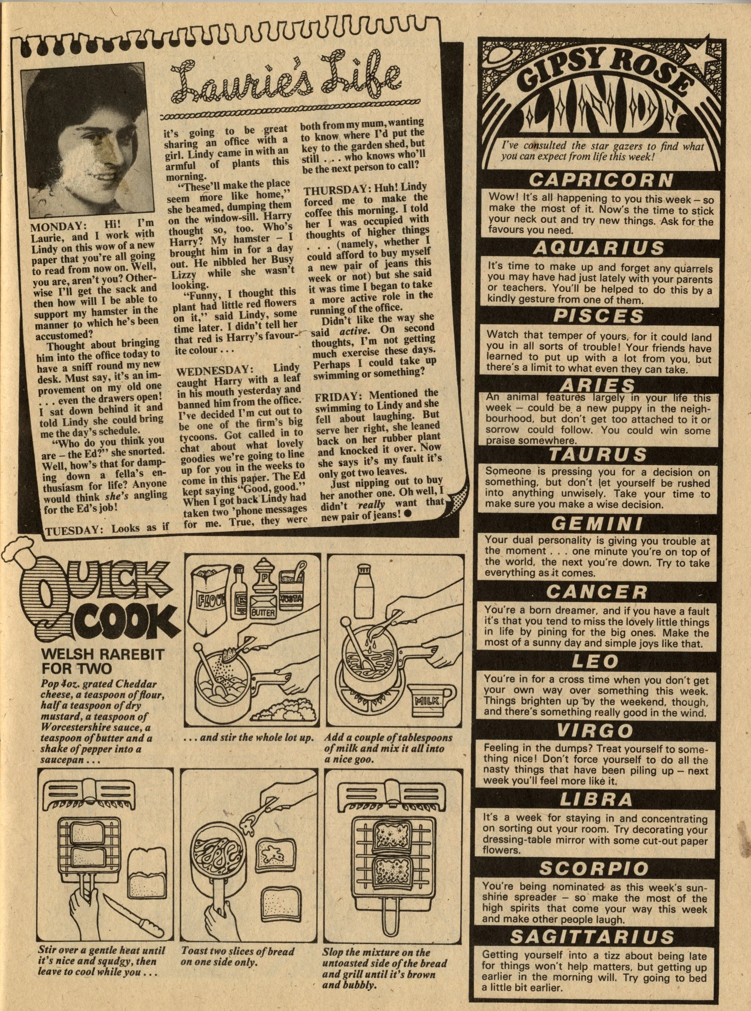 The comic features two ‘real life’ characters who work in the editorial office an each have their own page with a photo by-line. Lindy runs the letters page (featuring letters in this first issue that were submitted to Jinty – a shame for any of those Jinty readers who may have missed seeing their names in print here in this new comic!), and Laurie writes a diary column. Laurie is set up as loveably accident-prone (his pet hamster Harry nibbles the flowers that Lindy brought in to decorate the office) and I suspect the intention here is that there will be a romantic tension between the two.
