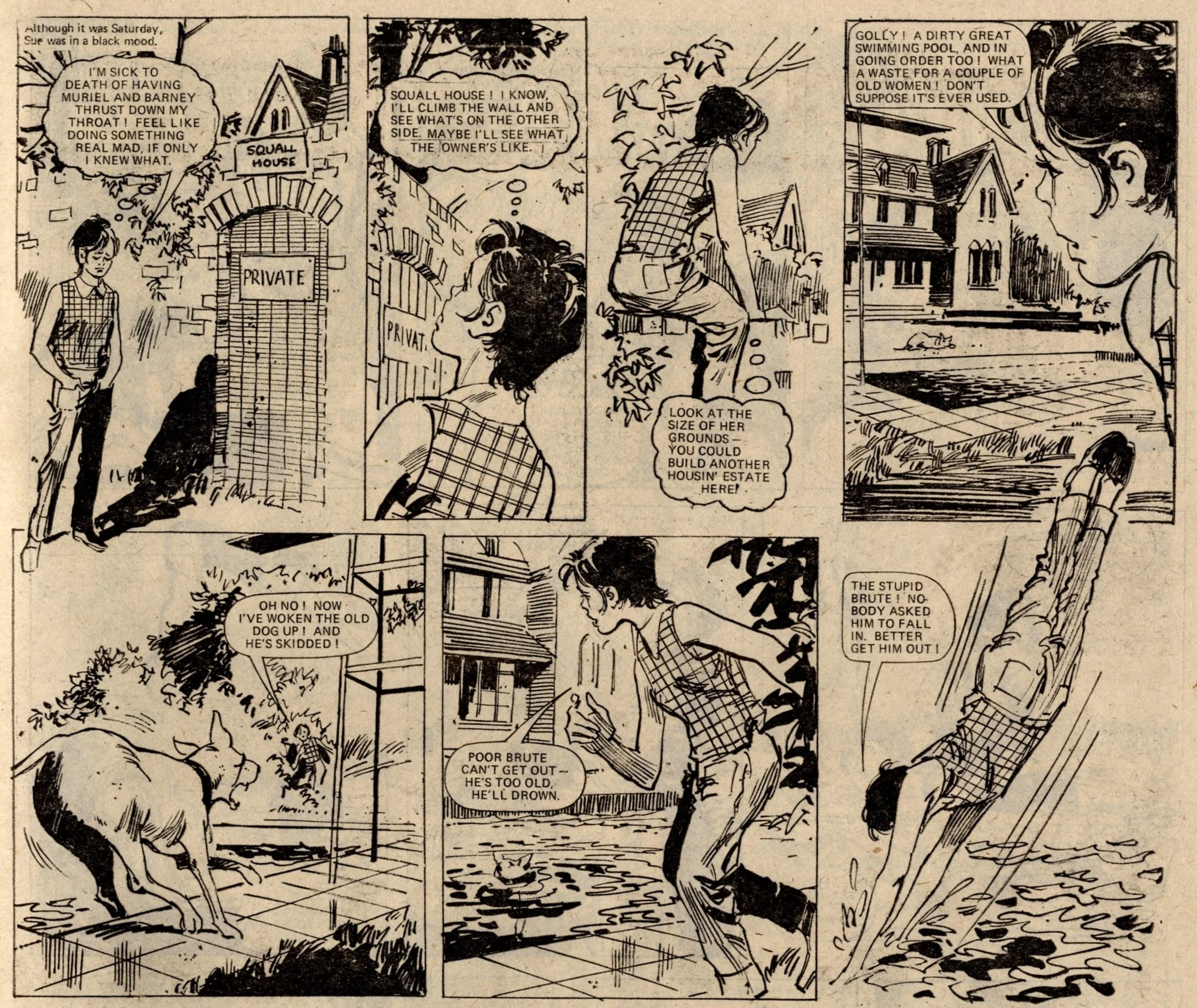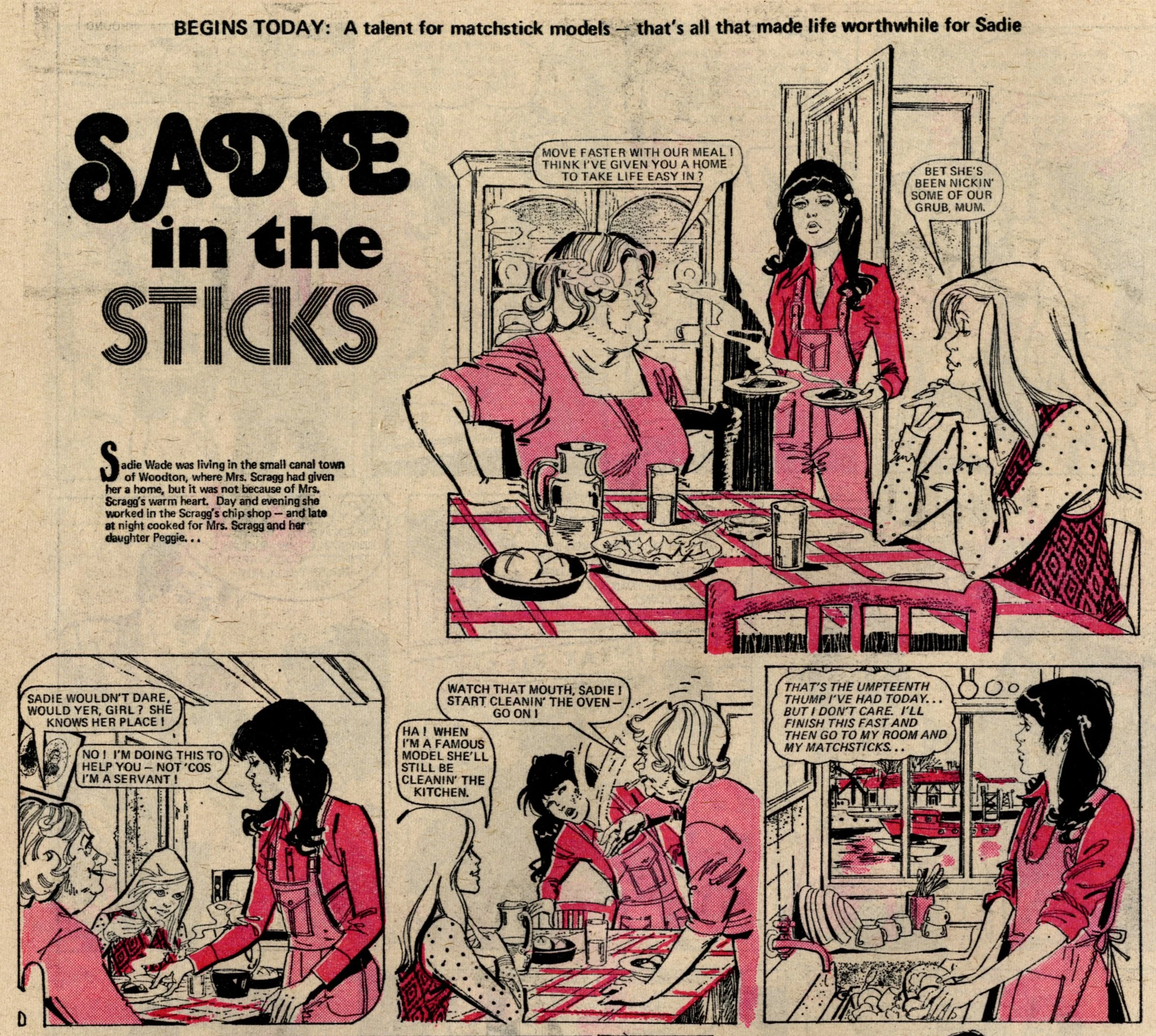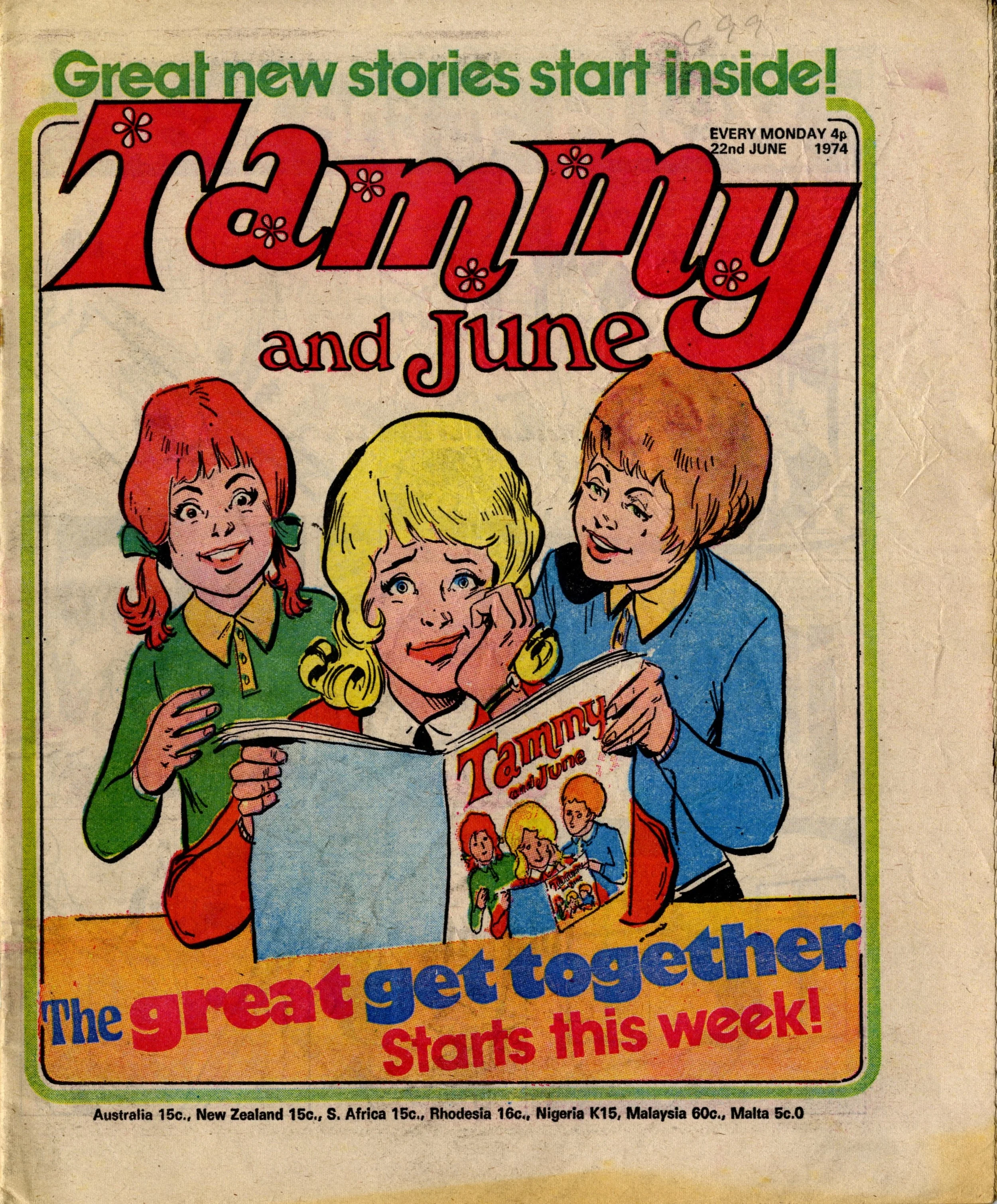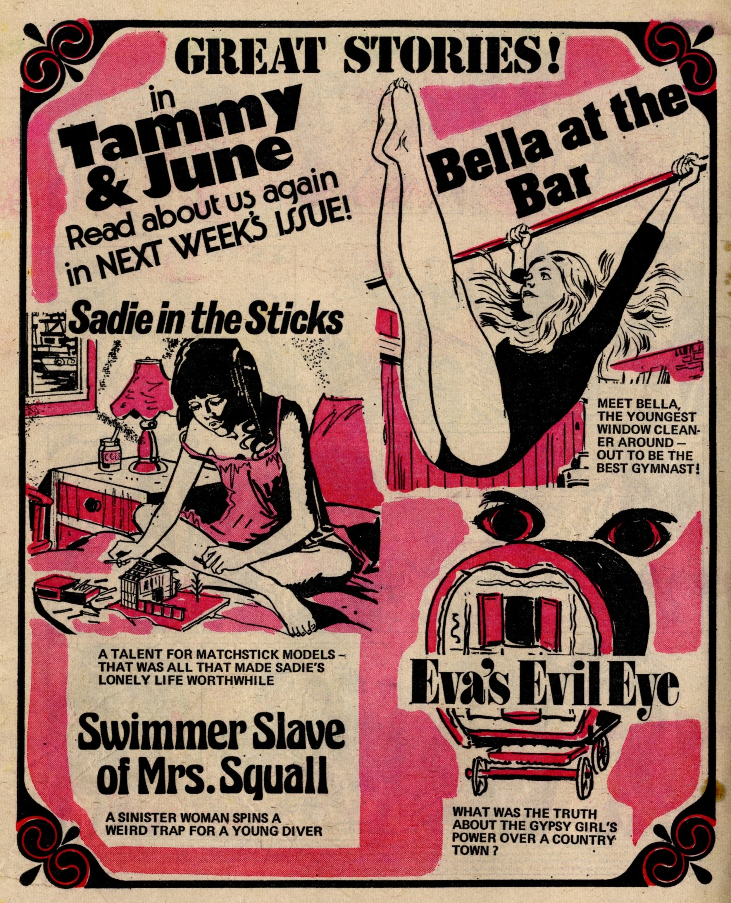 On this day, 22 June 1974 … It was the date of ‘The great get together’ as June, thirteen years after its launch, merged into Tammy, just three years into its own thirteen-year run – an intersection point between two of the biggest girls’ comics of the 1960s and the 1970s. In addition to all her readers, June brought just two strips with her – Bessie Bunter and the one-off tales of The Storyteller – while Tammy retained Wee Sue, Jeannie and her Uncle Meanie and the long-running classic No Tears for Molly. A number of new serials began: Sadie in the Sticks, in which a girl escapes her troubles and worries through her hobby of making matchstick models (a rather thin premise for a story but that’s all we’re given to go on in this first episode - …), Swimmer Slave of Mrs Squall, in which a disillusioned schoolgirl with an unrealised talent for diving is discovered by the mysterious owner of the Squall housing estate, Eva’s Evil Eye, in which a gypsy girl tricks the bullies at her new school into thinking she has sinister magical powers.