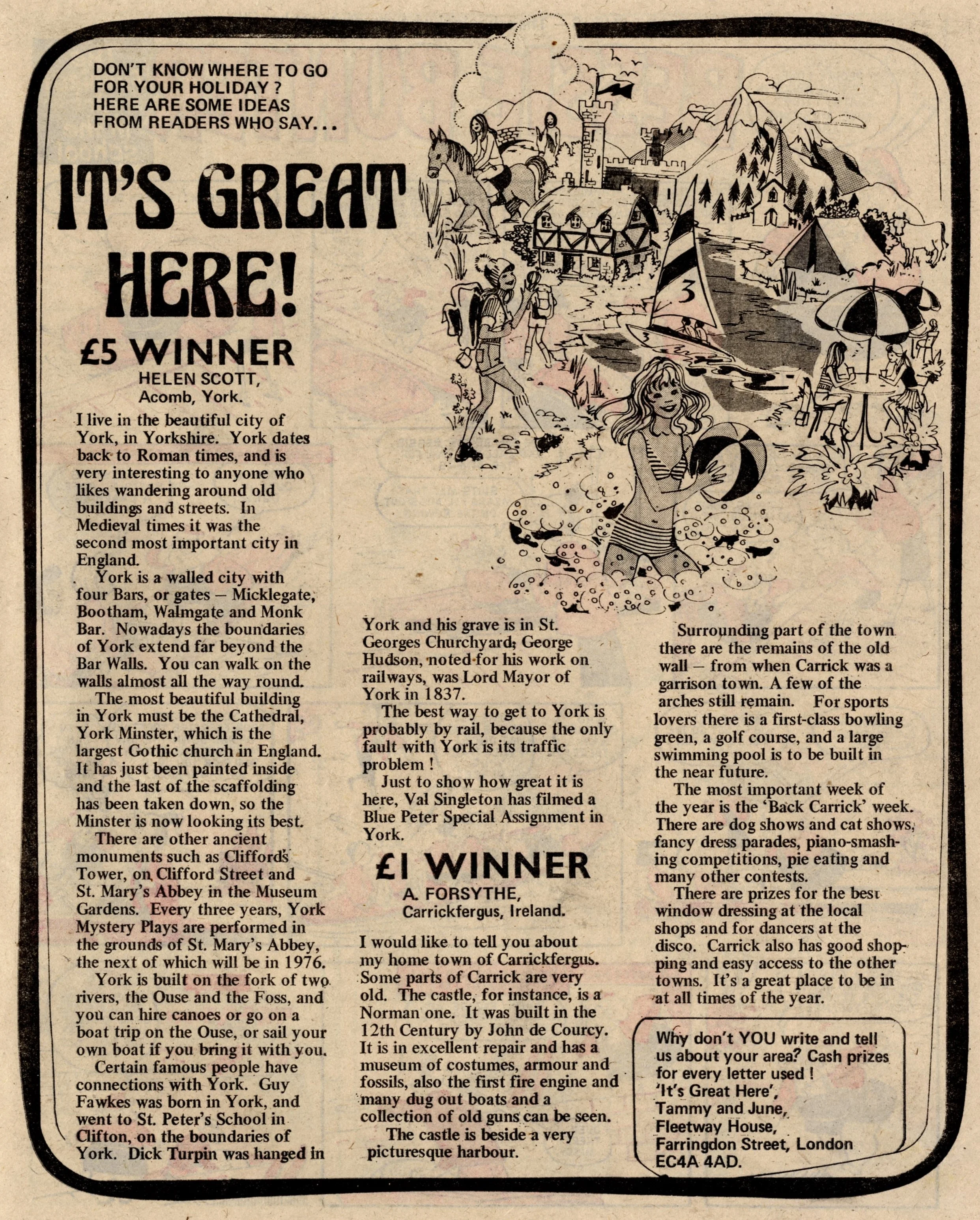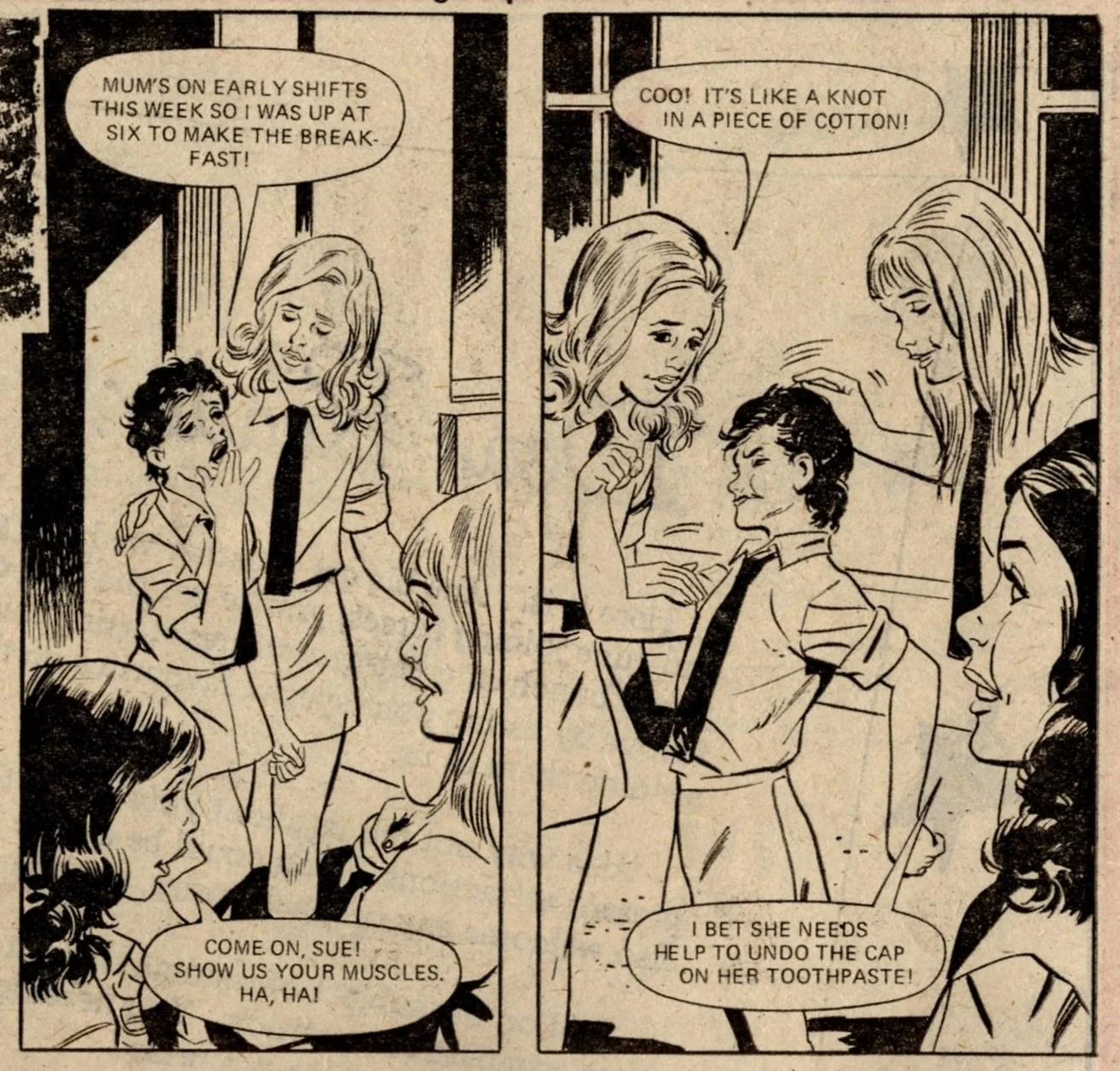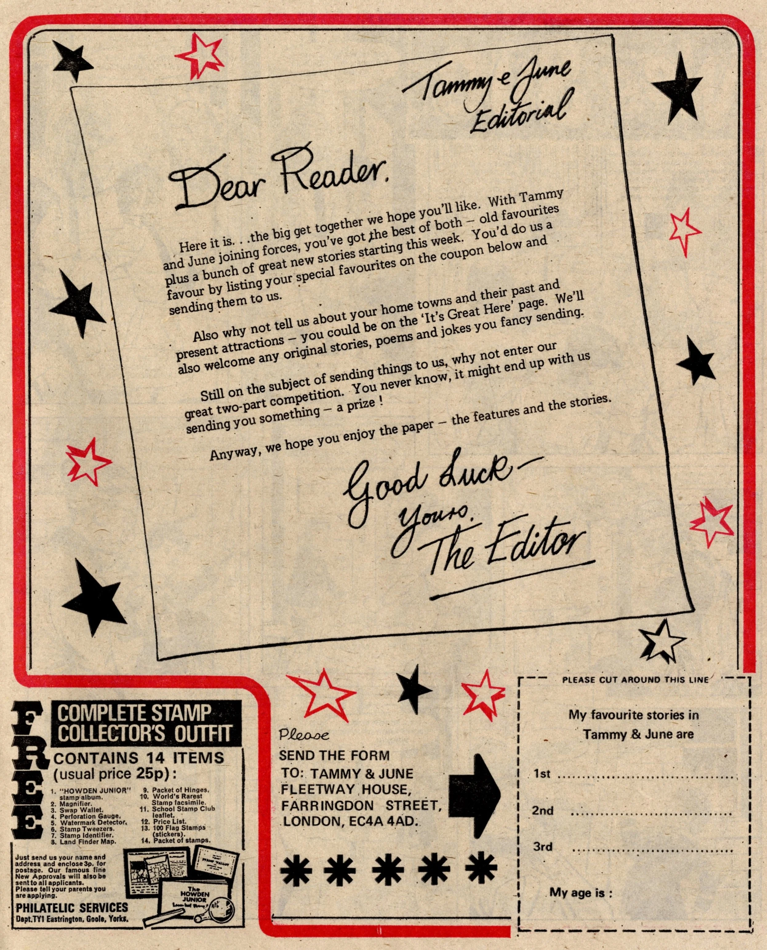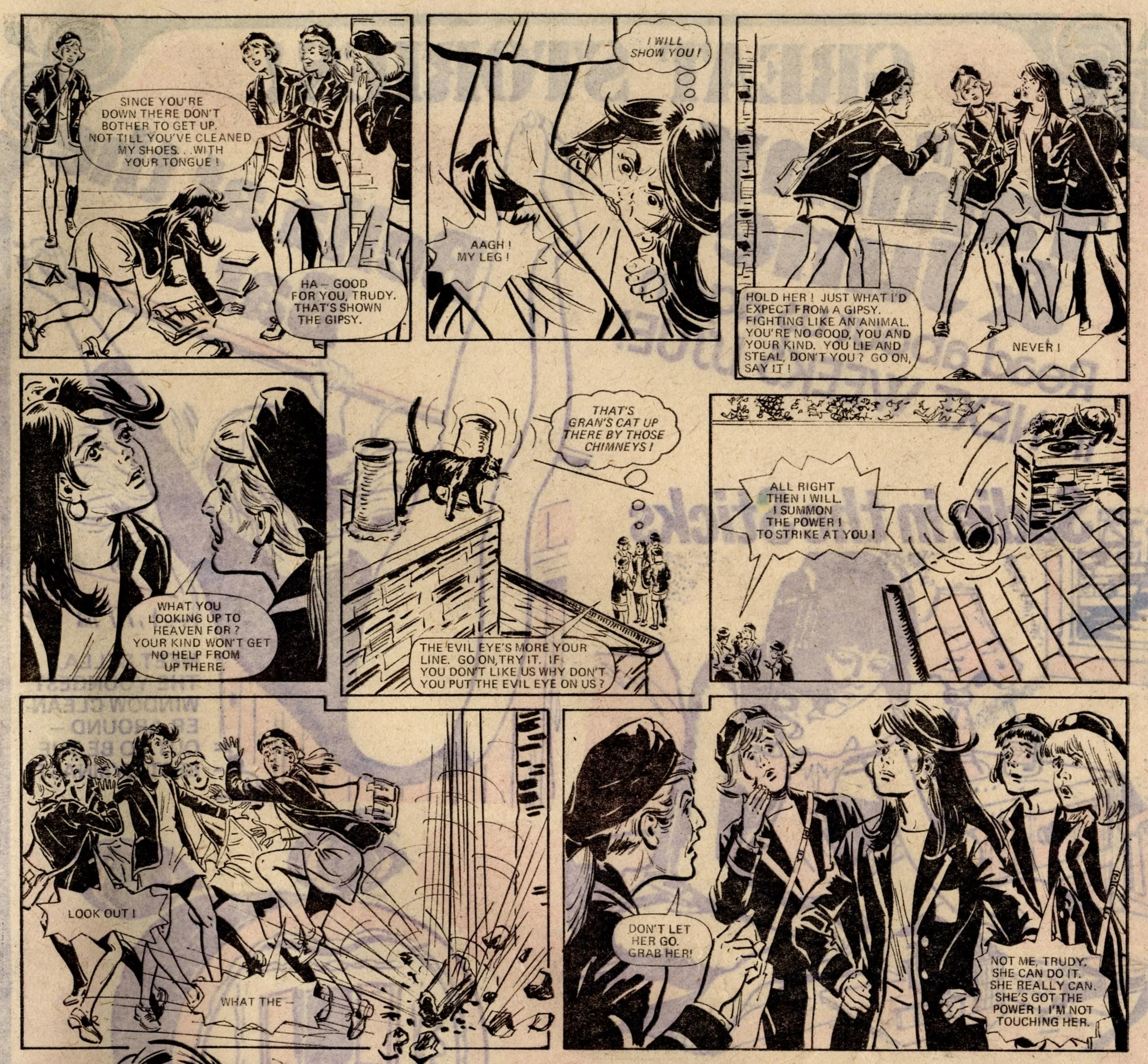 On this day, 22 June 1974 … It was the date of ‘The great get together’ as June, thirteen years after its launch, merged into Tammy, just three years into its own thirteen-year run – an intersection point between two of the biggest girls’ comics of the 1960s and the 1970s. In addition to all her readers, June brought just two strips with her – Bessie Bunter and the one-off tales of The Storyteller – while Tammy retained Wee Sue, Jeannie and her Uncle Meanie and the long-running classic No Tears for Molly. A number of new serials began: Sadie in the Sticks, in which a girl escapes her troubles and worries through her hobby of making matchstick models (a rather thin premise for a story but that’s all we’re given to go on in this first episode - …), Swimmer Slave of Mrs Squall, in which a disillusioned schoolgirl with an unrealised talent for diving is discovered by the mysterious owner of the Squall housing estate, Eva’s Evil Eye, in which a gypsy girl tricks the bullies at her new school into thinking she has sinister magical powers.
