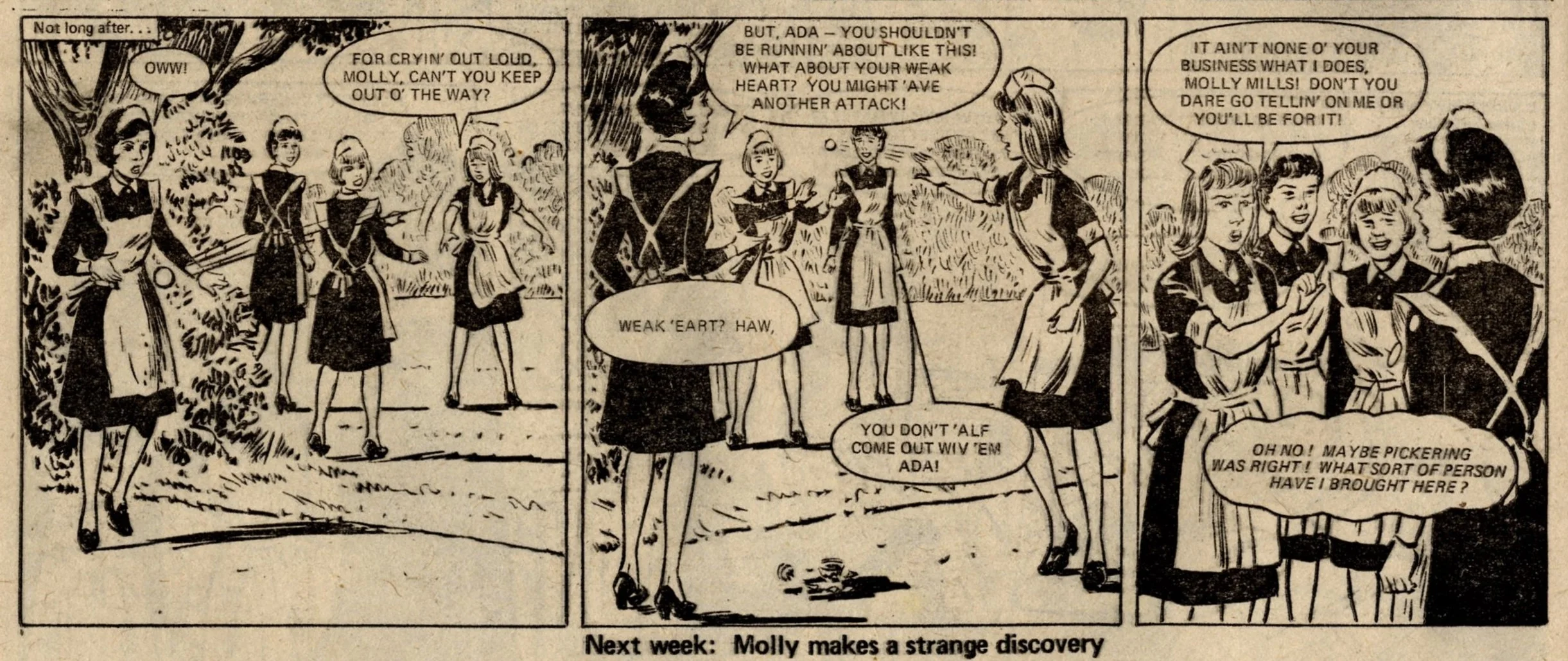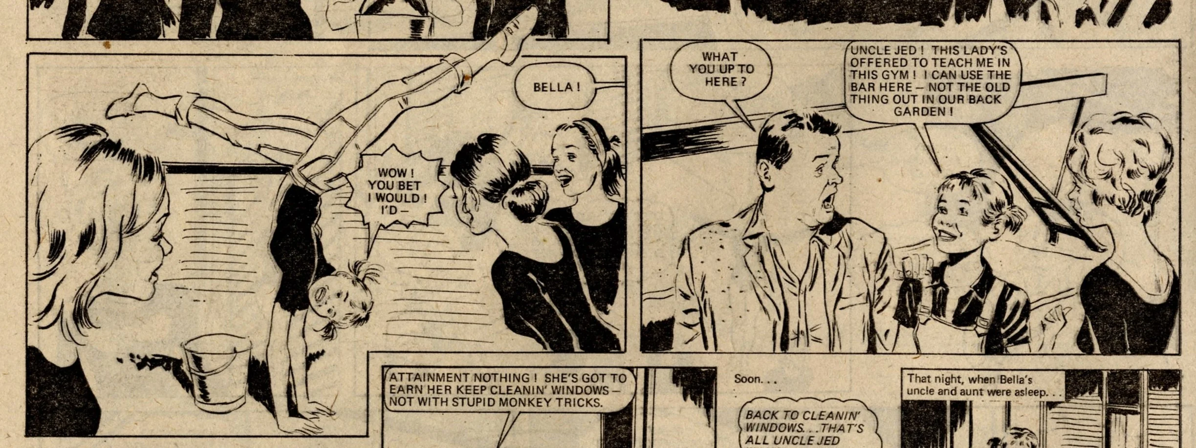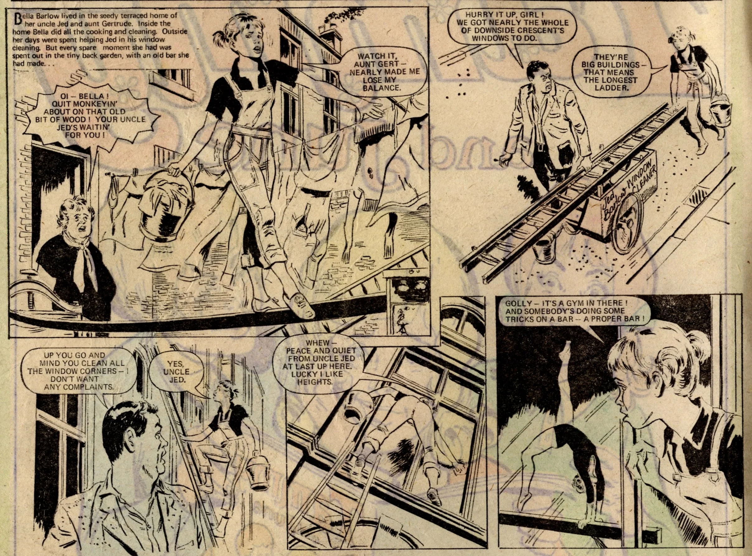 The most significant aspect of this issue is the debut of Bella at the Bar. Bella would go on to become one of Tammy’s longest-serving characters, eventually claiming the front cover of the comic for her own. From what I’ve read online, she’s not remembered with universal fondness – there is a mix of likes and dislikes. As a hardworking but plucky orphan living with her harsh uncle and aunt (in a ‘seedy terraced house’, according to the opening caption), doing good and righting wrongs through her talents as a gymnast, she has the promise of a good, interesting character. There’s something a little too upright, worthy and superior about Bella though, which may be one of the reasons she’s not everybody’s favourite.