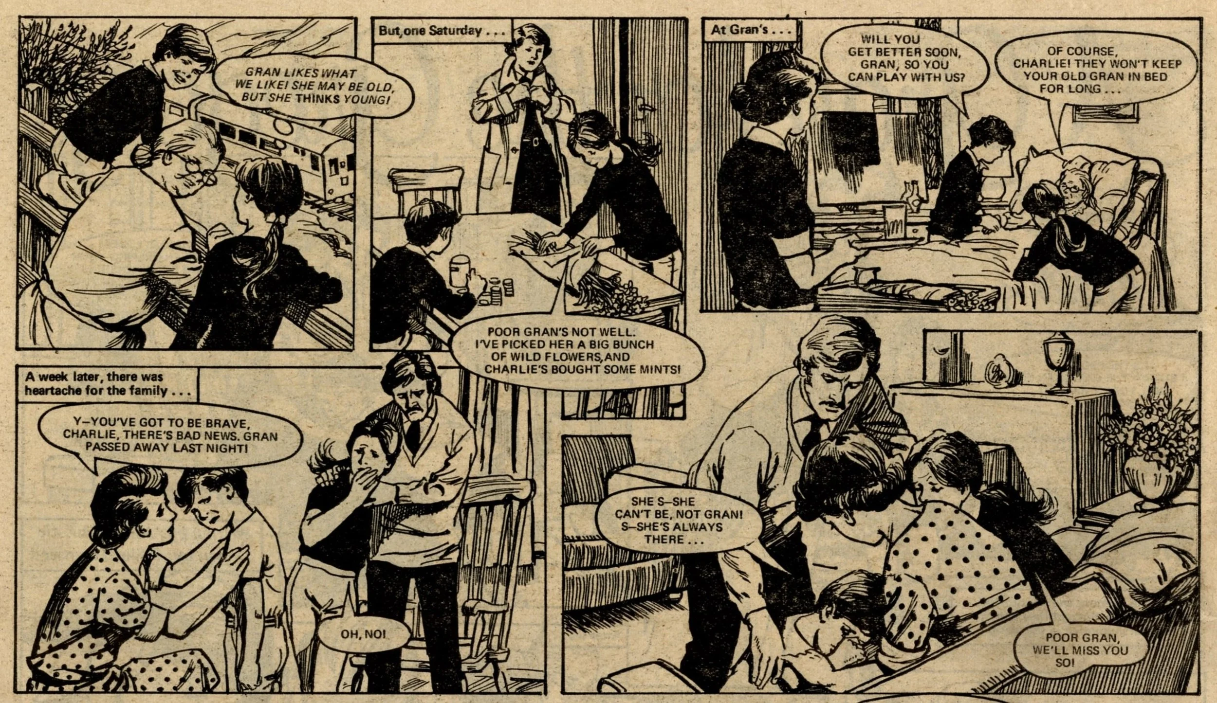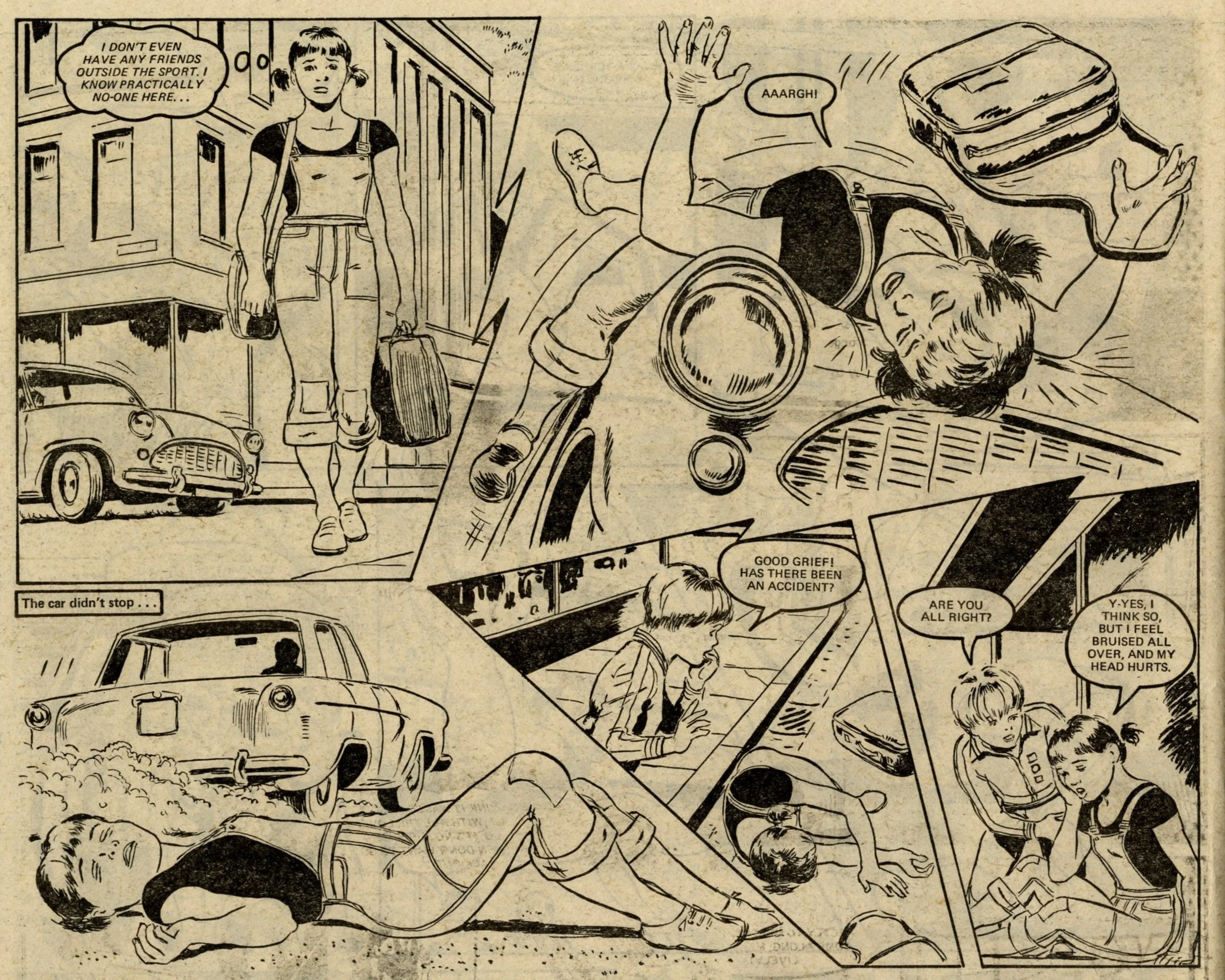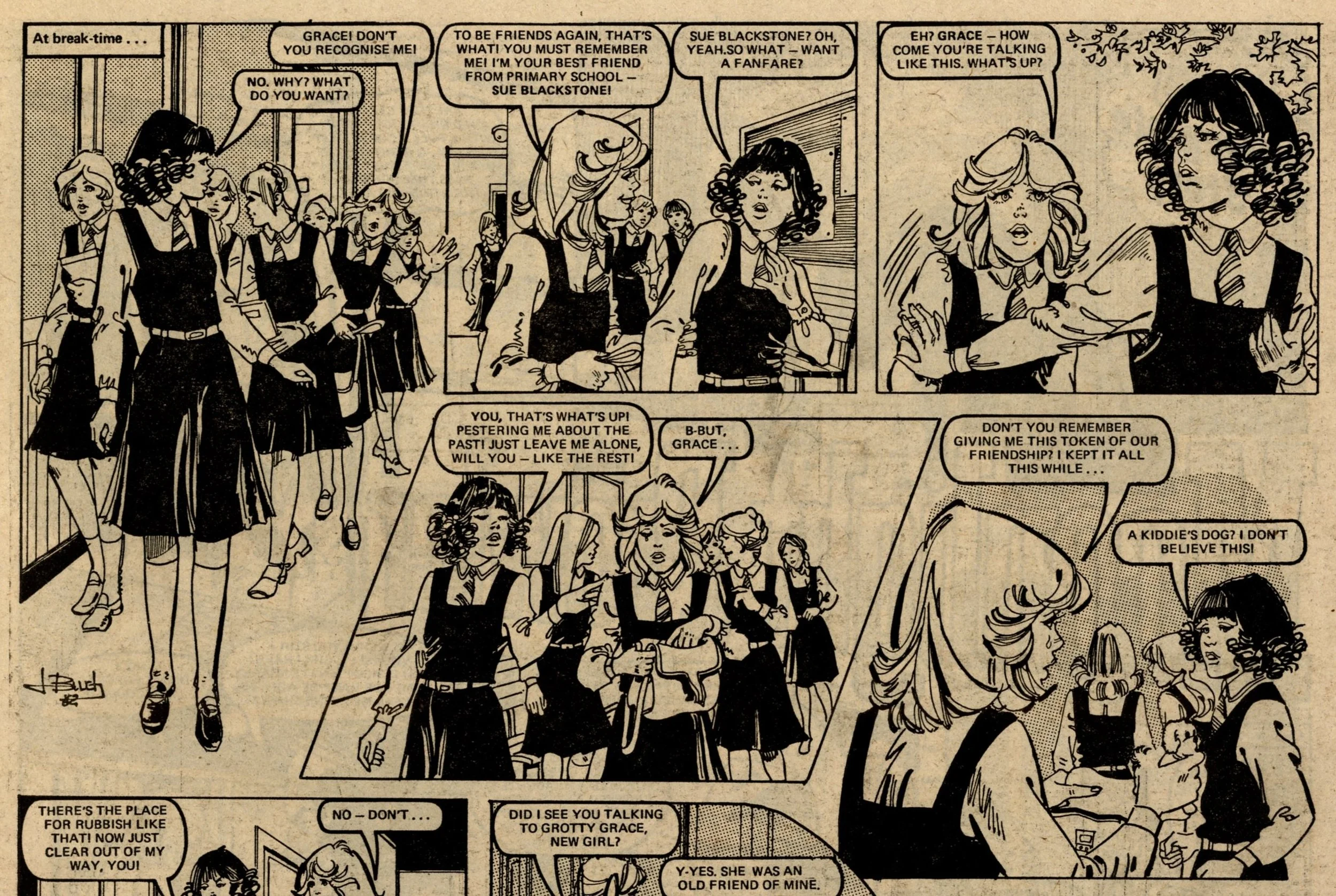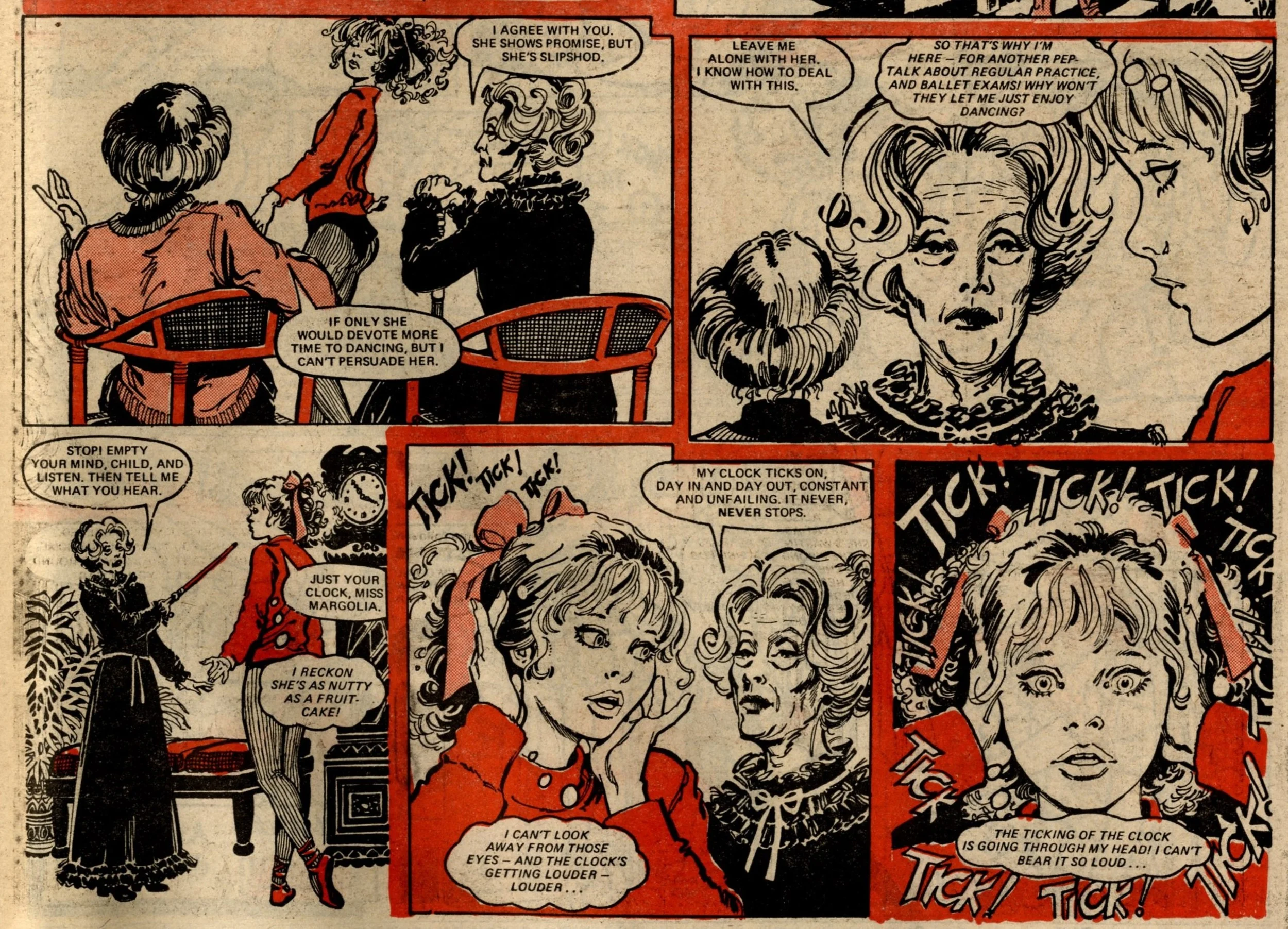 Old favourites Bella, Pam of Pond Hill and young nanny Nanny Young are the only serials to cross over from the previous week. The new adventures are a strong line-up, both in storyline and artwork, and I’m grateful to discover that this issue also sees the introduction of writer and artist credits on most of the strips – this first time that this happened in a girls’ comic, I believe. Saving Grace, written by Ian Mennell and drawn by Juliana Buch, tells the story of two old primary school friends reunited at secondary school, only for one to discover the other has become cold and distant. A Gran for the Gregorys, written by Alison Christie and drawn by Phil Townsend, looks like a bit of a heart-tugger, as two kids hunt for an old lady to replace their beloved grandmother, who died on page two of the story. Come Back Bindi, written by Jenny McDade and drawn by Mario Capaldi, sees a rescue pup run away from her new owners after thinking she caused her owner to fall off her horse. And Slave of the Clock, written by Jay Over and drawn by Barrera Gesali, is a dark ballet tale in which a promising young dancer is trained using hypnotism by a harsh new teacher.