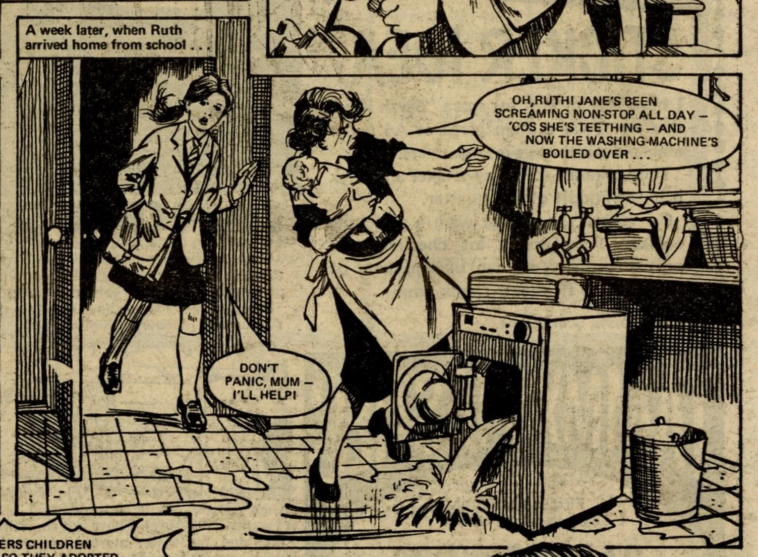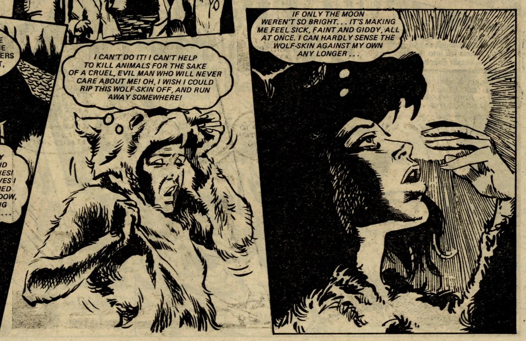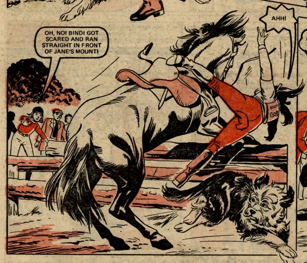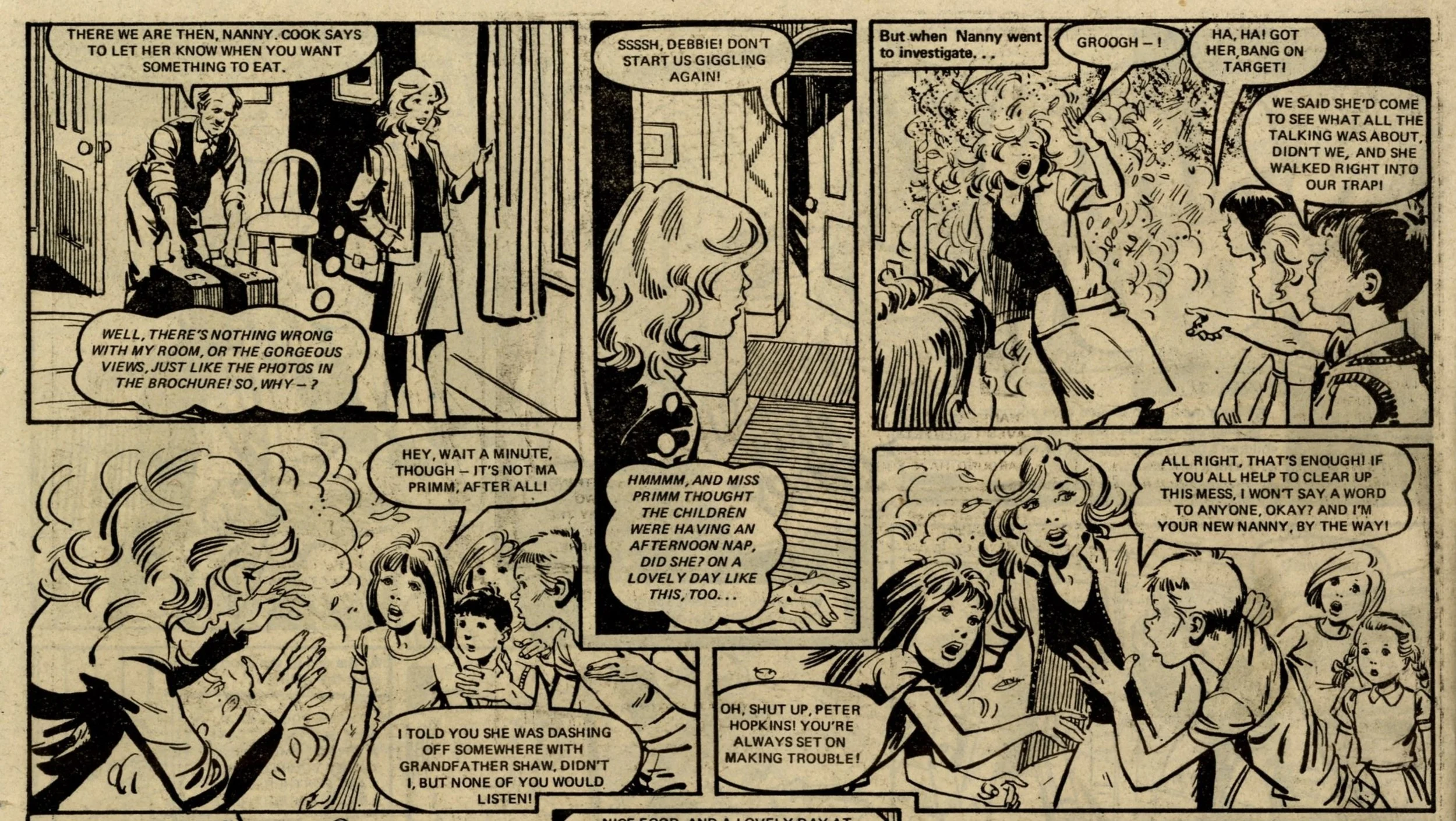 Old favourites Bella, Pam of Pond Hill and young nanny Nanny Young are the only serials to cross over from the previous week. The new adventures are a strong line-up, both in storyline and artwork, and I’m grateful to discover that this issue also sees the introduction of writer and artist credits on most of the strips – this first time that this happened in a girls’ comic, I believe. Saving Grace, written by Ian Mennell and drawn by Juliana Buch, tells the story of two old primary school friends reunited at secondary school, only for one to discover the other has become cold and distant. A Gran for the Gregorys, written by Alison Christie and drawn by Phil Townsend, looks like a bit of a heart-tugger, as two kids hunt for an old lady to replace their beloved grandmother, who died on page two of the story. Come Back Bindi, written by Jenny McDade and drawn by Mario Capaldi, sees a rescue pup run away from her new owners after thinking she caused her owner to fall off her horse. And Slave of the Clock, written by Jay Over and drawn by Barrera Gesali, is a dark ballet tale in which a promising young dancer is trained using hypnotism by a harsh new teacher.