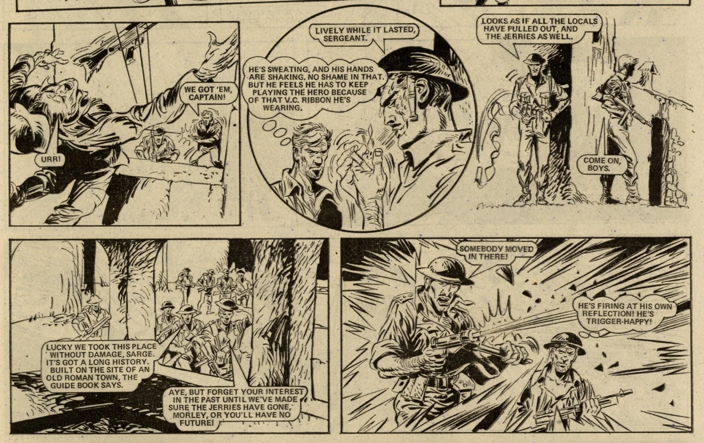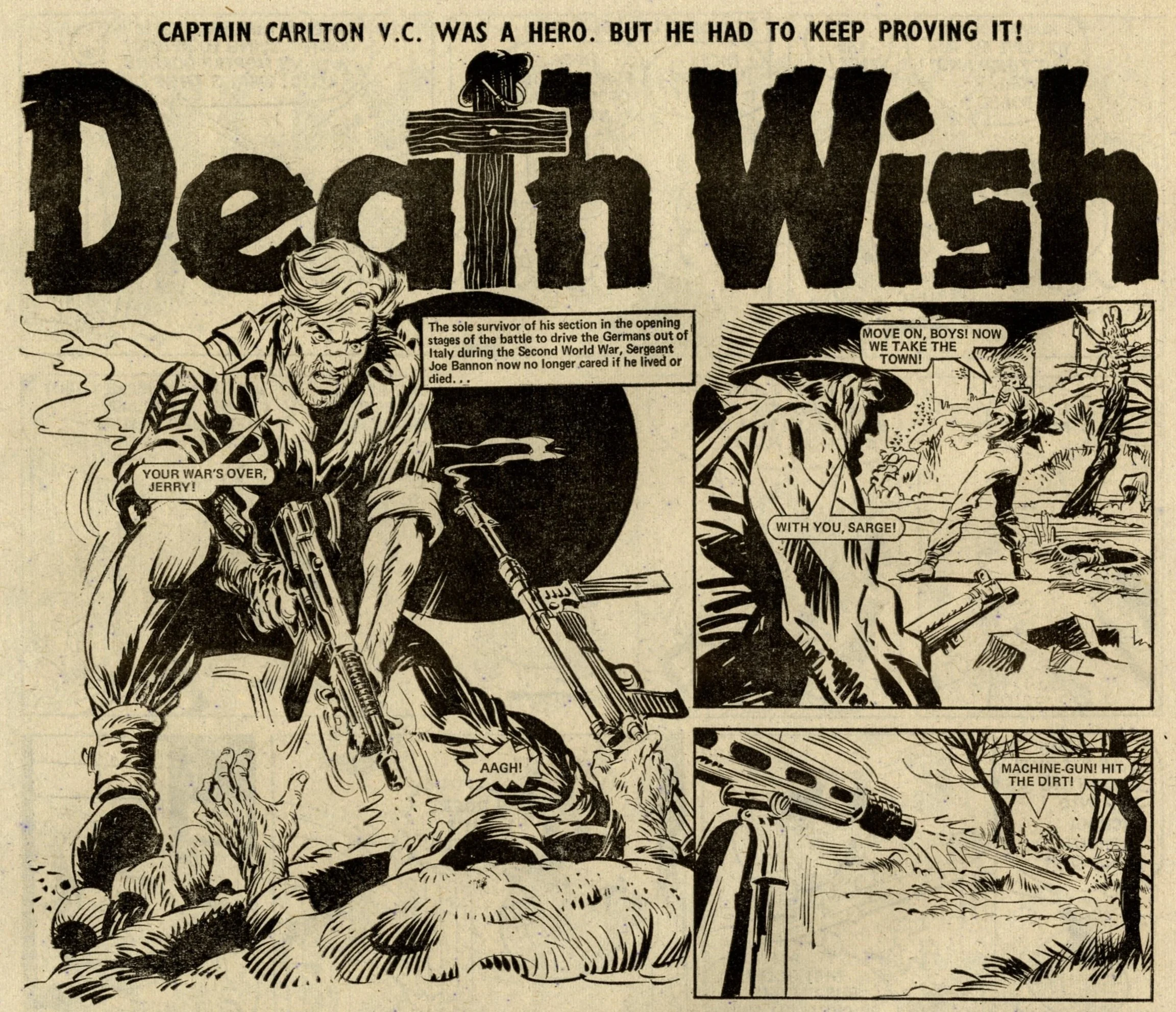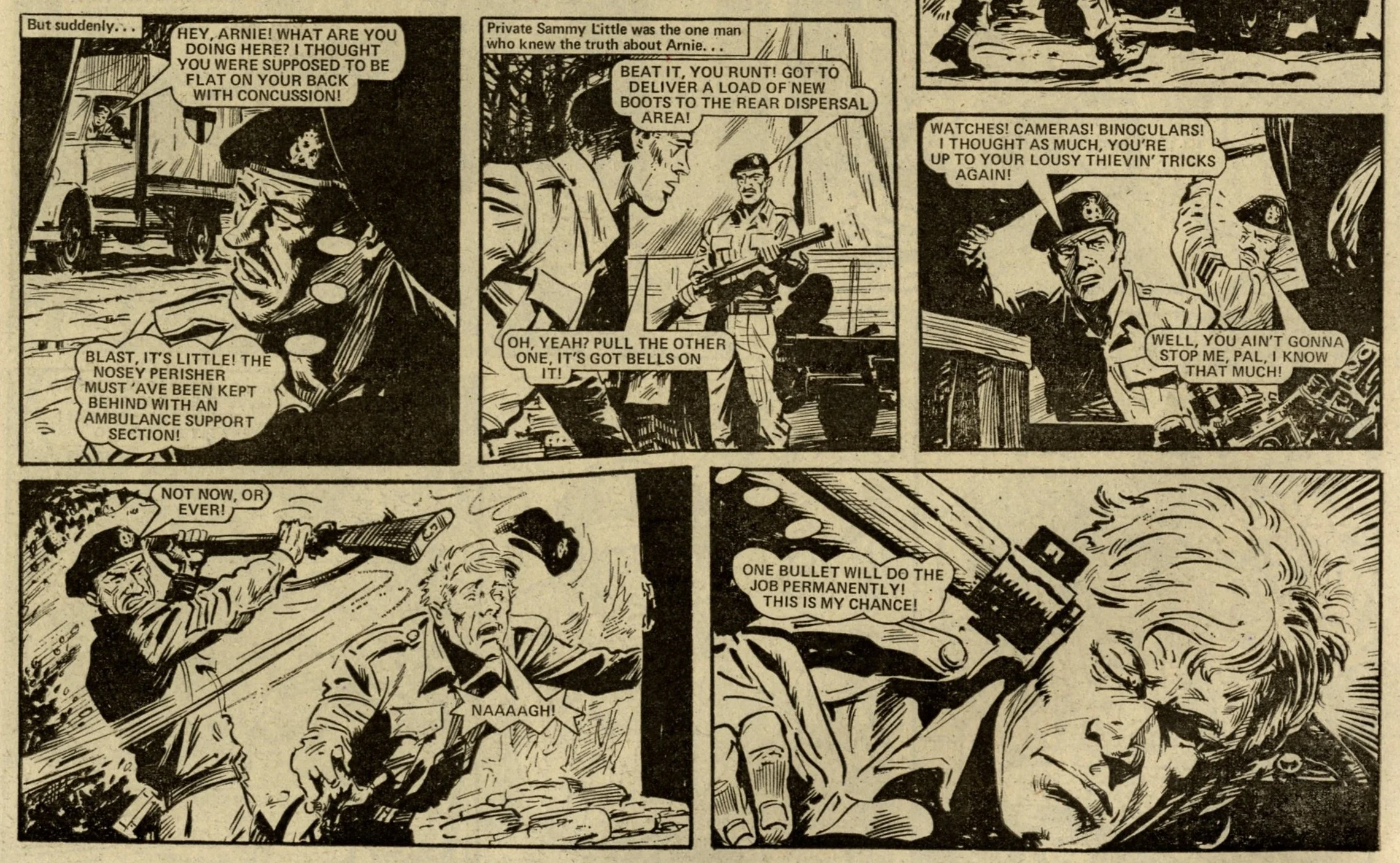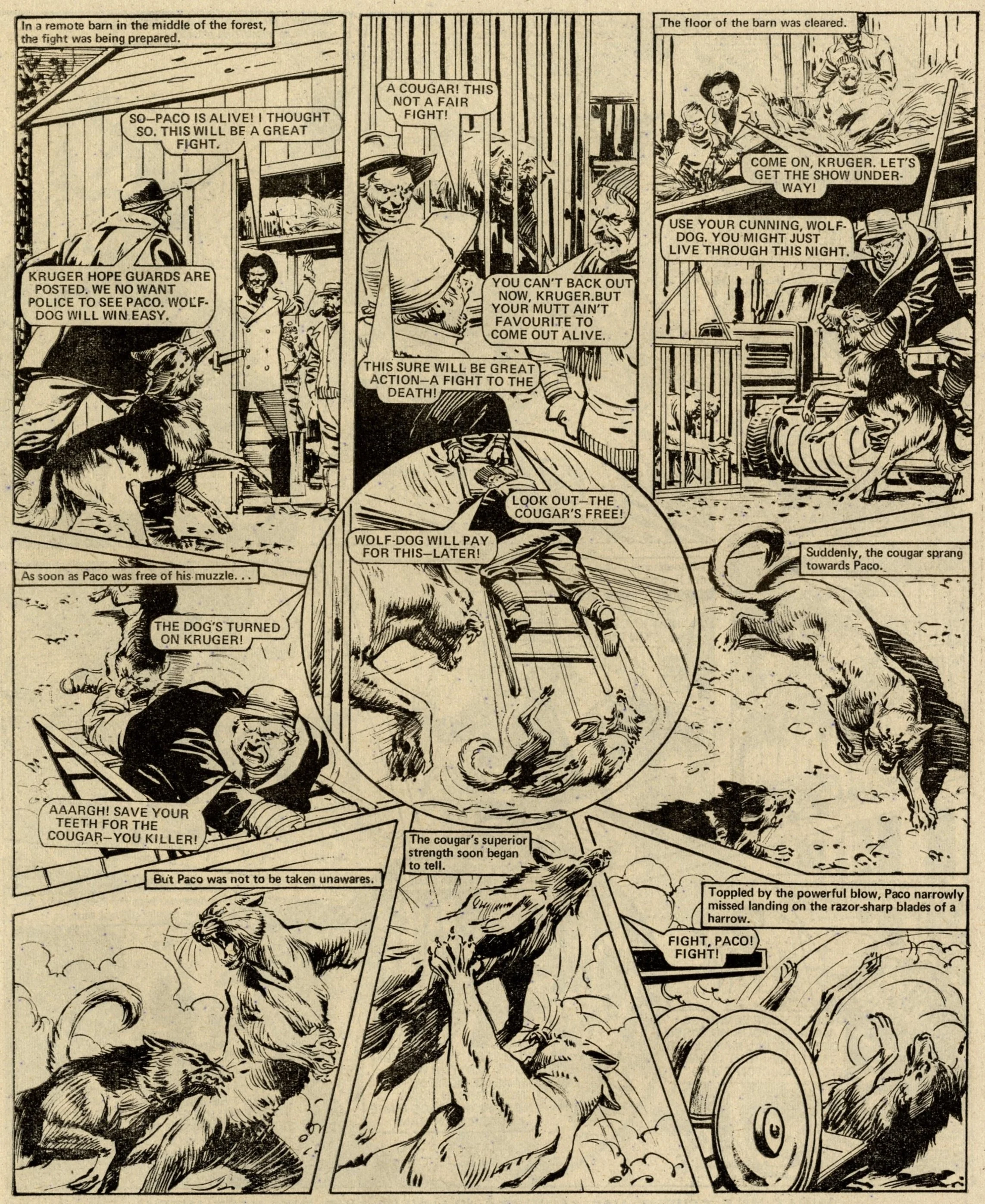 Action is the most infamous of these new wave comics. The ‘sevenpenny nightmare’ made a lot of noise and splashed a lot of blood between its launch in February 1976 and its ban in October of the same year, and it’s easy to forget that Valiant was still running at this time. But it’s also interesting to read an issue such as this week’s and to notice how it too was trying to capture a bit of the Action vibe. It is a comic with a split personality, mixing the final hurrahs of long-running fantastical strips such as Captain Hurricane, Adam Eterno, Frank McDiarmid’s Challenge Charlie and Reg Parlett’s Billy Bunter, with a new roster of harder-boiled thrills that wouldn’t have seemed out of place in Action or Battle at this time, but whose storylines seem incongruous under the ‘Valiant’ banner. There is less valour in the tales of Soldier Sharp – the ‘Rat of the Rifles’ Arnie Sharp was a con man and coward masquerading as a hero in the WWII British army – Death Wish – another WWII story about Sergeant Joe Bannon, a soldier ‘who no longer cared if he lived or died’ – Wee Red, a football story about a flame-haired troublemaker – or Paco – about the trials of a half-dog, half-wolf forced on to the underground fighting dog circuit.