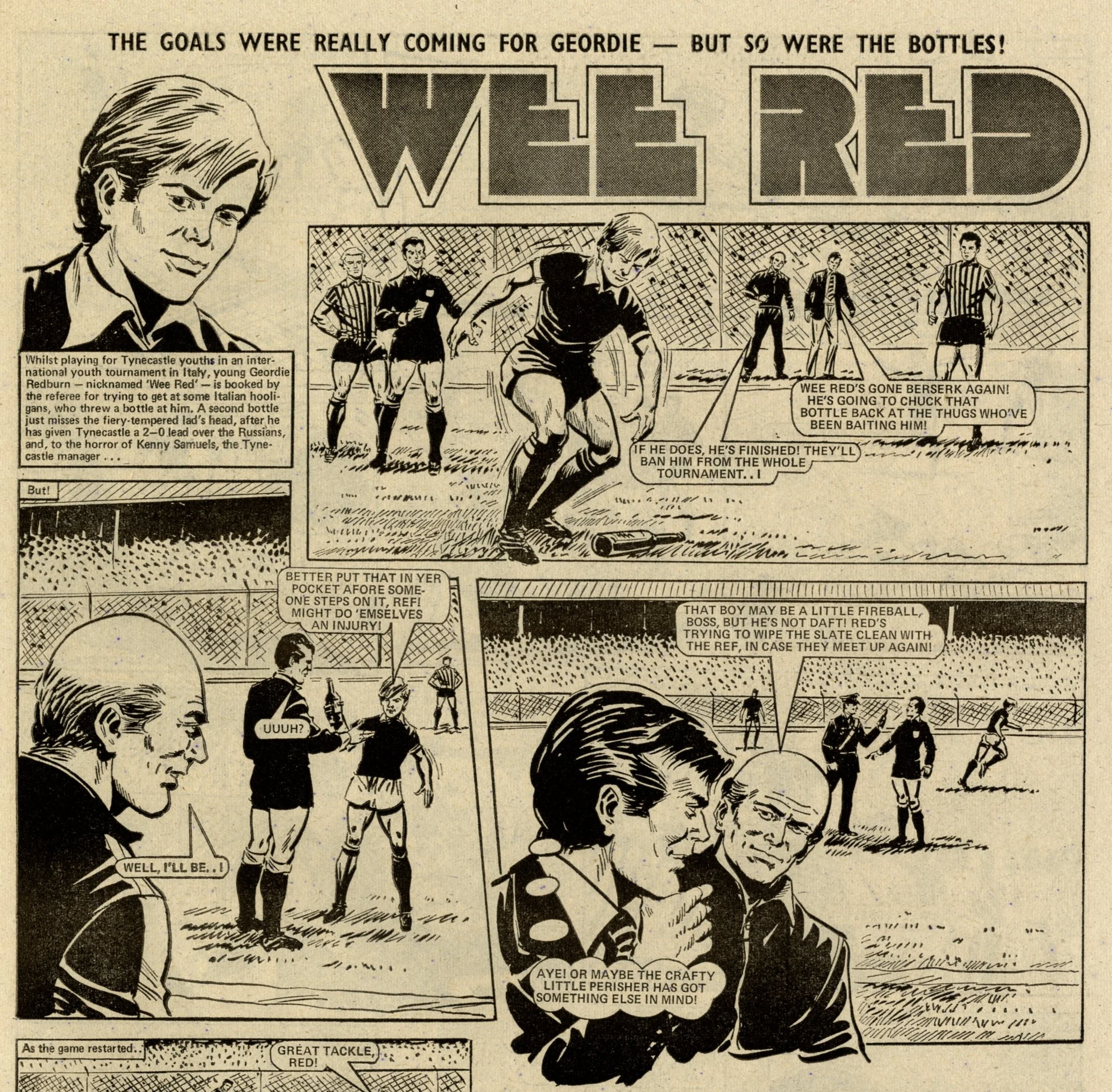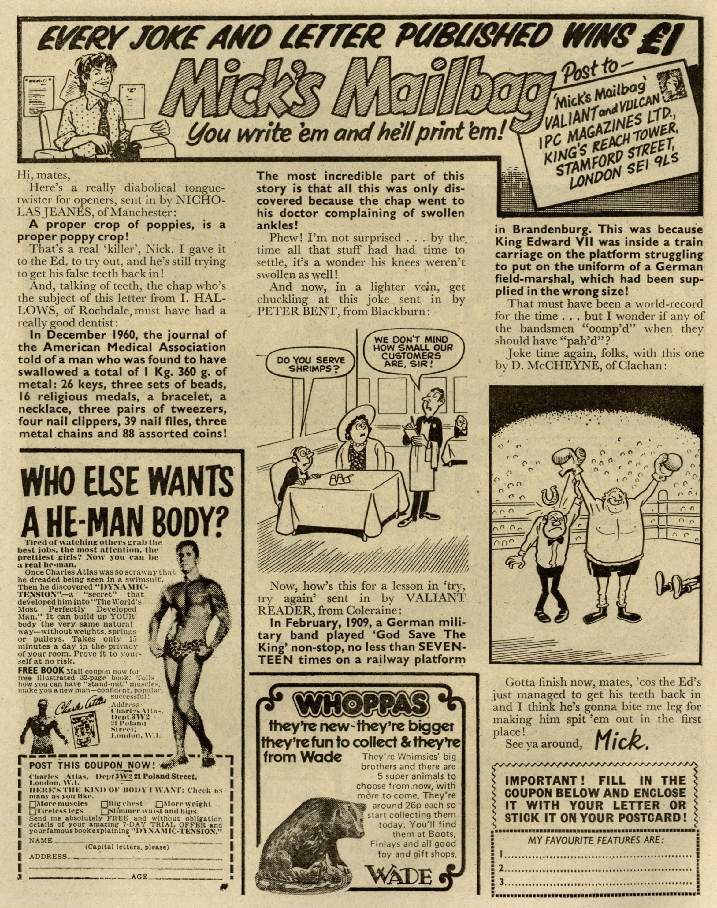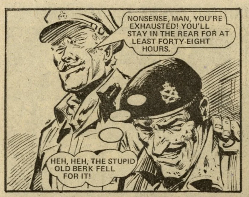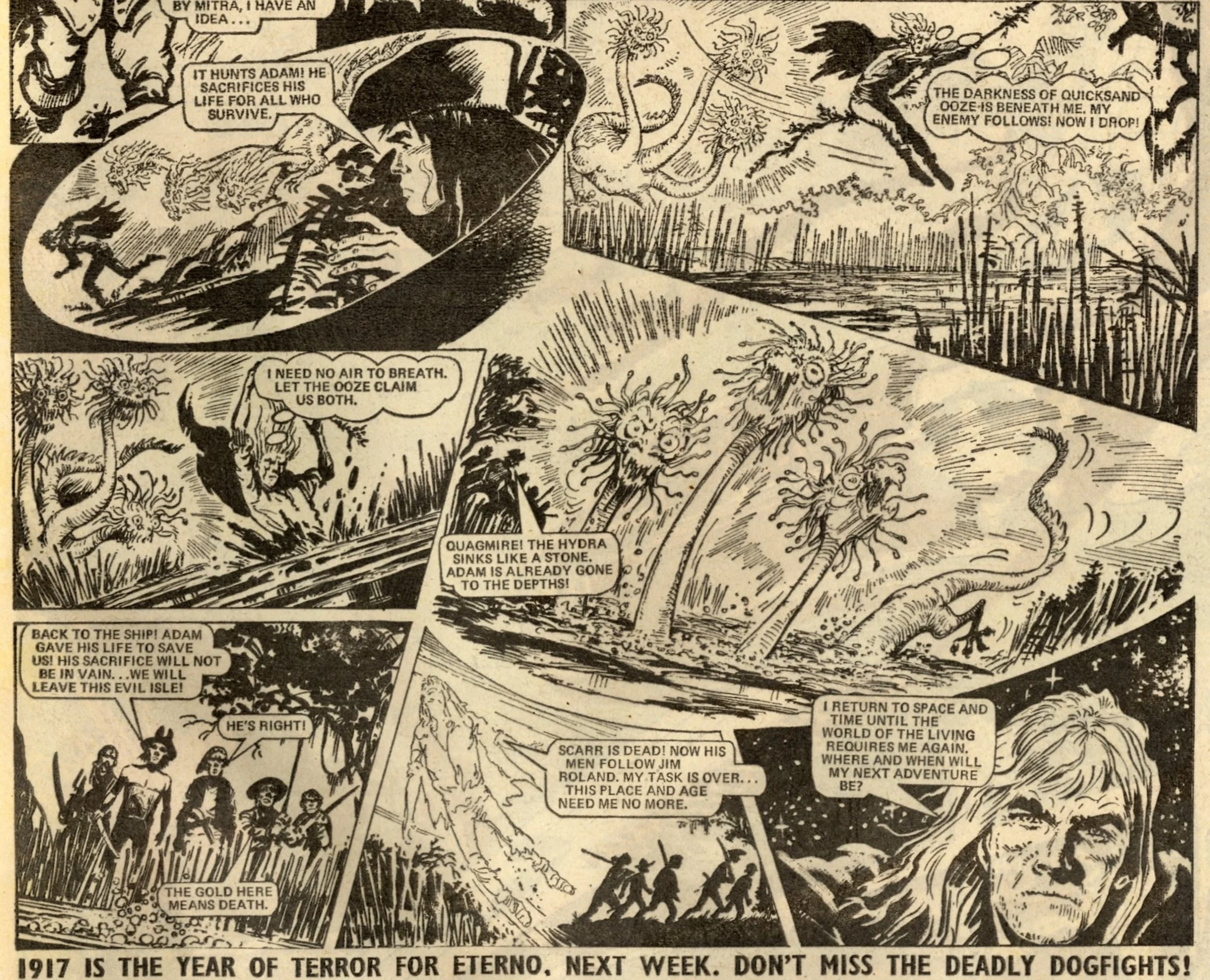 Action is the most infamous of these new wave comics. The ‘sevenpenny nightmare’ made a lot of noise and splashed a lot of blood between its launch in February 1976 and its ban in October of the same year, and it’s easy to forget that Valiant was still running at this time. But it’s also interesting to read an issue such as this week’s and to notice how it too was trying to capture a bit of the Action vibe. It is a comic with a split personality, mixing the final hurrahs of long-running fantastical strips such as Captain Hurricane, Adam Eterno, Frank McDiarmid’s Challenge Charlie and Reg Parlett’s Billy Bunter, with a new roster of harder-boiled thrills that wouldn’t have seemed out of place in Action or Battle at this time, but whose storylines seem incongruous under the ‘Valiant’ banner. There is less valour in the tales of Soldier Sharp – the ‘Rat of the Rifles’ Arnie Sharp was a con man and coward masquerading as a hero in the WWII British army – Death Wish – another WWII story about Sergeant Joe Bannon, a soldier ‘who no longer cared if he lived or died’ – Wee Red, a football story about a flame-haired troublemaker – or Paco – about the trials of a half-dog, half-wolf forced on to the underground fighting dog circuit.