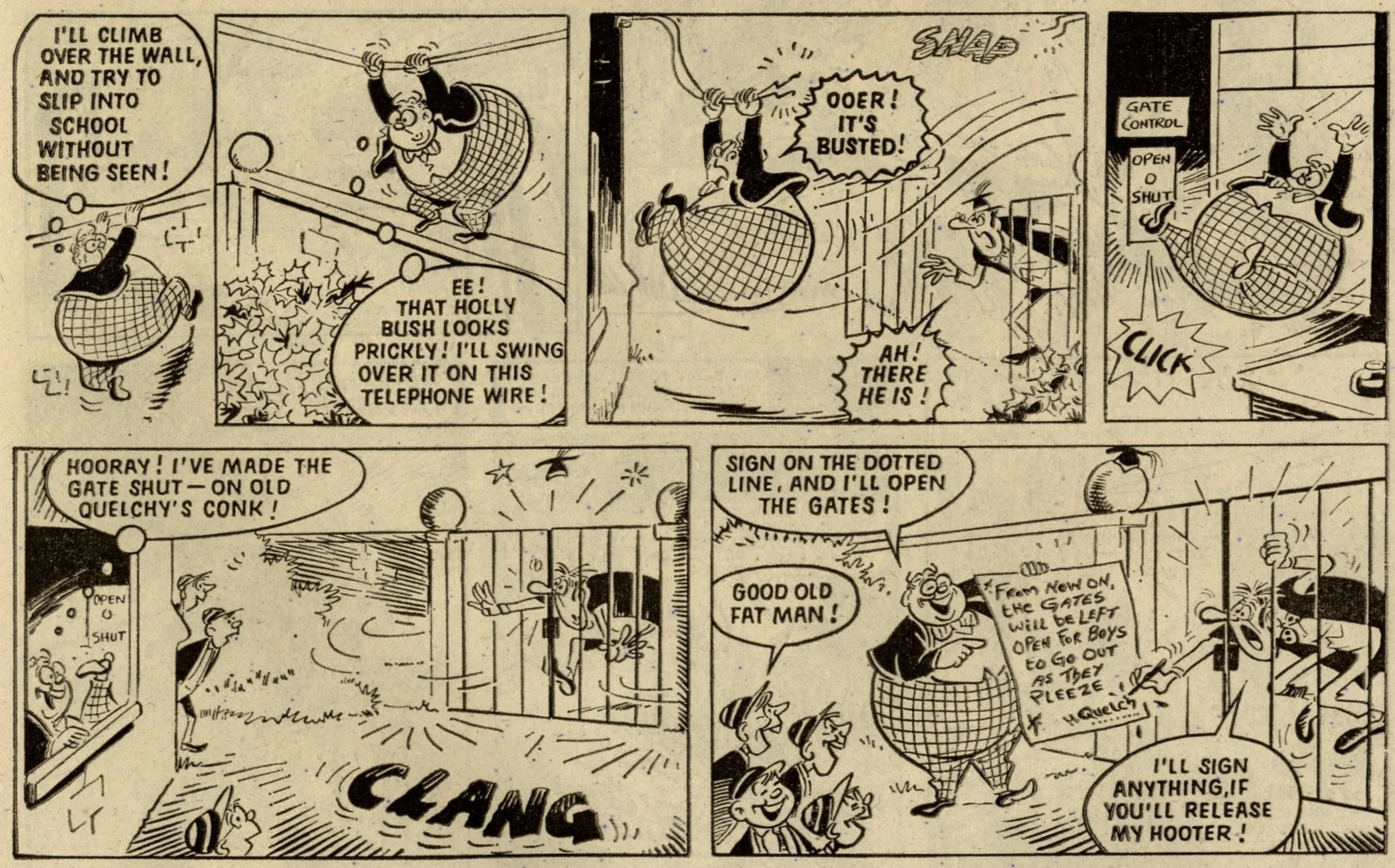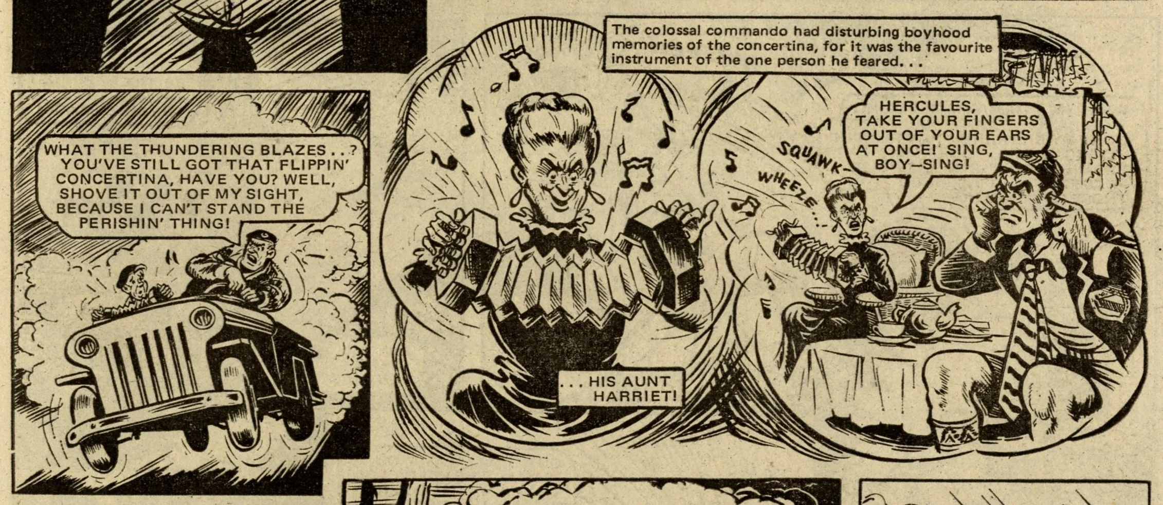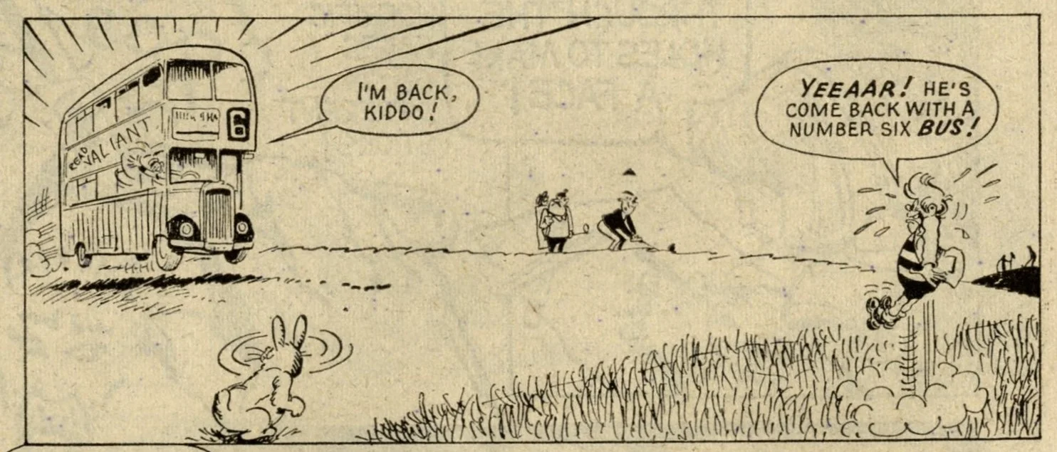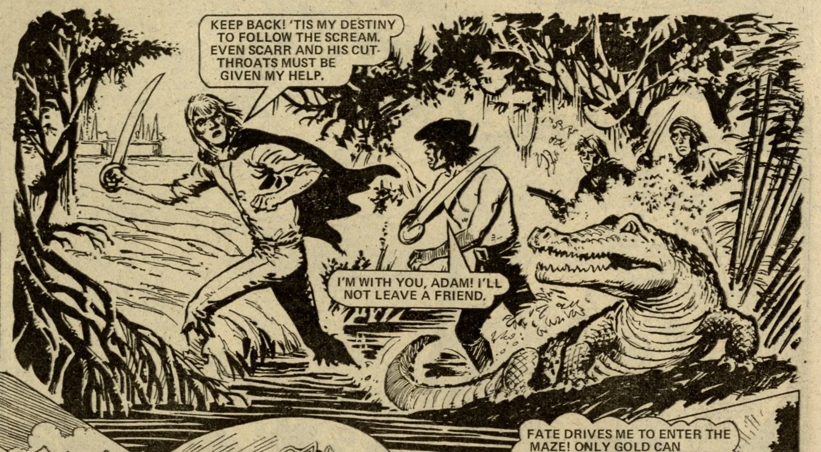 Action is the most infamous of these new wave comics. The ‘sevenpenny nightmare’ made a lot of noise and splashed a lot of blood between its launch in February 1976 and its ban in October of the same year, and it’s easy to forget that Valiant was still running at this time. But it’s also interesting to read an issue such as this week’s and to notice how it too was trying to capture a bit of the Action vibe. It is a comic with a split personality, mixing the final hurrahs of long-running fantastical strips such as Captain Hurricane, Adam Eterno, Frank McDiarmid’s Challenge Charlie and Reg Parlett’s Billy Bunter, with a new roster of harder-boiled thrills that wouldn’t have seemed out of place in Action or Battle at this time, but whose storylines seem incongruous under the ‘Valiant’ banner. There is less valour in the tales of Soldier Sharp – the ‘Rat of the Rifles’ Arnie Sharp was a con man and coward masquerading as a hero in the WWII British army – Death Wish – another WWII story about Sergeant Joe Bannon, a soldier ‘who no longer cared if he lived or died’ – Wee Red, a football story about a flame-haired troublemaker – or Paco – about the trials of a half-dog, half-wolf forced on to the underground fighting dog circuit.