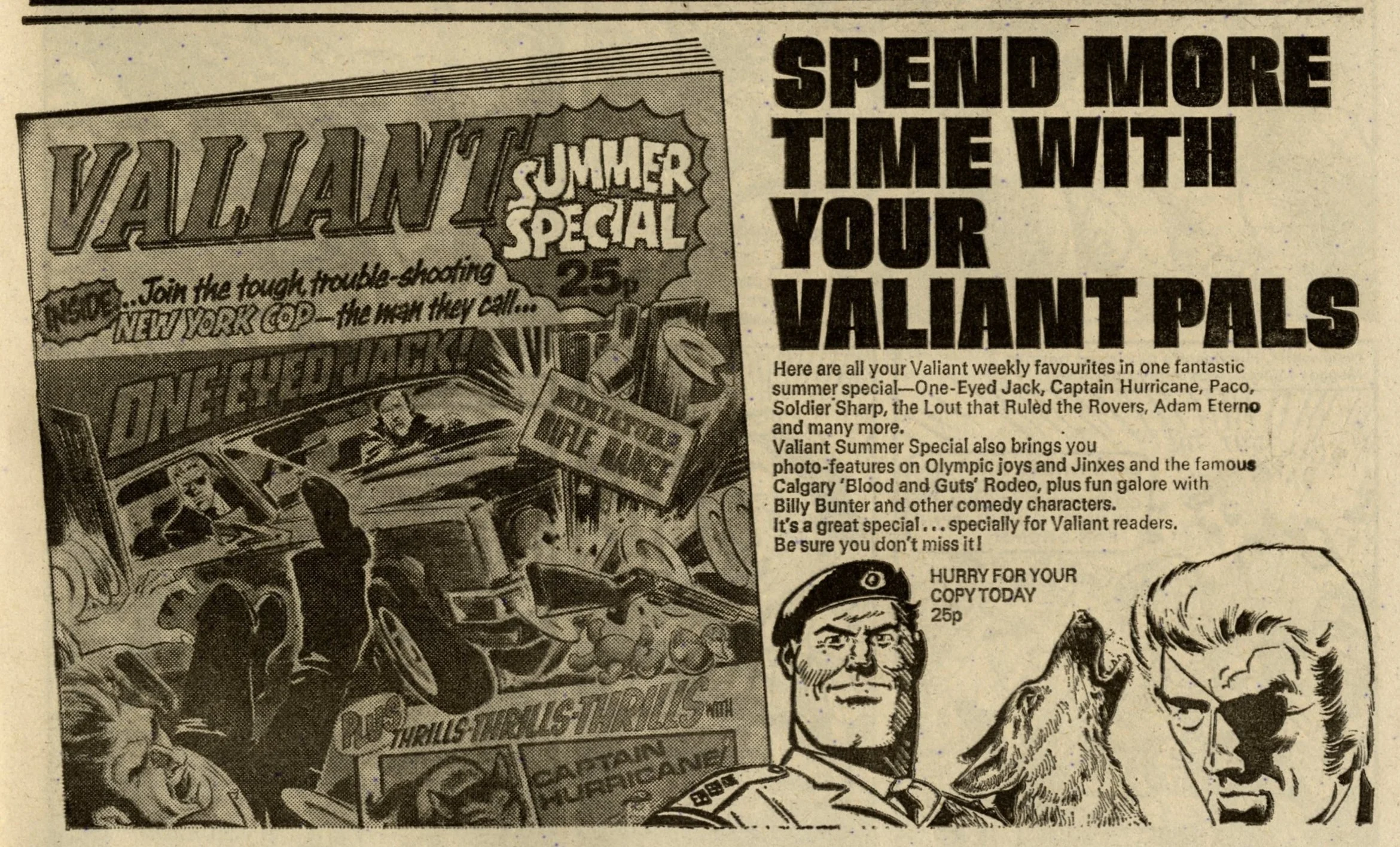 On this day, 24 July 1976 … Under the editorship of future Judge Dredd lead writer John Wagner, Valiant in 1976 wasn’t a bad comic, but it was in the final days of a prestigious fourteen-year run. Valiant was the last of a number of comics from IPC’s 1960s heyday (others including Lion, Smash! and the girls’ titles Princess and June) to disappear from the newsstands as a new wave of publications (such as Battle, Action, Sandie and Tammy) appeared in the 1970s. Wagner and Pat Mills are considered to be two of the most influential editorial influences behind the transformation of the IPC juvenile range, bringing an edgier and more contemporary sensibility characterised by more complex, often flawed, protagonists and more tightly-plotted, darker storylines commonly reflecting either British working class reality or the funk and punk of American film and TV culture.