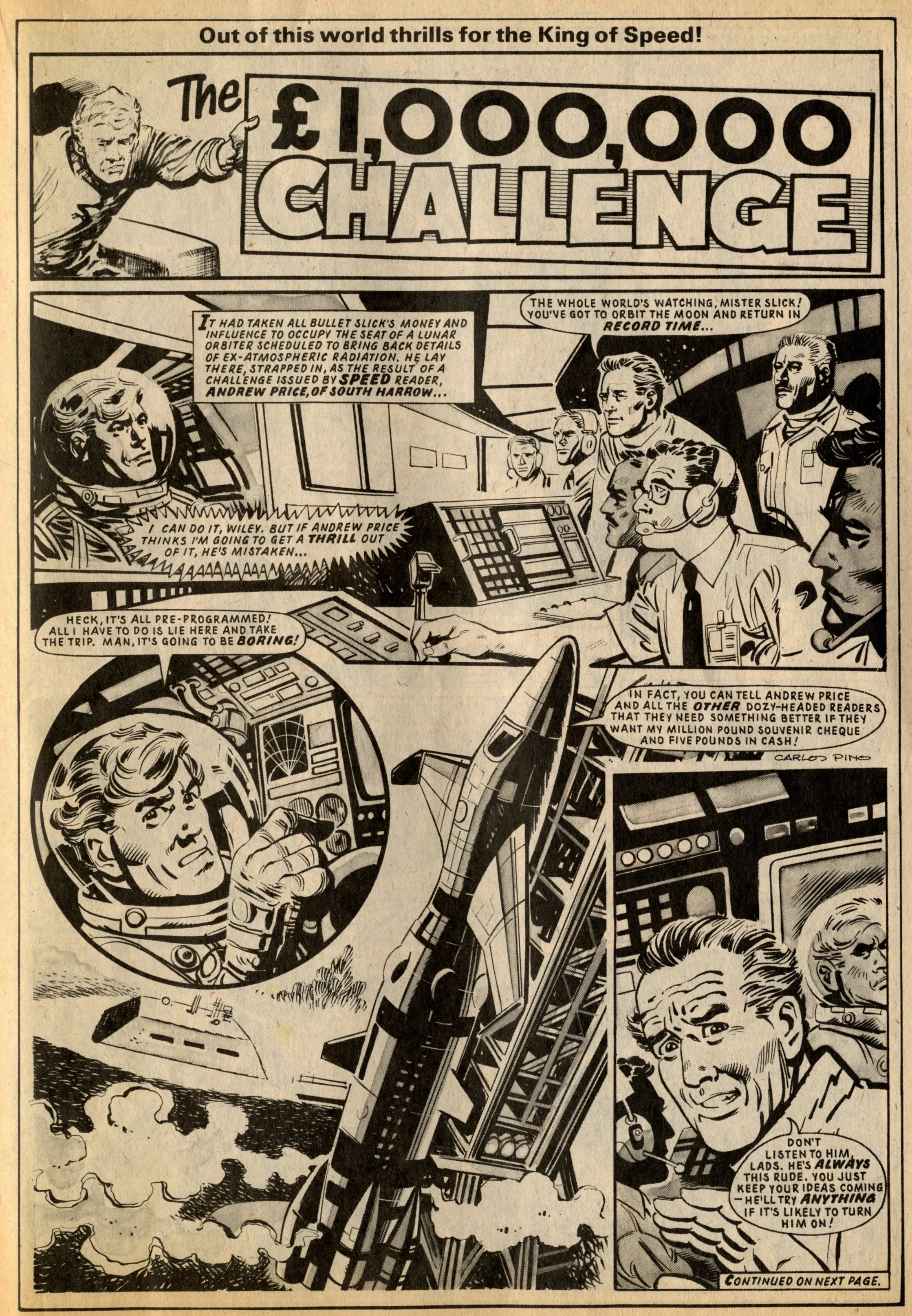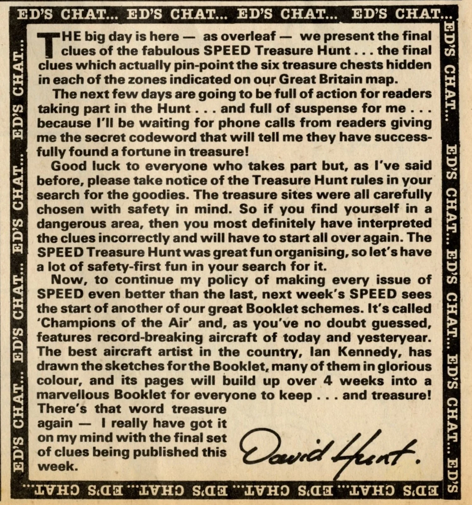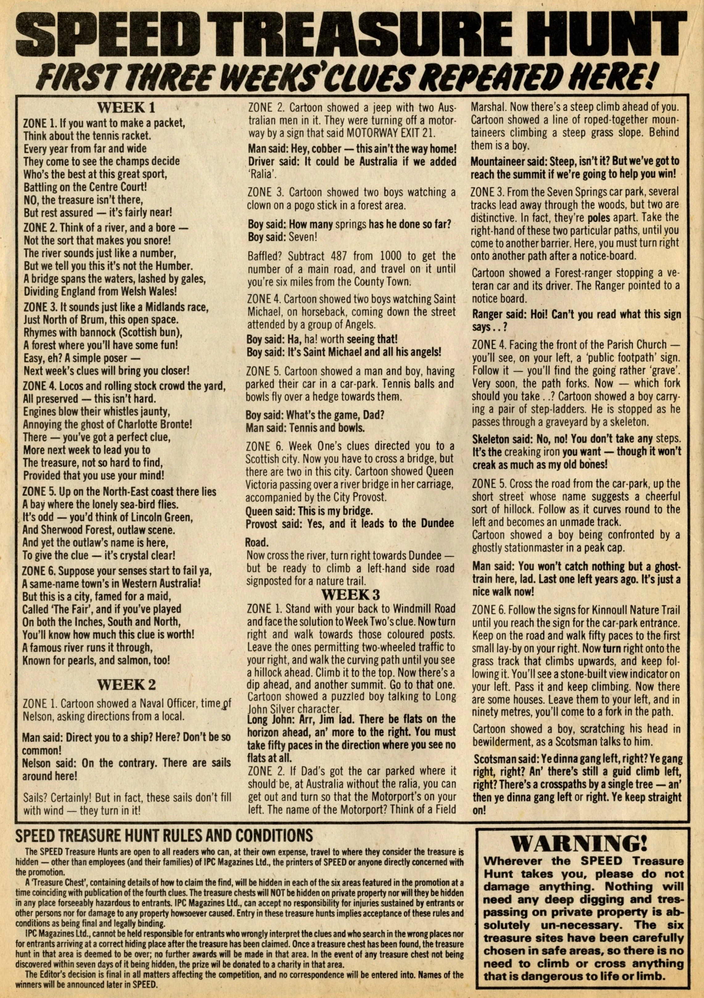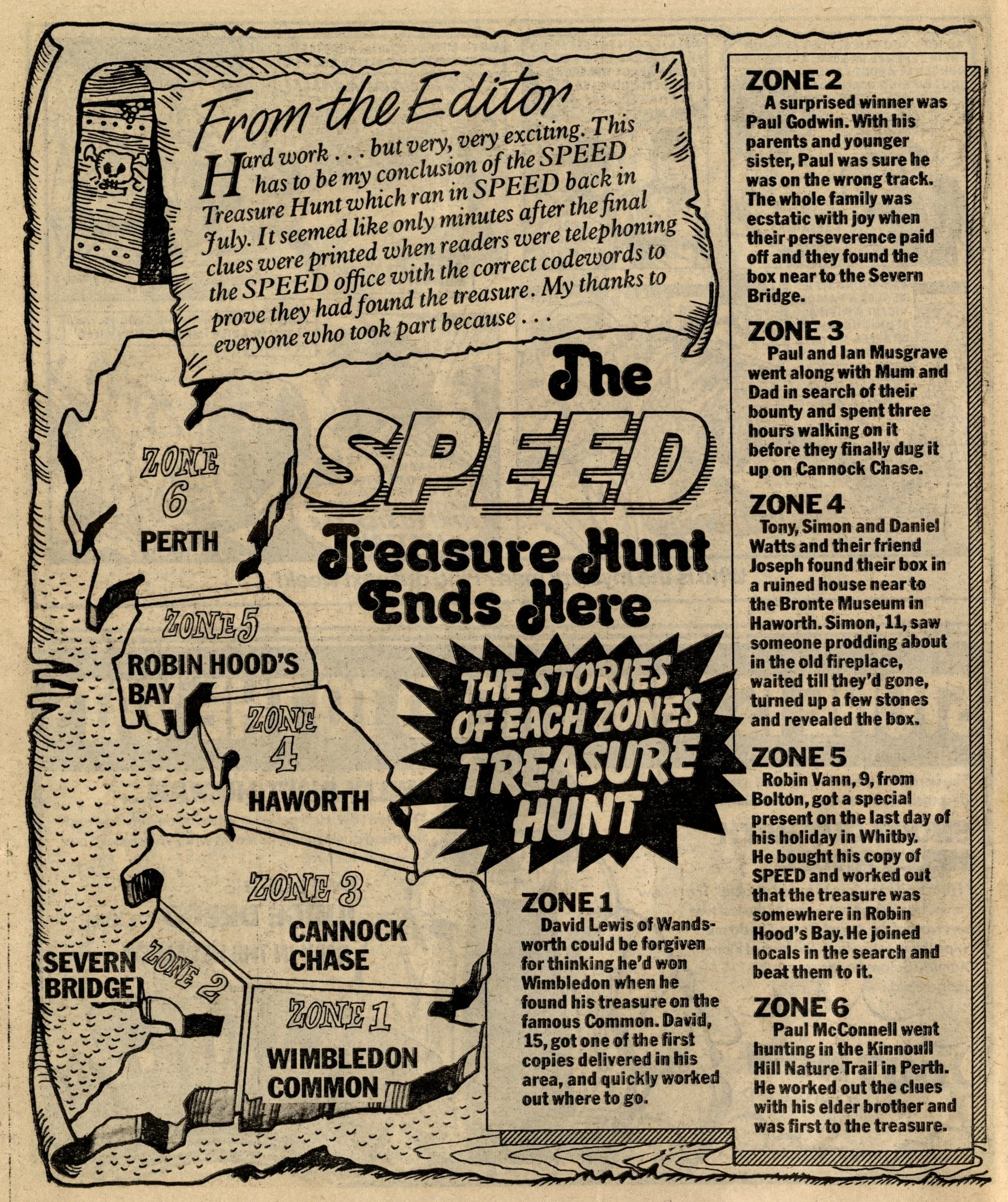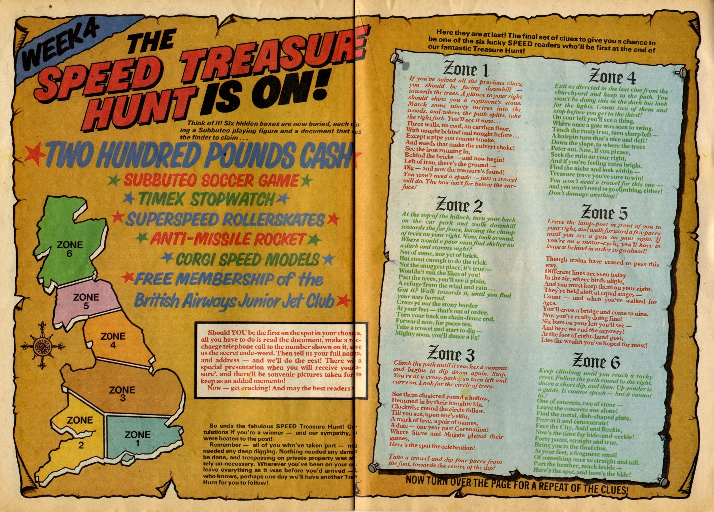 A cryptic clue – not, as it may sound, from an episode of Ted Rogers’ exacting 3-2-1 Saturday night quiz show, but from Speed’s epic nationwide treasure hunt. In fact, it’s the final clue leading to the location of the secret, prize-winning code in Zone 1 (South-east England). I mentioned a few weeks ago that this treasure hunt, brainchild of imaginative Speed editor (and IPC veteran) Dave Hunt, offered a veritable bonanza of exciting prizes but had seemed far beyond the abilities of nine-year-old me or my family, and so I never even attempted to enter it. This is a shame because as I look back now – this issue collects all the clues from previous weeks – it might not have been as difficult as I assumed to discover any of the secret prize locations (it’s pretty clear from the Zone 1 clues that it’s somewhere in a parky area of Wimbledon – on the Common as it turned out). What really made the hunt difficult was the vast swathes of the countryside included in each of the six zones. I lived on what looks like the border of Zones 1 and 2, and the latter stretched from Holyhead to Clacton-on-Sea (the prize was later revealed – in the 4 October issue, see below – to be right in the middle of the country, on Cannock Chase in Staffordshire).