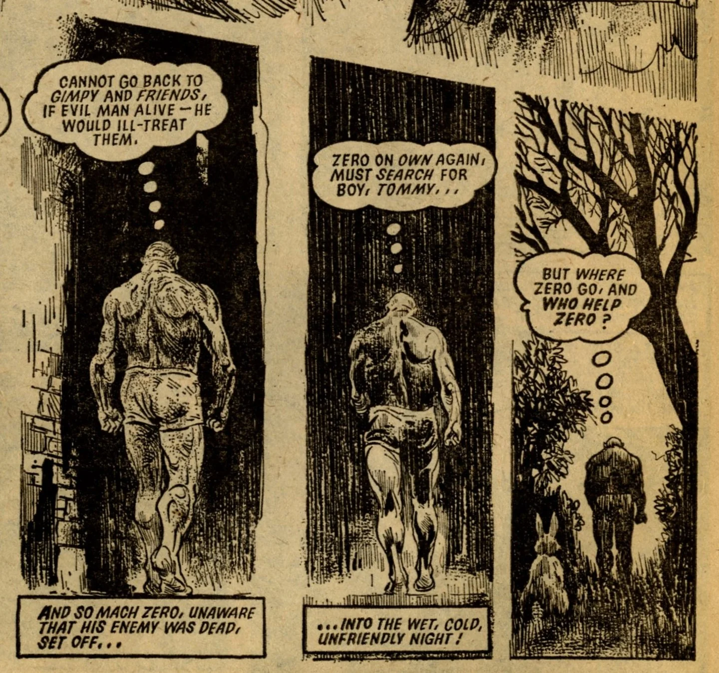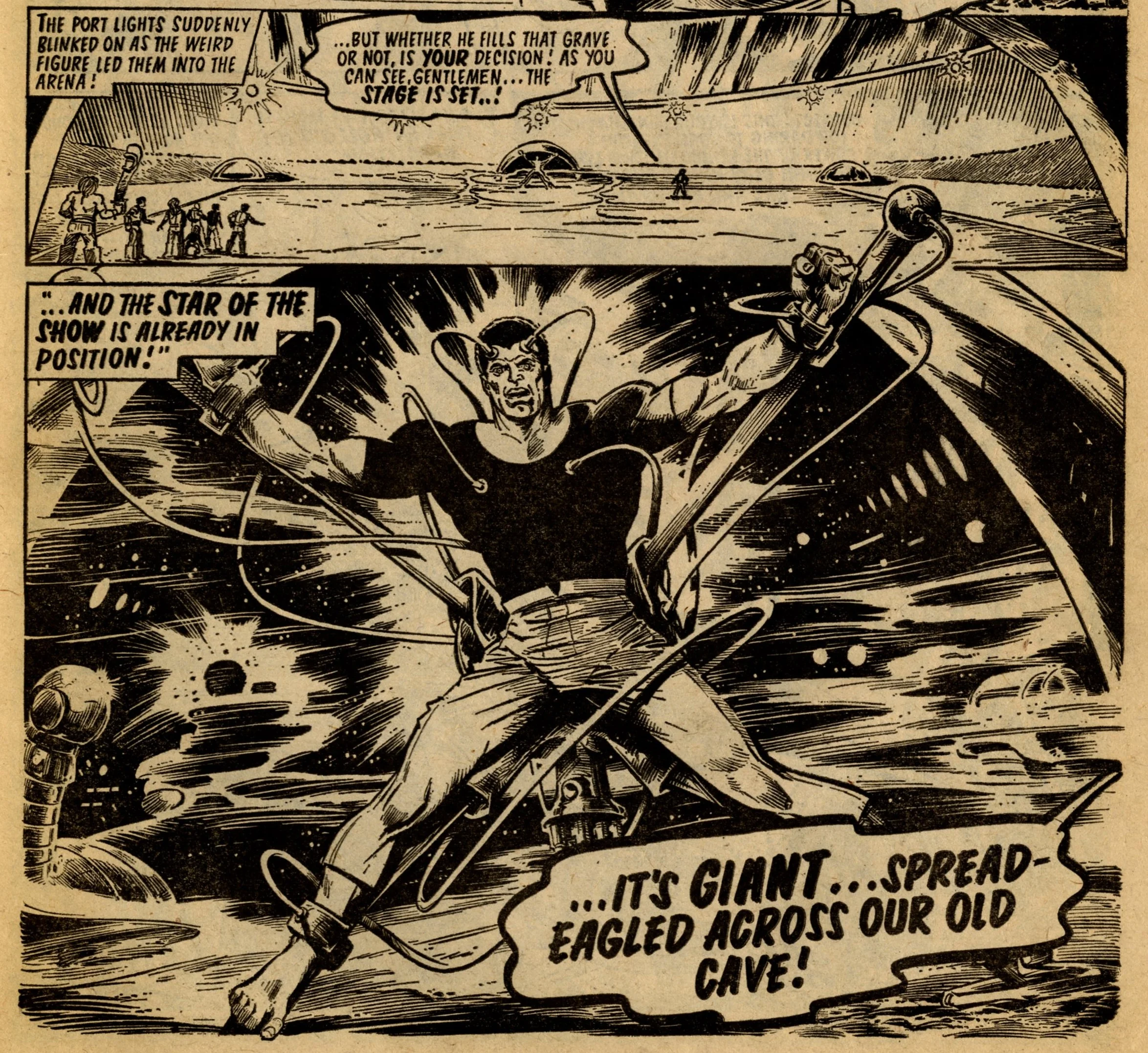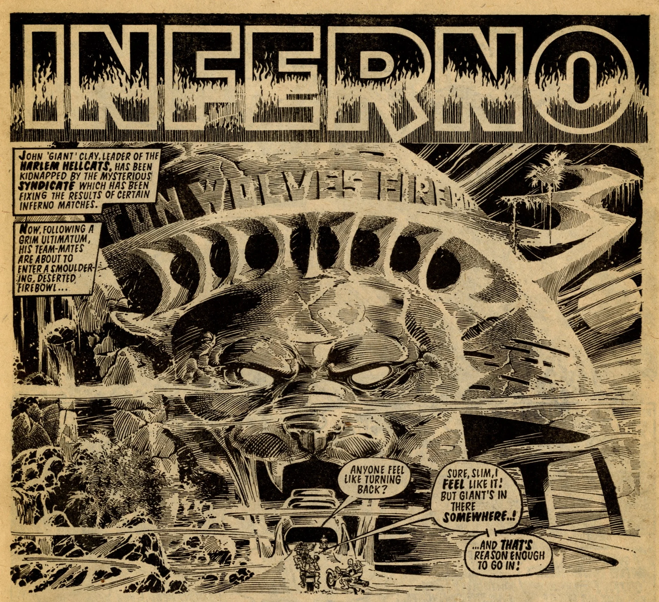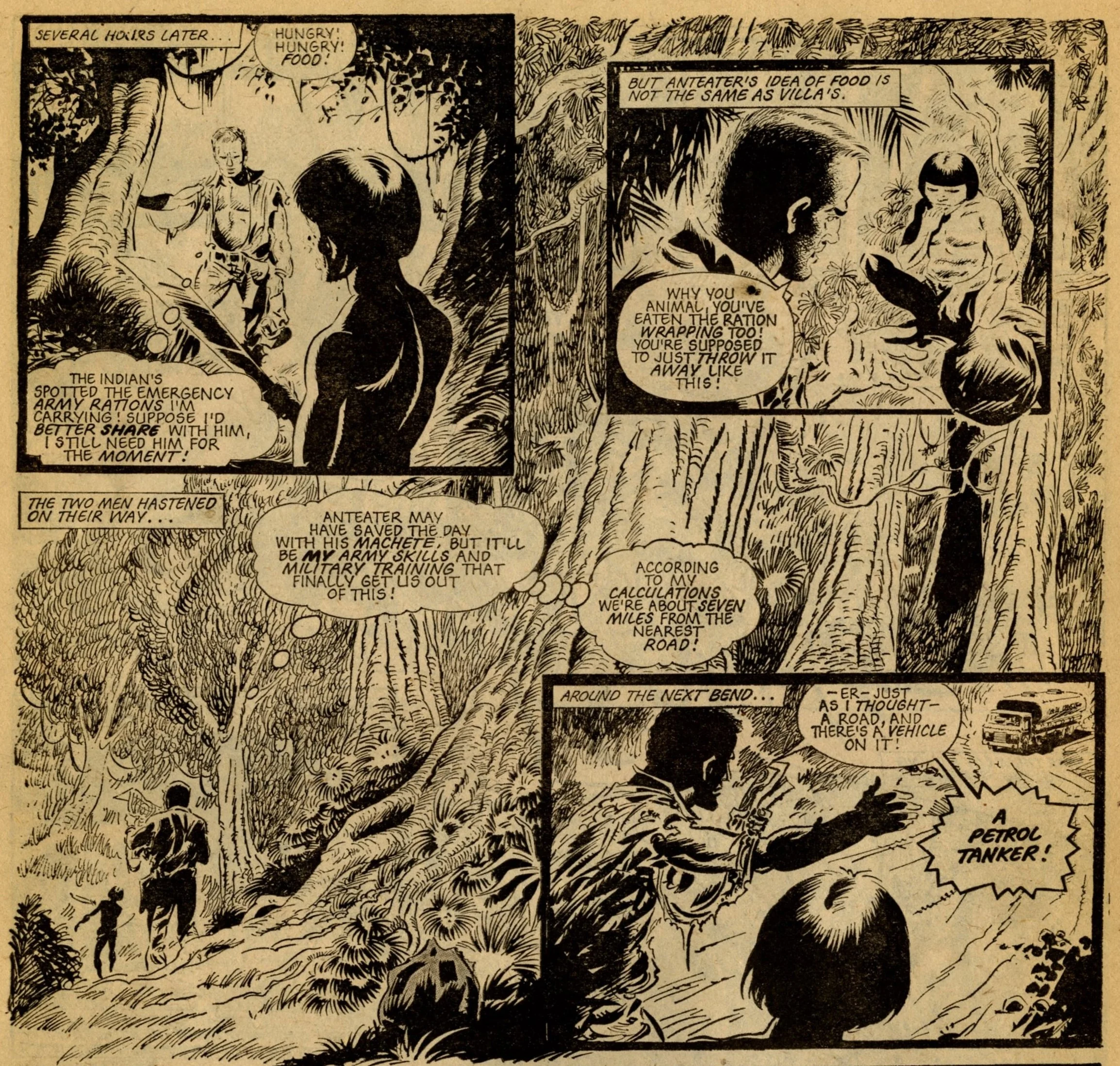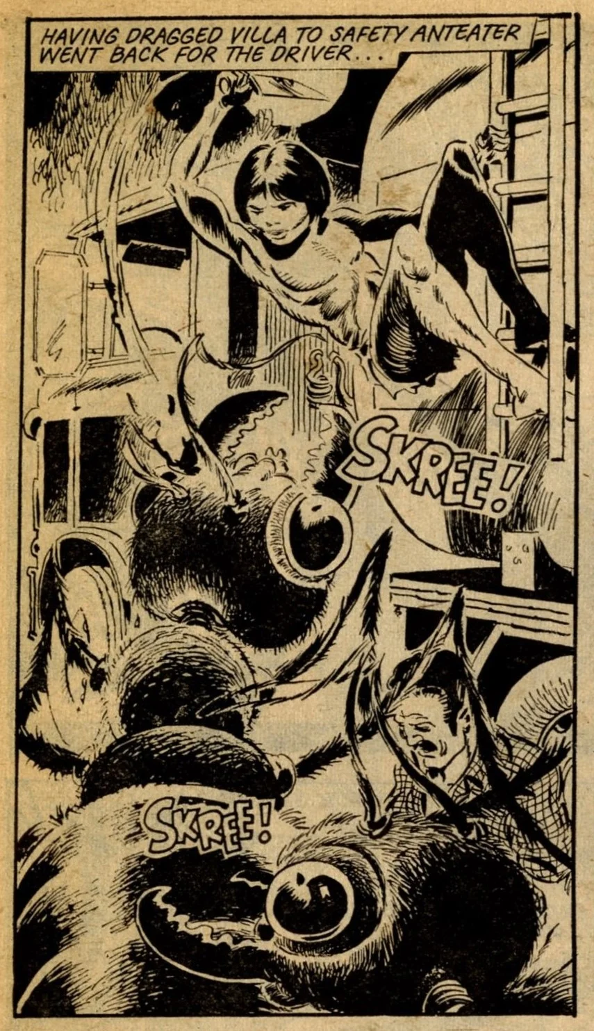 With all that excitement it could be easy to overlook the rest of Prog 72, which would be a shame because it’s a great issue from one of TGGC’s golden periods. MACH Zero brings down the roof on a circus-style freak show in a typically moody and inky Mike Dorey-drawn instalment of his lonely search for his lost son Tommy. Captain Villa and his companion, ‘semi-civilised Indian’ Anteater, continue their Ant Wars – a serial that would make a great box-set TV series. Bonkers Massimo Belardinelli artwork rescues a bonkers Tom Tully Inferno story (all good practice for his bonkers Roy of the Rovers Basran storyline eight years later), and Dan Dare fights the Sleetha – giant worms of Eden.