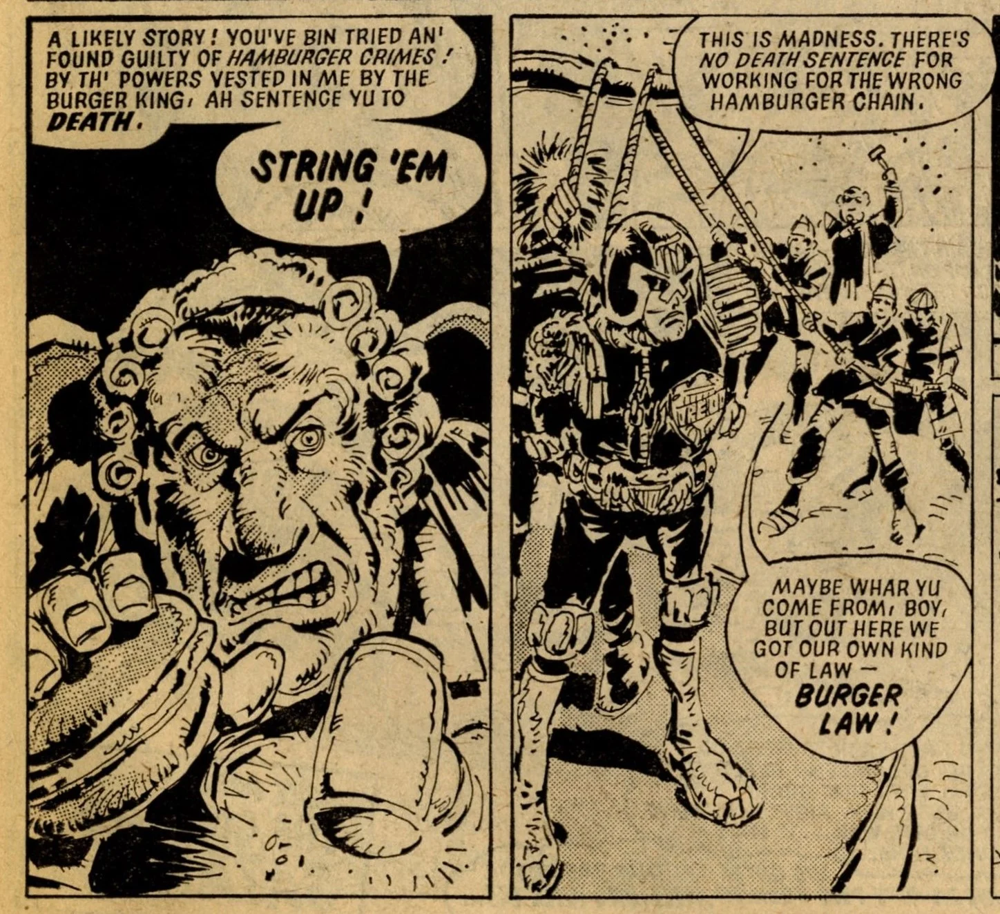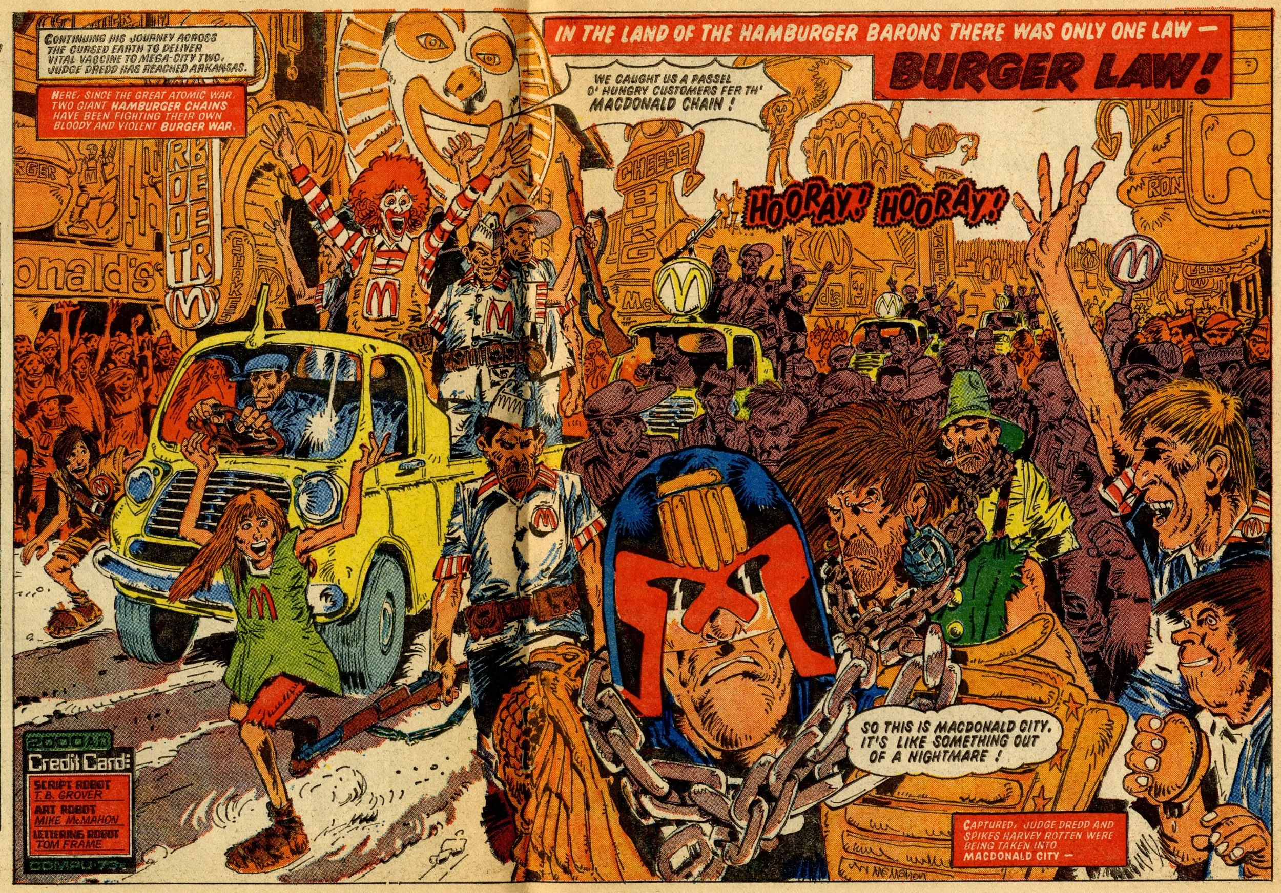 On this day, 8 July 1978 … One of the most audacious, hilarious, eye-catching, thrill-powered covers produced by 2000AD in its near-forty-year history sees Judge Dredd in the greasy clutches of ‘Ronald Macdonald’, leader of the Macdonald Marauders – ‘Burger War’ soldiers locked in endless combat with the Burger King Vigilantes somewhere in post-apocalyptic Arkansas – in the middle of his classic Cursed Earth quest. Mike McMahon’s gutsy and dynamic artwork continues inside this, one of the infamous ‘banned’ progs of 2000AD, as Dredd and Spikes Harvey Rotten are taken captive in Macdonald City, see Ronald shoot a burger store table-cleaner for shoddy standards, and escape only to be recaptured by the BK ‘bozos’ and hung for being sided with the wrong kid of sandwich. At this point Joe and Spikes really wished they’d gone to Wimpy instead – to drokk with the tomato-shaped ketchup dispensers!
