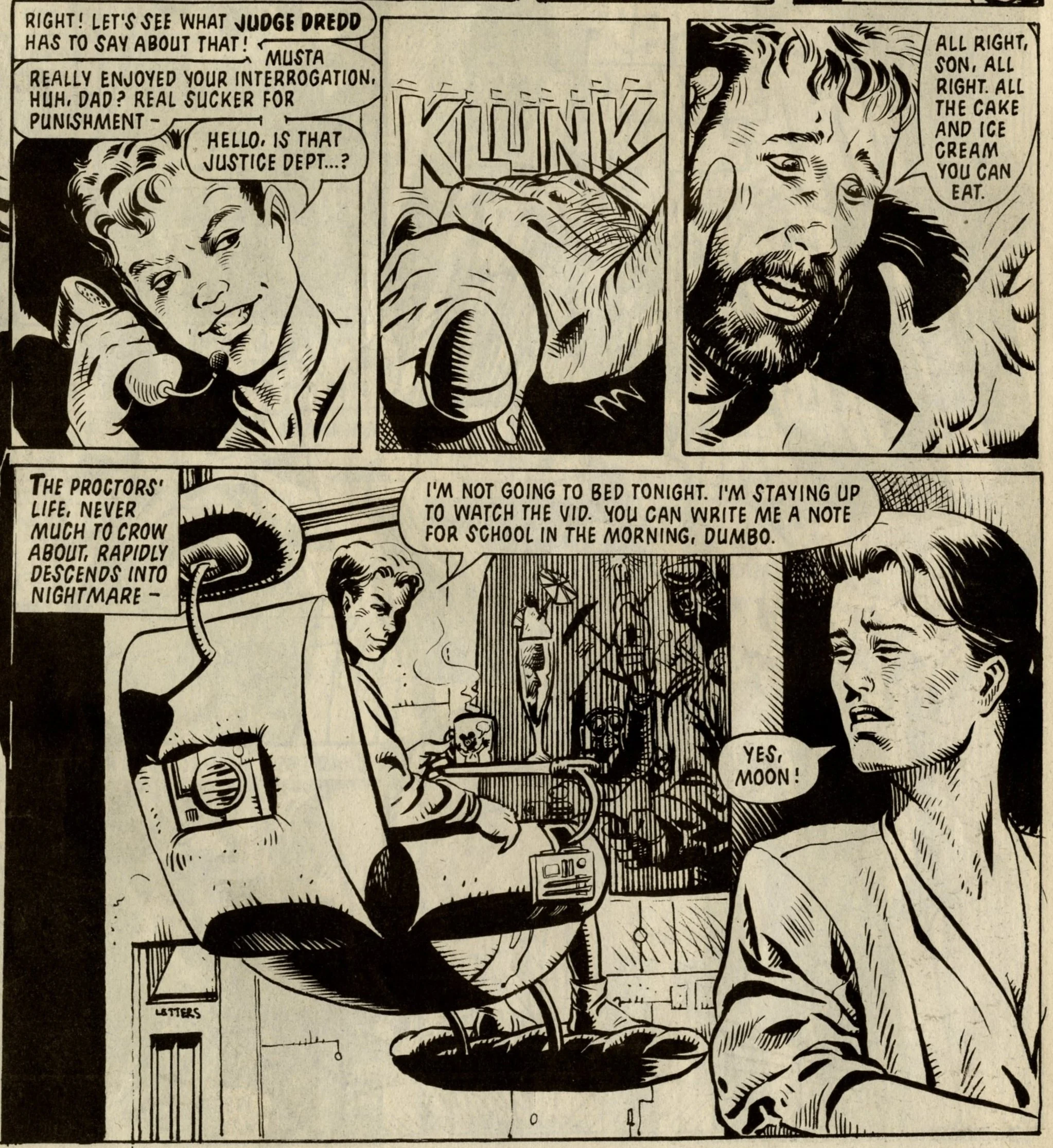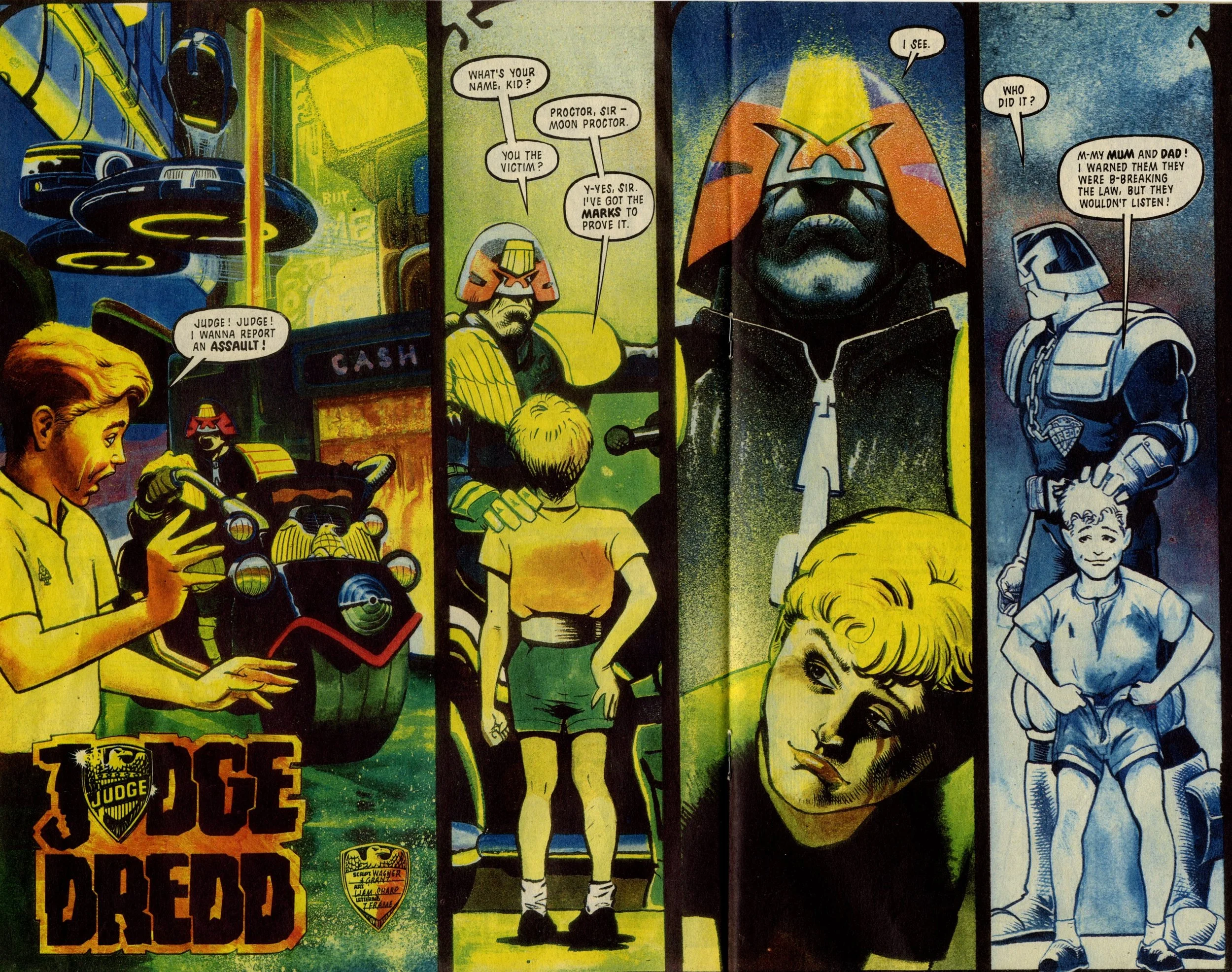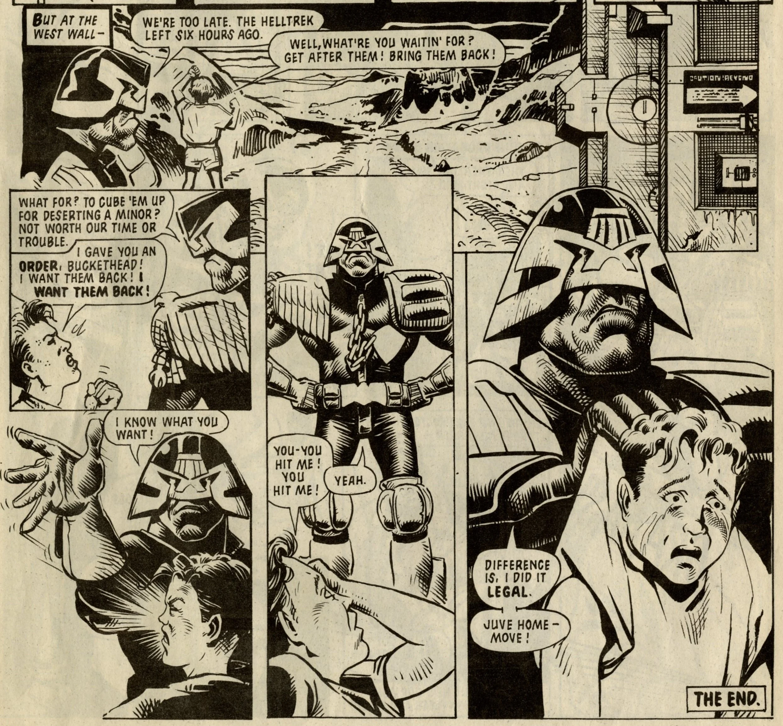 But no, this isn’t PJ jerking his parents around, but a juve called Moon Proctor, star of a one-off Dredd story that turns out to be rather shocking to twenty-first-century eyes. Moon reports his parents to the Judges after they spank him on the bottom for being naughty; Dredd interrogates the parents and cautions them; Moon takes advantage of the subsequent lack of discipline to run riot, his parents too scared to do anything but obey his every whim; the parents have enough, and flee to start a new life in the Cursed Earth; Moon reports them to Dredd; Dredd – now literally in loco parentis – gets fed up with the boy’s spoilt behaviour and slaps him in the face: ‘Difference is, I did it legal.’ The image of Dredd hitting a child is a chilling one, and I doubt this story would have been printed today without attracting a fair bit of controversy. Looking at it in context, though, John Wagner and Alan Grant wrote it in the year following the outlawing of corporal punishment in state schools in Britain – a move which wasn’t universally supported at the time (it wasn’t banned in private schools until nearly the end of the century). This story seems to take a ‘spare the rod and spoil the child’ stance which speaks into the agenda of the day and, perhaps, is a coda to the first PJ Maybe story which had appeared just eight weeks previously – PJ escaped punishment for his crimes and was very much emboldened to commit further terrors.