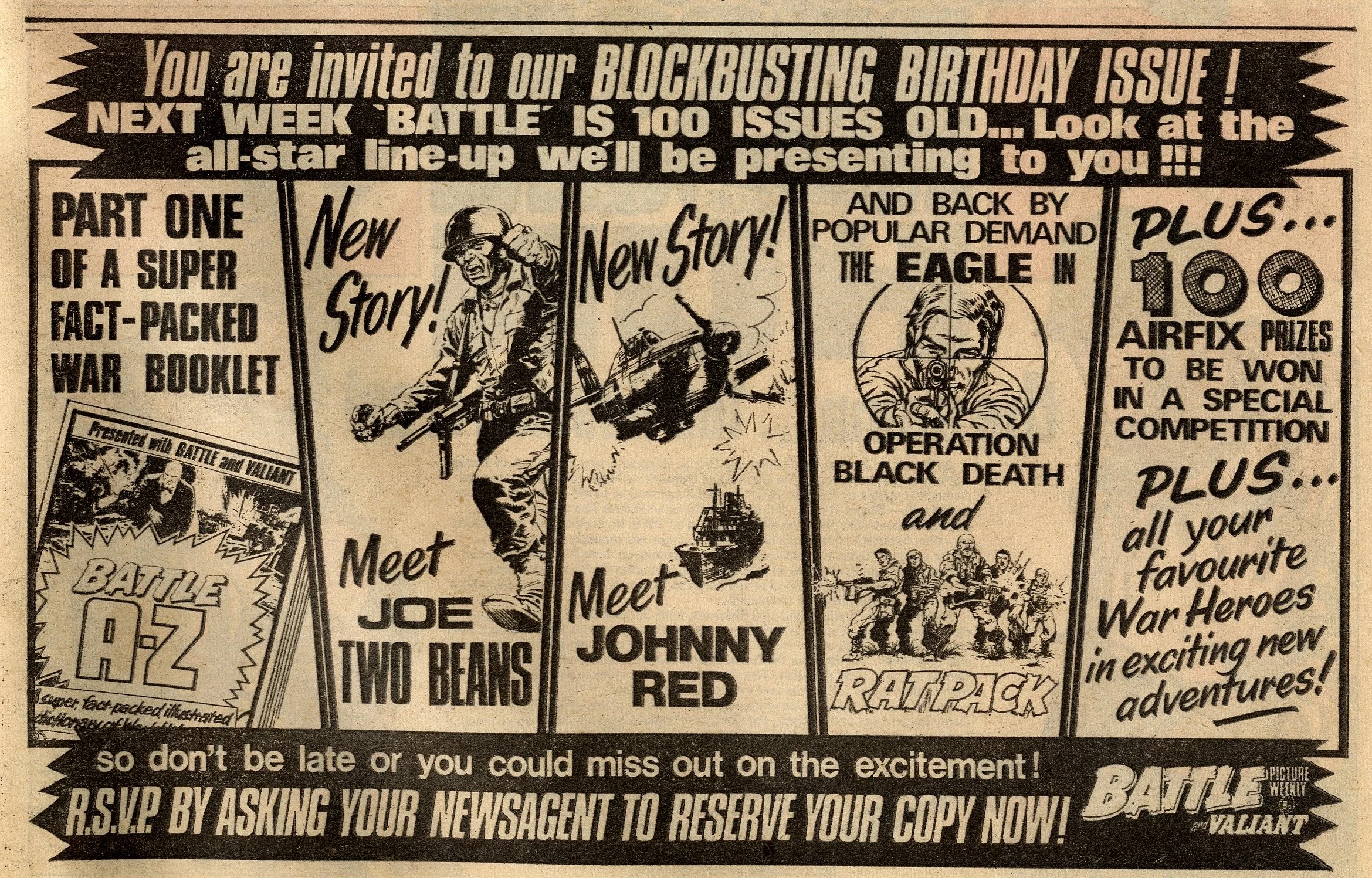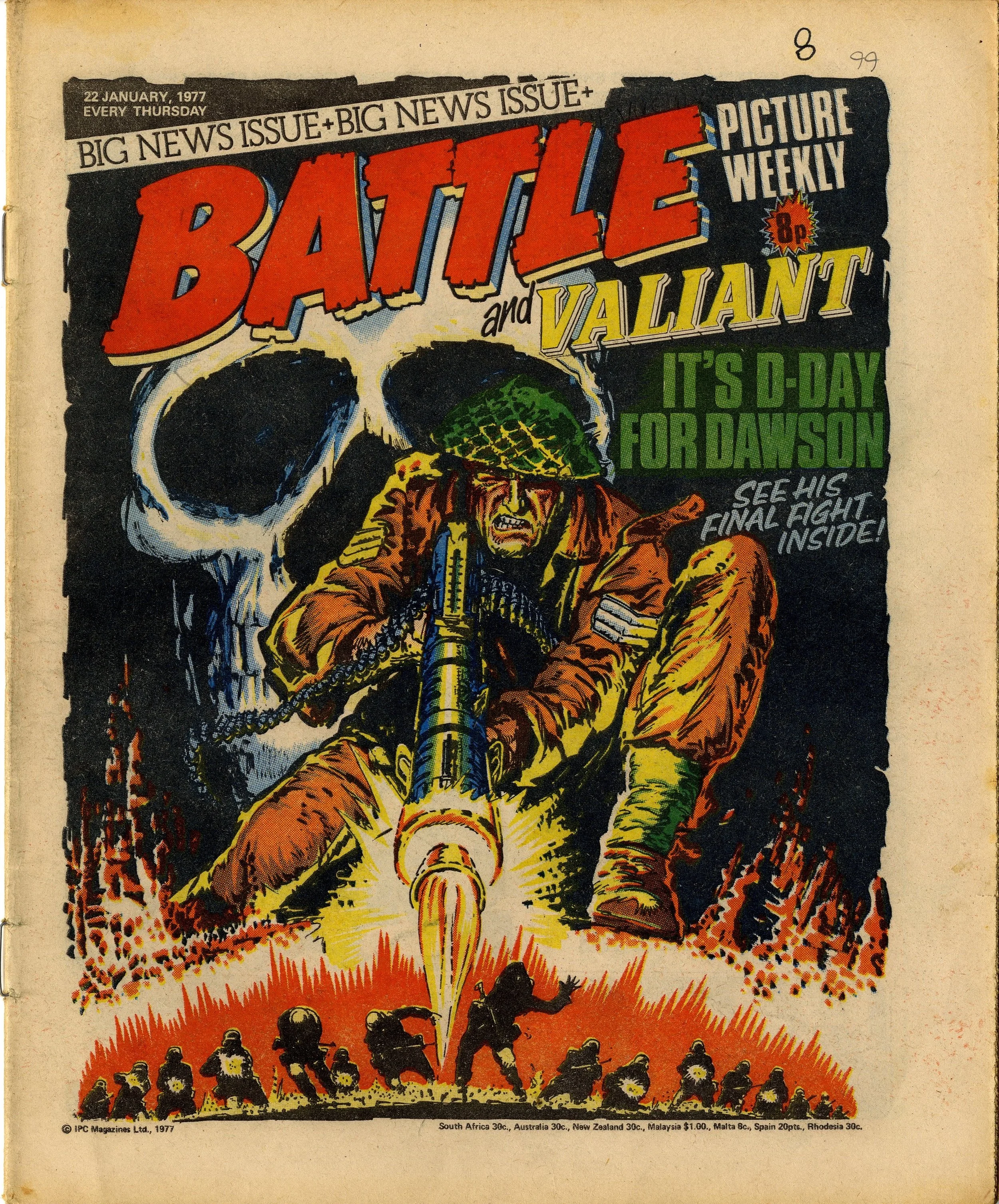 On this day, 22 January 1977 … This superb, apocalyptic cover by Carlos Ezquerra heralded the 88th and very last episode of D-Day Dawson – the first story to appear in Battle Picture Weekly – and the 99th issue of the comic itself, now titled Battle and Valiant. I’ll be looking in greater depth at the 100th issue next week so this post serves just as a trailer for that, and a companion to today’s Story File which looks back at the epic that was D-Day Dawson.