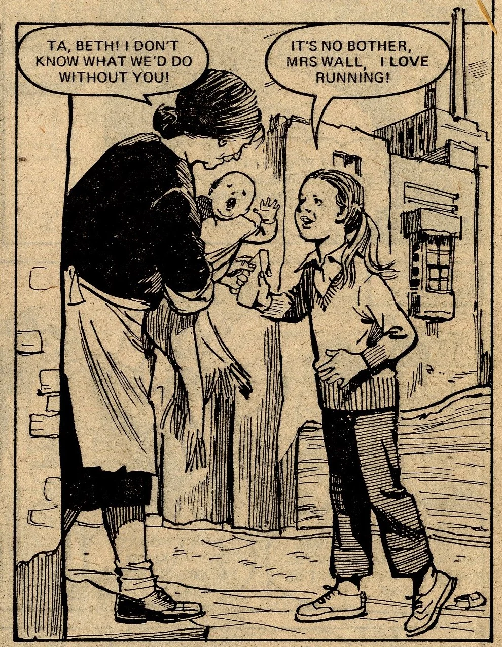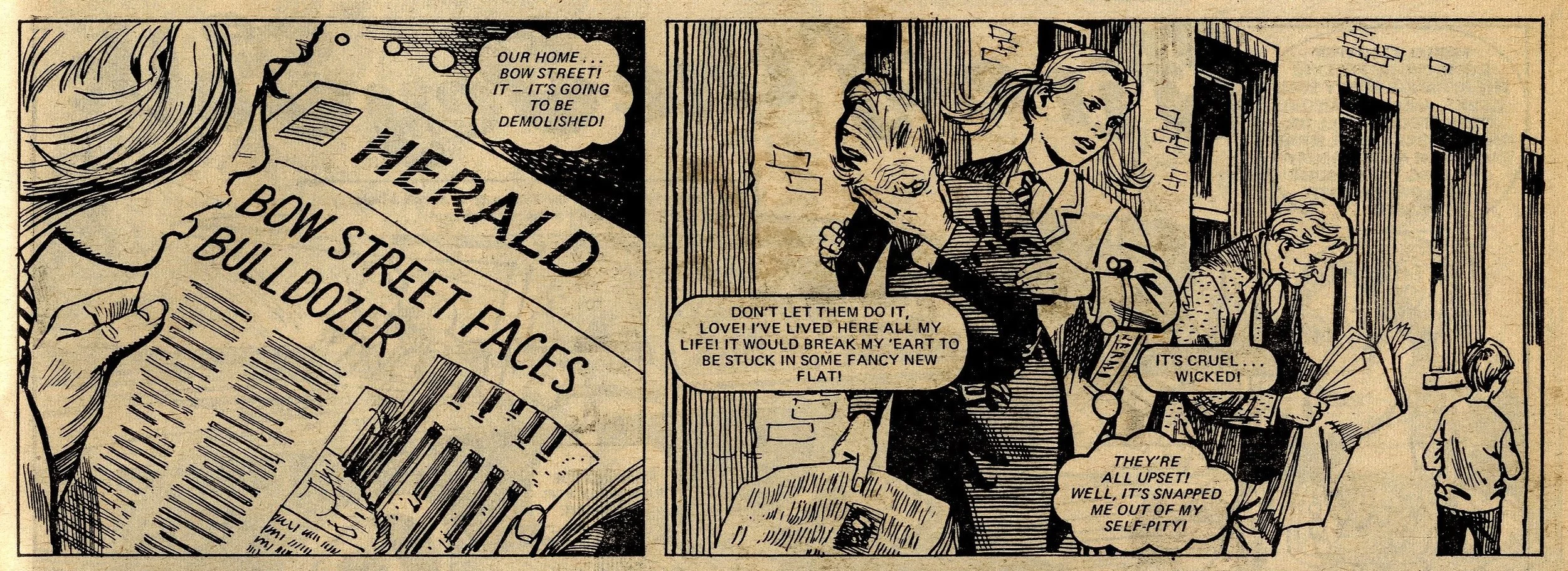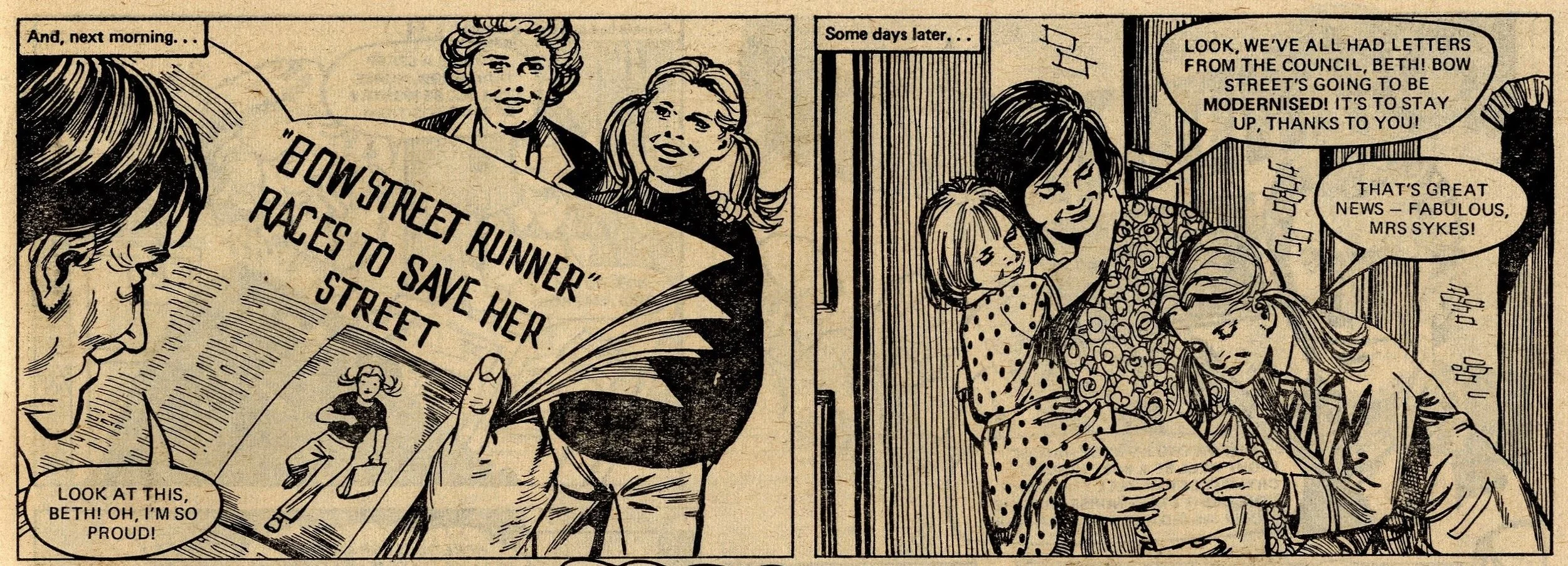 The stakes grow higher when all the residents of Bow Street receive a letter from the council announcing that the street has been scheduled for demolition – to be replaced by modern but community-lite flats built by Louise’s property developer father. But Beth’s fightback begins when the local newspaper runs a story on her plight and the new development is cancelled. In the big race, she rescues Louise who has fallen down a quarry in thick mist. The race is re-run, Beth wins and, as a reward, Louise’s dad builds the Speede family a special bungalow at the top of Bow Street which enables Beth to continue running errands for her neighbours … which pleases Beth, but I wonder whether it was really what she needed. Still, the social order was maintained and consciences were no doubt salved. Let’s try not think about the state of Beth Speede’s physical, mental and emotional health today.
