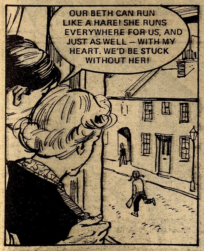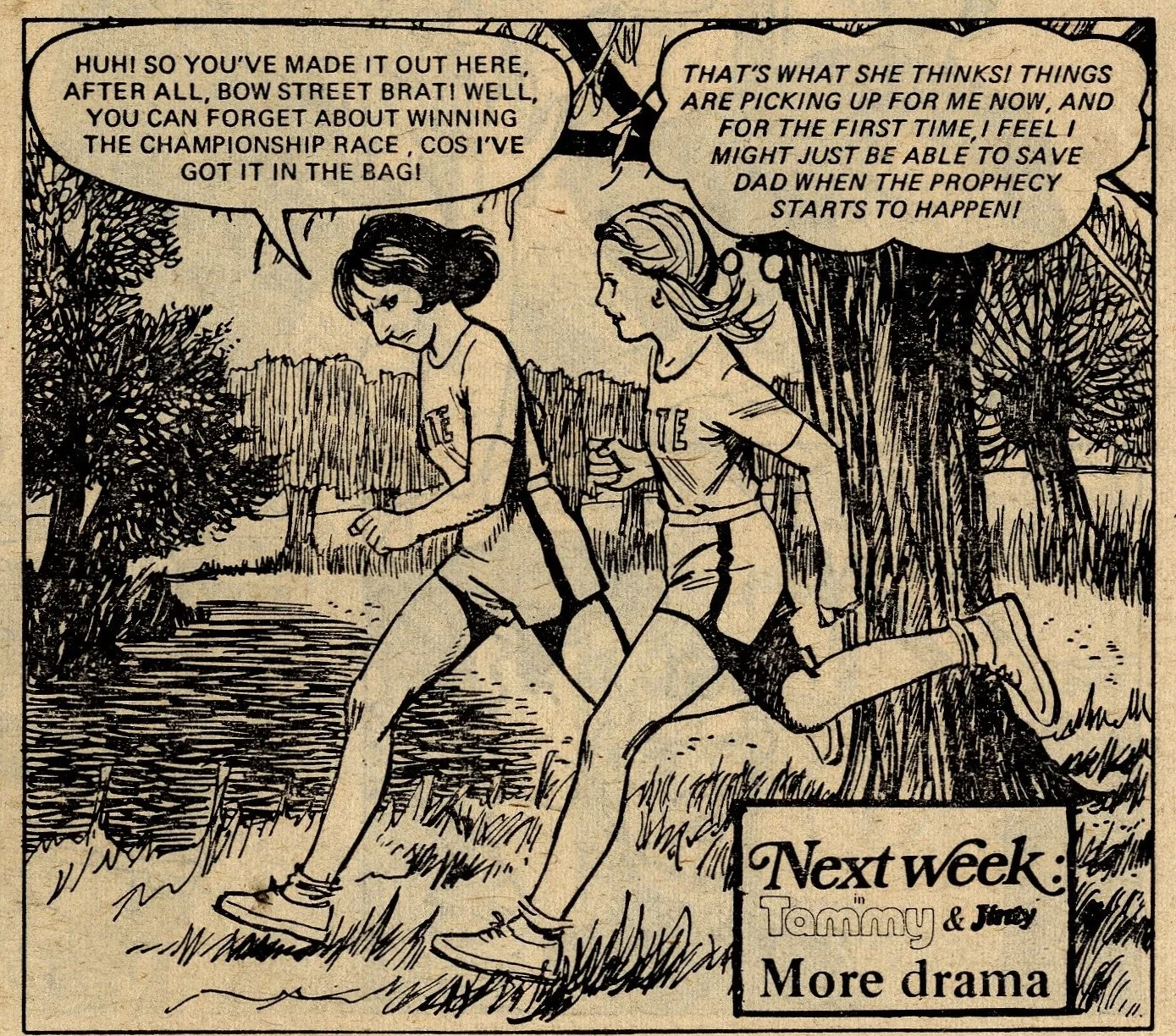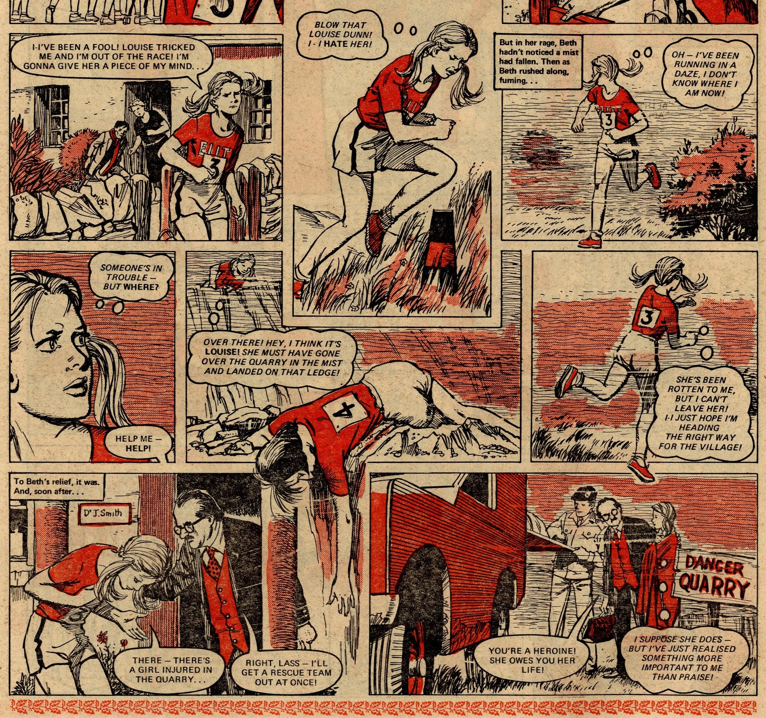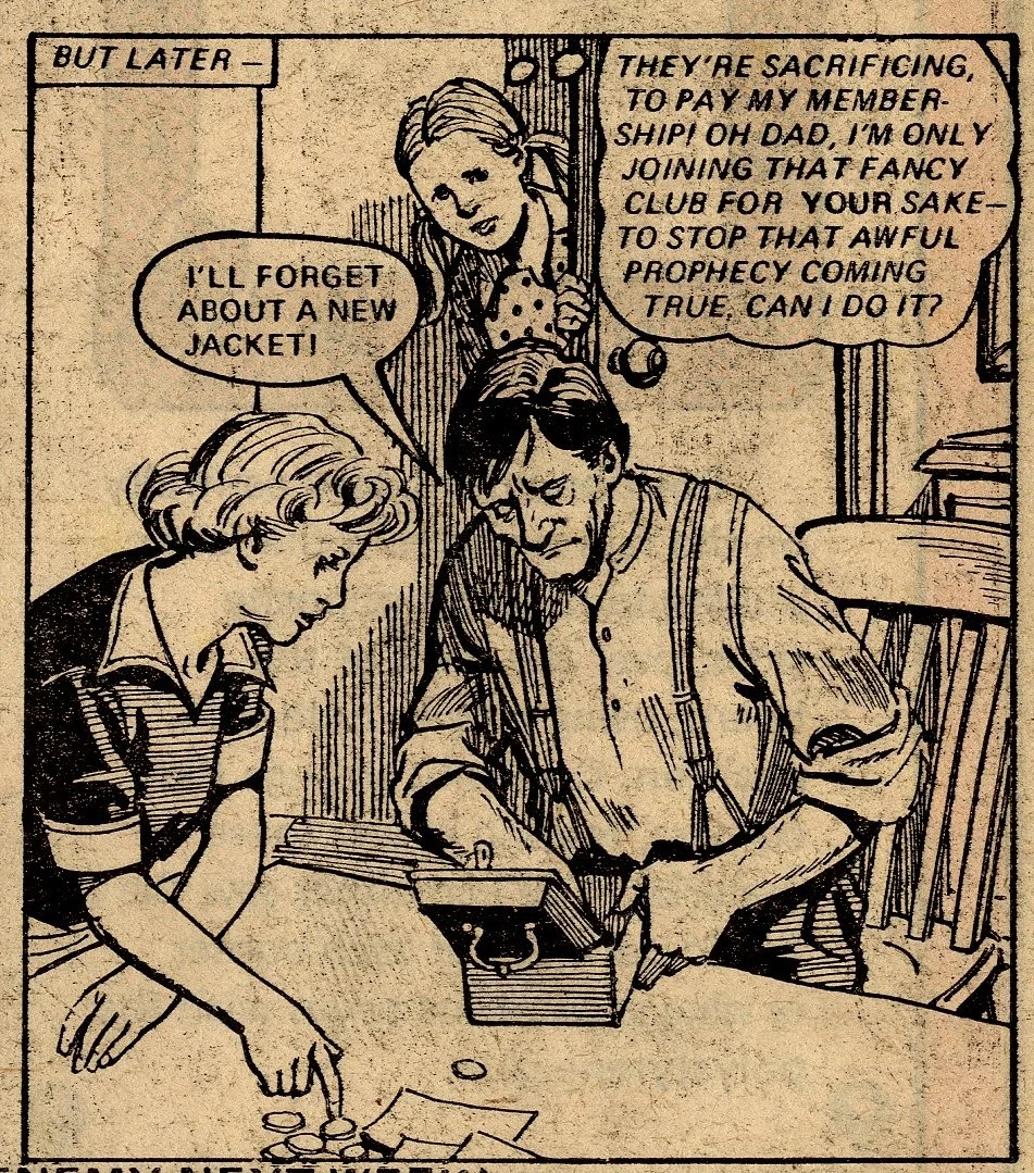 A fairground fortune-teller – a familiar narrative device in girls’ comic tales – foretells a scenario in which Beth was running across green fields, and a girl was crying. Beth interprets this as a prediction of her father suffering a heart attack and her running across fields in an unsuccessful attempt to get help. In order to train herself for this eventuality, she joins an out-of-town cross-country running club, but is entered for a race which leads to a friend of the family offering the Speedes use of their cottage in the countryside. All of a sudden, Beth’s interpretation of the prophecy changes – now she believes that her father’s heart attack will occur while he is in the remote cottage and it will become even harder for him to receive help.