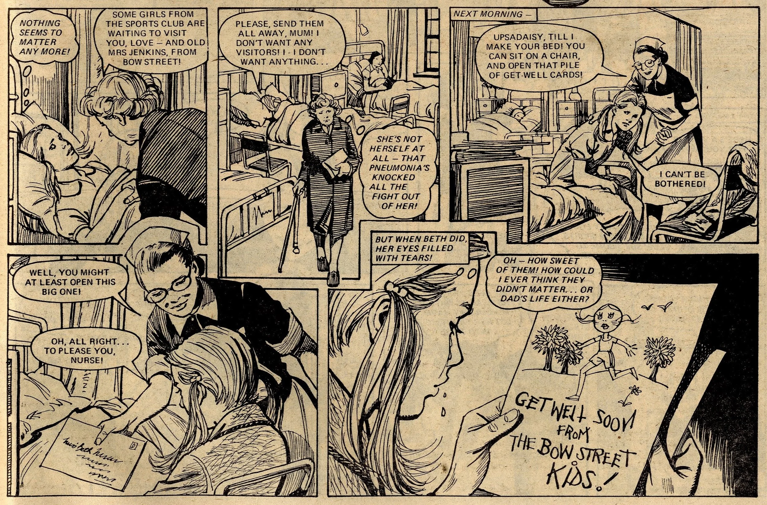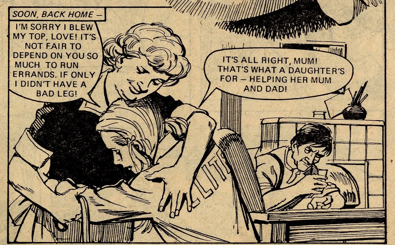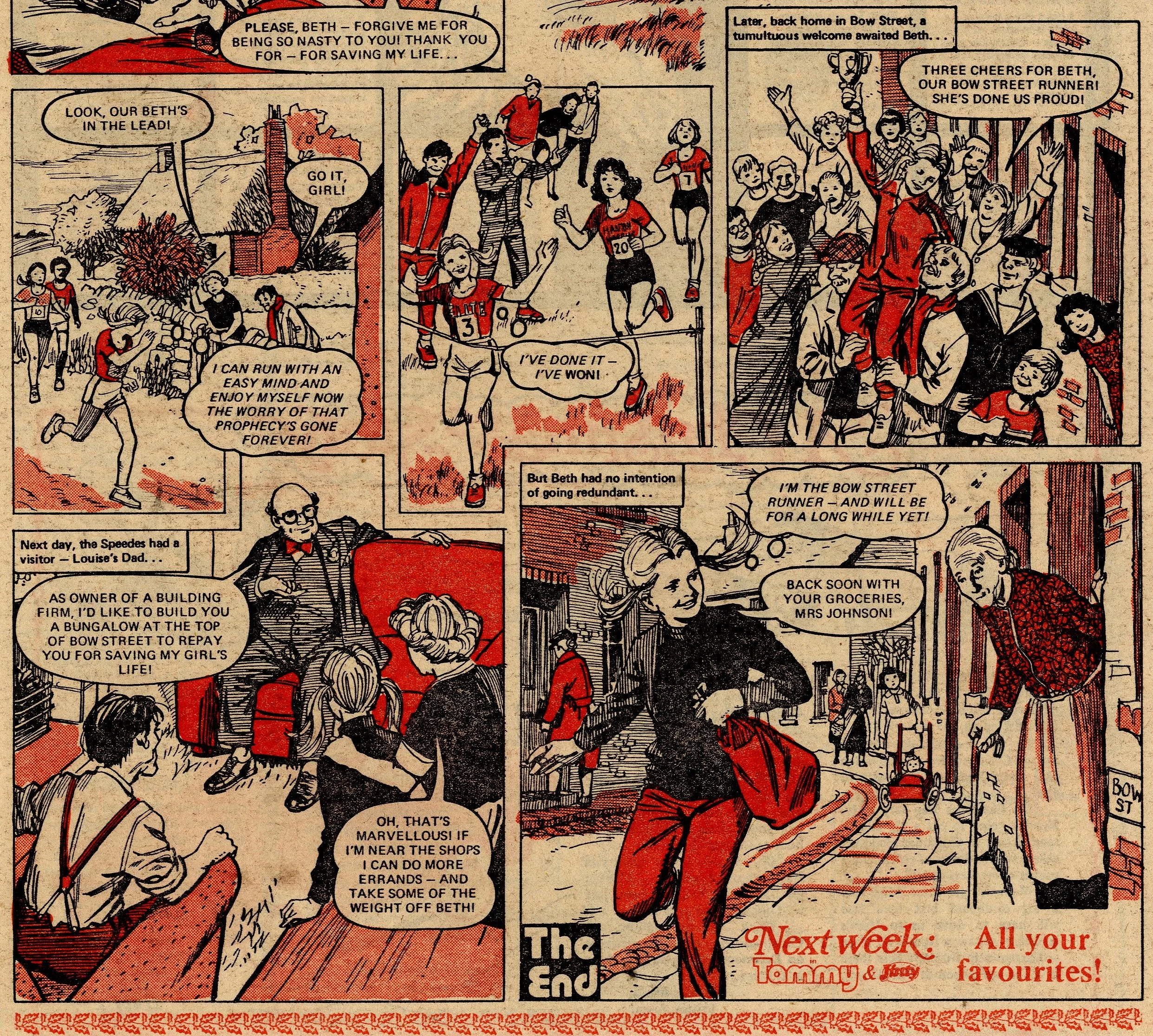 A fairground fortune-teller – a familiar narrative device in girls’ comic tales – foretells a scenario in which Beth was running across green fields, and a girl was crying. Beth interprets this as a prediction of her father suffering a heart attack and her running across fields in an unsuccessful attempt to get help. In order to train herself for this eventuality, she joins an out-of-town cross-country running club, but is entered for a race which leads to a friend of the family offering the Speedes use of their cottage in the countryside. All of a sudden, Beth’s interpretation of the prophecy changes – now she believes that her father’s heart attack will occur while he is in the remote cottage and it will become even harder for him to receive help.