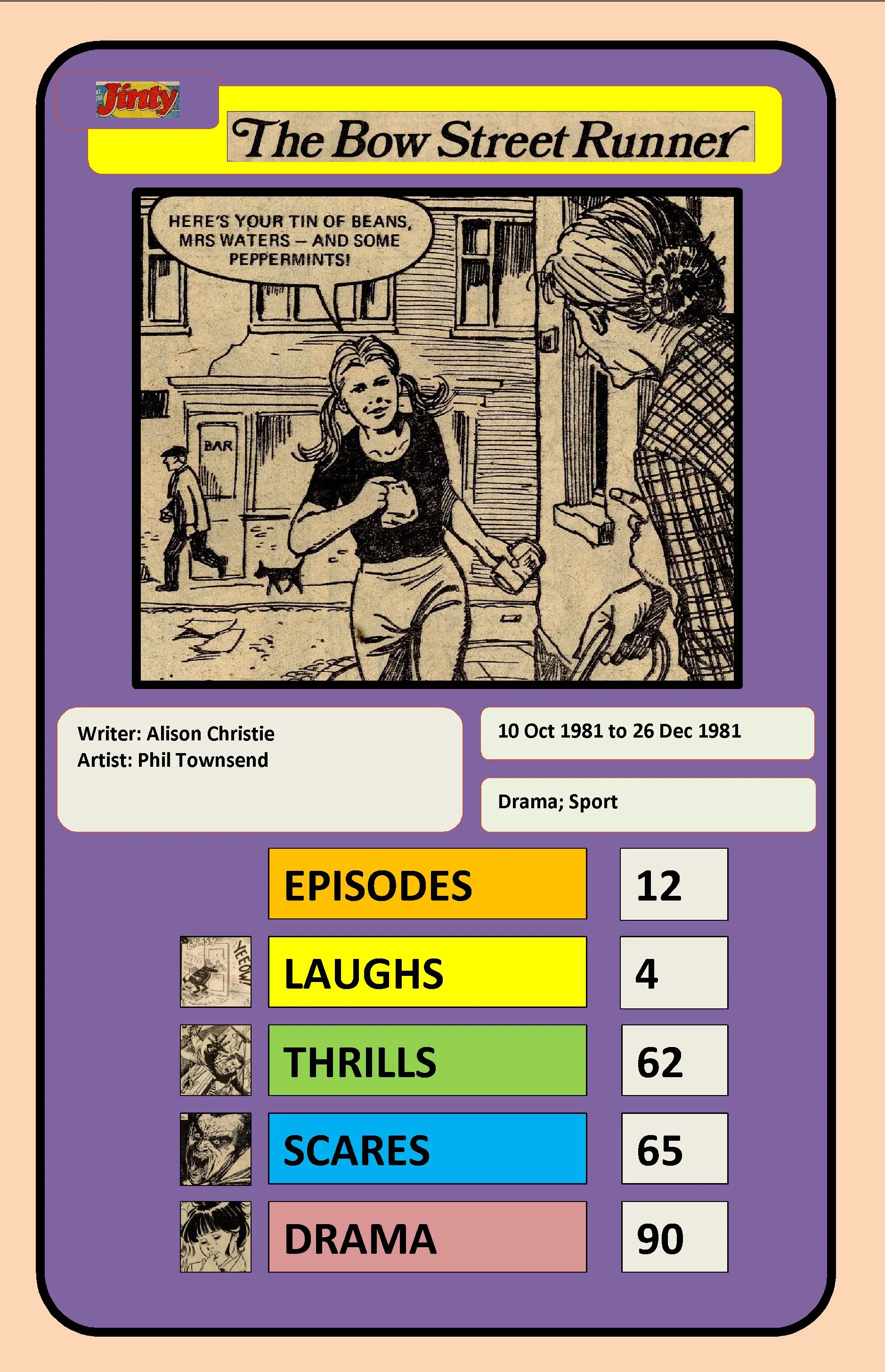 The Bow Street Runner is Beth Speede, the single child of parents who are both in poor health (Dad has a debilitating heart condition, and Mum is described vaguely as both ‘lame’ and ‘crippled’), and resident of Bow Street, a poor residential neighbourhood in an unnamed town or city. Beth loves to run, and has been literally running essential errands – collecting shopping and doctor’s prescriptions – for as long as she can remember. Most of the time she does so with a smile, but in private, the responsibilities weighed heavily on her young shoulders: ‘The Bow Street folk are too hard-up to have phones – and most of them are either old, or have young families! They depend on me!’