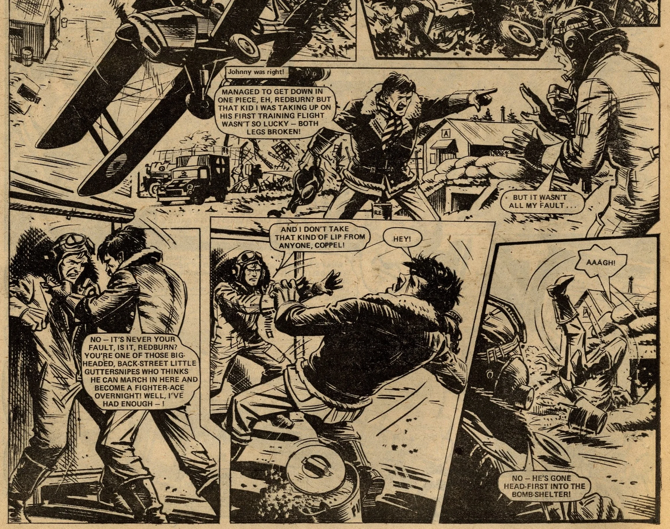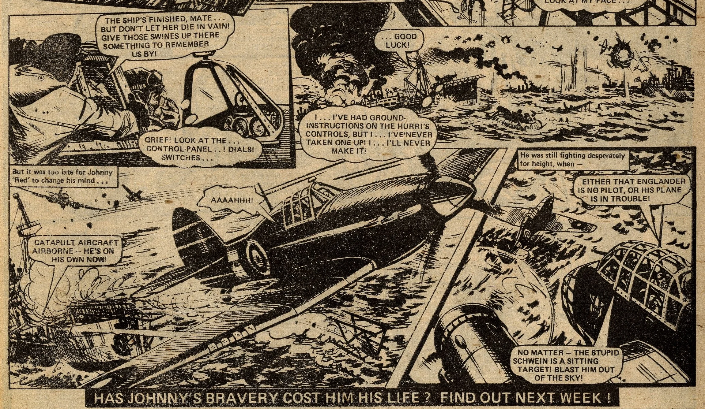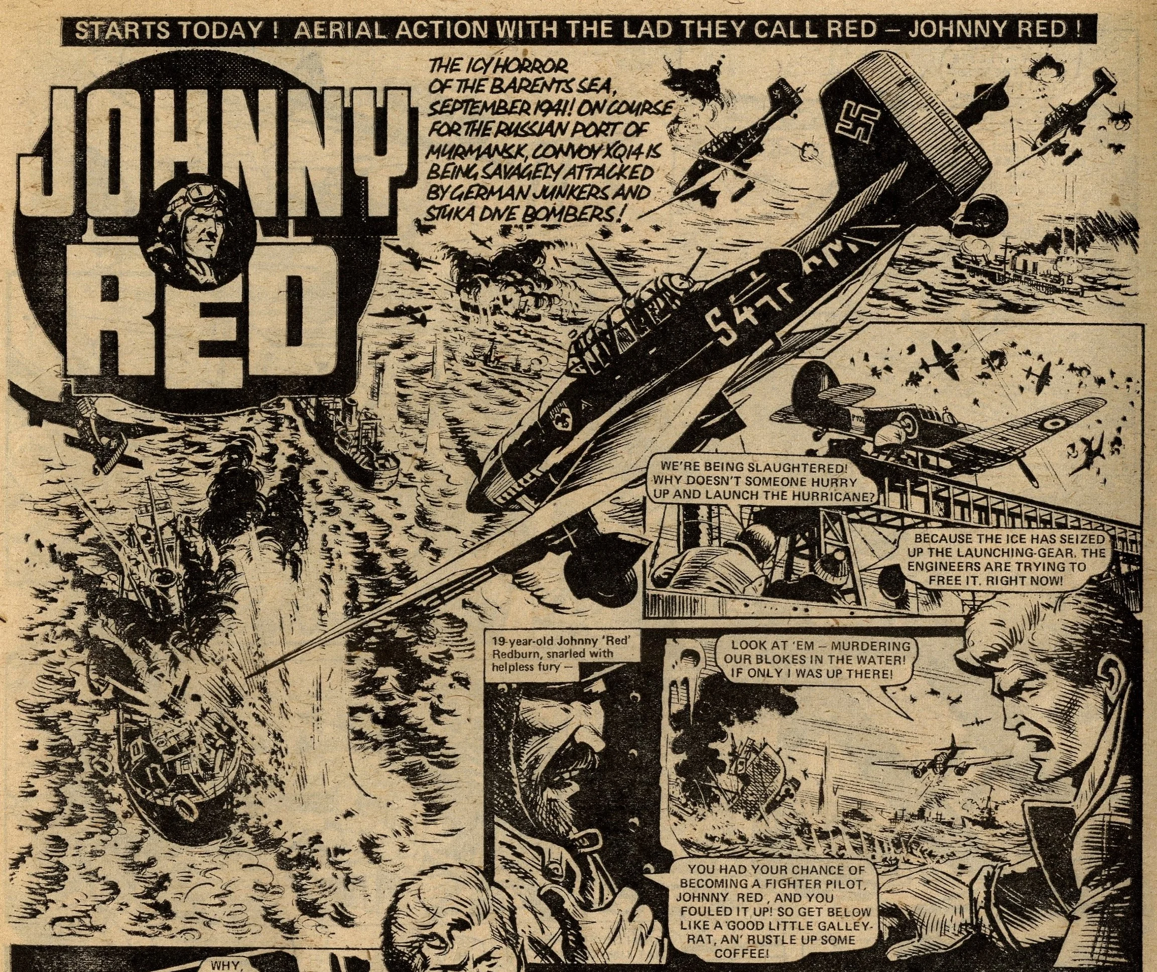 Most worthy of mention here is the first episode of Johnny Red, a story which would run for ten years as possibly Battle’s best-remembered tale. Johnny Redburn was a 19-year-old seaman in the Merchant Navy, regretting having failed his pilot training after being wrongly accused of assaulting an officer. This opening instalment provides the flashbacks to Johnny’s past and launches him into the skies on a path that will see him join the Russian air force.