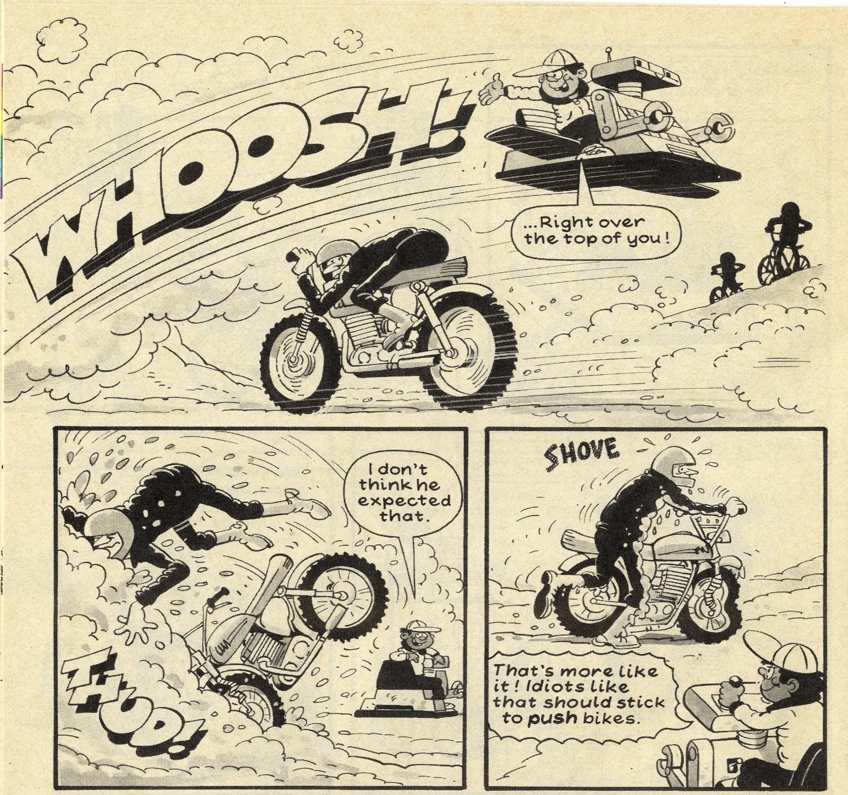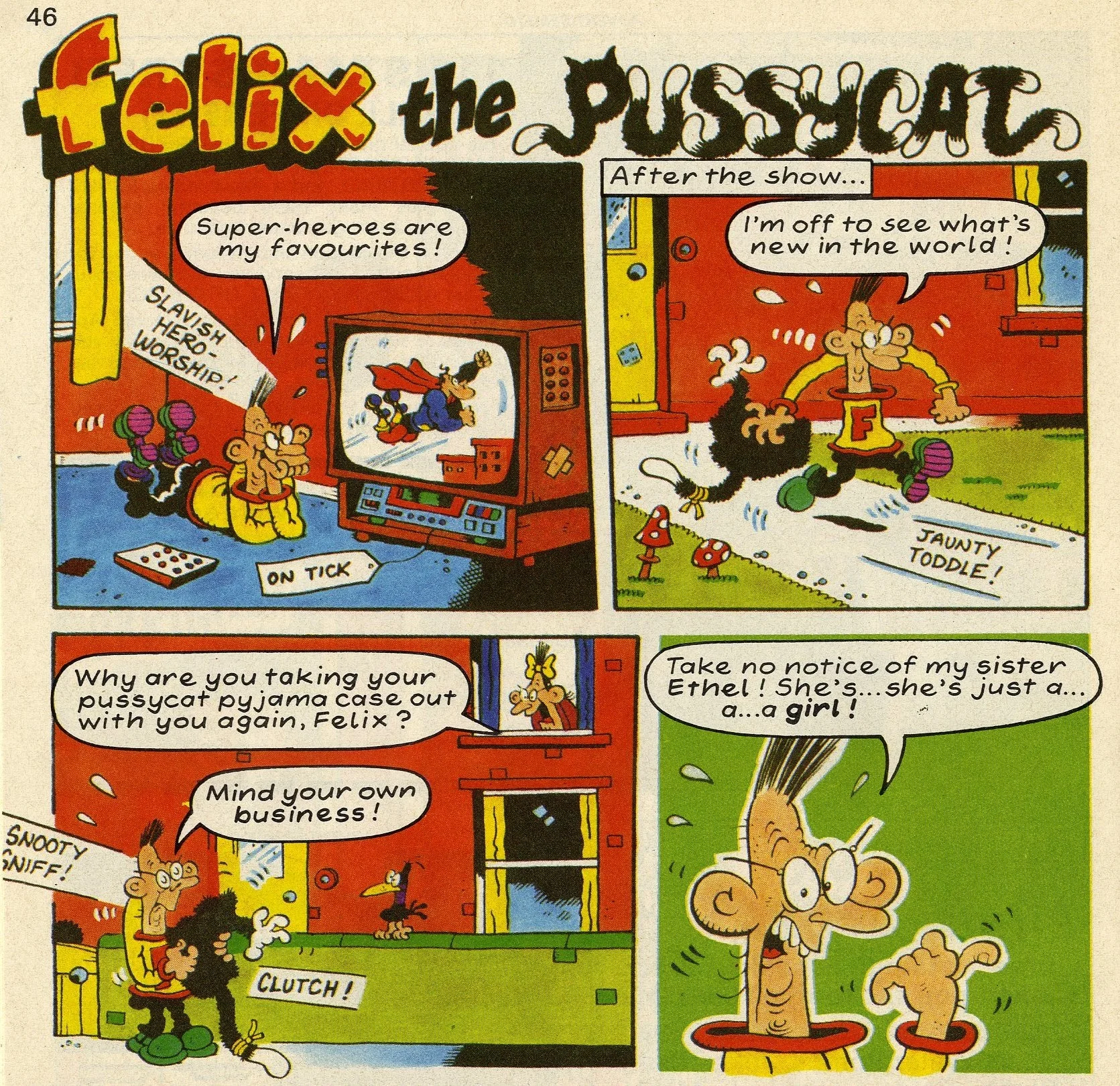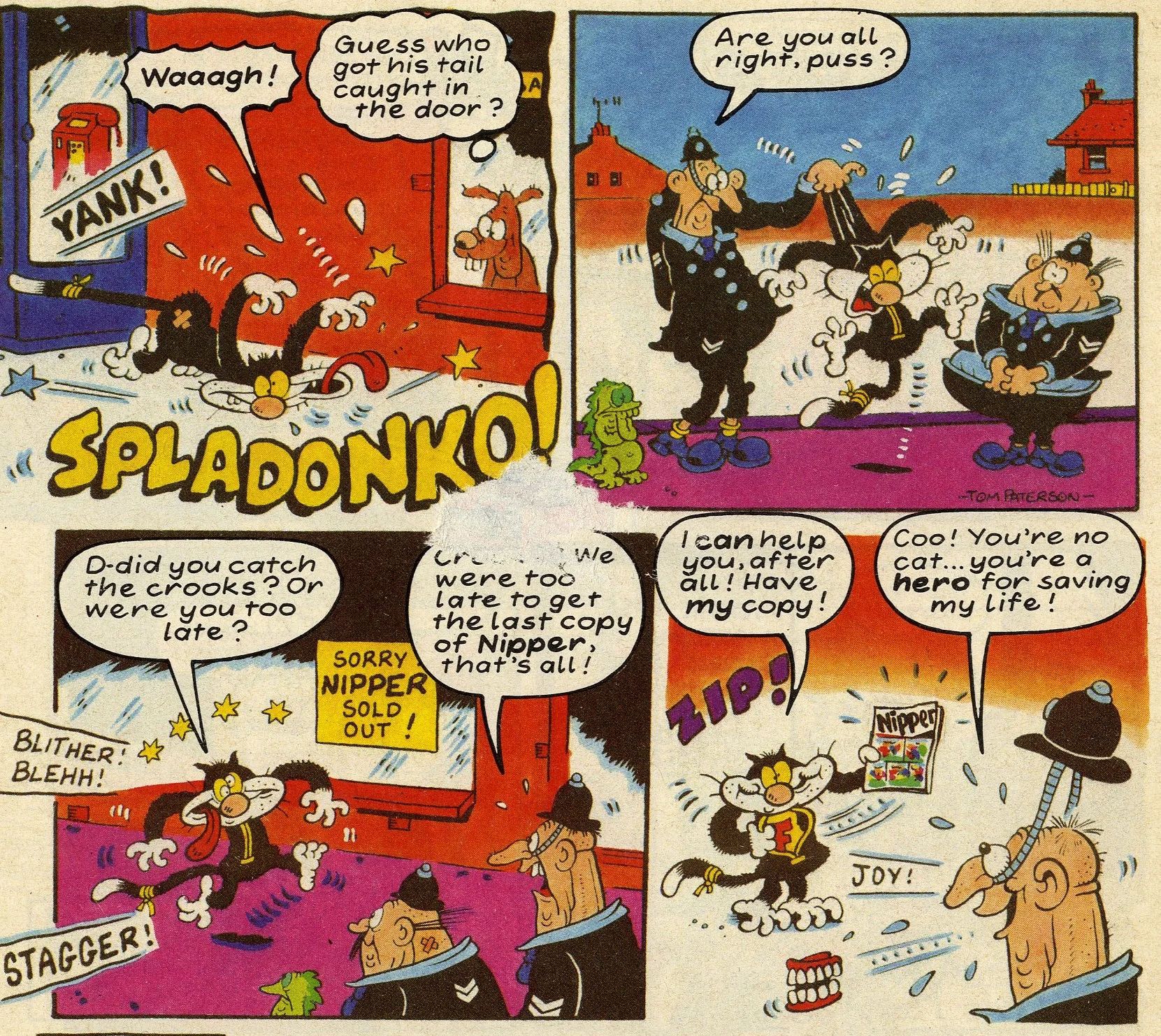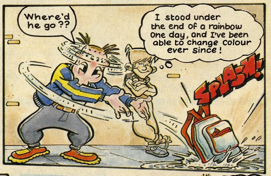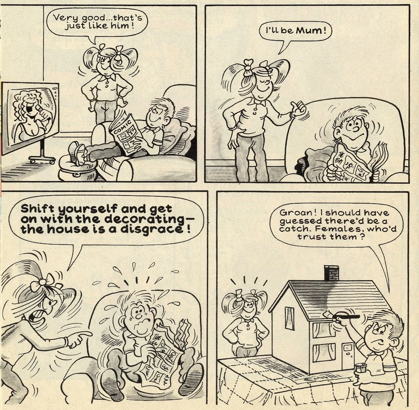 Like the sweeties, the comic is a mixed bag. A few of the strips, such as Nipper, First-time Fred and Double Trouble, seem to offer little that one wouldn’t have been able to find in other comics of the time. There are a few midget gems, including Tom Paterson’s Felix the Pussycat, a Danger Mouse-like James Pond, the colourful Ricky Rainbow and Mike Lacey’s buggy droid Strong Arm Command Kart. Single-parent strip My ‘Dad’ Mum has an underlying poignancy, and Kelpie’s Kingdom is an attractively-told fantasy adventure with lovely artwork by Bob Harvey. Watch out too for a surprise Whizz-kid raid!