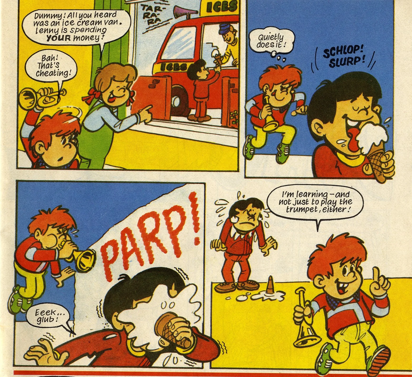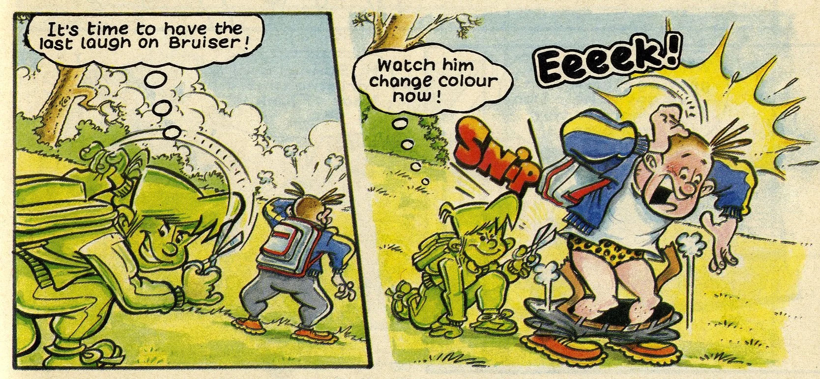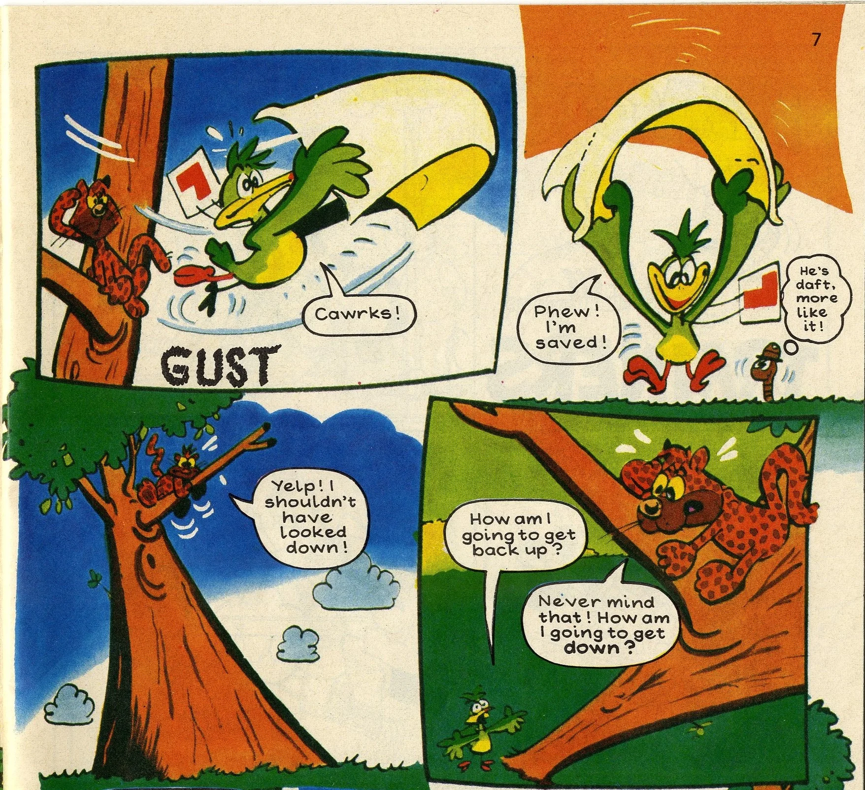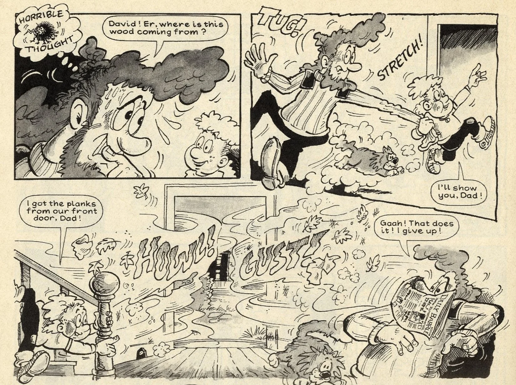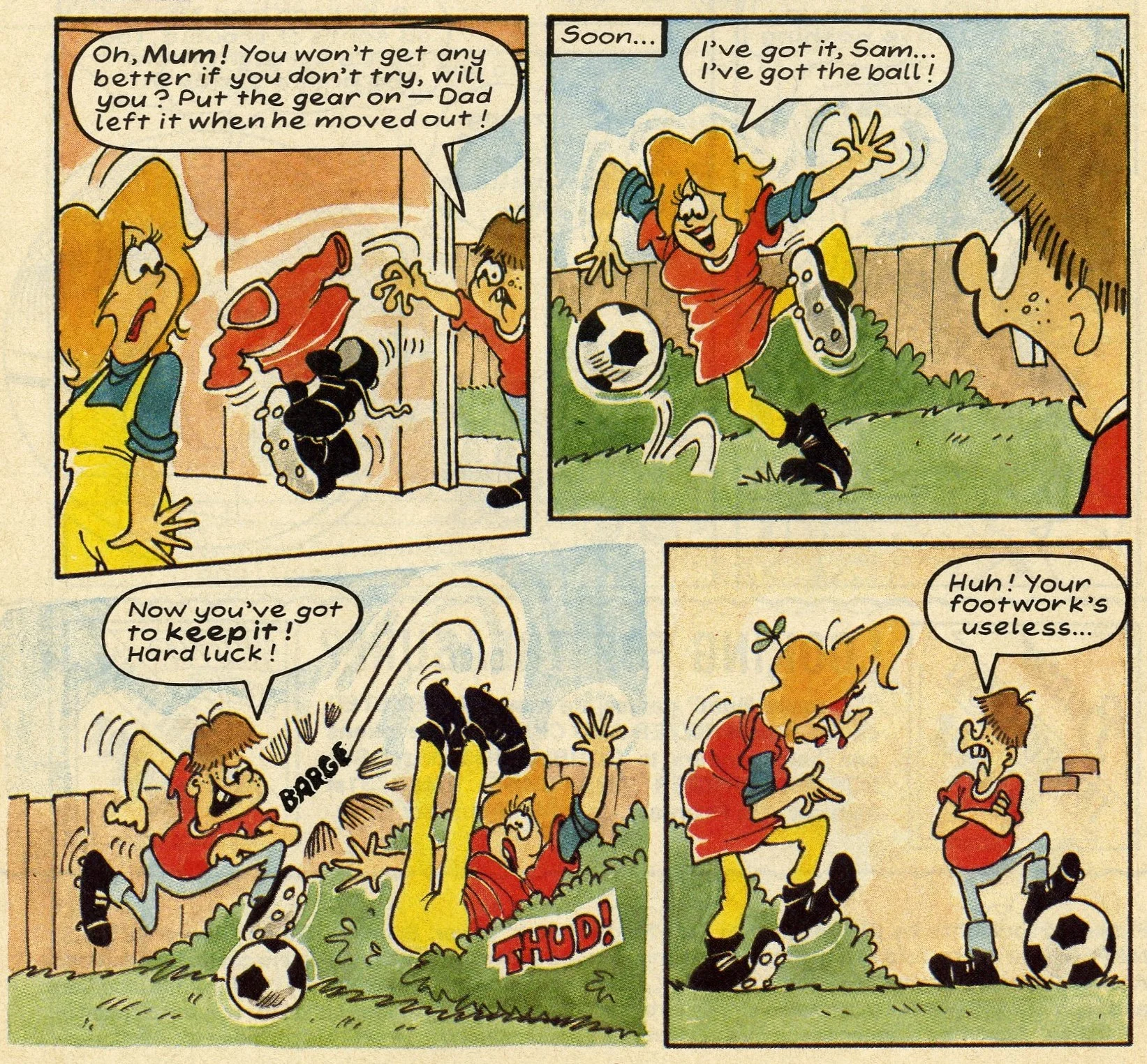 Like the sweeties, the comic is a mixed bag. A few of the strips, such as Nipper, First-time Fred and Double Trouble, seem to offer little that one wouldn’t have been able to find in other comics of the time. There are a few midget gems, including Tom Paterson’s Felix the Pussycat, a Danger Mouse-like James Pond, the colourful Ricky Rainbow and Mike Lacey’s buggy droid Strong Arm Command Kart. Single-parent strip My ‘Dad’ Mum has an underlying poignancy, and Kelpie’s Kingdom is an attractively-told fantasy adventure with lovely artwork by Bob Harvey. Watch out too for a surprise Whizz-kid raid!