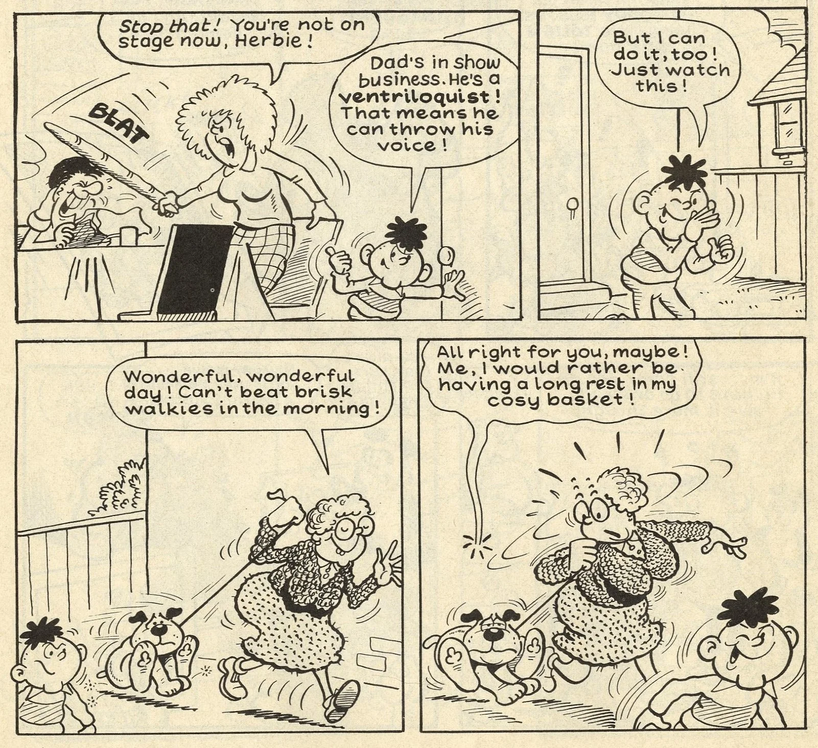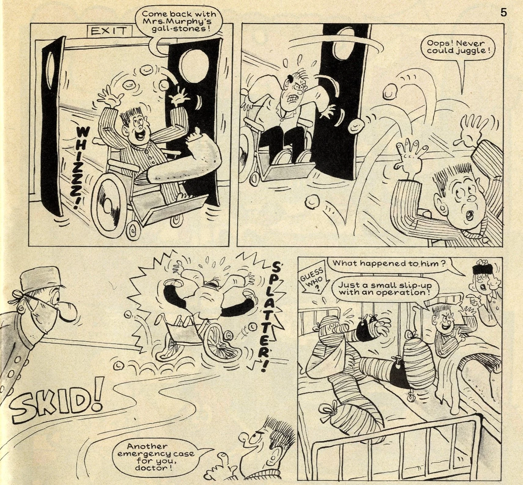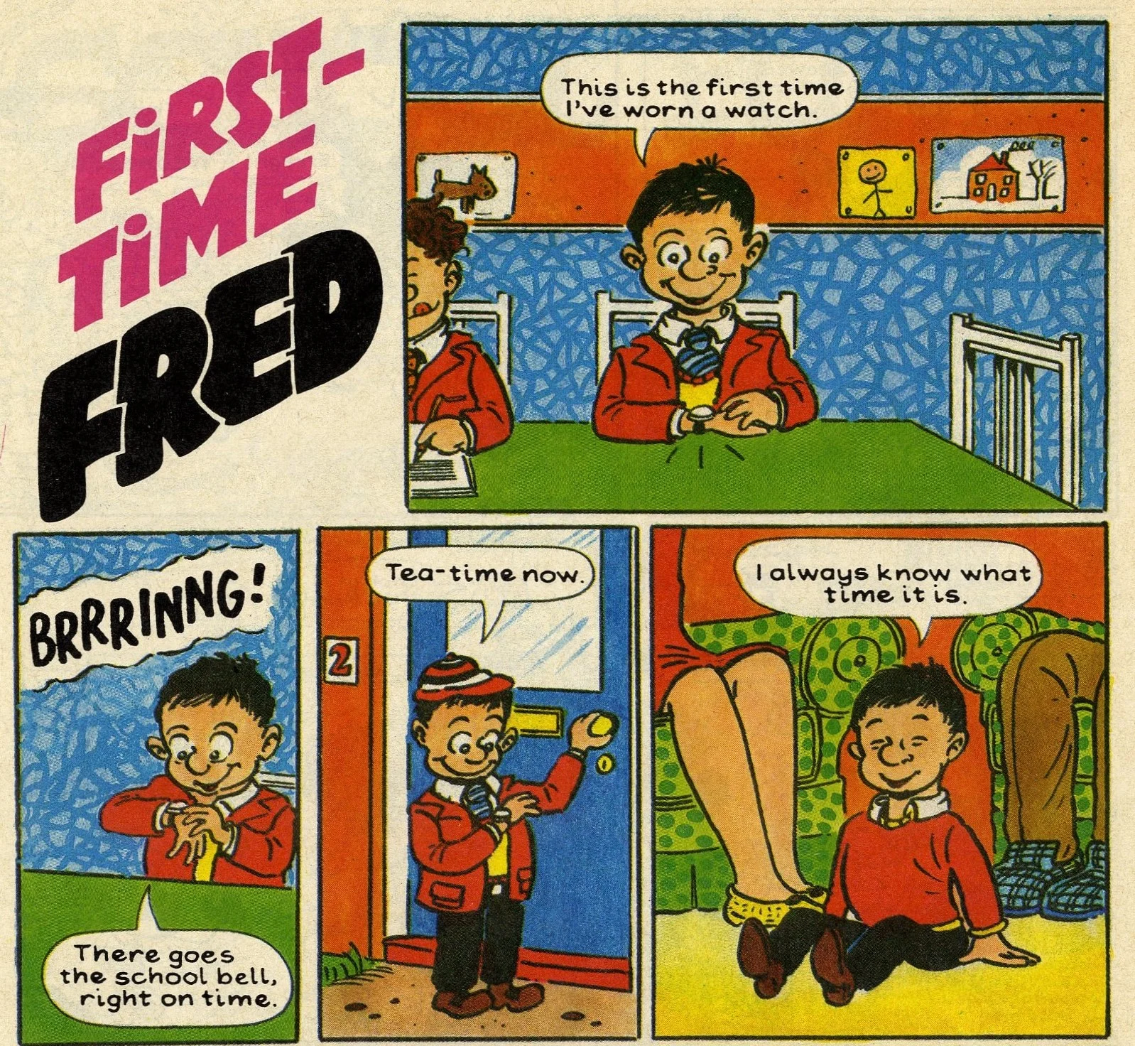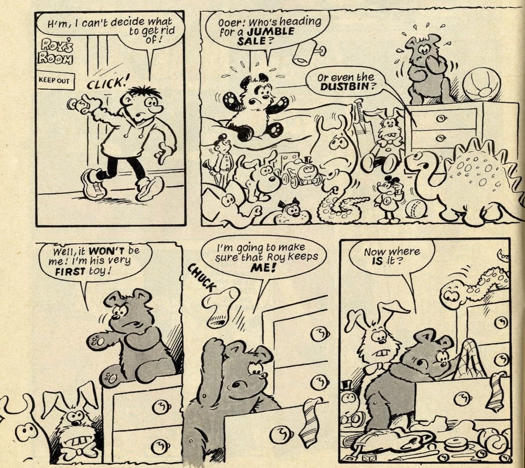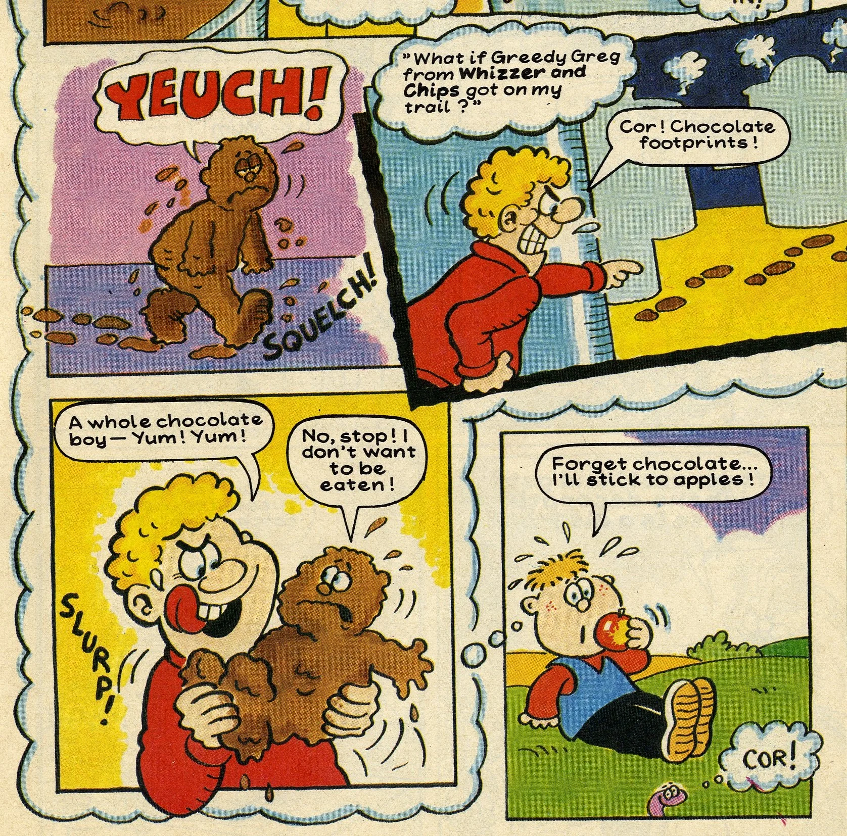 Like the sweeties, the comic is a mixed bag. A few of the strips, such as Nipper, First-time Fred and Double Trouble, seem to offer little that one wouldn’t have been able to find in other comics of the time. There are a few midget gems, including Tom Paterson’s Felix the Pussycat, a Danger Mouse-like James Pond, the colourful Ricky Rainbow and Mike Lacey’s buggy droid Strong Arm Command Kart. Single-parent strip My ‘Dad’ Mum has an underlying poignancy, and Kelpie’s Kingdom is an attractively-told fantasy adventure with lovely artwork by Bob Harvey. Watch out too for a surprise Whizz-kid raid!