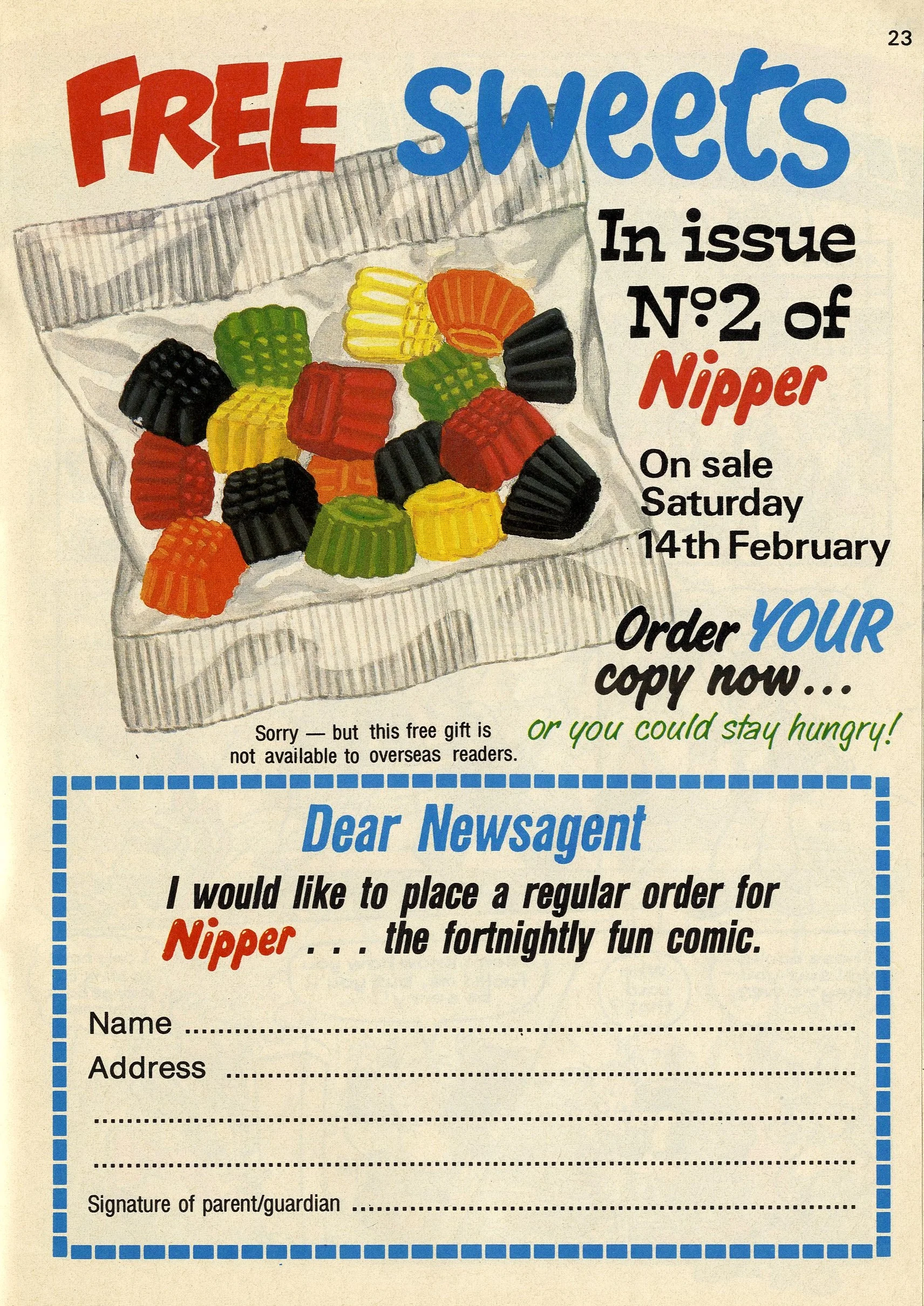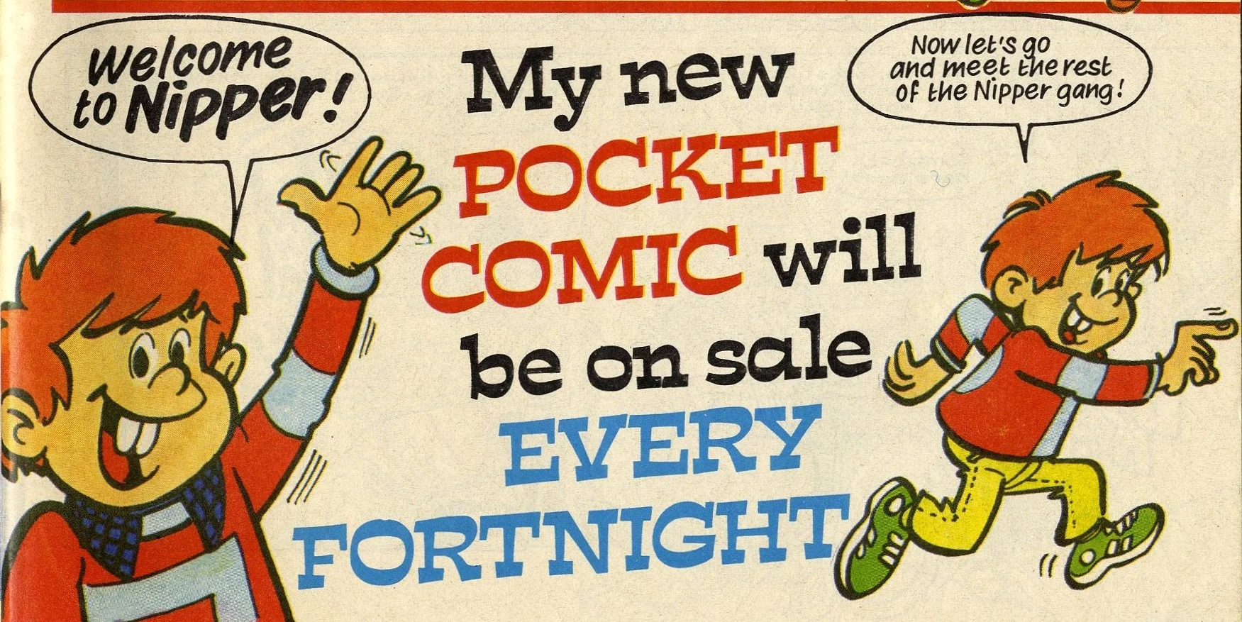 Nipper’s USP was its tiny format (210x148mm), an experiment that lasted only five issues before shifting (by magic!) to a more traditional size. My guess is that it simply wasn’t getting seen amid the larger comics and magazines on the newsagents’ racks. I’m a book publisher and we’ve occasionally experimented with smaller-format books – the cheaper cover price can be attractive, but unless the book is a huge hit and retailers can be persuaded to give it special display treatment then more often than not it will be lost and forgotten. Here’s how little Nipper compared to big Nipper: