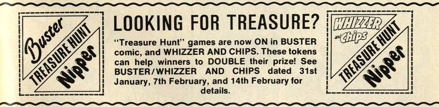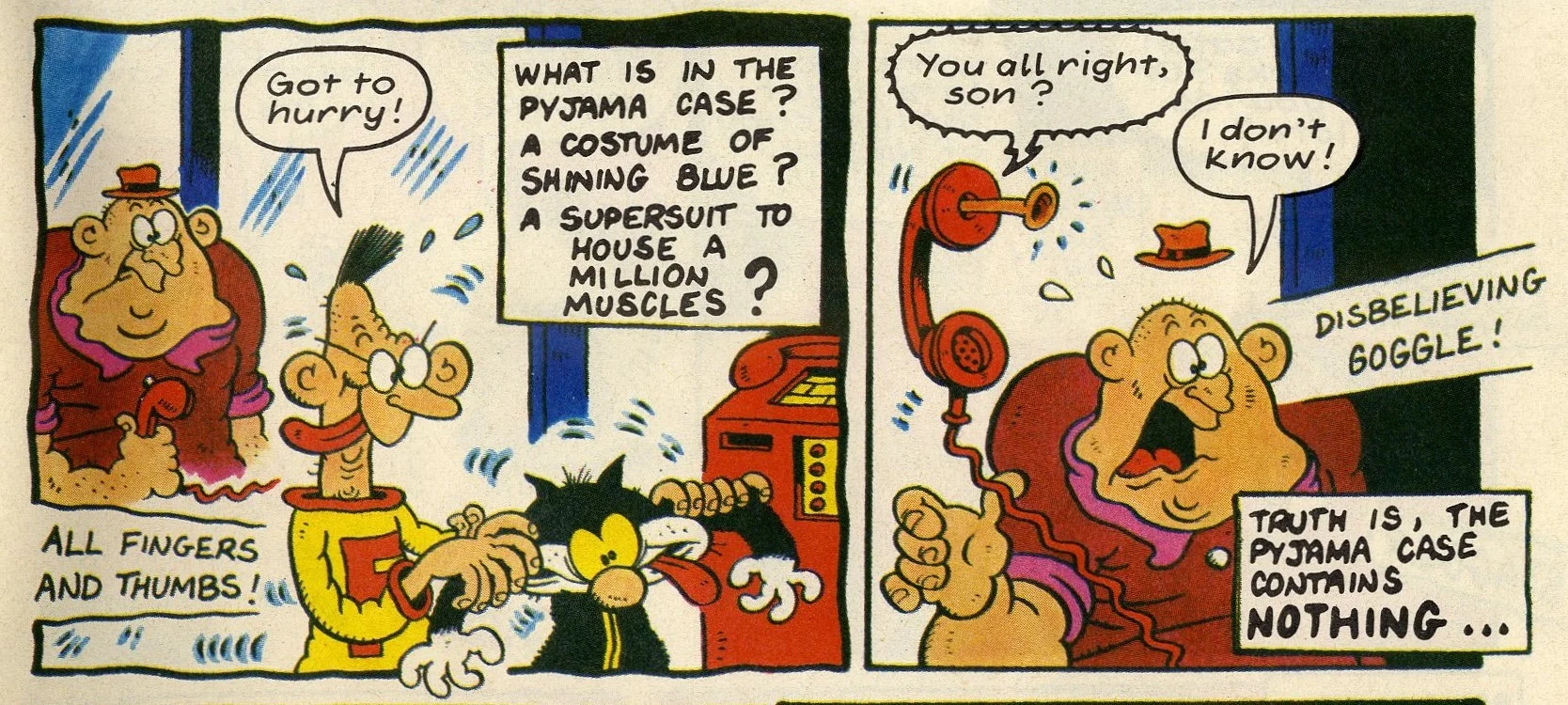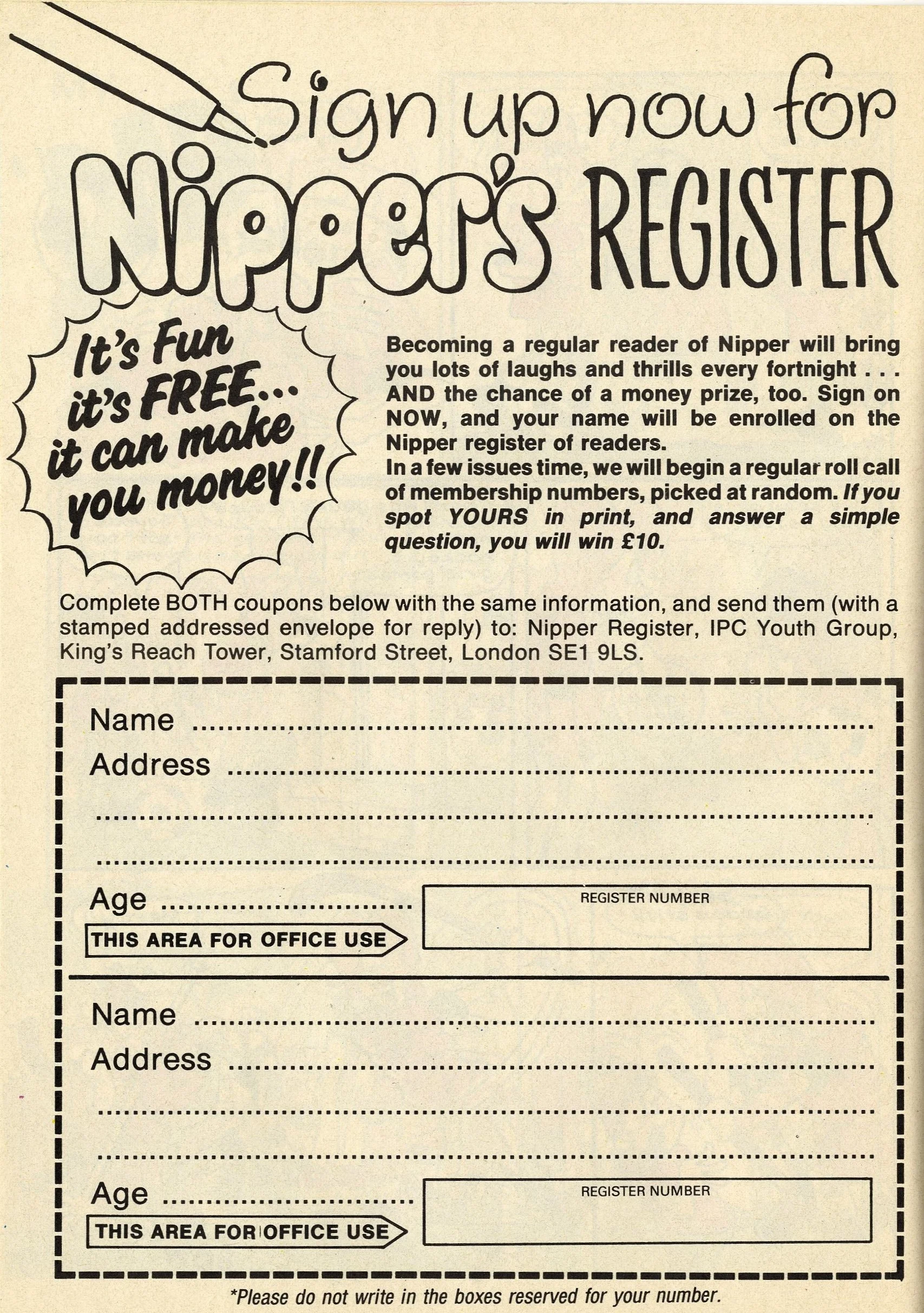 So, these were a free gift with the first issue of Nipper, a new title for the humour market, and one of IPC’s final new comic launches. Nipper seems to have been aimed at a slightly younger readership than its stablemates Whizzer and Chips and Buster – that’s a guess based on the look of some of the characters: Nipper himself, Wonder Boy, Frankie’s Flashlight and First-time Fred all seem to be or feature kids who look like infants compared to the other comics’ juniors. It suggests an attempt by IPC to establish appeal across different juvenile age sectors, especially as it was also publishing Oink! at this time, which was pitched at a slightly higher age. As both Oink! and Nipper were merged into Buster (Nipper before the end of 1987), it looks as though the experiment failed. Or, it worked, and management decided to harvest all its new readers into one barn.