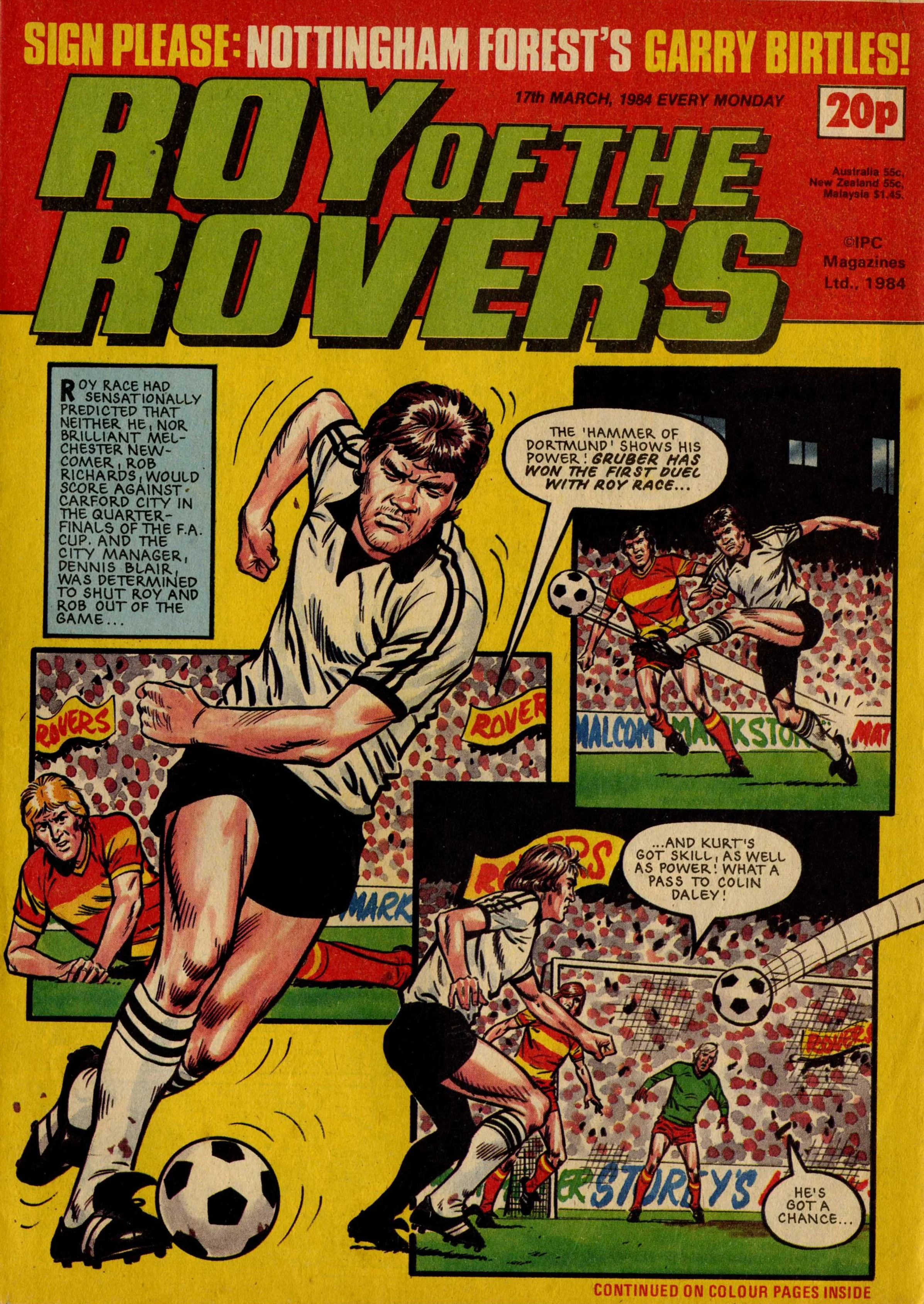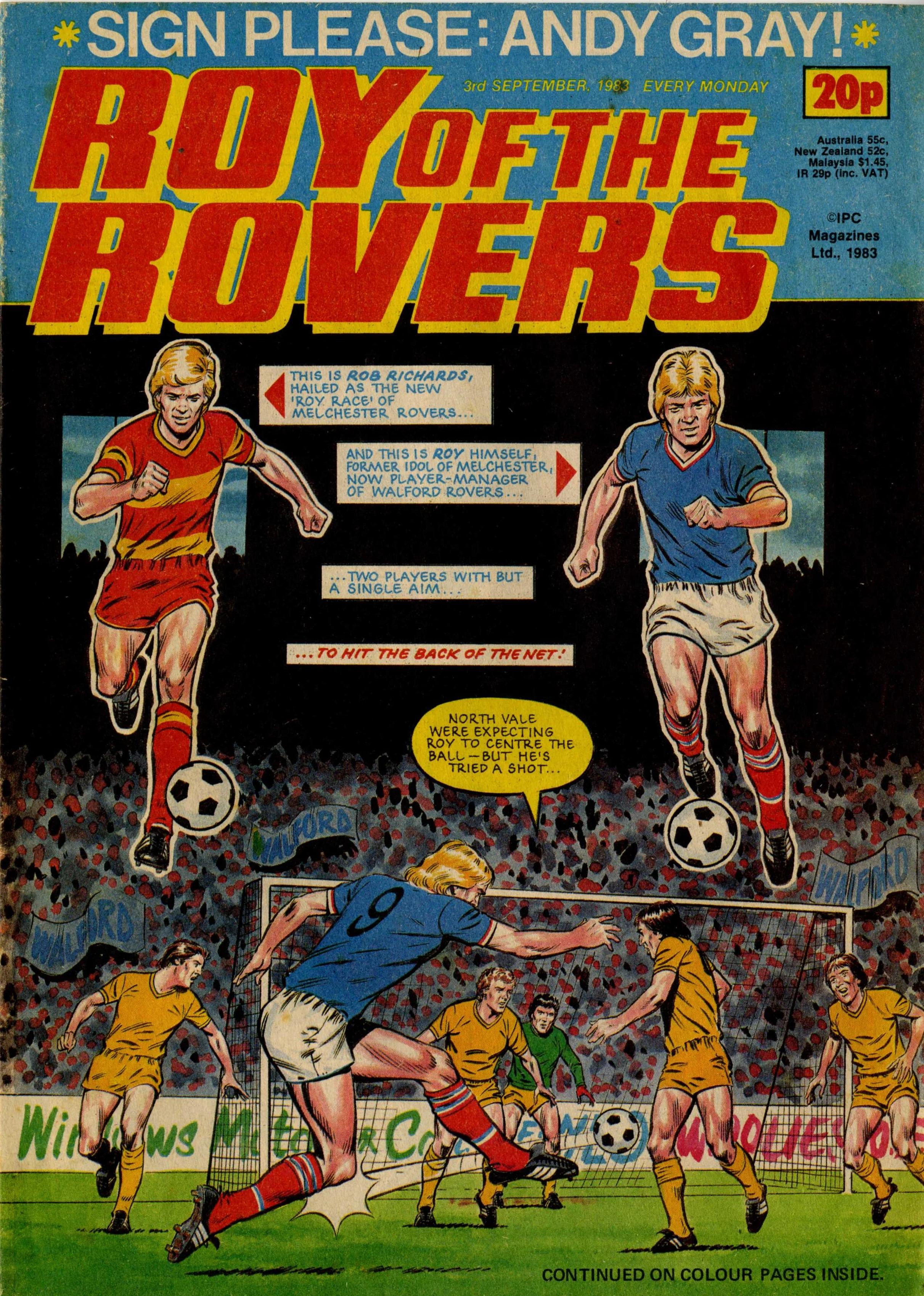 The season of 1983-84 feels to me like one of Roy of the Rovers’ longest years yet, although no less dramatic for that. The strip was extended to four pages long for most weeks during this time: Roy occupied the front cover of the comic most weeks, then continued on his usual double-page spread inside and an additional fourth page later in the comic or sometimes even on the back cover. His expanded adventures began as the previous season had ended, with Roy still in unhappy exile as player-manager of Walford Rovers, short of friendship and even of the comfort of his family as Penny refused to move away from Melchester with the children. His days darkened as rumours circulated of an affair with his Walford secretary, Sandie Lewis.