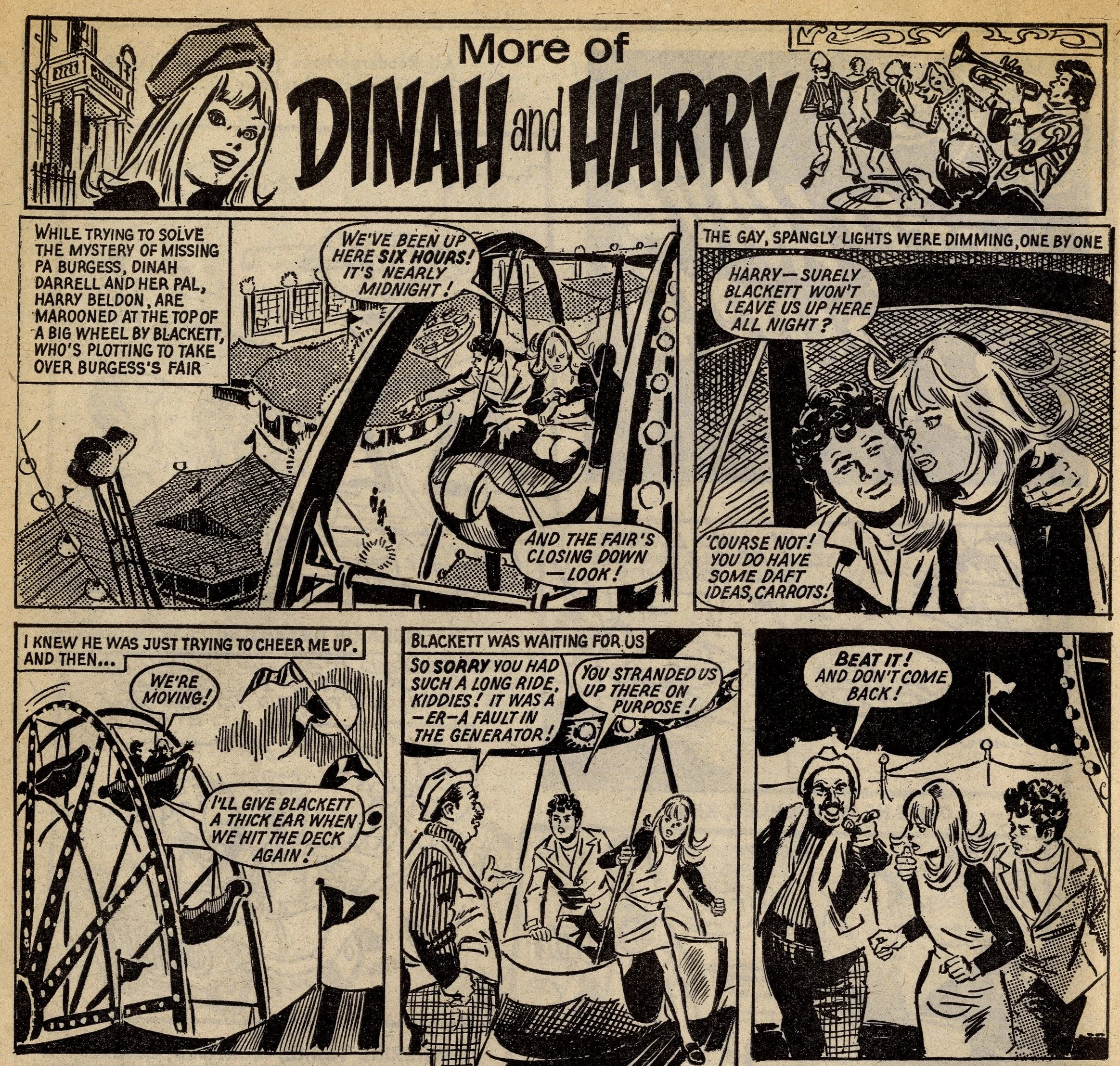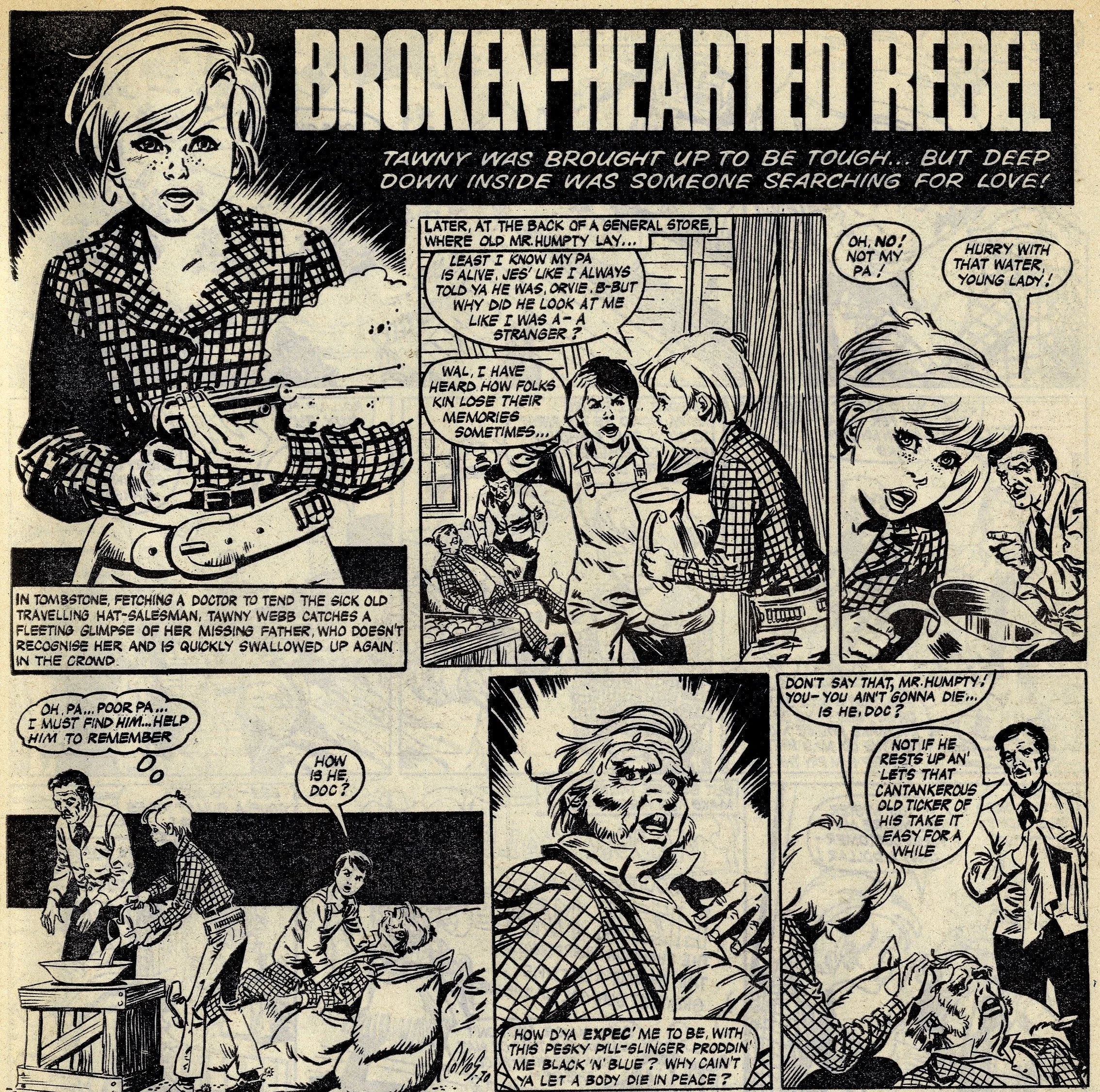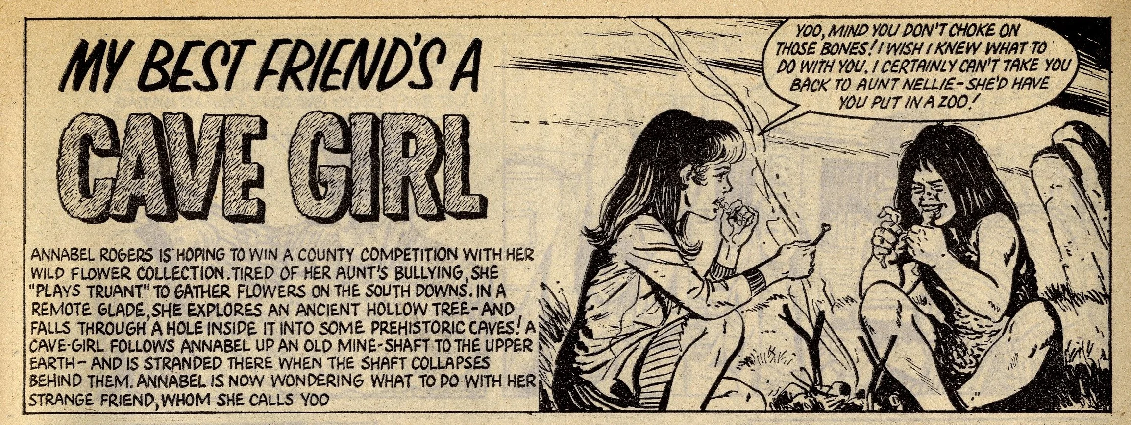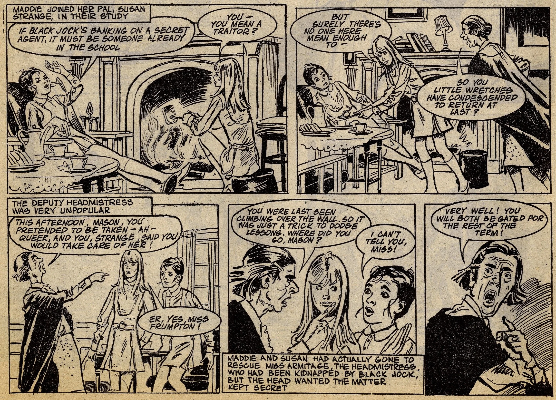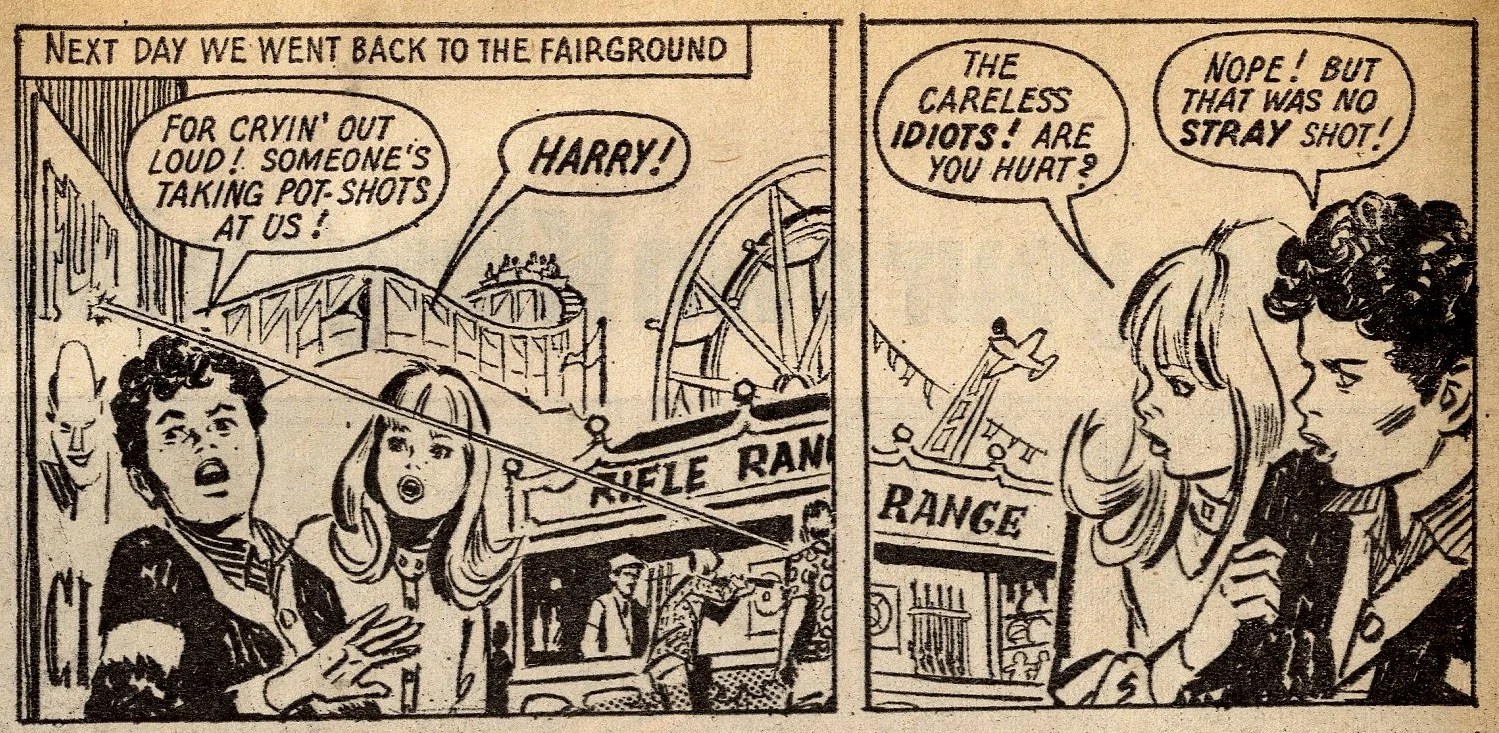 Cover story Maisie’s Magic Eye, drawn by the wonderful Robert McGillivray, was a fun story about a schoolgirl whose brooch turned the spoken commands of anyone within hearing range into reality, and plenty of the comic’s other strips – including the aforementioned Fanny, Sheila’s Skeelers, A Sister for Five Brothers and Mad Hatter’s Castle – were drama with a light-hearted tone that often strayed into slapstick. Sally’s cover caption announced that she was ‘The comic that is famous for exciting picture-stories’, a claim backed up by a number of stories with imaginative set-ups: My Best Friend’s a Cave Girl, The Ghost Hunters (spooky sci-fi with a Nancy Drew flavour, and a rare example of Shirley Bellwood’s stip work), Sara’s Kingdom (British schoolgirl is trialled to become queen of a Himalayan state), The Cat Girl (making feline leaps across urban Britain many years before The Leopard from Lime Street), Broken-hearted Rebel (gun-totin’ girls of the Wild West), High Dive Hazel (adventures of a swimming ace – I believe (thanks to Phil Rushton on the Comics UK forum) that this is a reprint of a 1960s June strip originally called Pat of the Dolphins, also drawn by Robert McGillivray), and Dinah and Harry (sleuthing pals).
