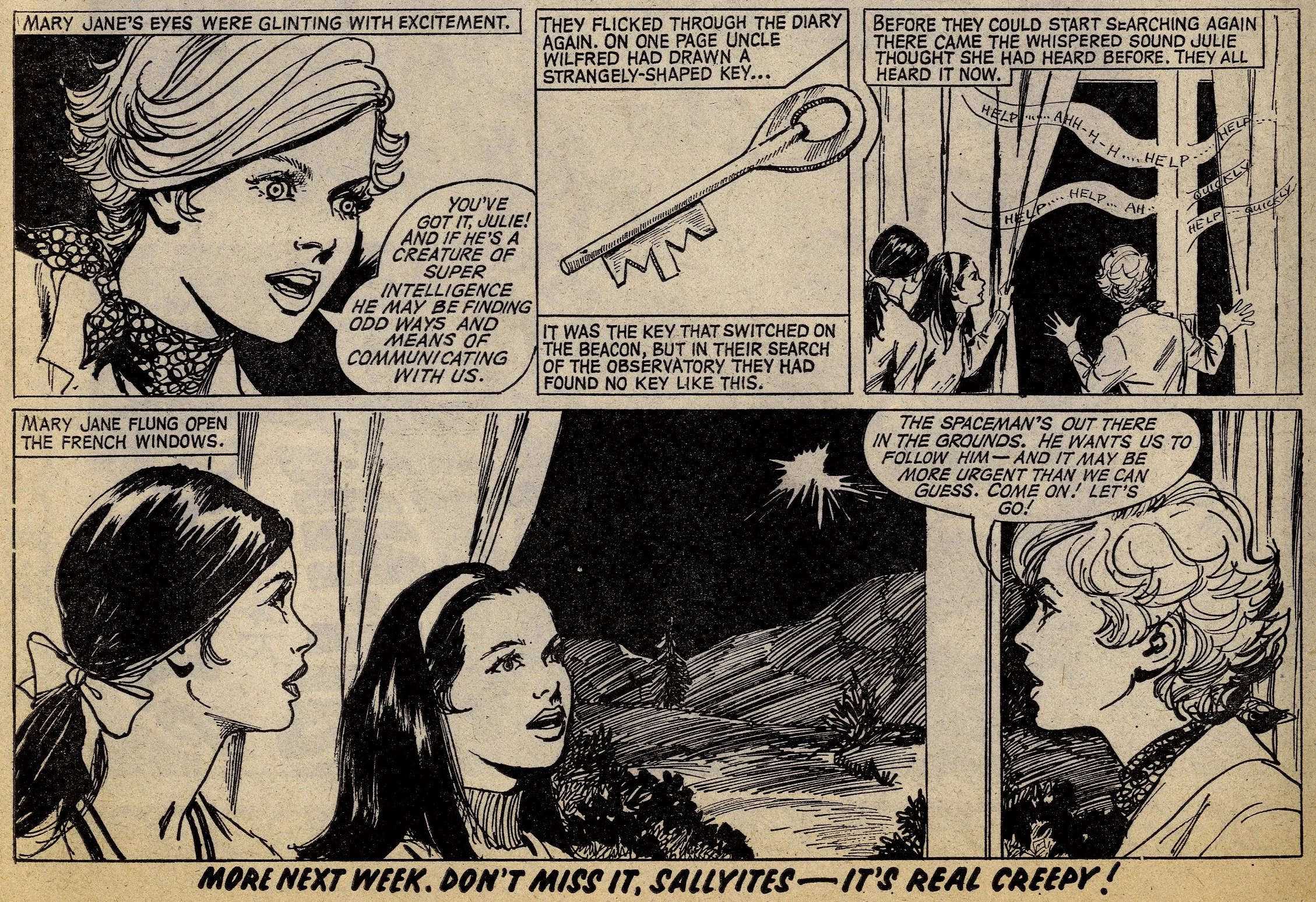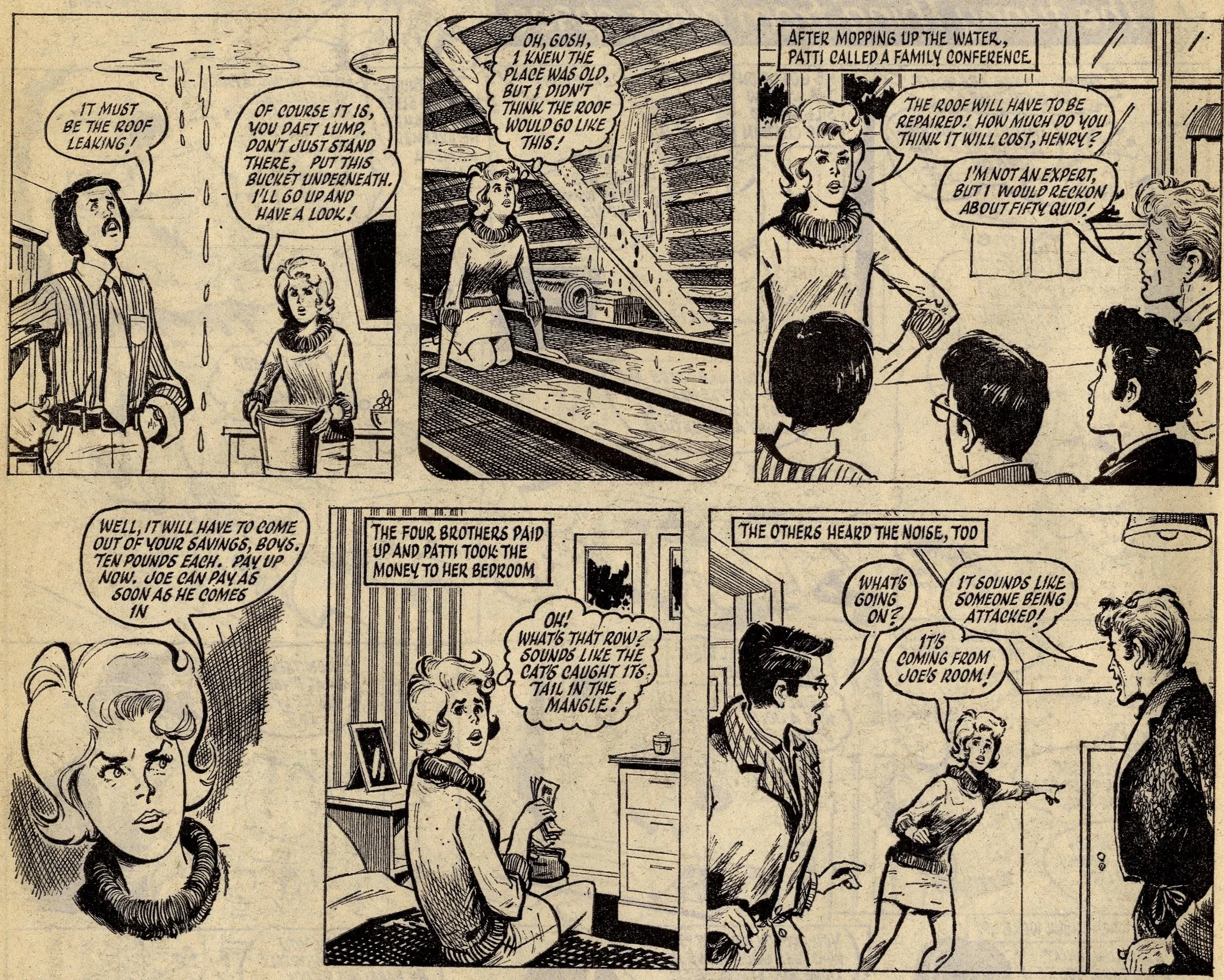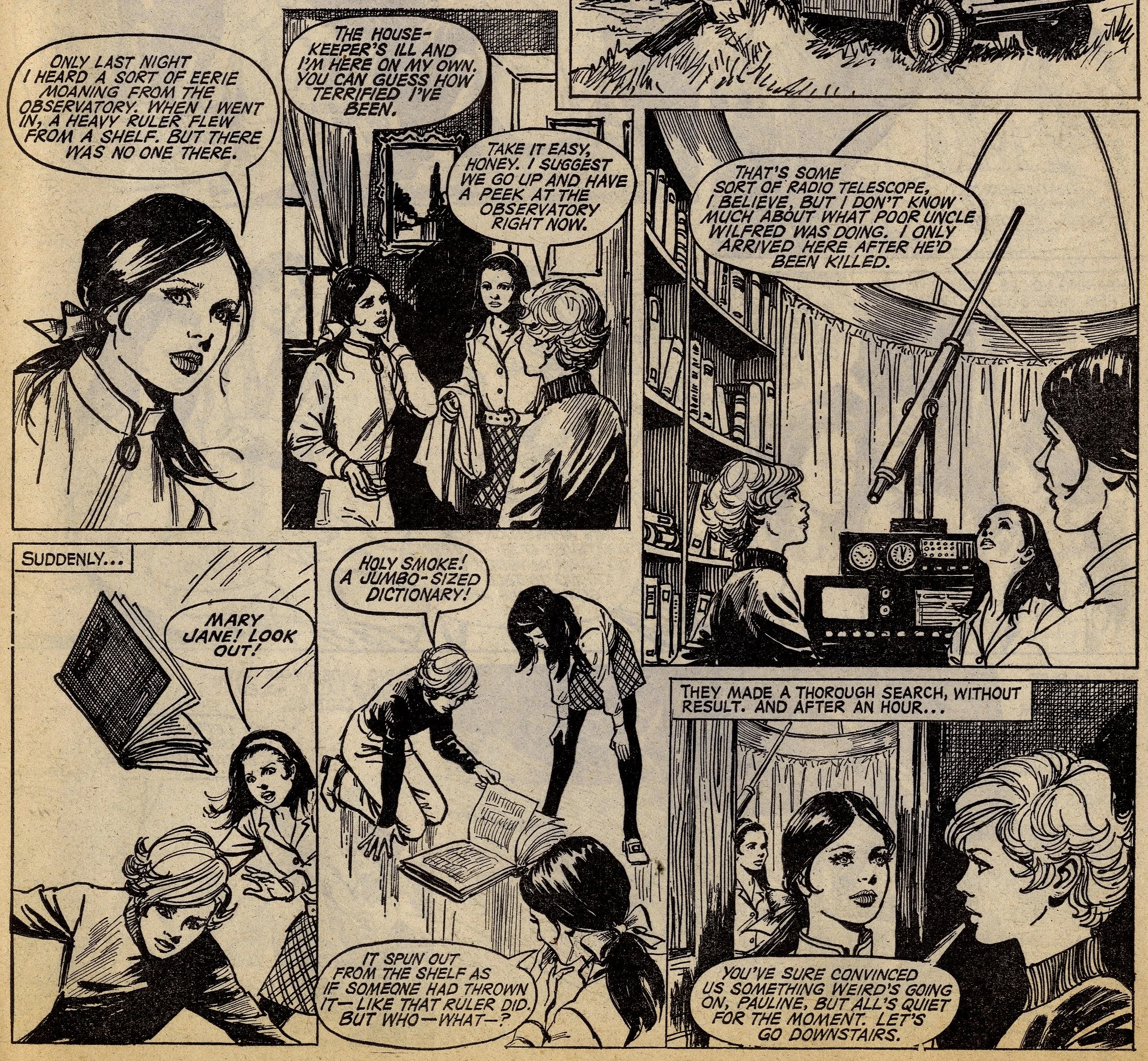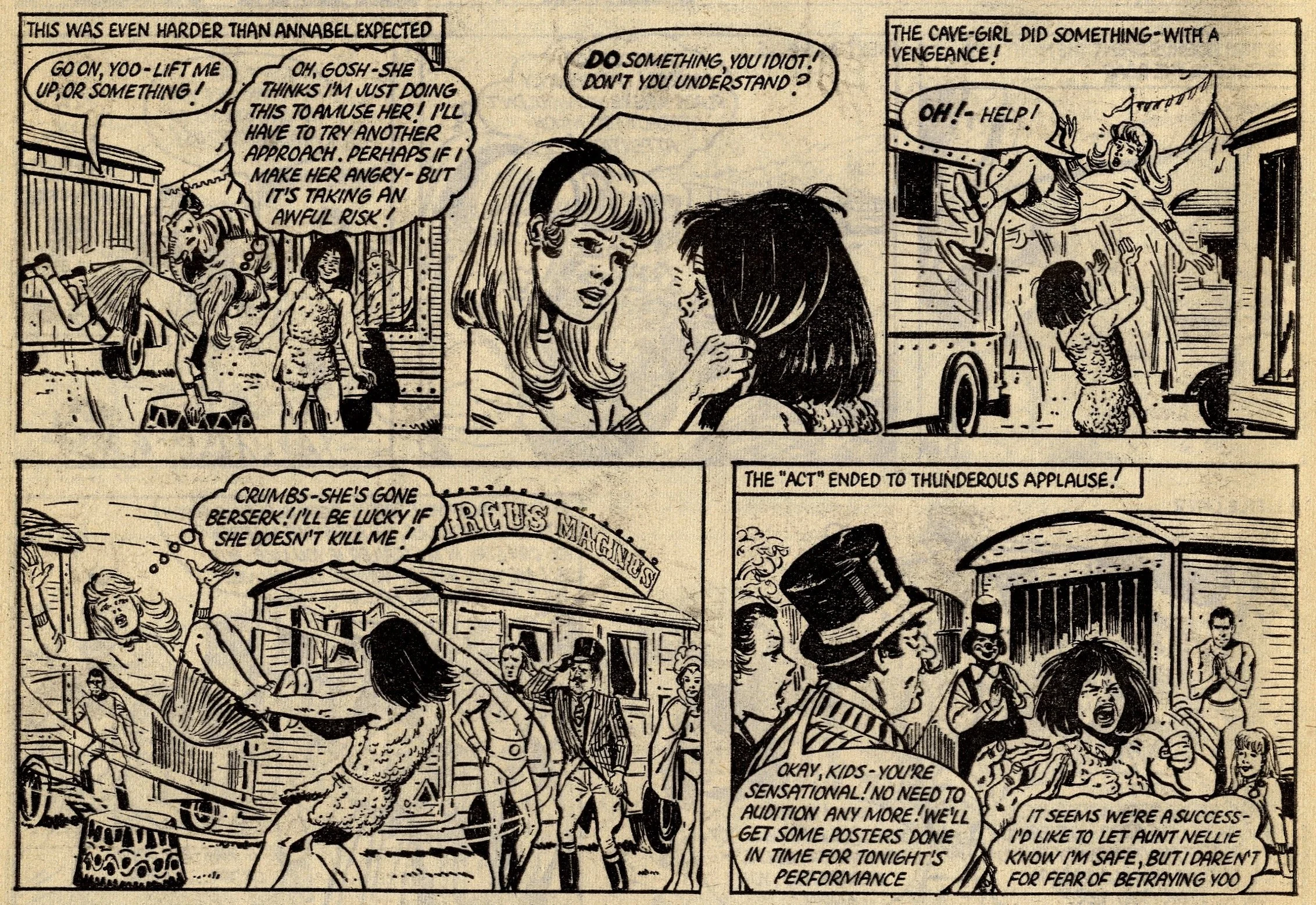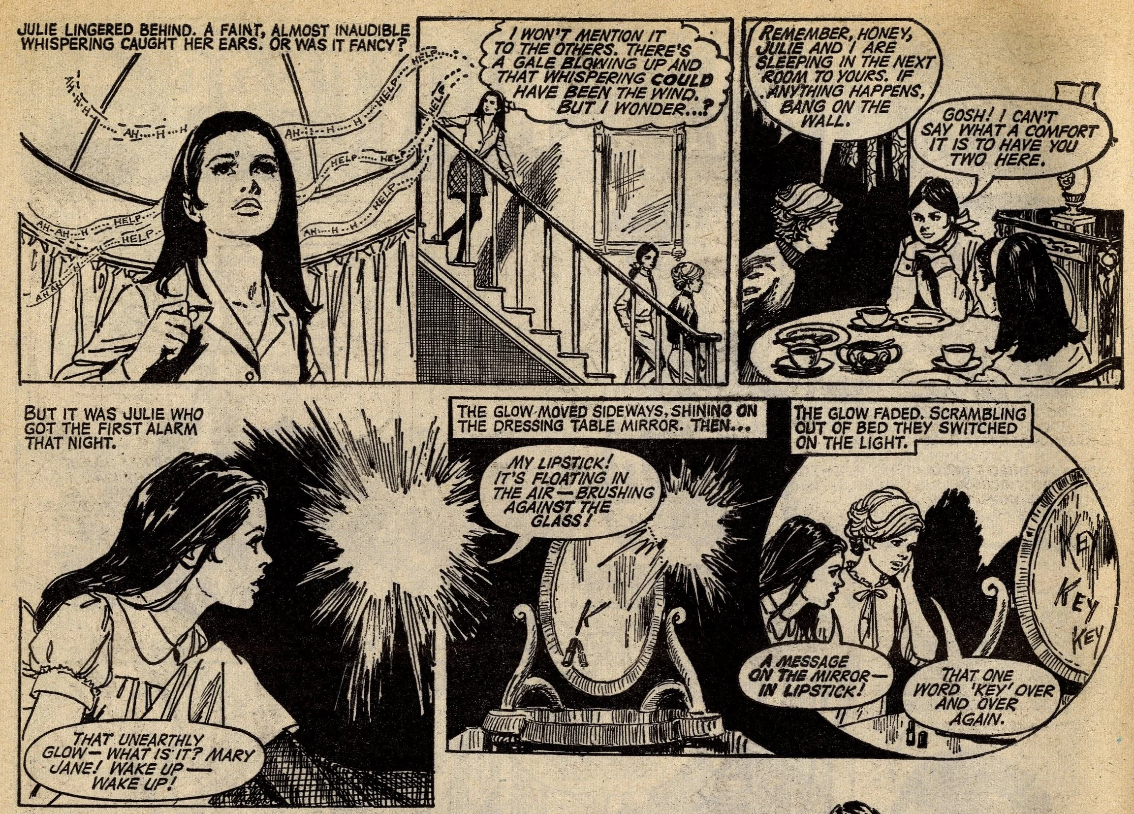 Cover story Maisie’s Magic Eye, drawn by the wonderful Robert McGillivray, was a fun story about a schoolgirl whose brooch turned the spoken commands of anyone within hearing range into reality, and plenty of the comic’s other strips – including the aforementioned Fanny, Sheila’s Skeelers, A Sister for Five Brothers and Mad Hatter’s Castle – were drama with a light-hearted tone that often strayed into slapstick. Sally’s cover caption announced that she was ‘The comic that is famous for exciting picture-stories’, a claim backed up by a number of stories with imaginative set-ups: My Best Friend’s a Cave Girl, The Ghost Hunters (spooky sci-fi with a Nancy Drew flavour, and a rare example of Shirley Bellwood’s stip work), Sara’s Kingdom (British schoolgirl is trialled to become queen of a Himalayan state), The Cat Girl (making feline leaps across urban Britain many years before The Leopard from Lime Street), Broken-hearted Rebel (gun-totin’ girls of the Wild West), High Dive Hazel (adventures of a swimming ace – I believe (thanks to Phil Rushton on the Comics UK forum) that this is a reprint of a 1960s June strip originally called Pat of the Dolphins, also drawn by Robert McGillivray), and Dinah and Harry (sleuthing pals).