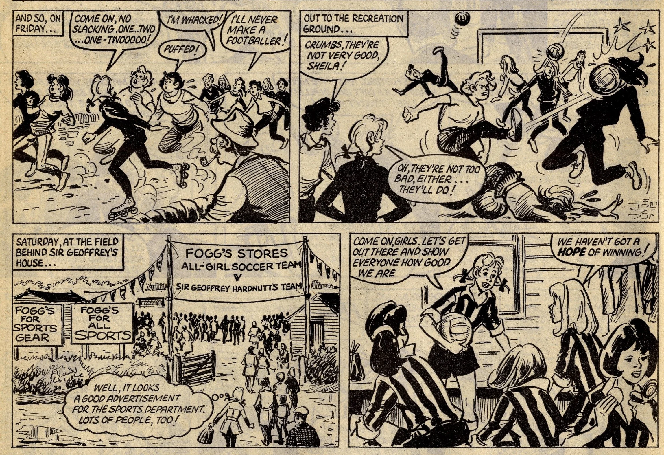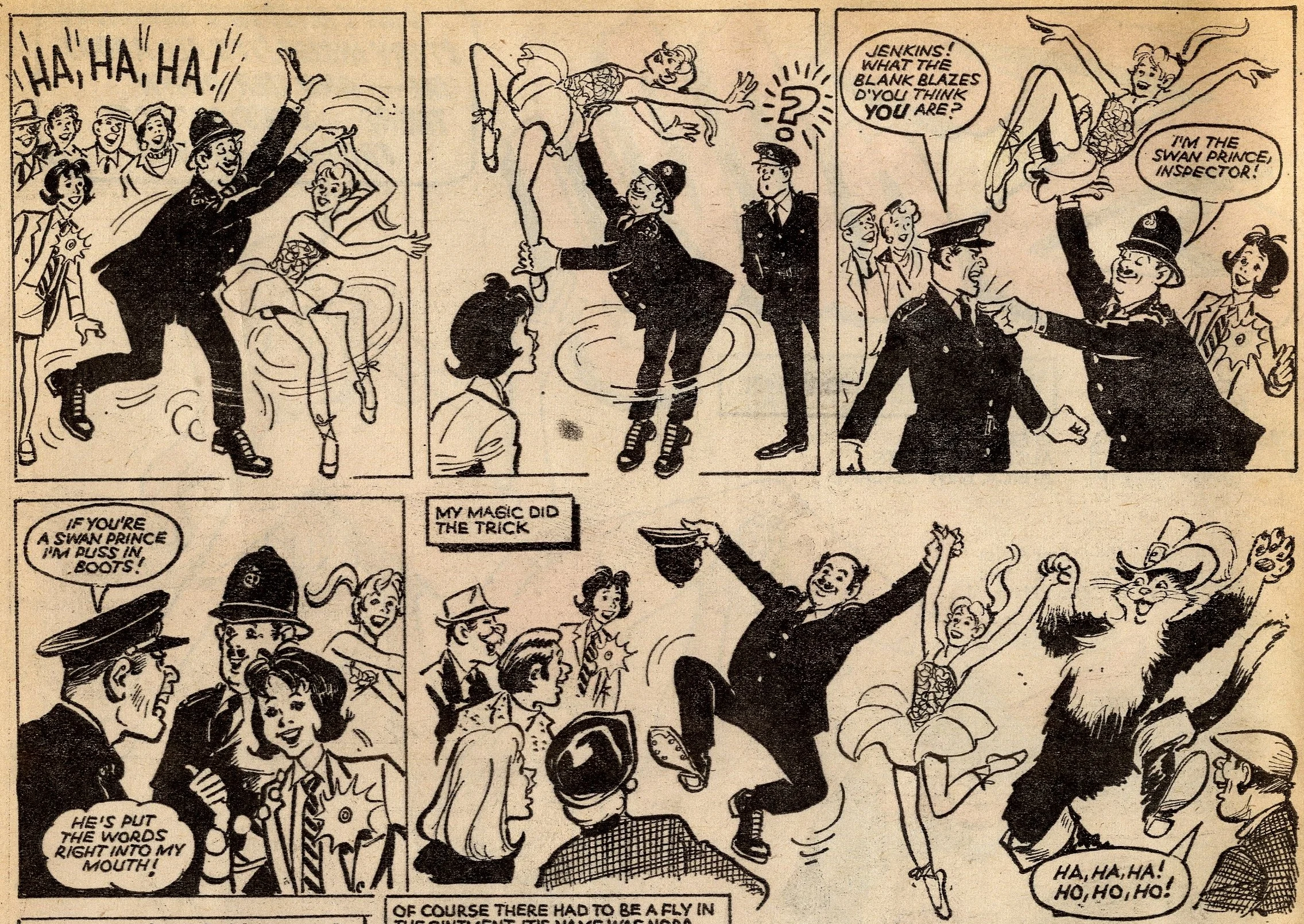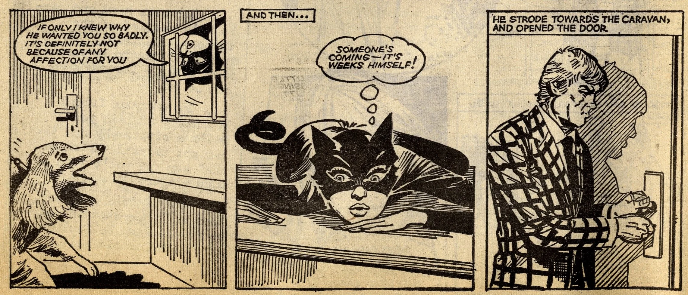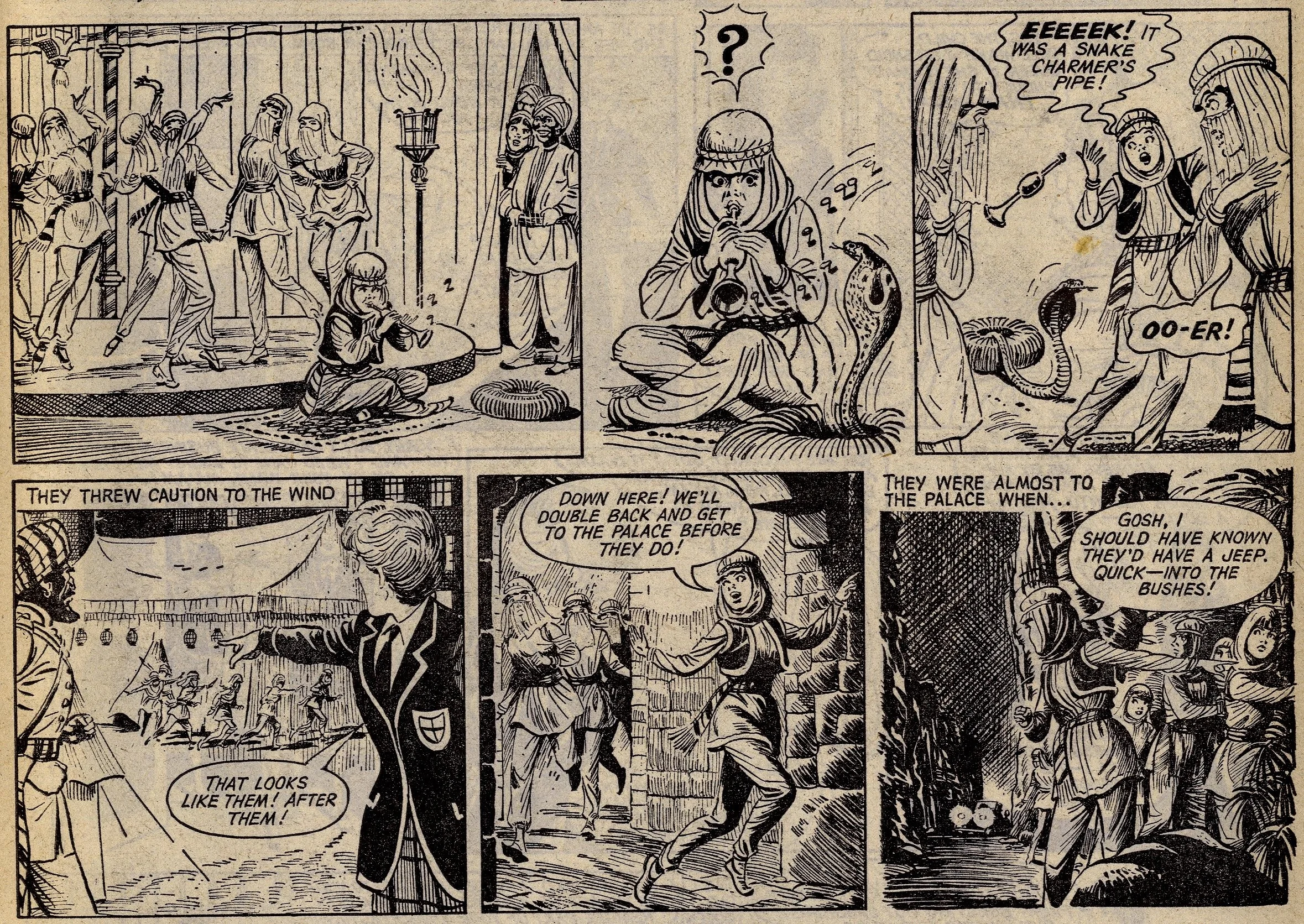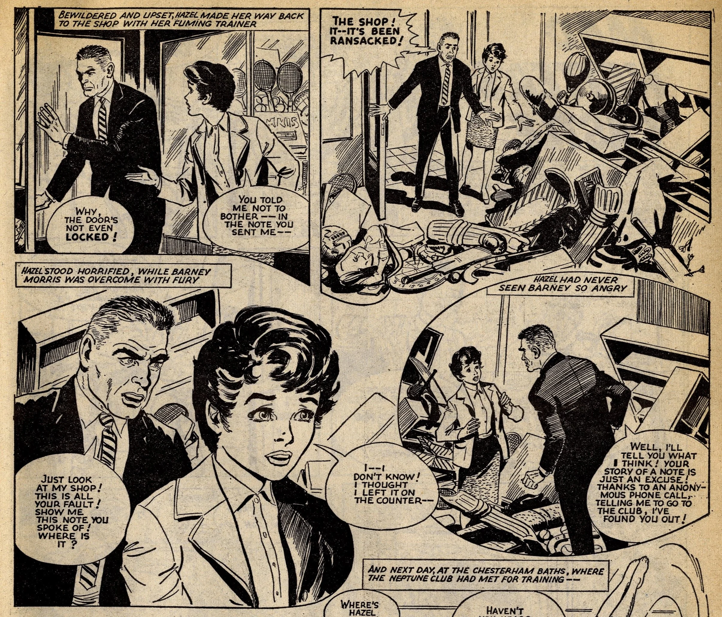 Cover story Maisie’s Magic Eye, drawn by the wonderful Robert McGillivray, was a fun story about a schoolgirl whose brooch turned the spoken commands of anyone within hearing range into reality, and plenty of the comic’s other strips – including the aforementioned Fanny, Sheila’s Skeelers, A Sister for Five Brothers and Mad Hatter’s Castle – were drama with a light-hearted tone that often strayed into slapstick. Sally’s cover caption announced that she was ‘The comic that is famous for exciting picture-stories’, a claim backed up by a number of stories with imaginative set-ups: My Best Friend’s a Cave Girl, The Ghost Hunters (spooky sci-fi with a Nancy Drew flavour, and a rare example of Shirley Bellwood’s stip work), Sara’s Kingdom (British schoolgirl is trialled to become queen of a Himalayan state), The Cat Girl (making feline leaps across urban Britain many years before The Leopard from Lime Street), Broken-hearted Rebel (gun-totin’ girls of the Wild West), High Dive Hazel (adventures of a swimming ace – I believe (thanks to Phil Rushton on the Comics UK forum) that this is a reprint of a 1960s June strip originally called Pat of the Dolphins, also drawn by Robert McGillivray), and Dinah and Harry (sleuthing pals).