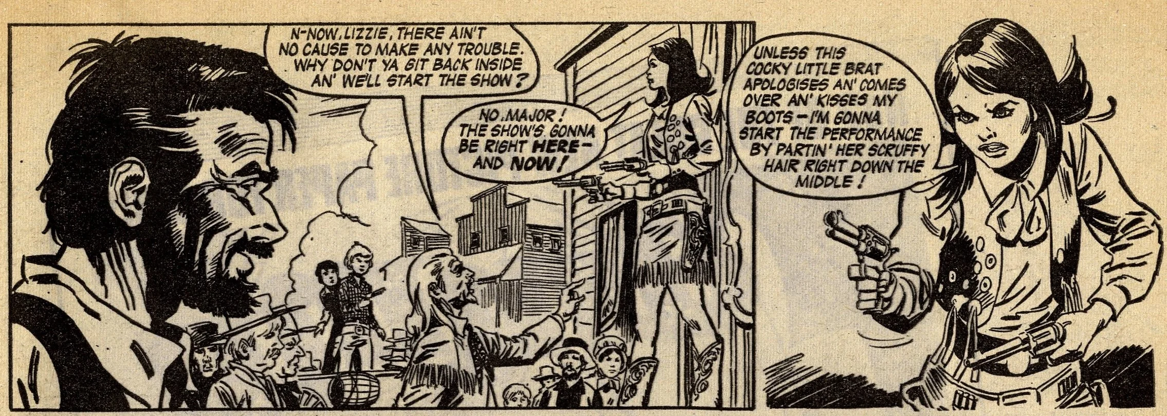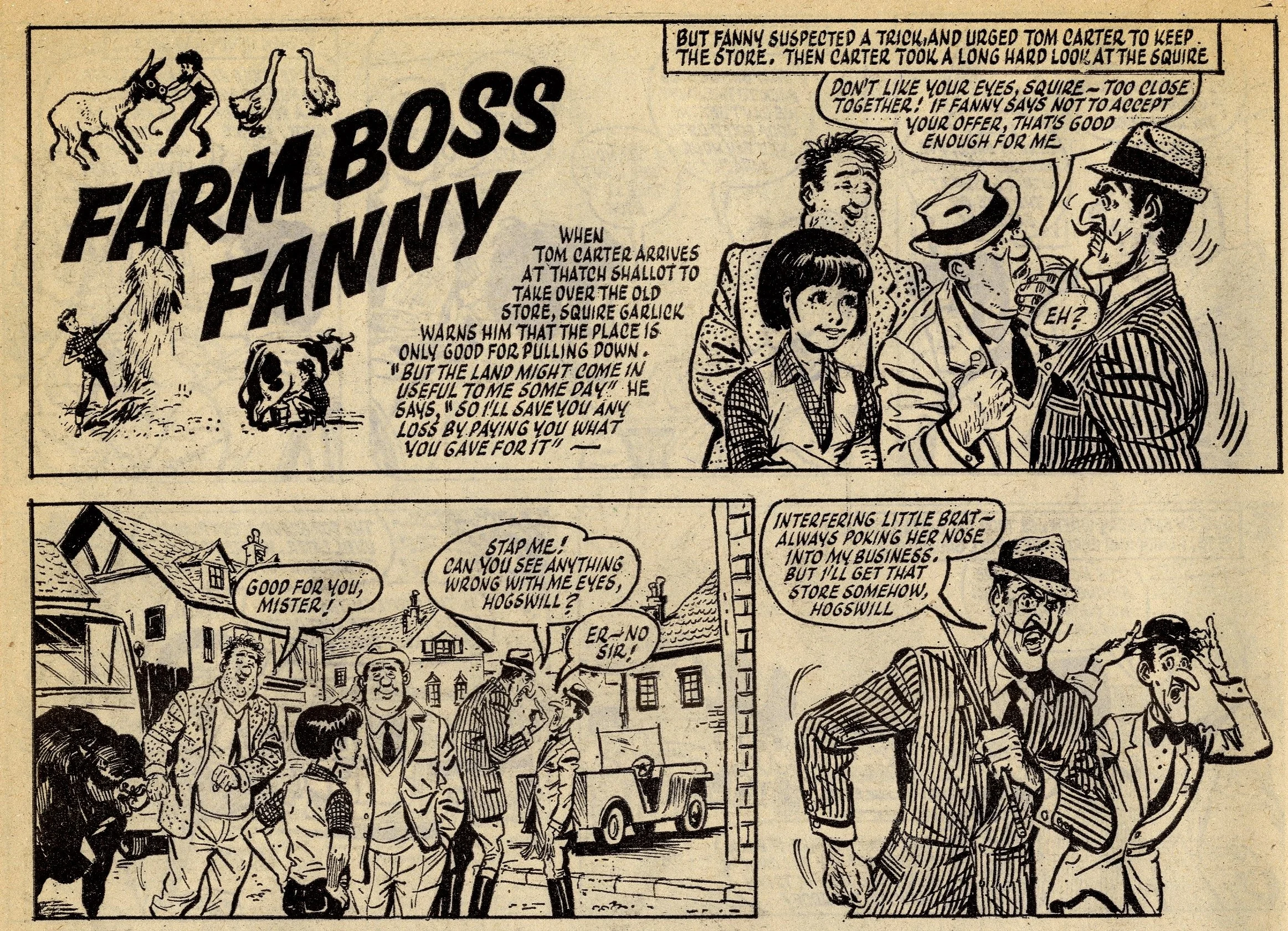 I haven’t featured Sally on the blog before, simply because copies are hard to track down, and consequently those few that appear on eBay are priced high. It was launched in June 1969 and ran for just twenty-one months. I’m no expert on typography but that title logo has quite a 1960s look about it, and the tone of the comic gives the feel of one published a few years later than it should have been. However, like so many of the boys’ comics of this era – I’m thinking of you, Jet, Lion and Thunder – it’s fun to read so long as one is looking for quaint curiosity rather than engaging characters and plots. Oh, and Farm Boss Fanny will never stop making me snigger.