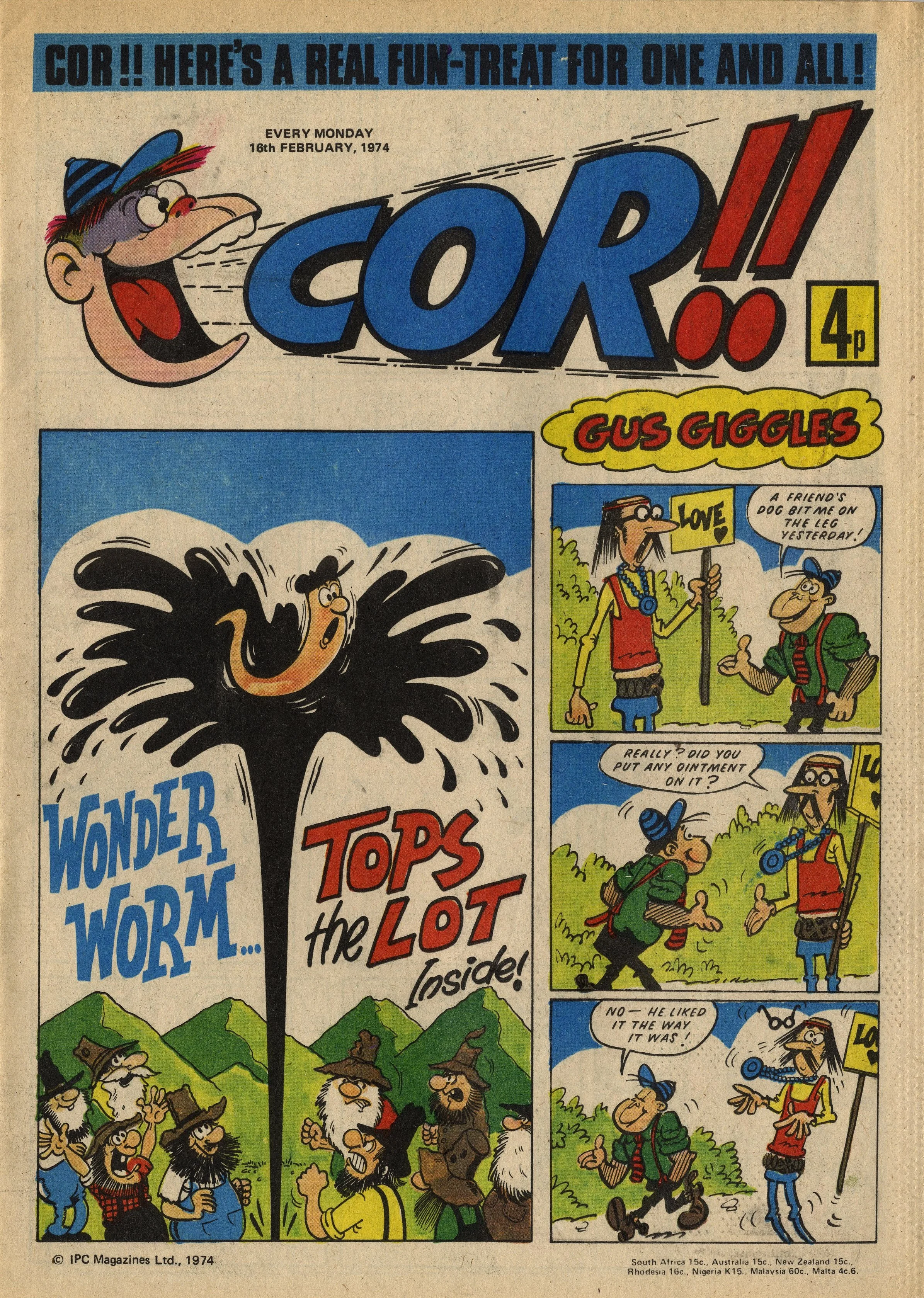 Oil and ointments, a worm and a gorilla were the unlikely subjects of this Cor!! front cover. Wonder Worm was a reprint strip that had appeared in Buster in the 1960s, while Gus was Cor!!'s regular lead strip.