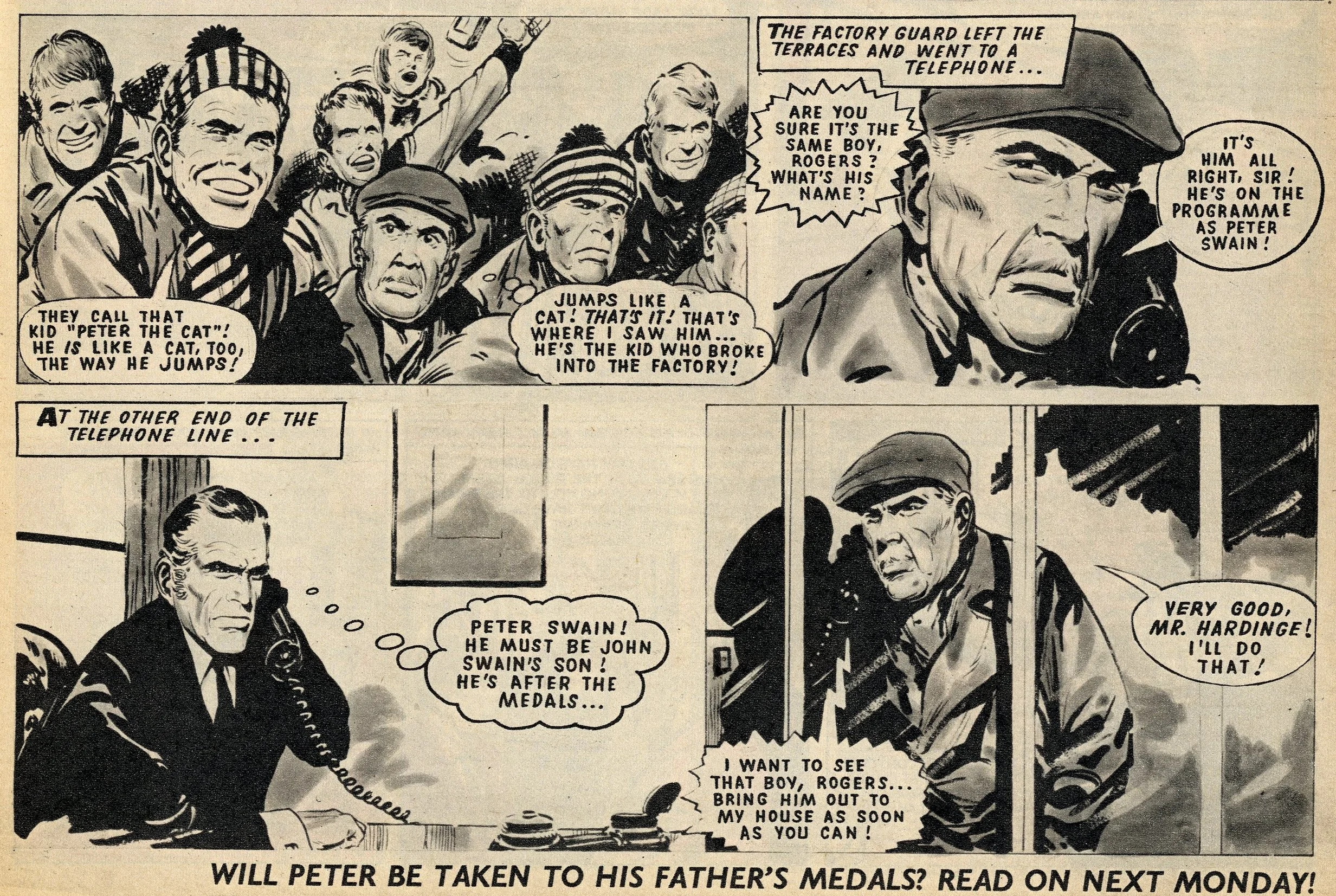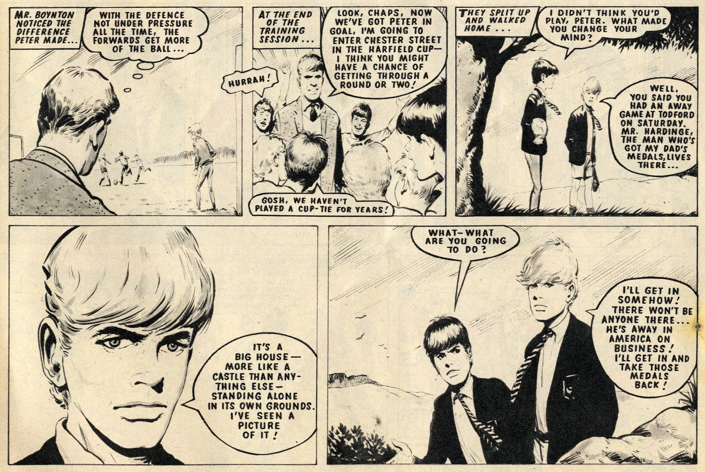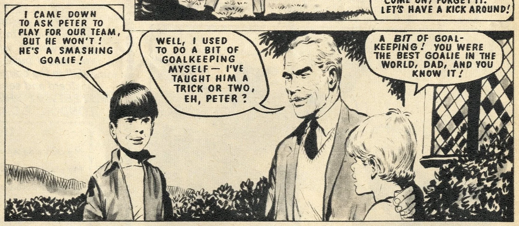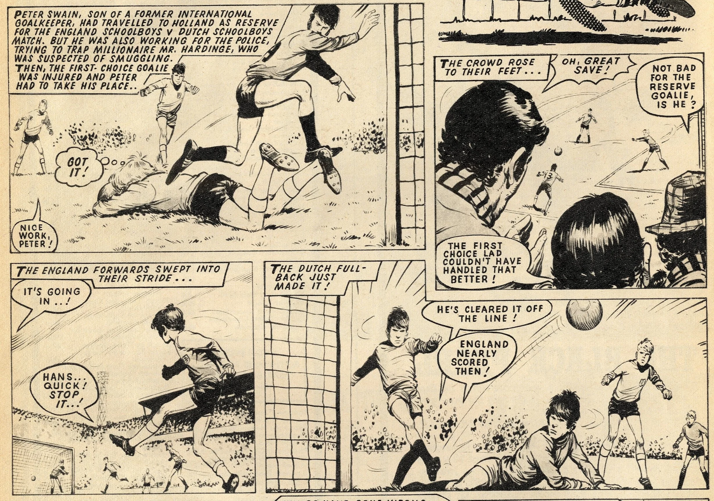 It soon transpired that there was a reason for Peter’s skills. His father was famous former England goalie John Swain, and Peter’s reluctance to get involved with a team had been because he wanted to concentrate his efforts on recovering Dad’s stolen collection of medals. He suspected the villain was millionaire industrialist Mr Hardinge, and tracked them down first to Hardinge’s mansion – where the businessman scared Peter off with a gun – and then to his luxury yacht. Peter recovered the medals from the boat, only for Hardinge to kidnap his father in revenge.