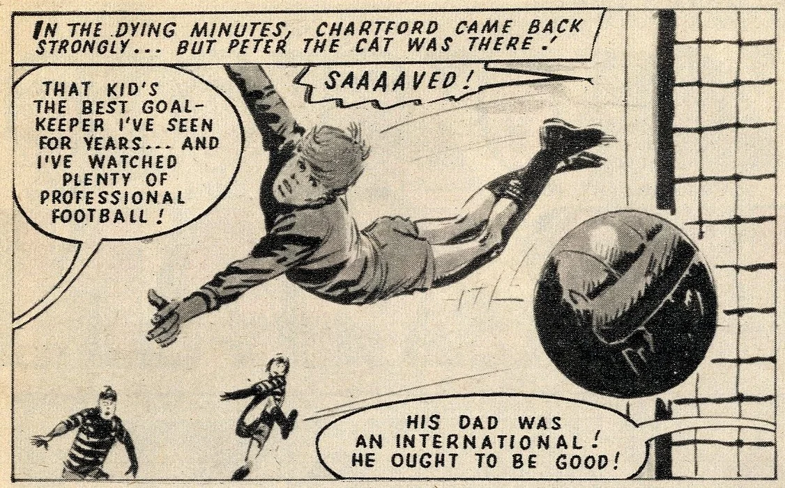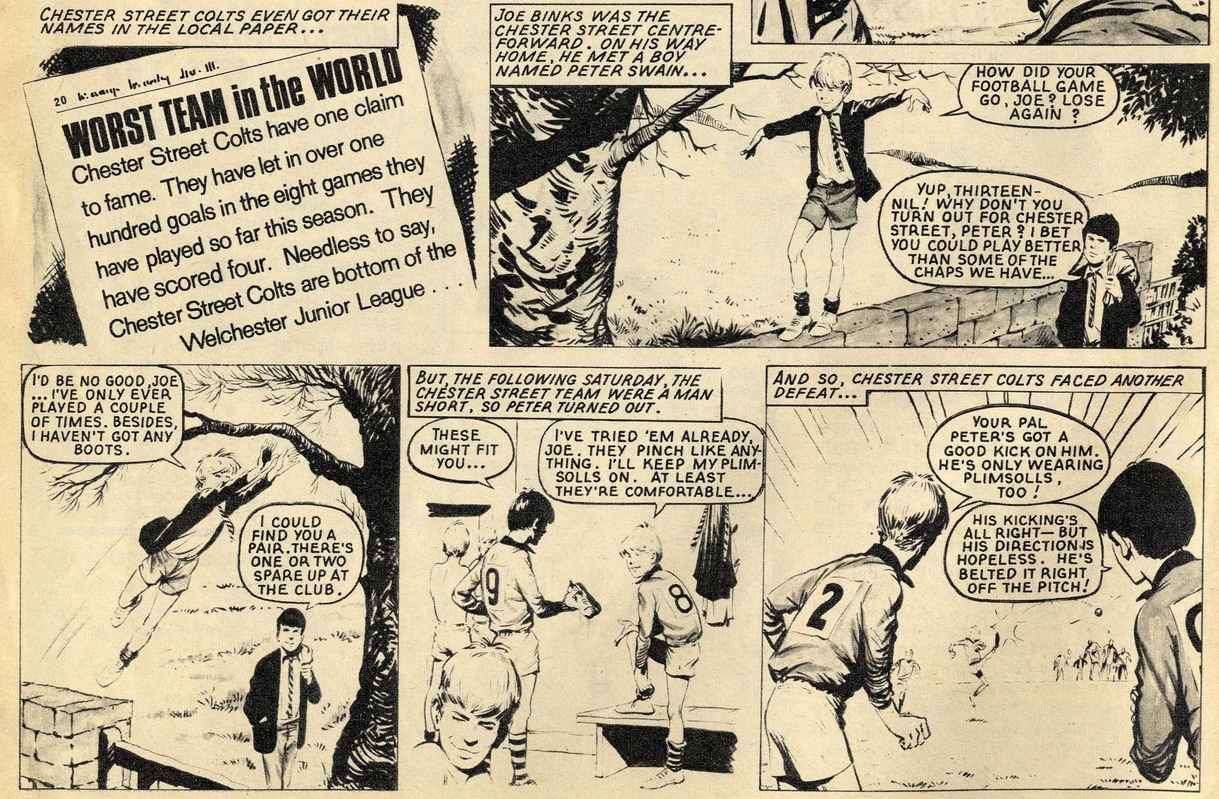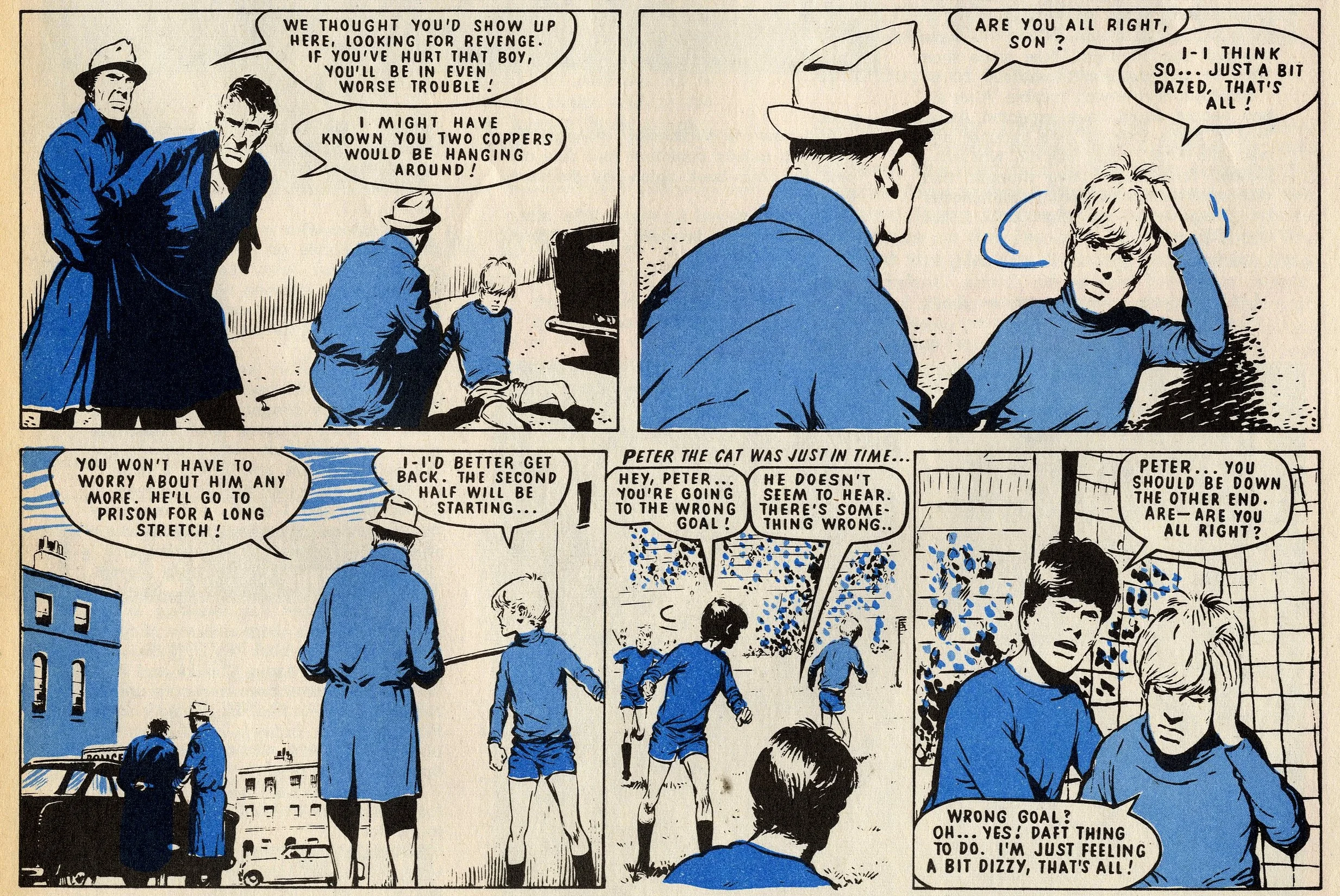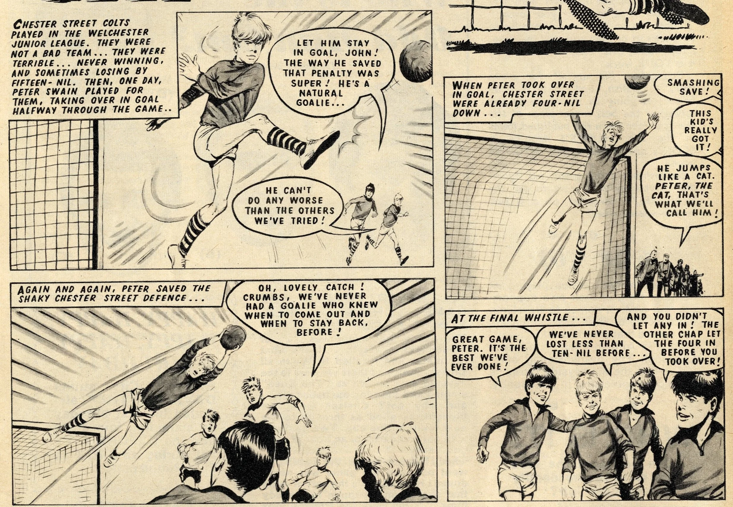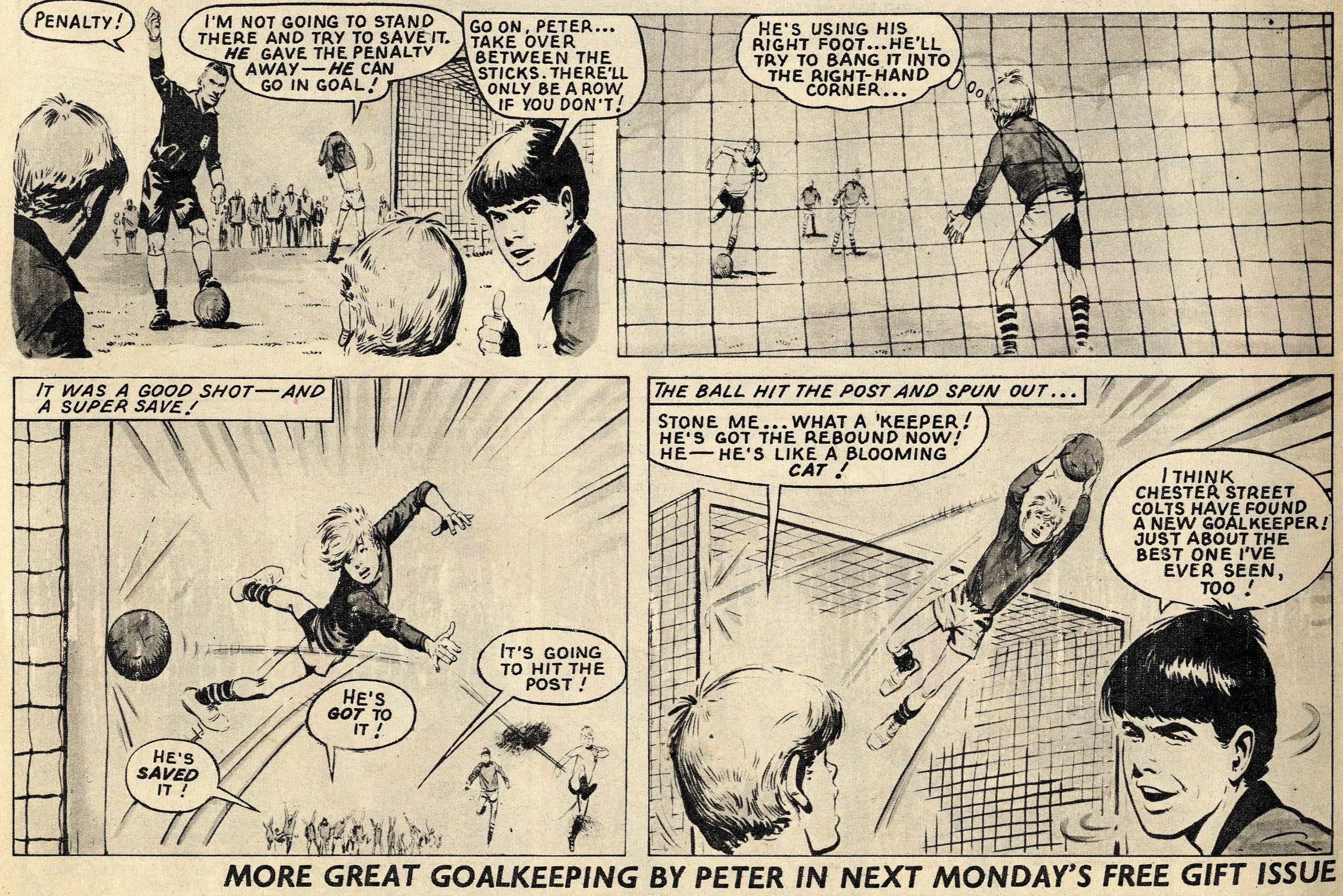 It soon transpired that there was a reason for Peter’s skills. His father was famous former England goalie John Swain, and Peter’s reluctance to get involved with a team had been because he wanted to concentrate his efforts on recovering Dad’s stolen collection of medals. He suspected the villain was millionaire industrialist Mr Hardinge, and tracked them down first to Hardinge’s mansion – where the businessman scared Peter off with a gun – and then to his luxury yacht. Peter recovered the medals from the boat, only for Hardinge to kidnap his father in revenge.
