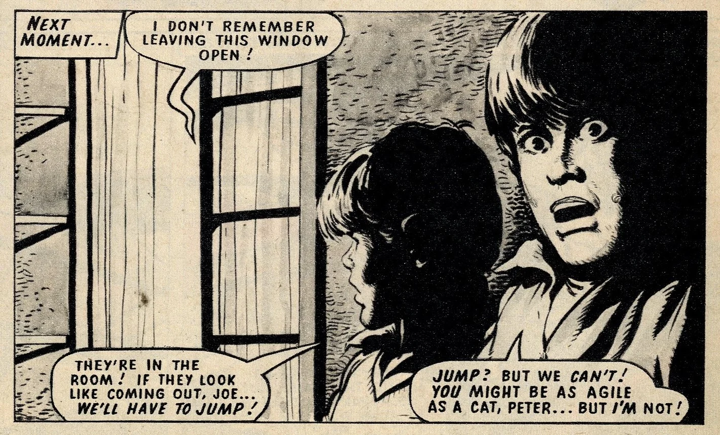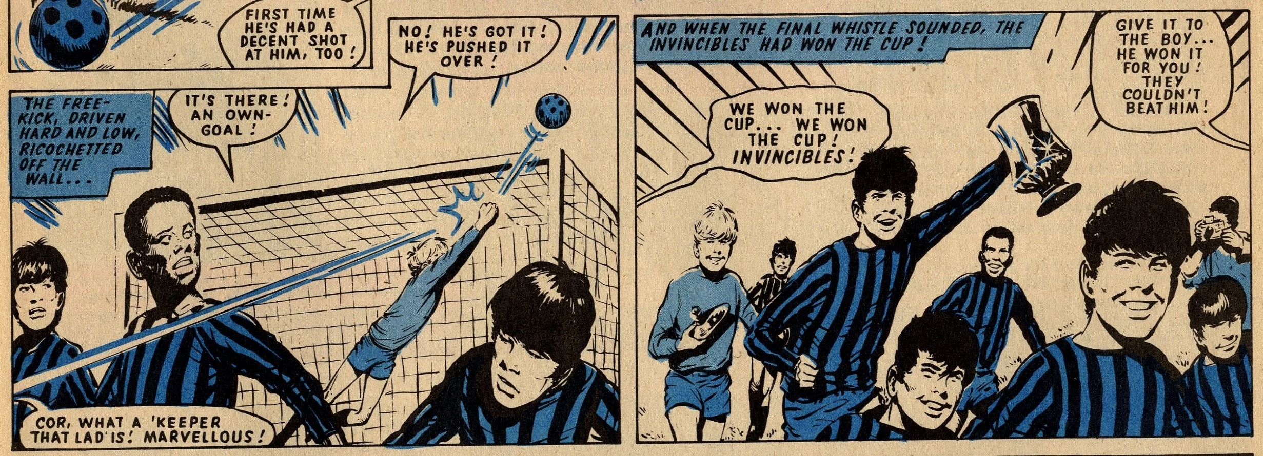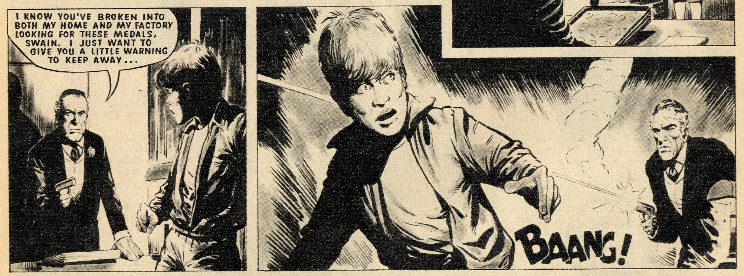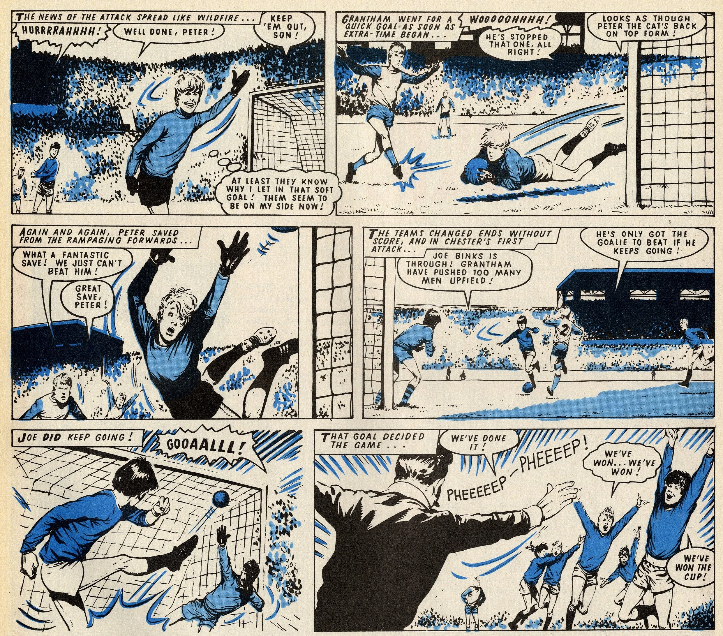 It soon transpired that there was a reason for Peter’s skills. His father was famous former England goalie John Swain, and Peter’s reluctance to get involved with a team had been because he wanted to concentrate his efforts on recovering Dad’s stolen collection of medals. He suspected the villain was millionaire industrialist Mr Hardinge, and tracked them down first to Hardinge’s mansion – where the businessman scared Peter off with a gun – and then to his luxury yacht. Peter recovered the medals from the boat, only for Hardinge to kidnap his father in revenge.