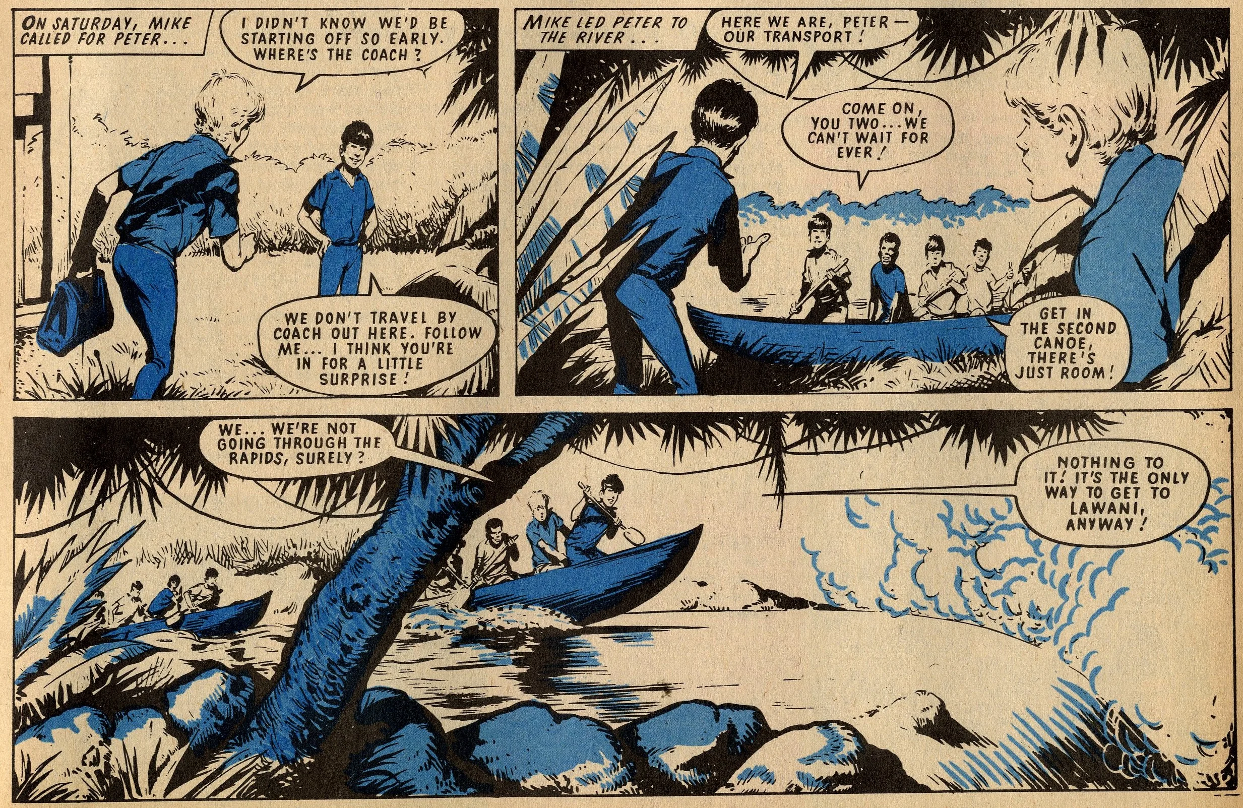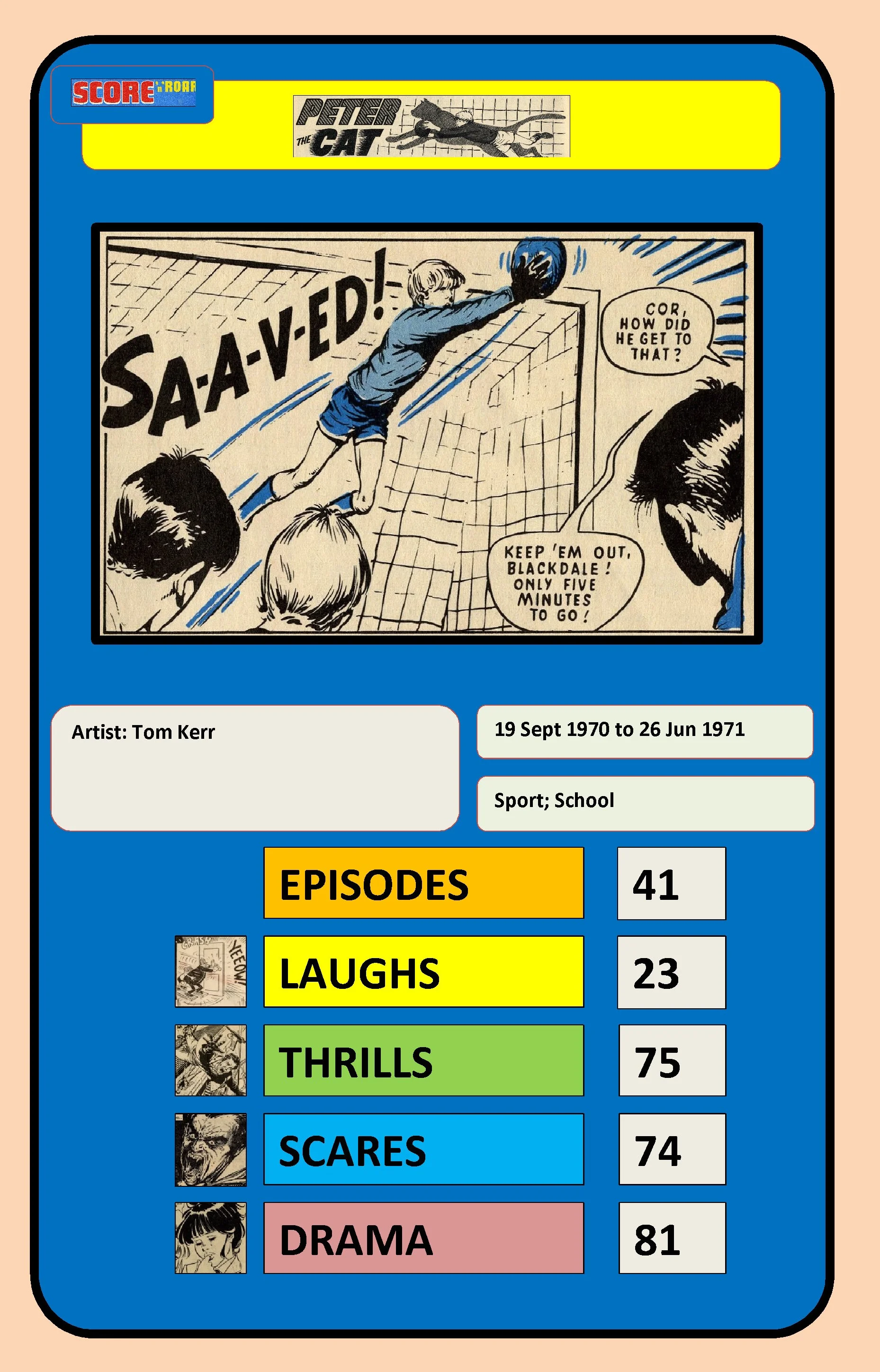 The pursuit of Peter’s father’s medals and the Colts’ cup run occupied the majority of episodes of Peter the Cat, which appeared in all 41 issues of Score ‘n’ Roar between September 1970 and June 1971, but did not cross over to Scorcher and Score when the two comics merged. It’s an unlikely tale, but not untypical of the derring-do that was common to boys’ comics at this time. The artwork of Tom Kerr is technically excellent and full of character, however, and makes the story well worth revisiting. After the stolen medals stories, John Swain has to go to South America on business so Peter is sent to boarding school, where he foils an art theft plotted by the Roger Delgado-a-like headmaster. Peter is then summoned to join his dad in the South American jungle, where he joins the local adult team and helps them to glory in their own competition. Peter the Cat had had quite a year.
