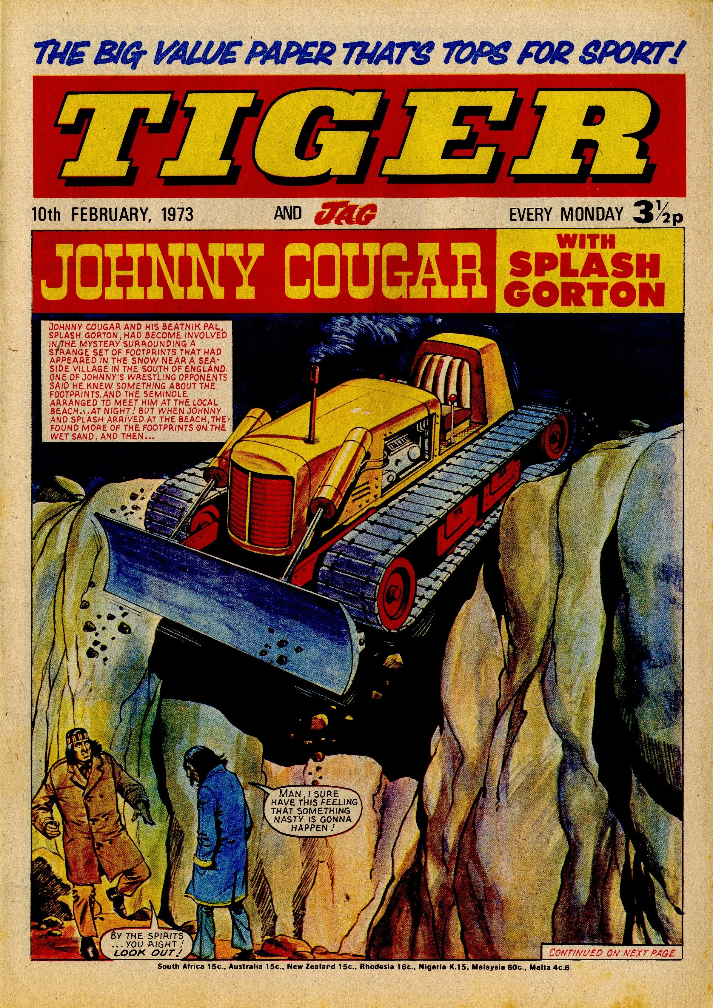 Sandy James' Johnny Cougar (with Splash Gorton) was a regular cover feature of Tiger in the early 1970s, alternating with Roy of the Rovers and Skid Solo.