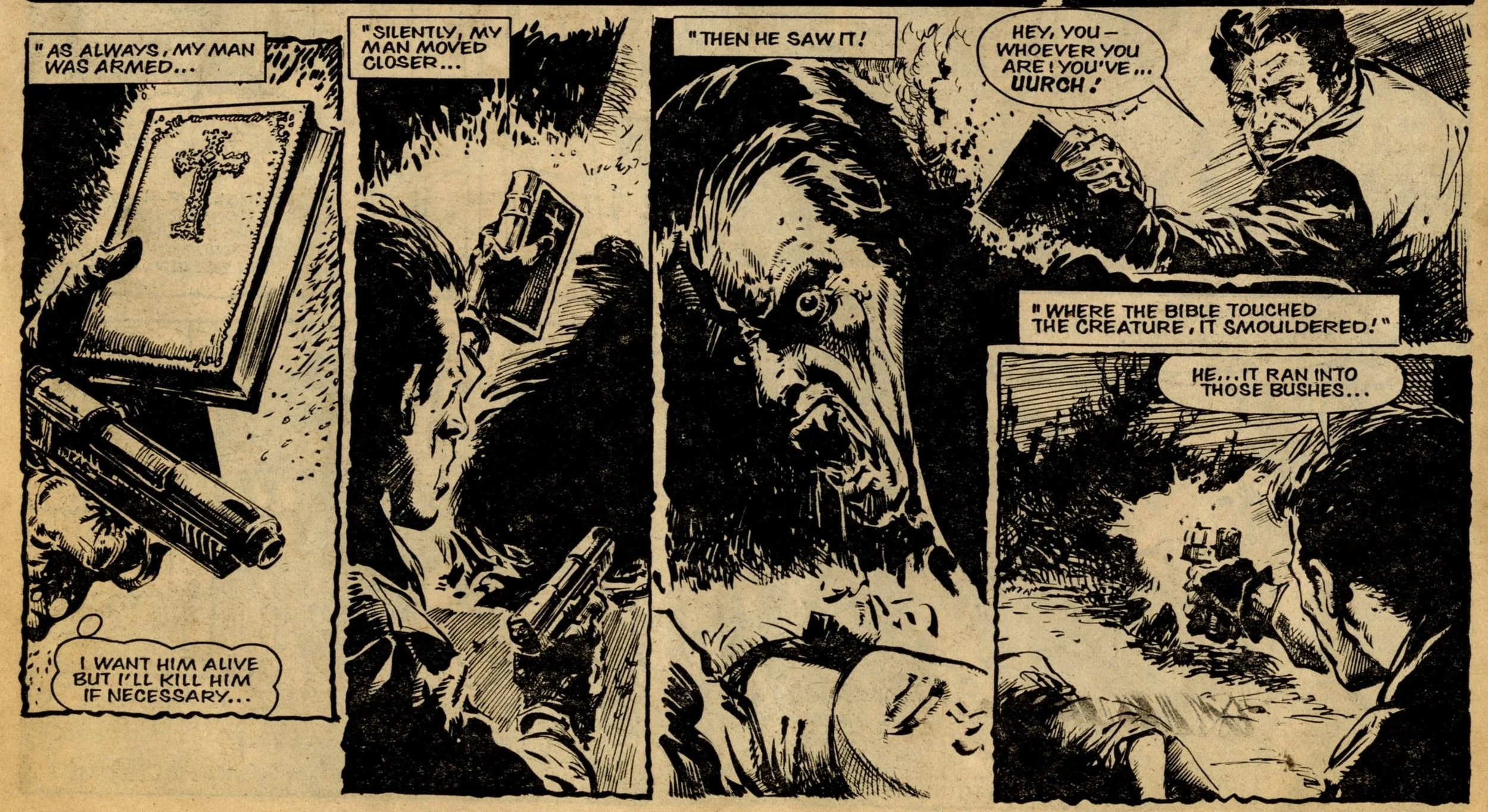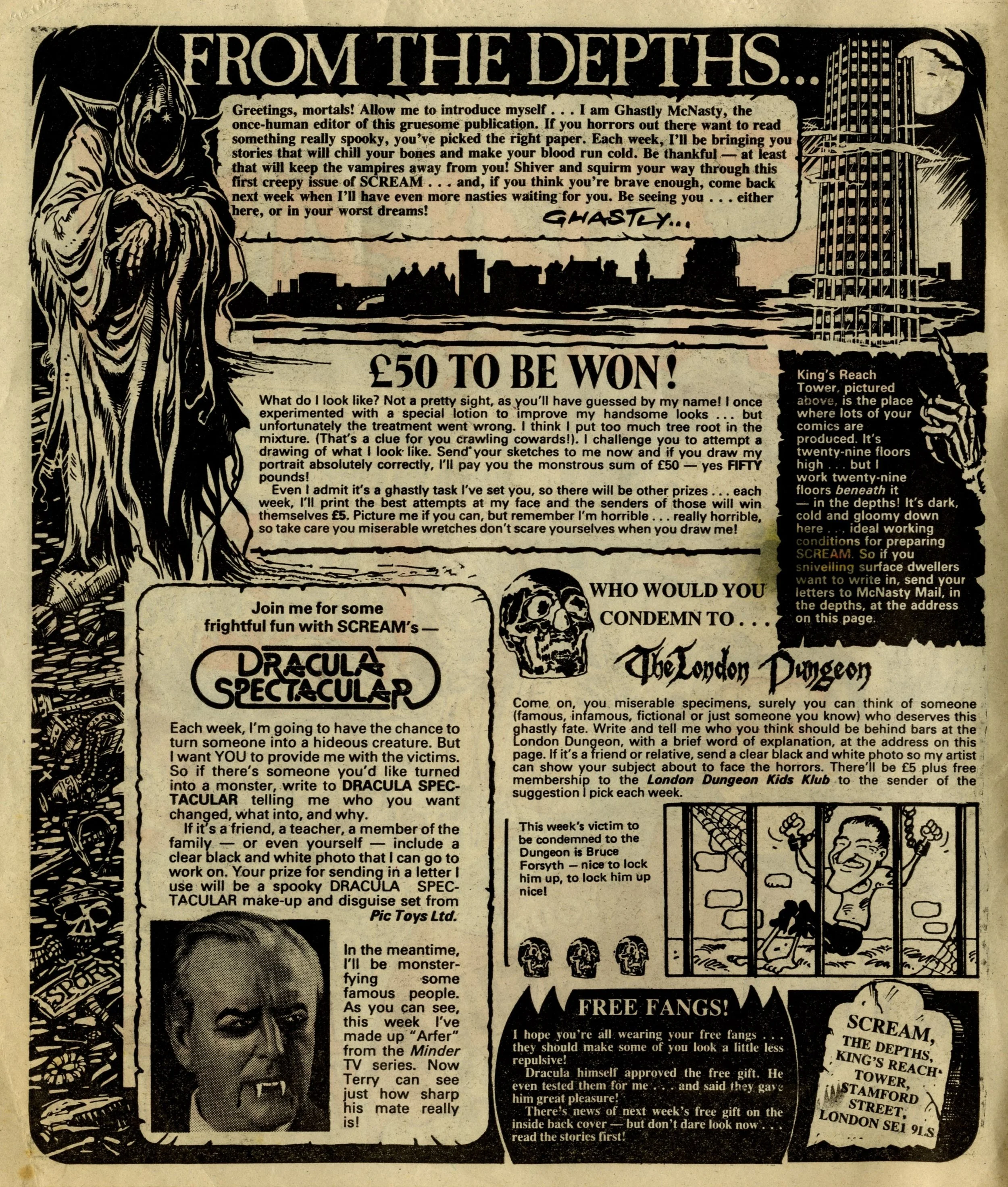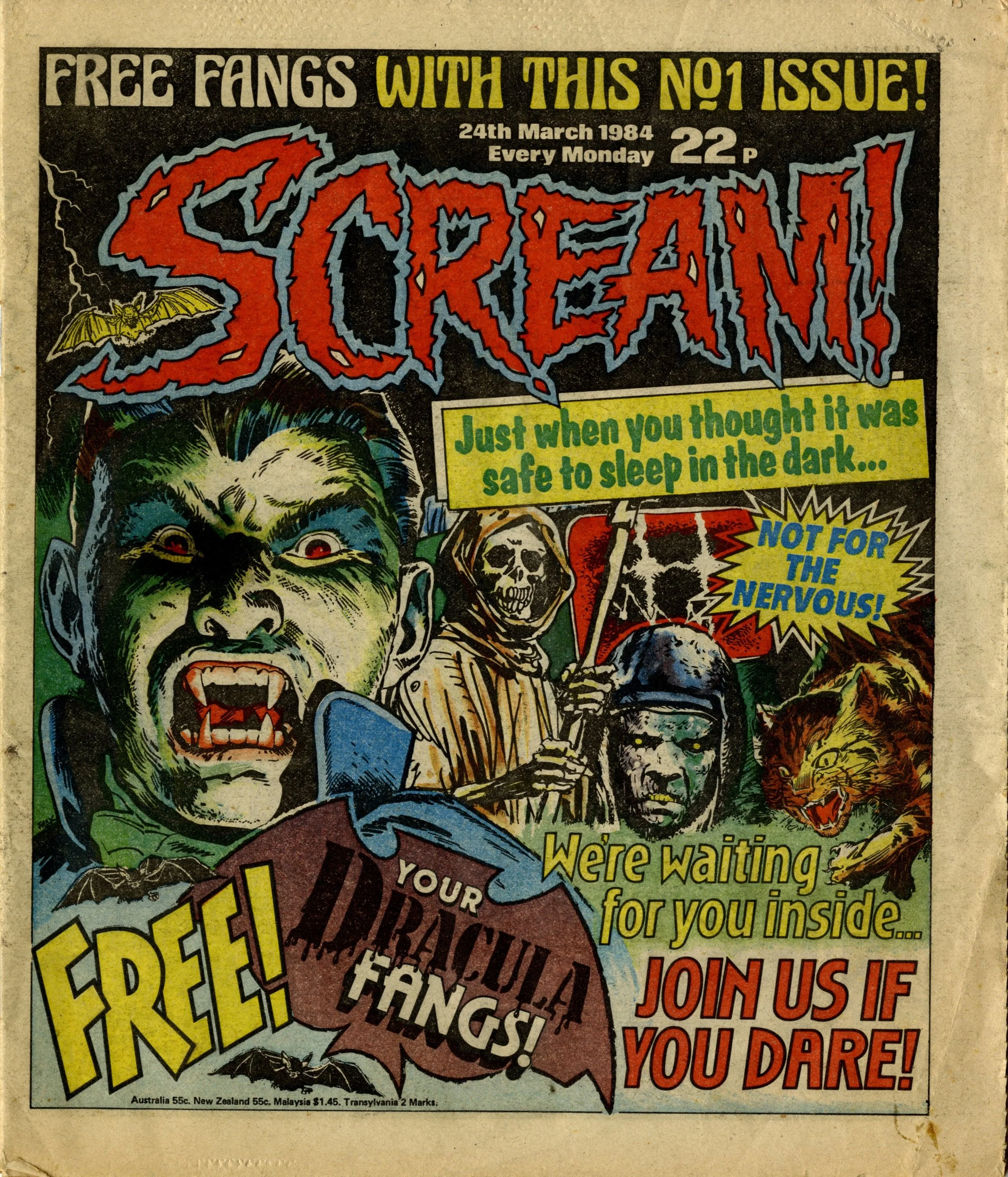 I have no special insight into the history of Scream! but highly recommend a few sources. David McDonald of Hibernia produced a brilliant Comic Archive on Scream! last year. I’m not sure whether it’s still available to buy but do try and track down a copy if you can. It’s 64 pages of previously unpublished strips and covers that were commissioned before Scream!’s untimely demise, and revealing interviews with IPC’s boys’ group editor Barrie Tomlinson, the comic’s editor Ian Rimmer and sub-editor Simon Furman. Back from the Depths is a superb Scream! tribute website, with loads of cover galleries and story guides. And last summer Ian Rimmer gave an extensive interview, describing daily life producing Scream! 29 floors beneath King’s Reach Tower, to Michael Molcher on the 2000AD Thrill-cast. Rebellion have produced a collected edition of Scream!’s Monster (first episode written by Alan Moore, the remainder by John Wagner and Alan Grant, and beautifully illustrated by Heinzl and Jesus Redondo), and later this year will collect Gerry Finley-Day and Eric Bradbury’s The Dracula File.