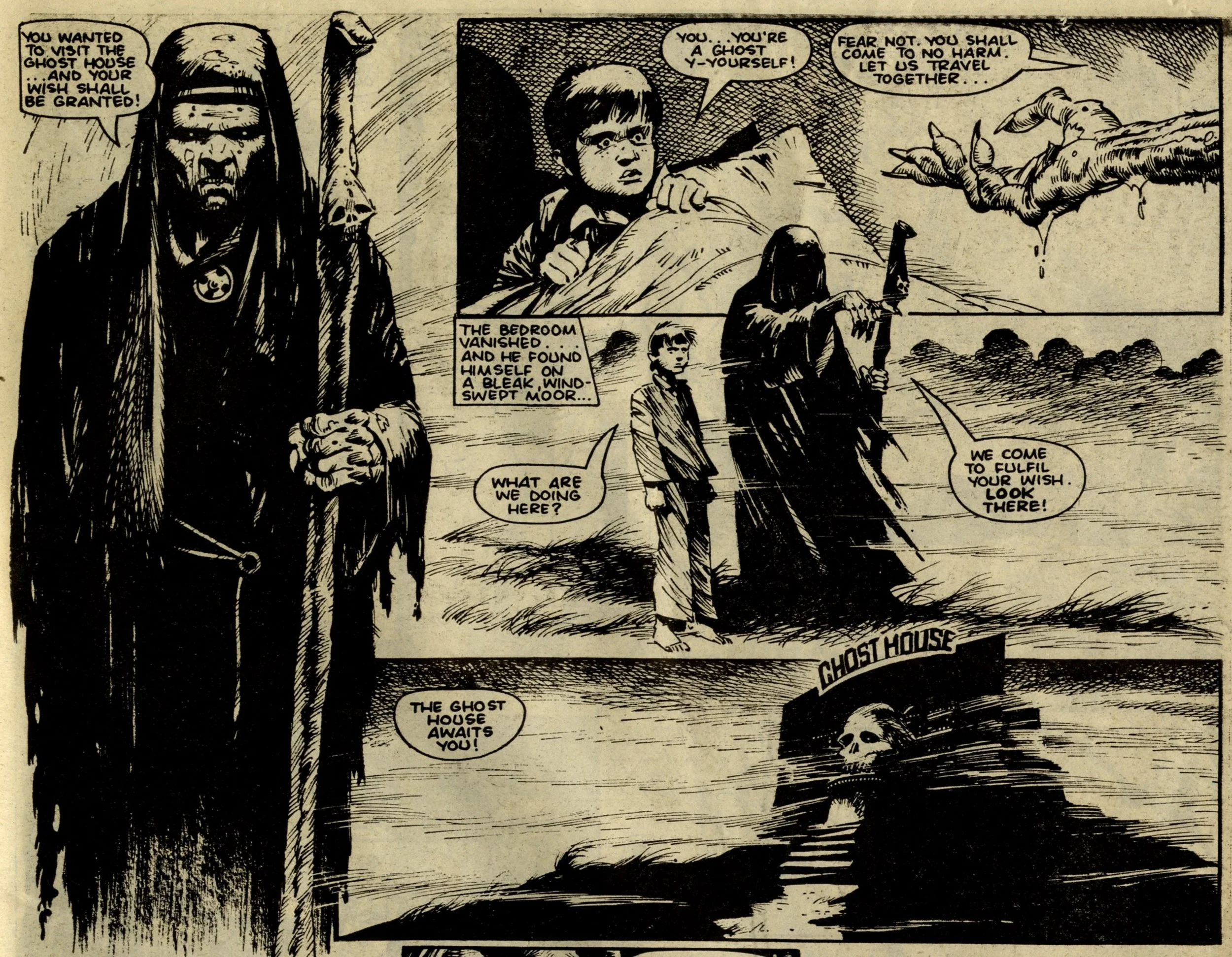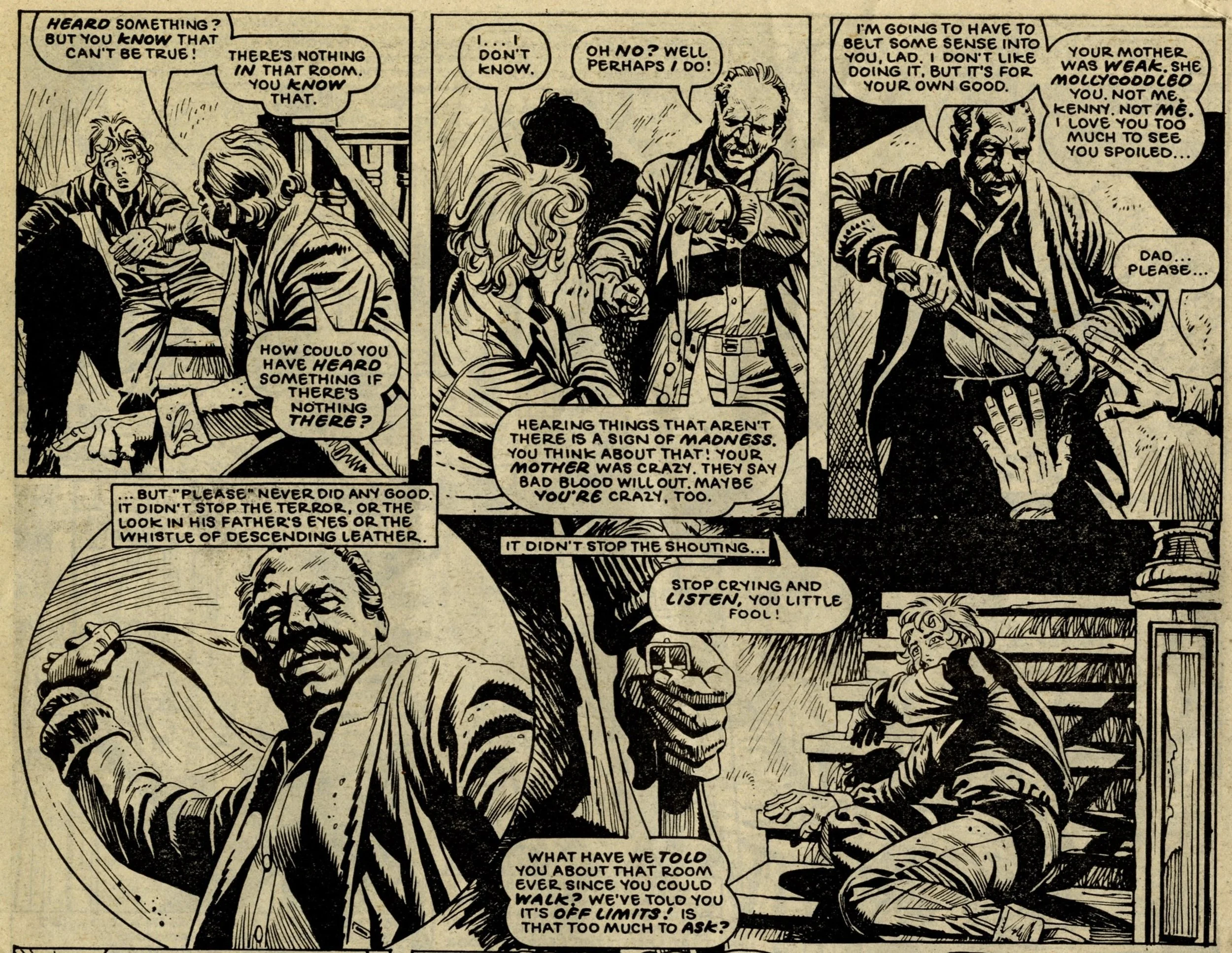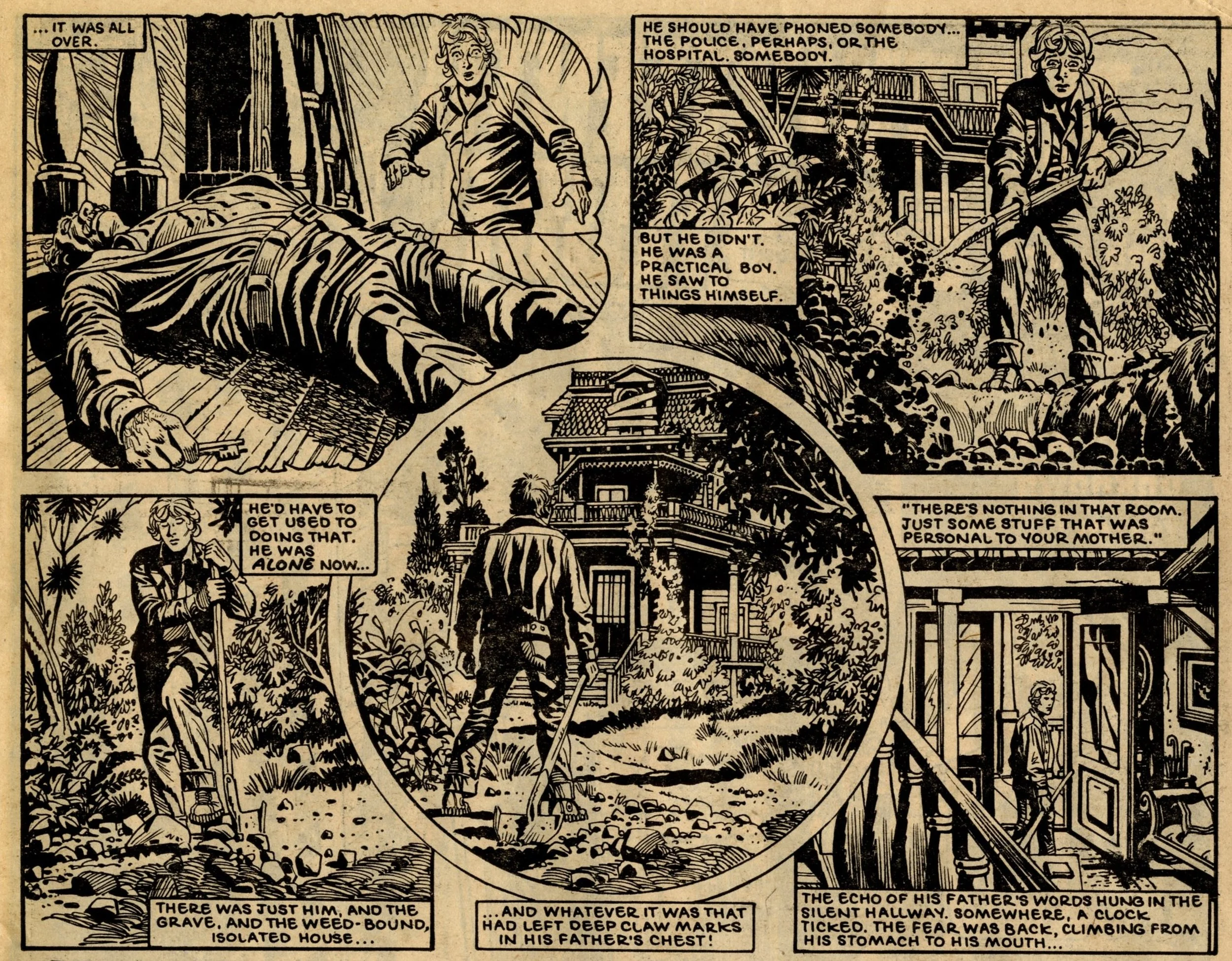 There’s a fog of mystery surrounding the cancellation of Scream! after just 15 issues. It was one of the many IPC titles removed from production in response to the NUJ strike of the summer of 1984, but never reappeared as a standalone title (only as a low-key merger with Eagle). It’s possible that its readership numbers were considered too weak to justify bringing it back after the strike. If that’s true then I would suggest it was indicative of a declining comics market rather than the fault of poor content, as this was quality material. It’s also been mooted that IPC’s higher-level management cancelled the comic because they felt nervous about the horror comic. These were the days of hysterical ‘video nasty’ pontification in the British tabloid press, leading to the passing of the Video Recordings Act in July. Both Barrie Tomlinson and Ian Rimmer have bemoaned the editorial interference they received from on high during the preparation of the 15 issues of Scream! that made it to press. I’d love to have seen some of what didn’t make the cut, because the comic that was produced was still quite the chiller. Feast your eyes on just some of the horrors from the first issue below …