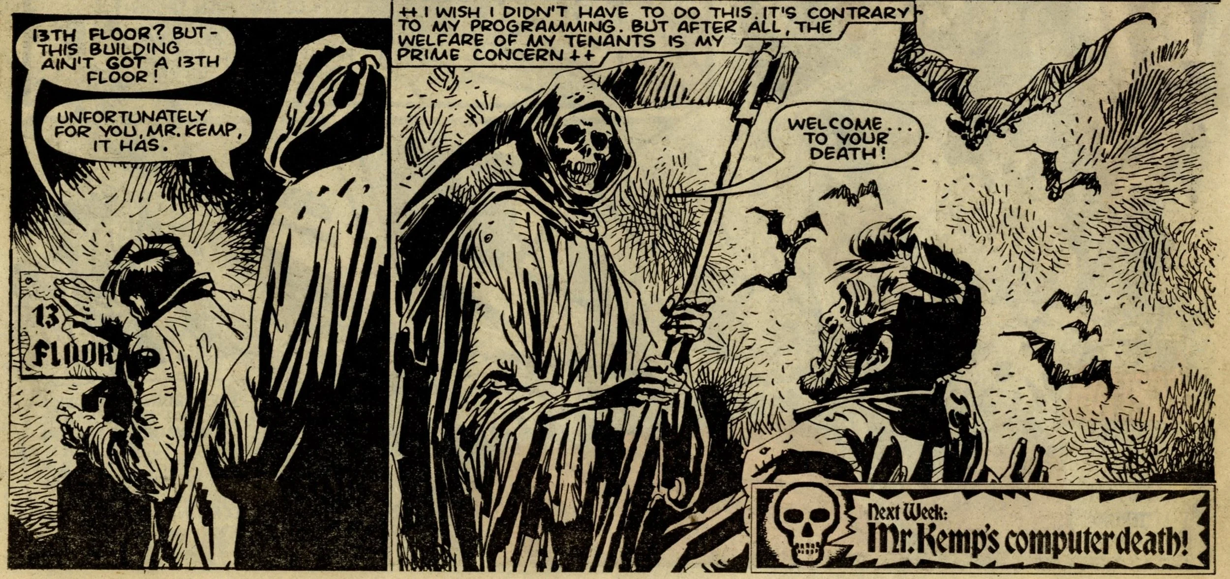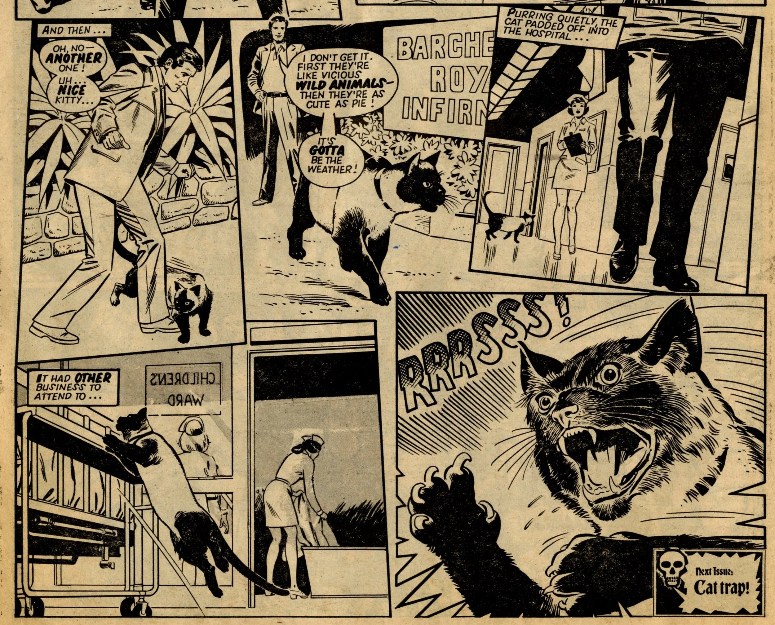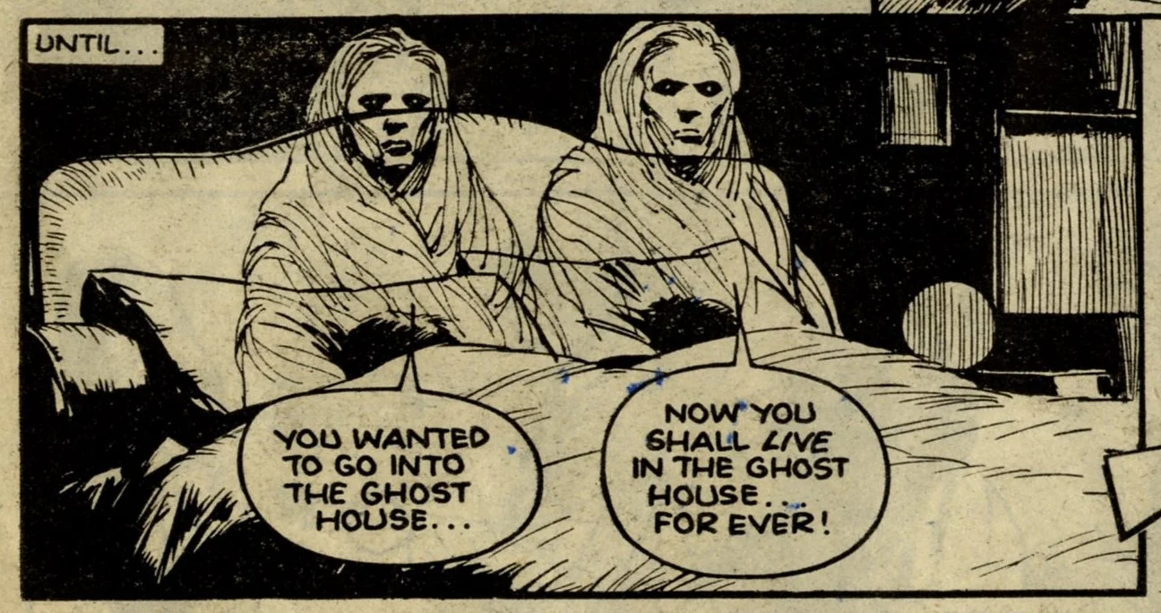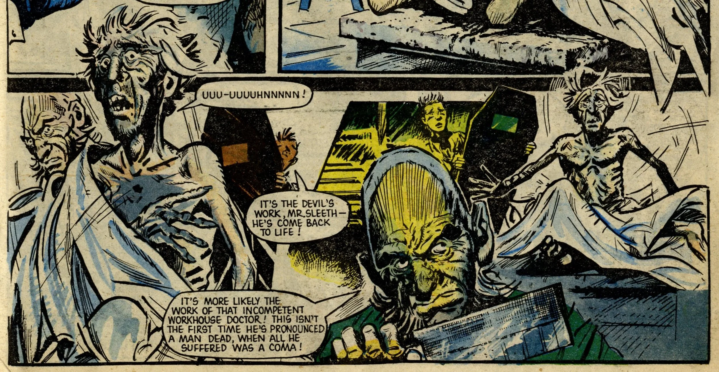 There’s a fog of mystery surrounding the cancellation of Scream! after just 15 issues. It was one of the many IPC titles removed from production in response to the NUJ strike of the summer of 1984, but never reappeared as a standalone title (only as a low-key merger with Eagle). It’s possible that its readership numbers were considered too weak to justify bringing it back after the strike. If that’s true then I would suggest it was indicative of a declining comics market rather than the fault of poor content, as this was quality material. It’s also been mooted that IPC’s higher-level management cancelled the comic because they felt nervous about the horror comic. These were the days of hysterical ‘video nasty’ pontification in the British tabloid press, leading to the passing of the Video Recordings Act in July. Both Barrie Tomlinson and Ian Rimmer have bemoaned the editorial interference they received from on high during the preparation of the 15 issues of Scream! that made it to press. I’d love to have seen some of what didn’t make the cut, because the comic that was produced was still quite the chiller. Feast your eyes on just some of the horrors from the first issue below …