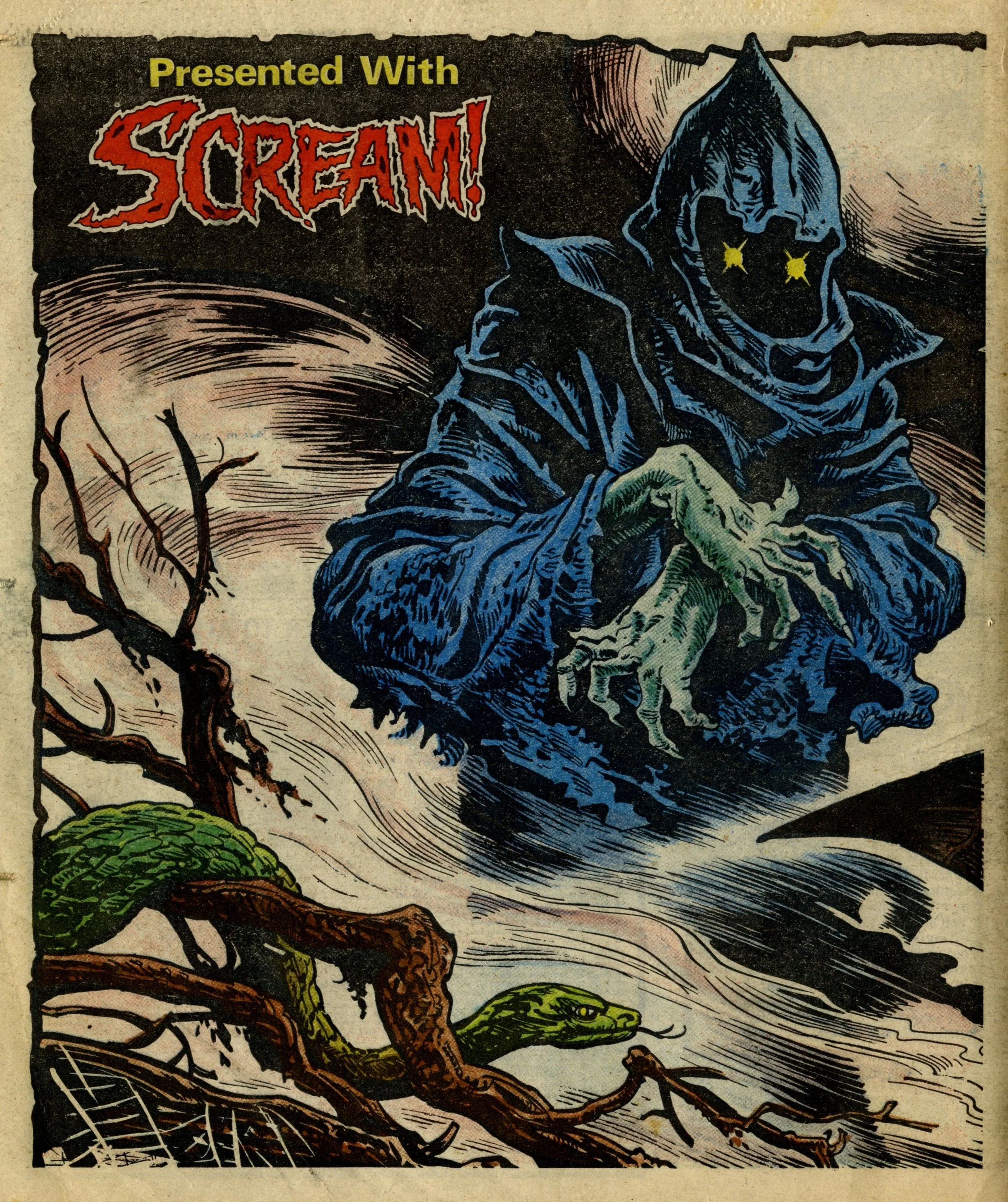 I reviewed the first issue of Scream! this time last year, but the scans were a bit dim so I thought it deserved another airing from the GNFAR crypt. Look at the colours on that busy front cover – even on my bashed-up old copy of the comic they’re still bold and eye-catching. I think I was a reader of Eagle and Roy of the Rovers at this time (aged 13, in the third year of secondary school), and starting to move away from comics – football and Fighting Fantasy gamebooks becoming my greater interests – but I do remember buying this and the first few issues of Scream! and wondering why it had taken so long for such a fantastic horror comic to reach the shelves.