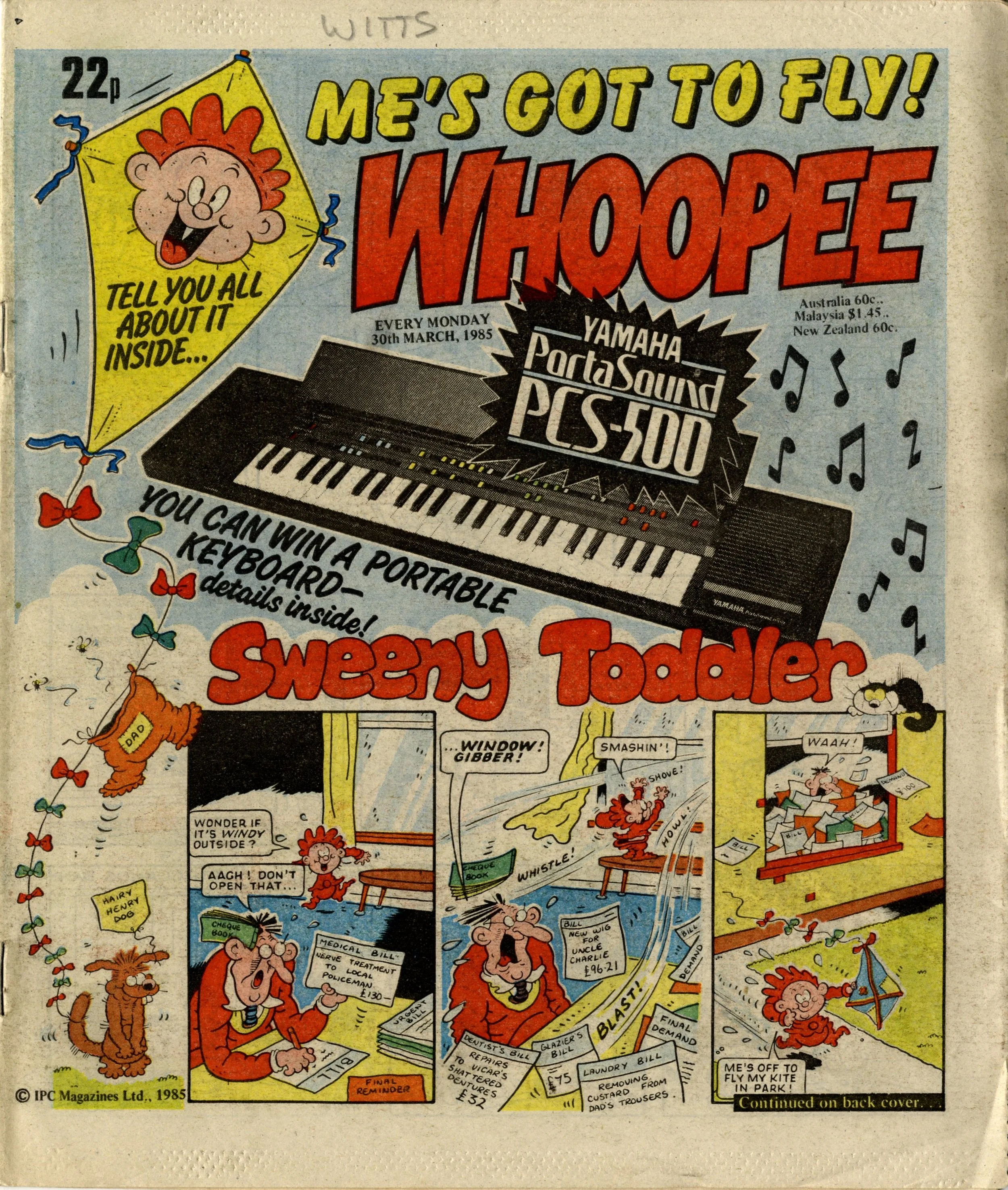 Here's the final cover of the wonderful Whoopee!, a week before its merger into Whizzer and Chips, and the two-page preview of the merge from the same comic. Tom Paterson's Sweeny Toddler would continue to thrive after the join-up, and good thing too. I love the detail in these strips, such as the types of bill being paid by the long suffering Mr Toddler.