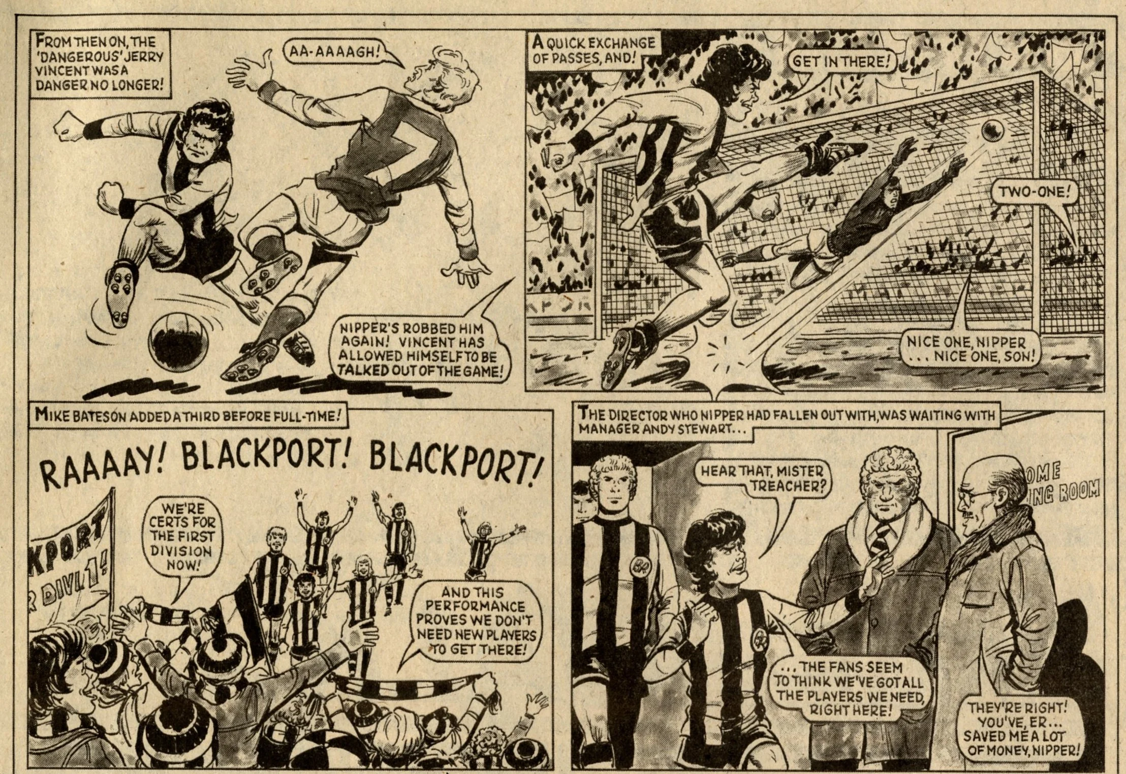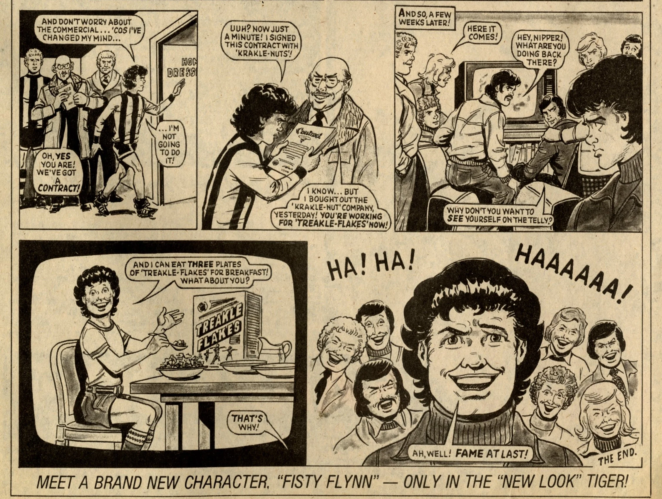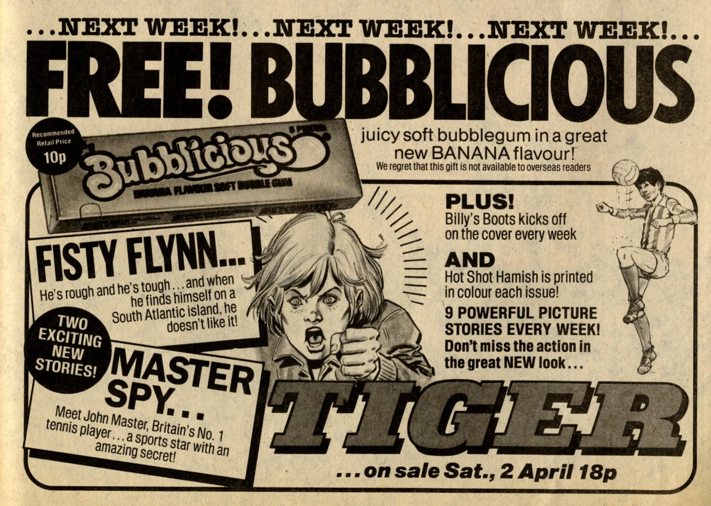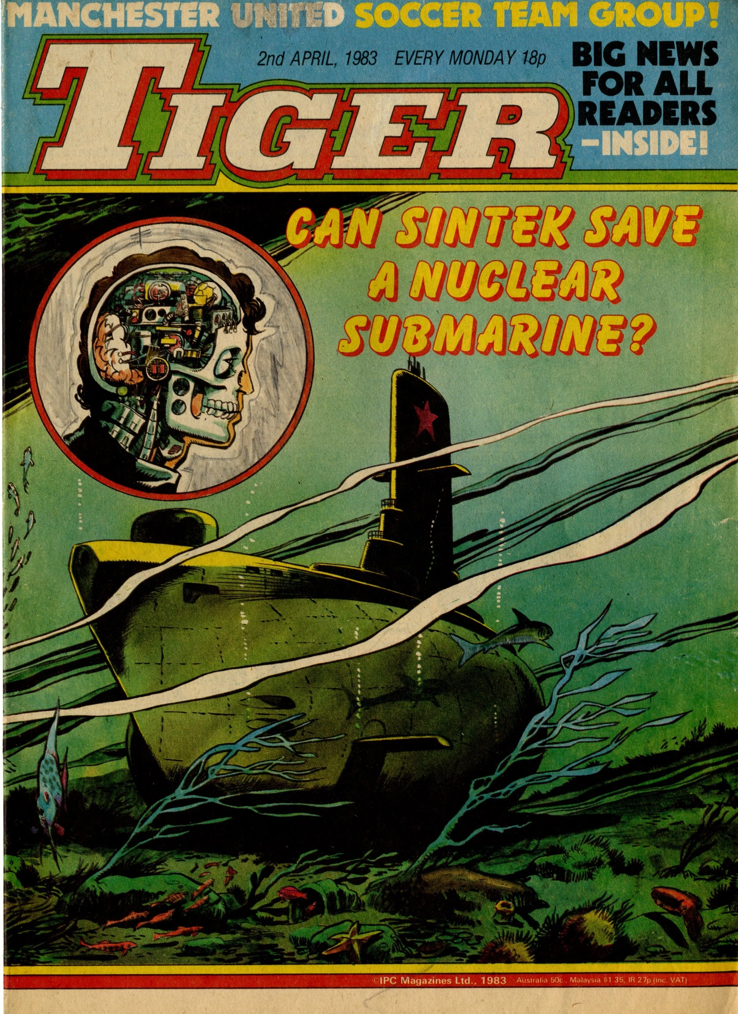 A nice cover here for Tiger, featuring Sintek – a cyborg, created by a greedy sports promoter and whose attempts to win his freedom led him into secret agent action. This issue of Tiger was the last before a minor re-vamp, which would see Billy’s Boots switch to the front cover on a regular basis, and Hot-shot Hamish printed in colour. It also marked the final episodes of two Tiger legends – Native American wrestler Johnny Cougar, who had been with the comic on an almost unbroken basis since 1962, and First Division footballer Nipper Lawrence, who started out in Scorcher in 1970 and had been with Tiger since those two comics merged in 1974. I think its fair to say that both characters were products of their day, and the sports scene of the 1980s demanded different types of heroes, but they were memorably written and drawn, and much-loved.