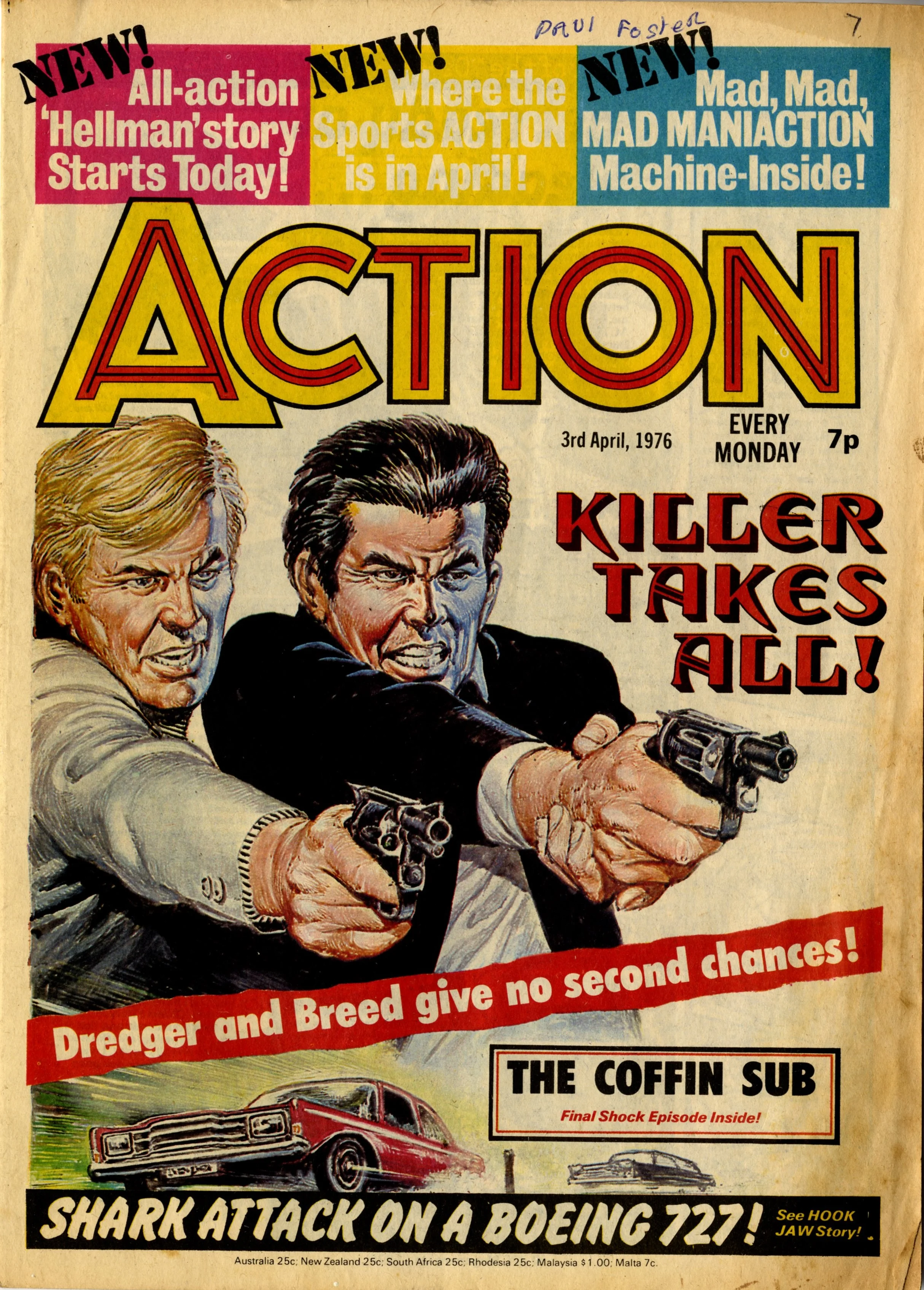 Pulp Action with Dredger. Thank you to everyone on Twitter who identified Don Lawrence as the artist, and to Dene Kernohan for identifying the still from The Sweeney on which the artwork was undoubtedly based.