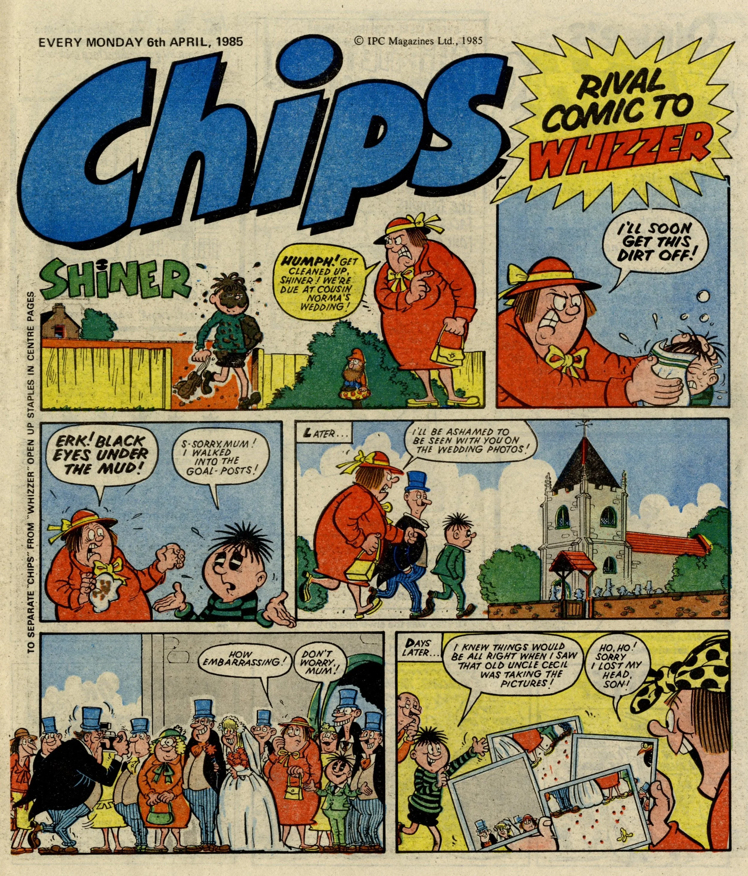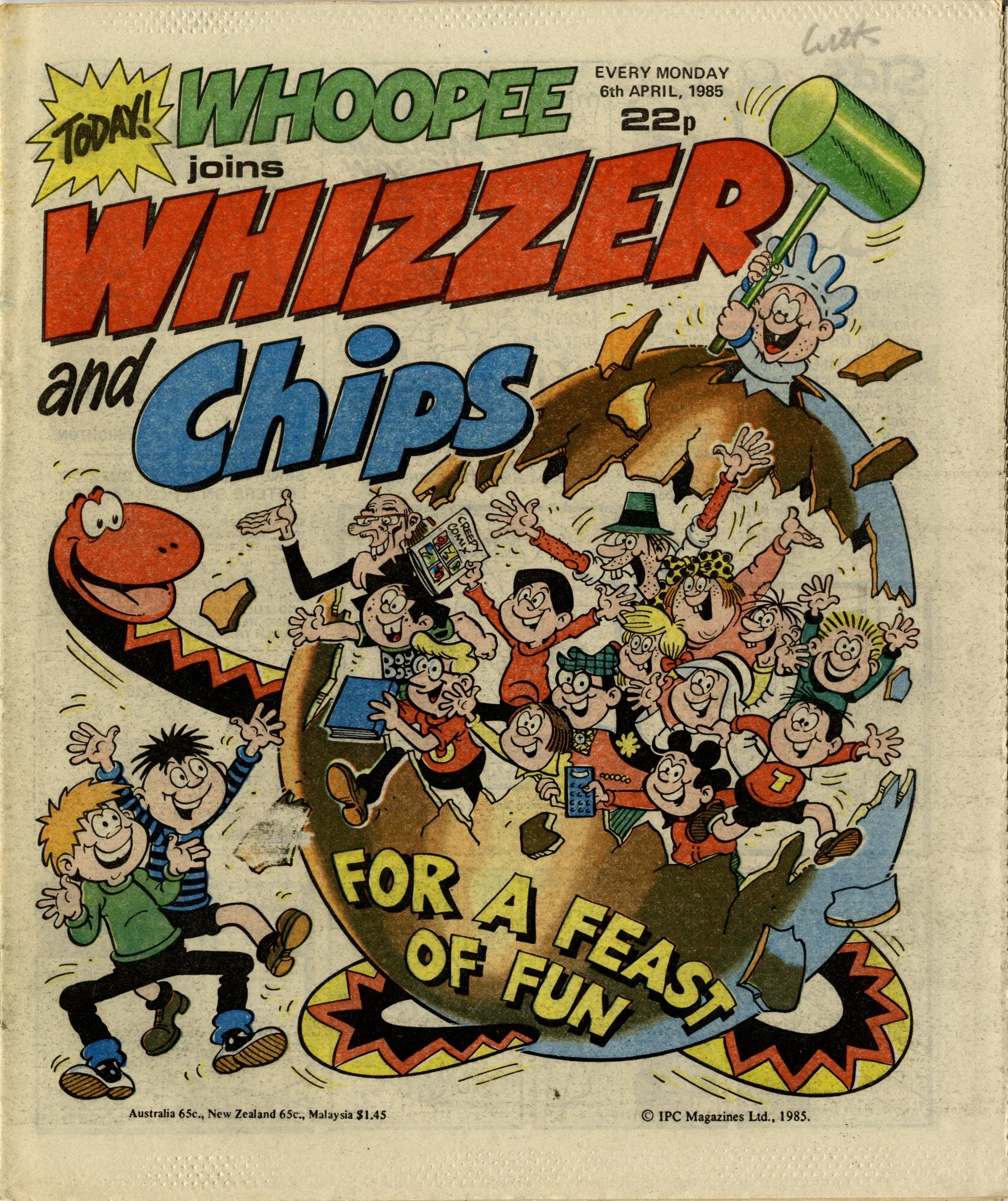 On this day, 6 April 1985 ... This is a sadhappy comic. It's sad because it marks the relegation of Whoopee! – at its late 1970s peak, in my opinion, the very best of all IPC's humour comics – to a supporting role, merged into a fellow classic, Whizzer and Chips. And sad too because I think it's a sign of the declining market for this particular brand and style of humour comic that had been so popular among kids for so much of the twentieth century.