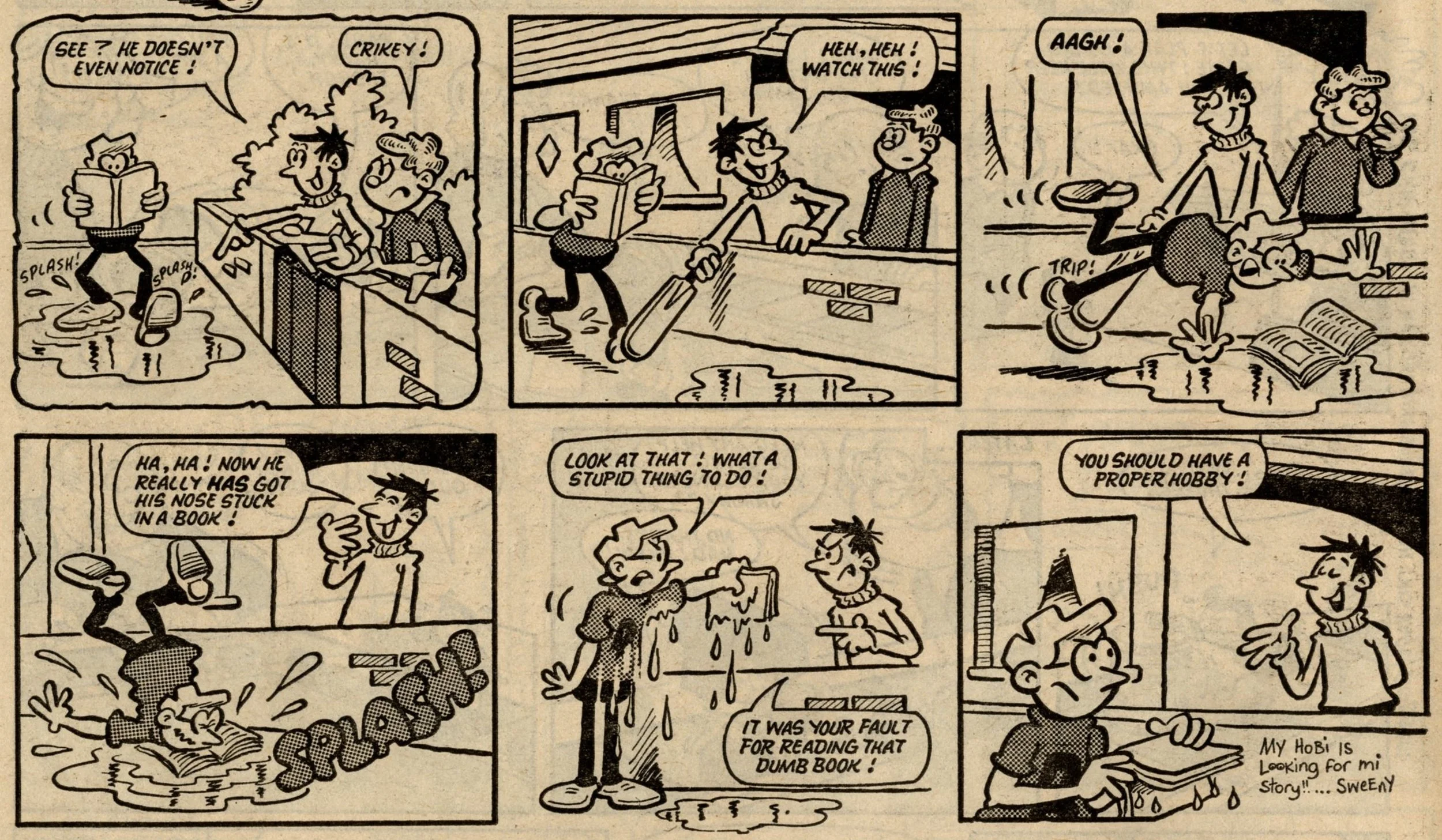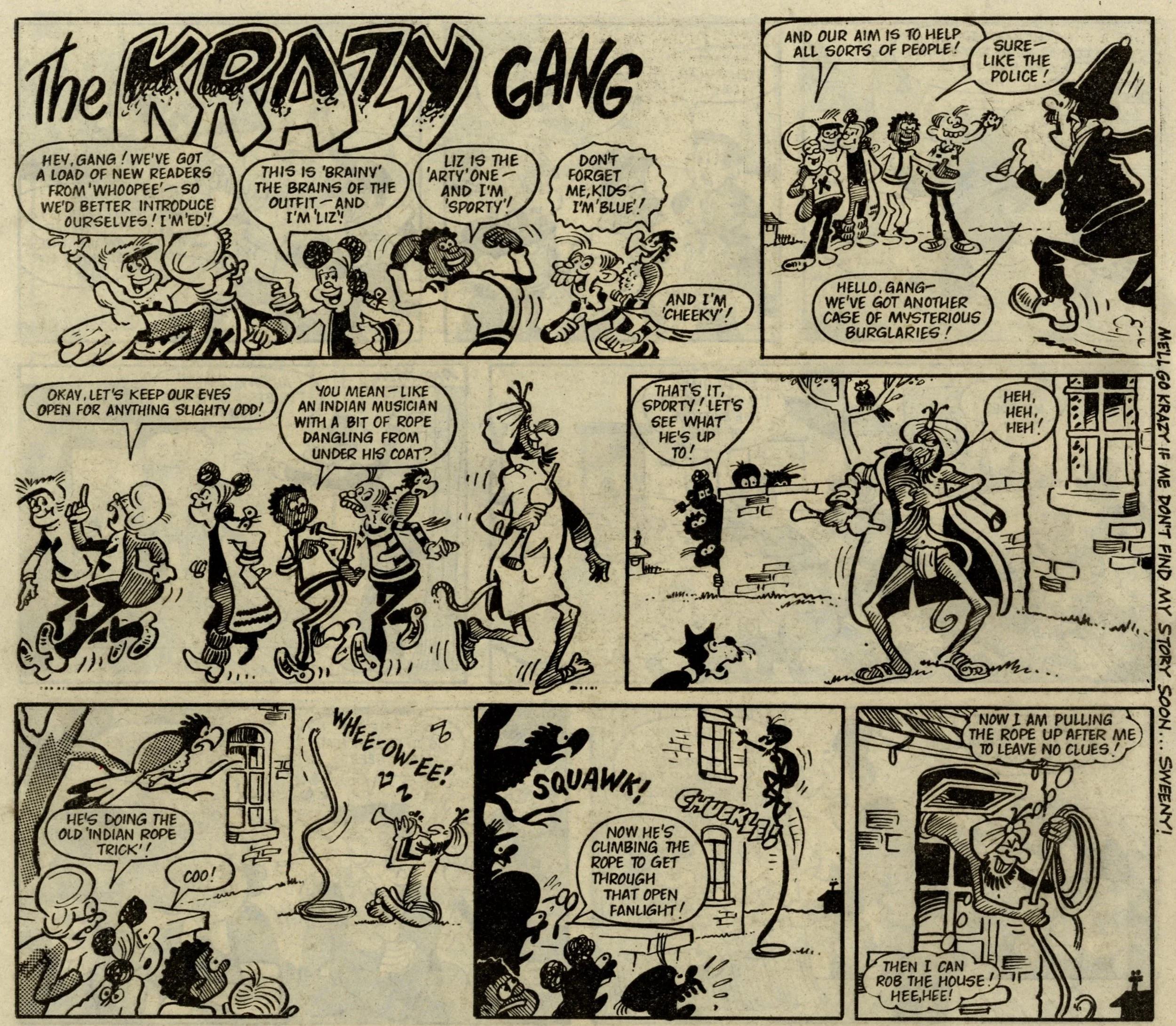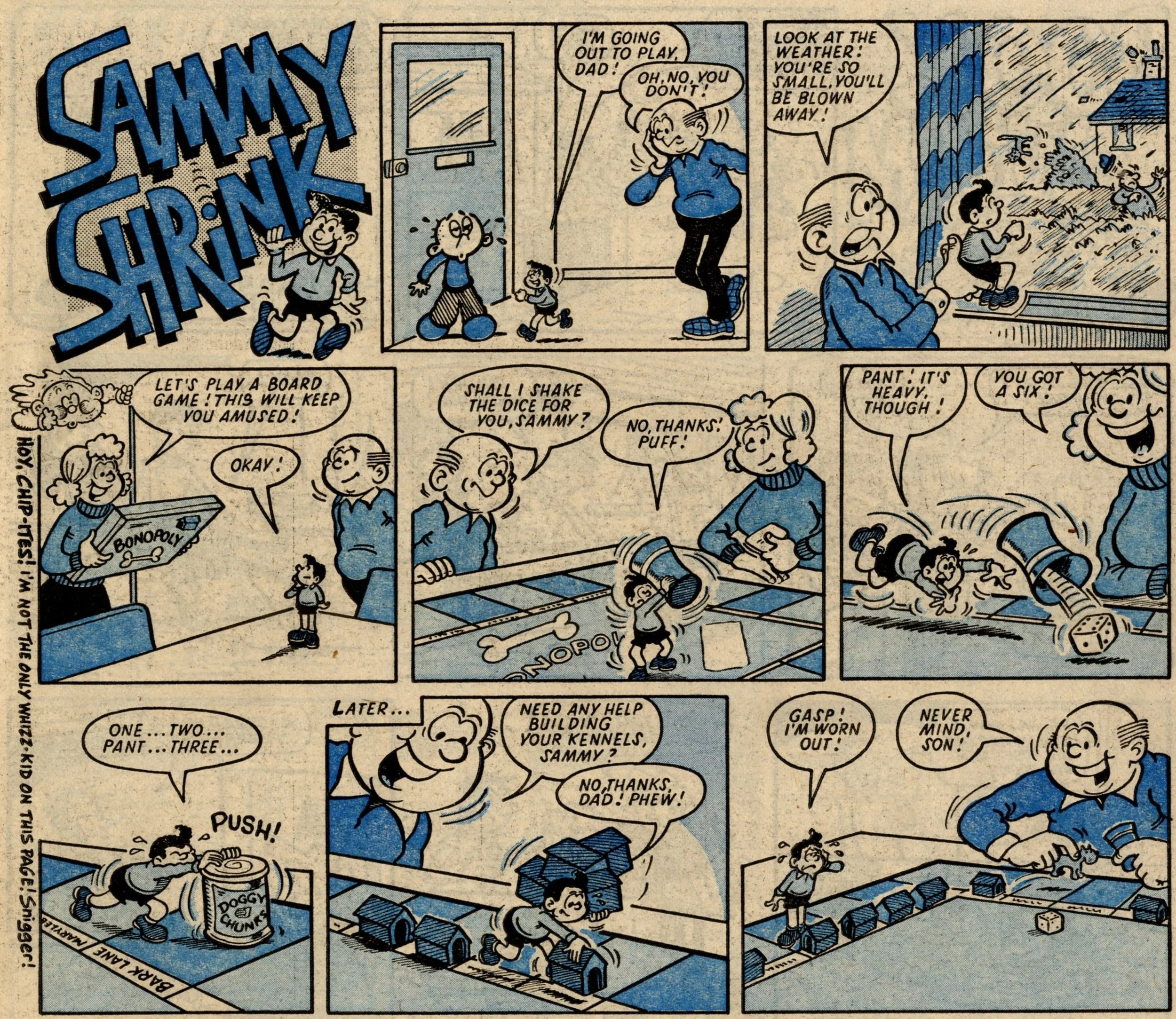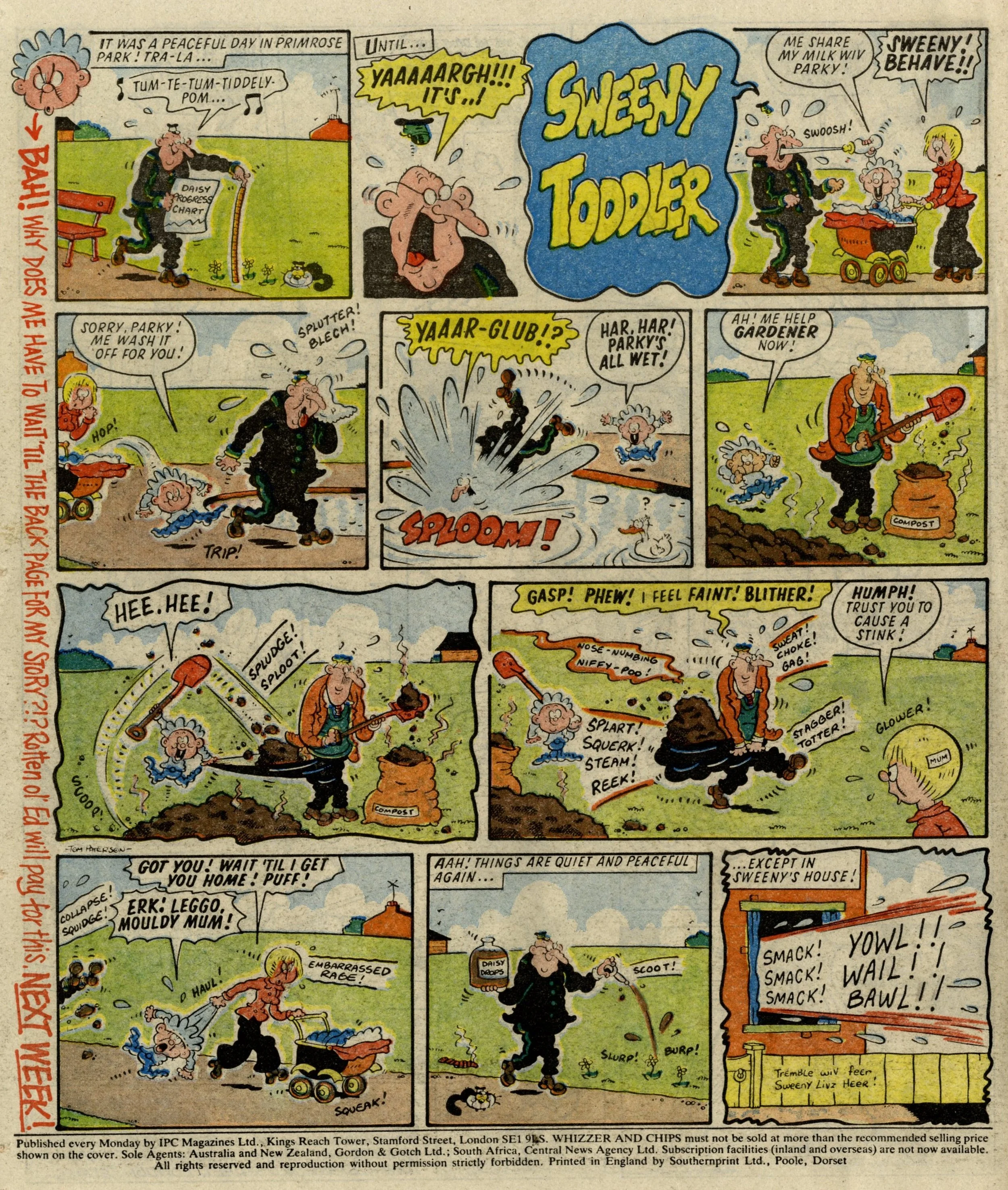 The story of this issue is the introduction and division of various favourite Whoopee! strips into the ranks of Whizz-kids and Chip-ites. Whizzer got Toy Boy, Animalad, Boy Boss, The Bumpkin Billionaires and Sweeny Toddler. Chips got Lolly Pop, Book Worm, Calculator Kid, Mustapha Million and Creepy Comix. The process is given some extra spice by a couple of cheeky raids by Whizz-kids and Chip-ites into each other's pages, and Sweeny, the demon baby, making a nuisance of himself throughout – quite literally as a marginal character – until he finally gets his own story on the back page.