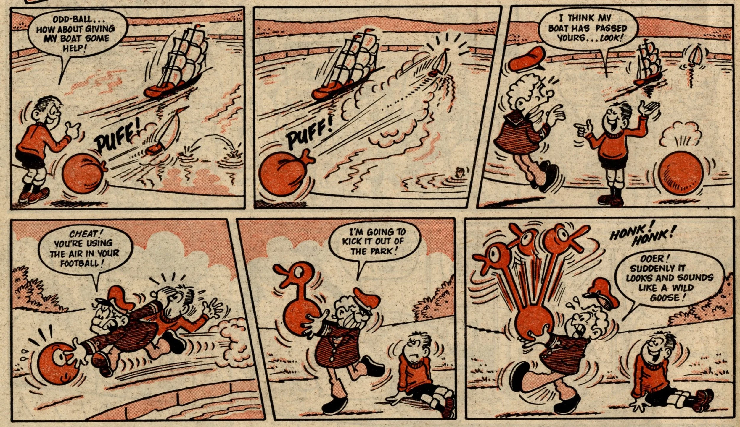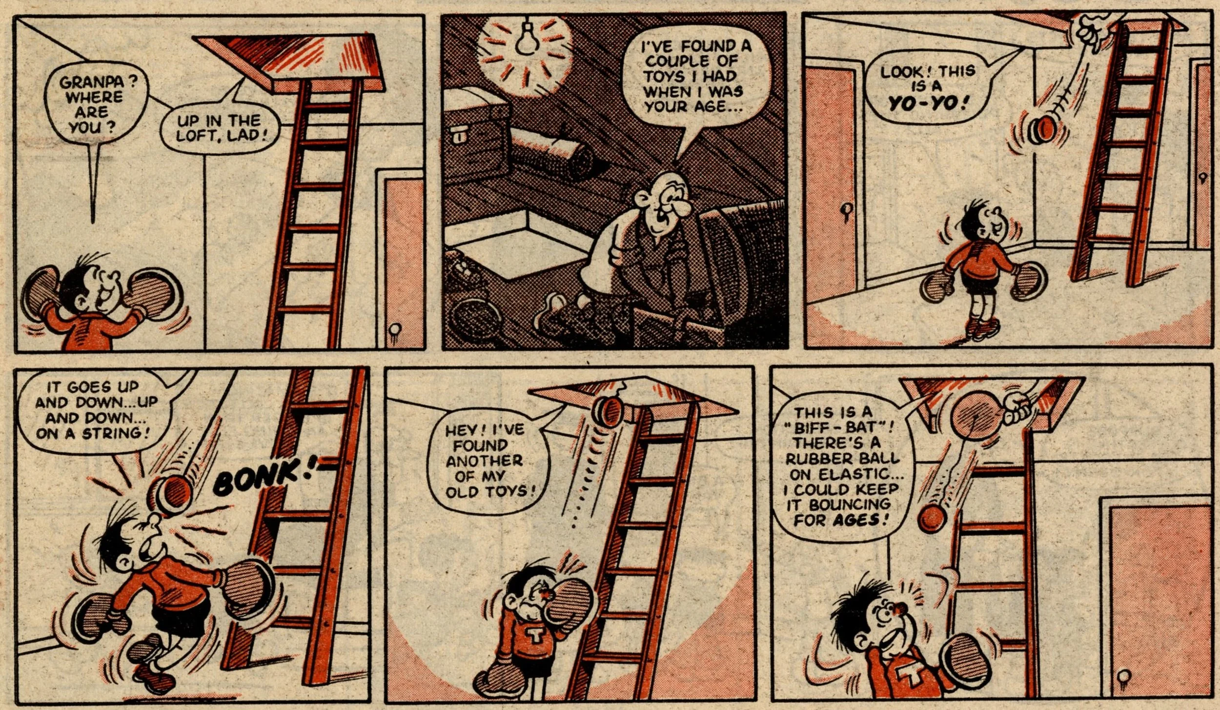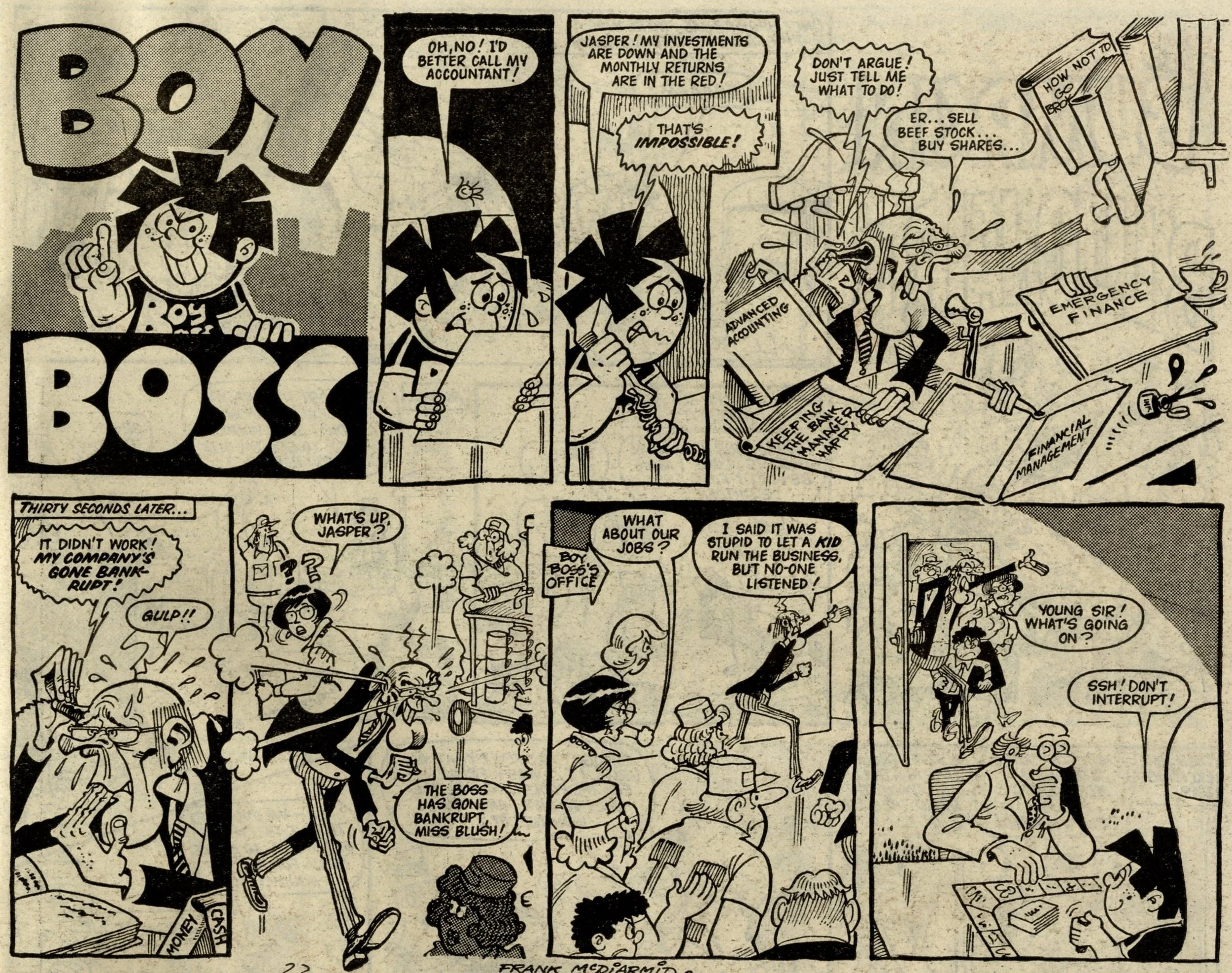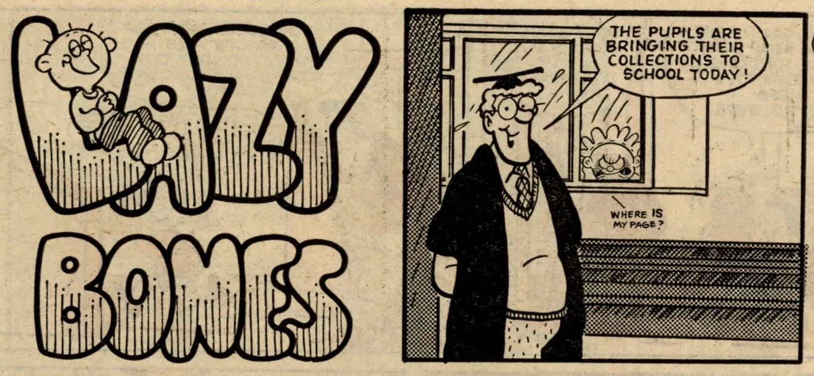 The story of this issue is the introduction and division of various favourite Whoopee! strips into the ranks of Whizz-kids and Chip-ites. Whizzer got Toy Boy, Animalad, Boy Boss, The Bumpkin Billionaires and Sweeny Toddler. Chips got Lolly Pop, Book Worm, Calculator Kid, Mustapha Million and Creepy Comix. The process is given some extra spice by a couple of cheeky raids by Whizz-kids and Chip-ites into each other's pages, and Sweeny, the demon baby, making a nuisance of himself throughout – quite literally as a marginal character – until he finally gets his own story on the back page.