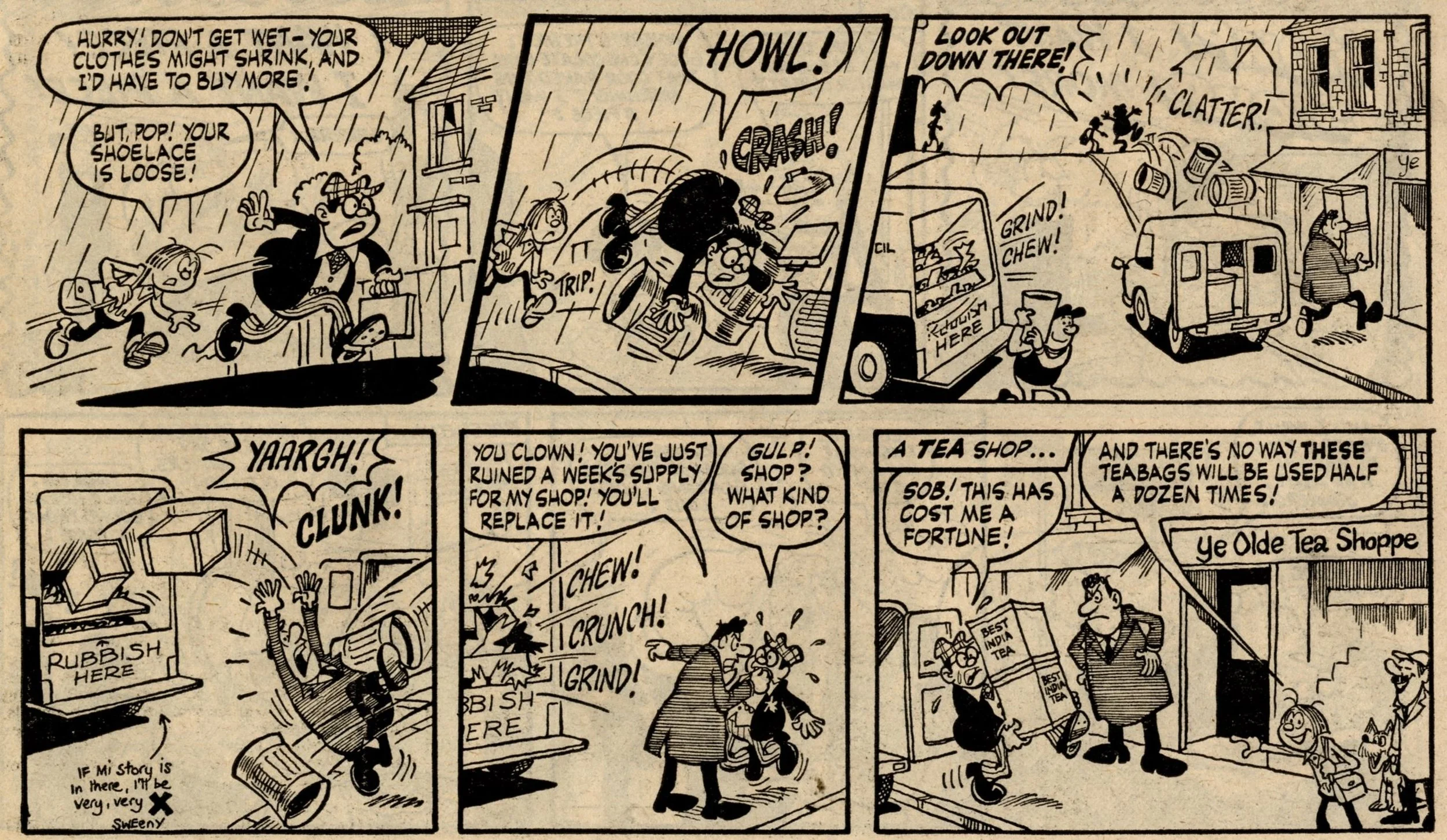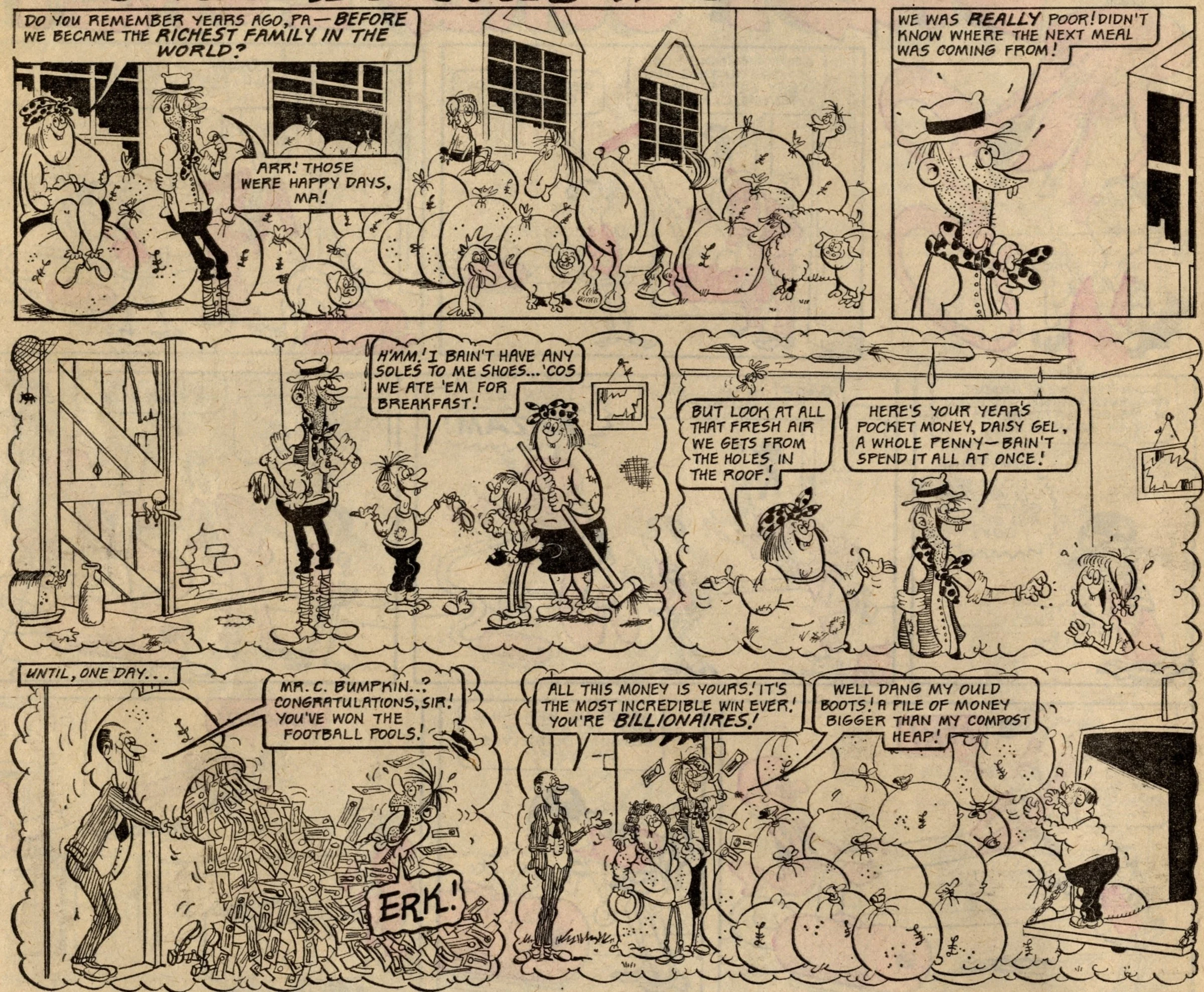 Another item of note in this comic is the third telling of The Bumpkin Billionaires’ origin story (or at least, the tale of how they came to be so rich). For interest, I’ve included below the previous two versions of their astronomical lottery win, from the first issue of Whoopee! and then the merger issue of Whoopee! and Shiver and Shake.