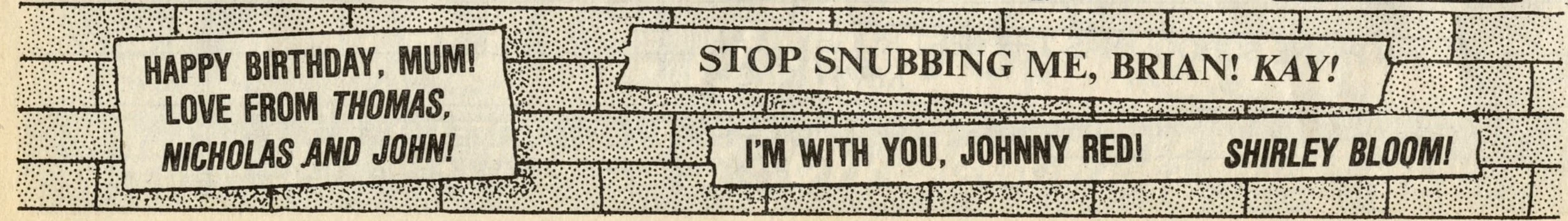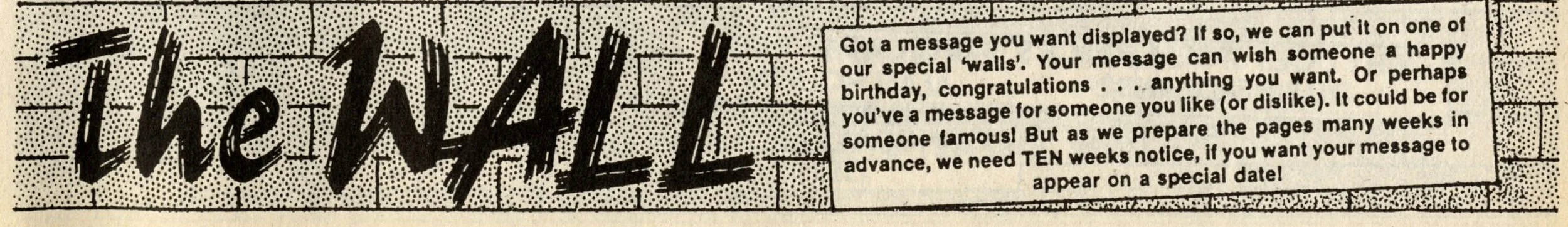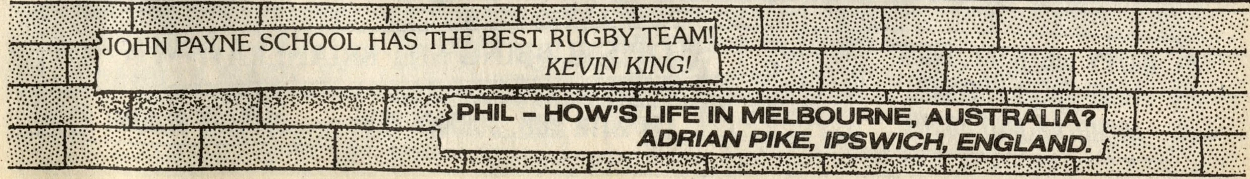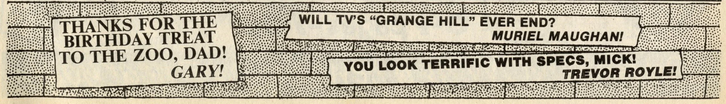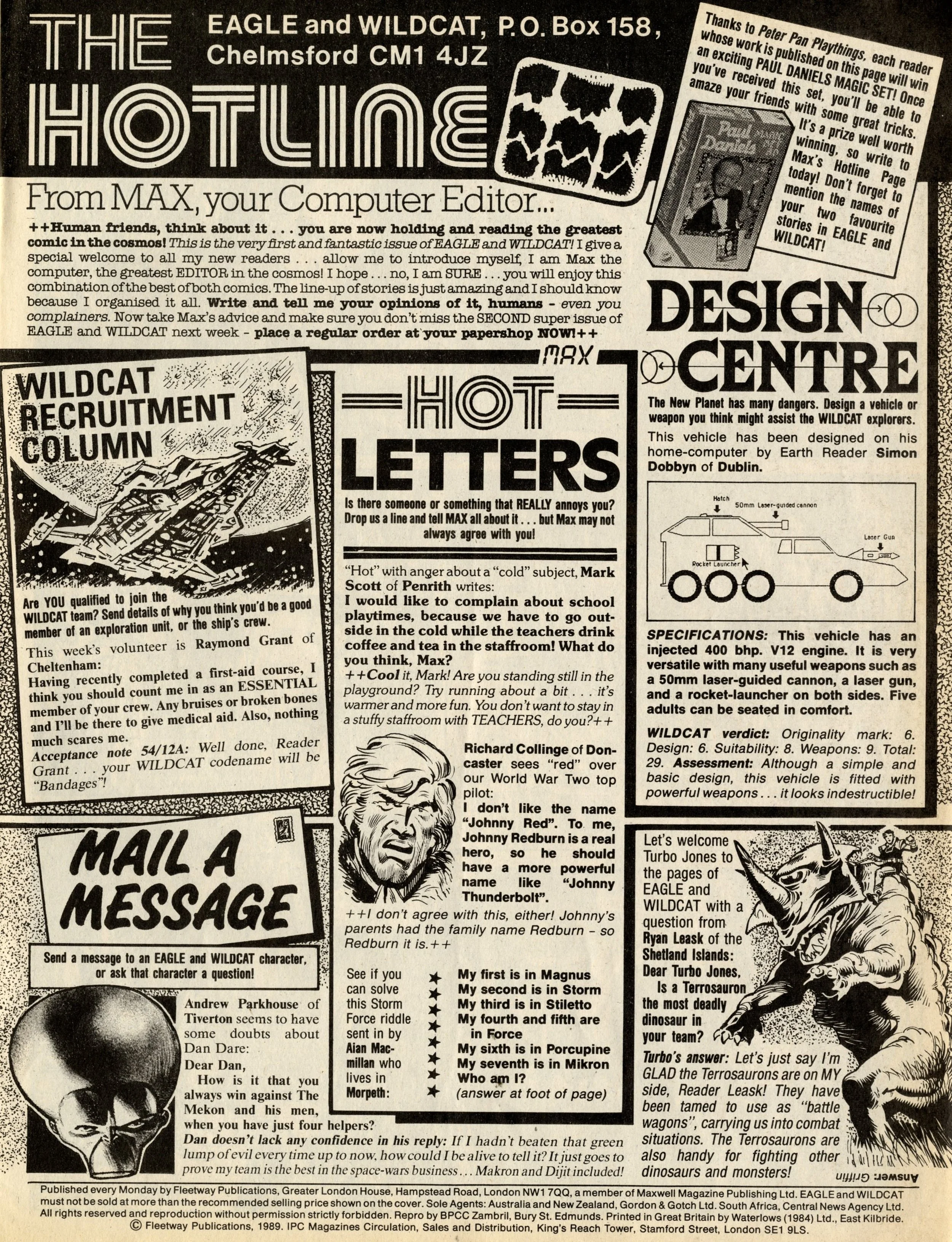 Dan Dare, Doomlord and Computer Warrior were still running strong in Eagle in the final year of the 1980s. Storm Force – which had joined after the merge with Battle a year previously – was the other original strip, and the comic was completed by reprints of two classic Battle favourites, Charley’s War and Johnny Red. By now, Eagle, like most of the Fleetway Publications range, had a slightly-wider-than-A4 format which didn’t scale up from the traditional IPC tabloid size in which Charley and Johnny originally had been printed. When these reprints first started to appear they were noticeably and awkwardly vertically-stretched to fit the page. The editorial team’s solution to this problem was to run along the base of each page of these strips a feature called The Wall – essentially a pre-digital Twitter for which readers sent in their brief exclamations of commentary on life or messages for friends and family. There was a ten-week notice period before messages could appear, but as The Wall had started in early January 1989, there is a good chance that those shown here are from actual readers rather than made up by Eagle staff.