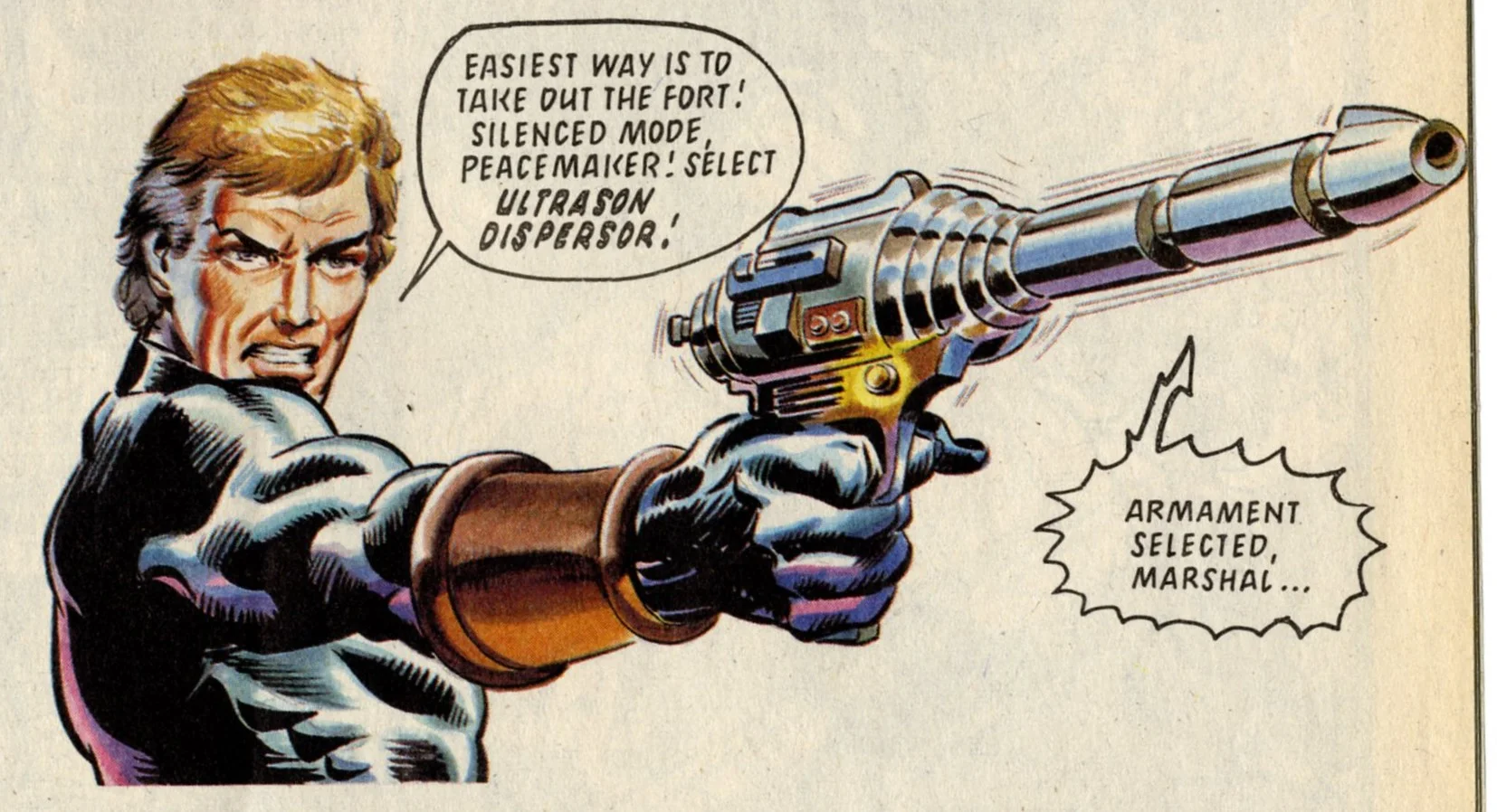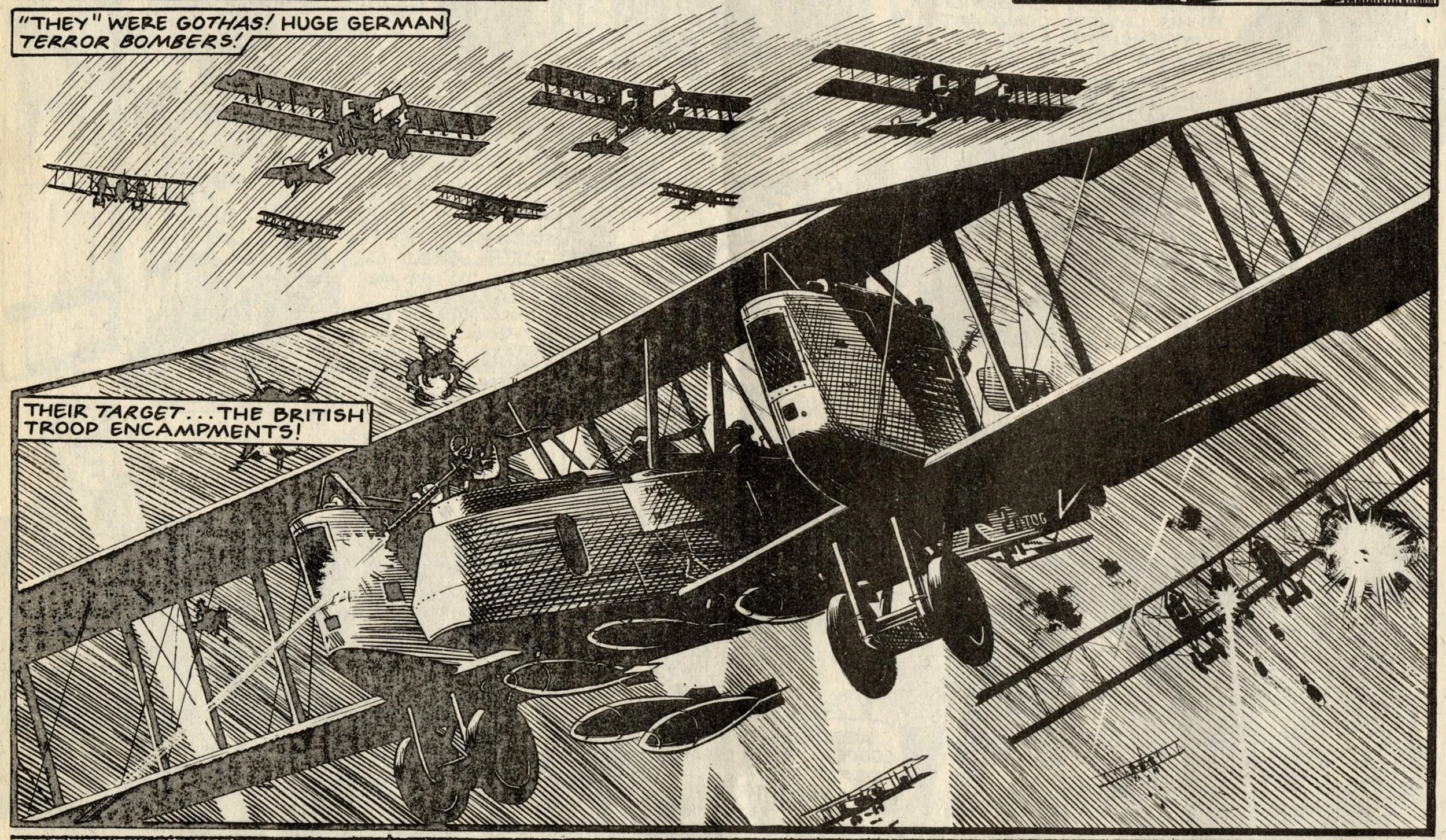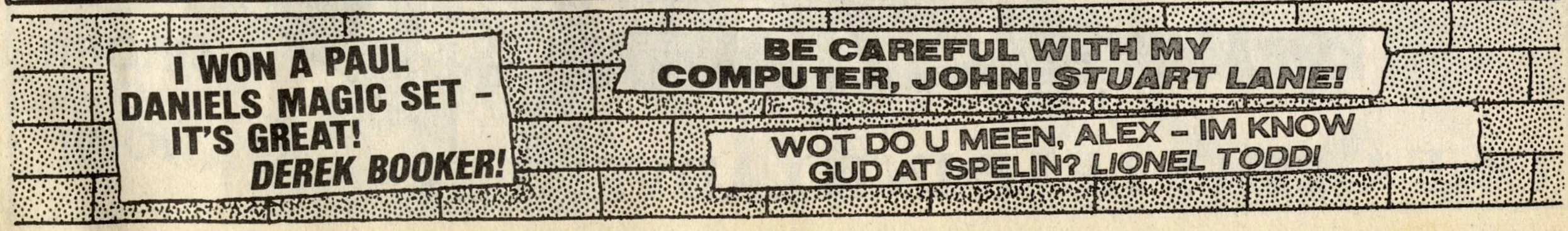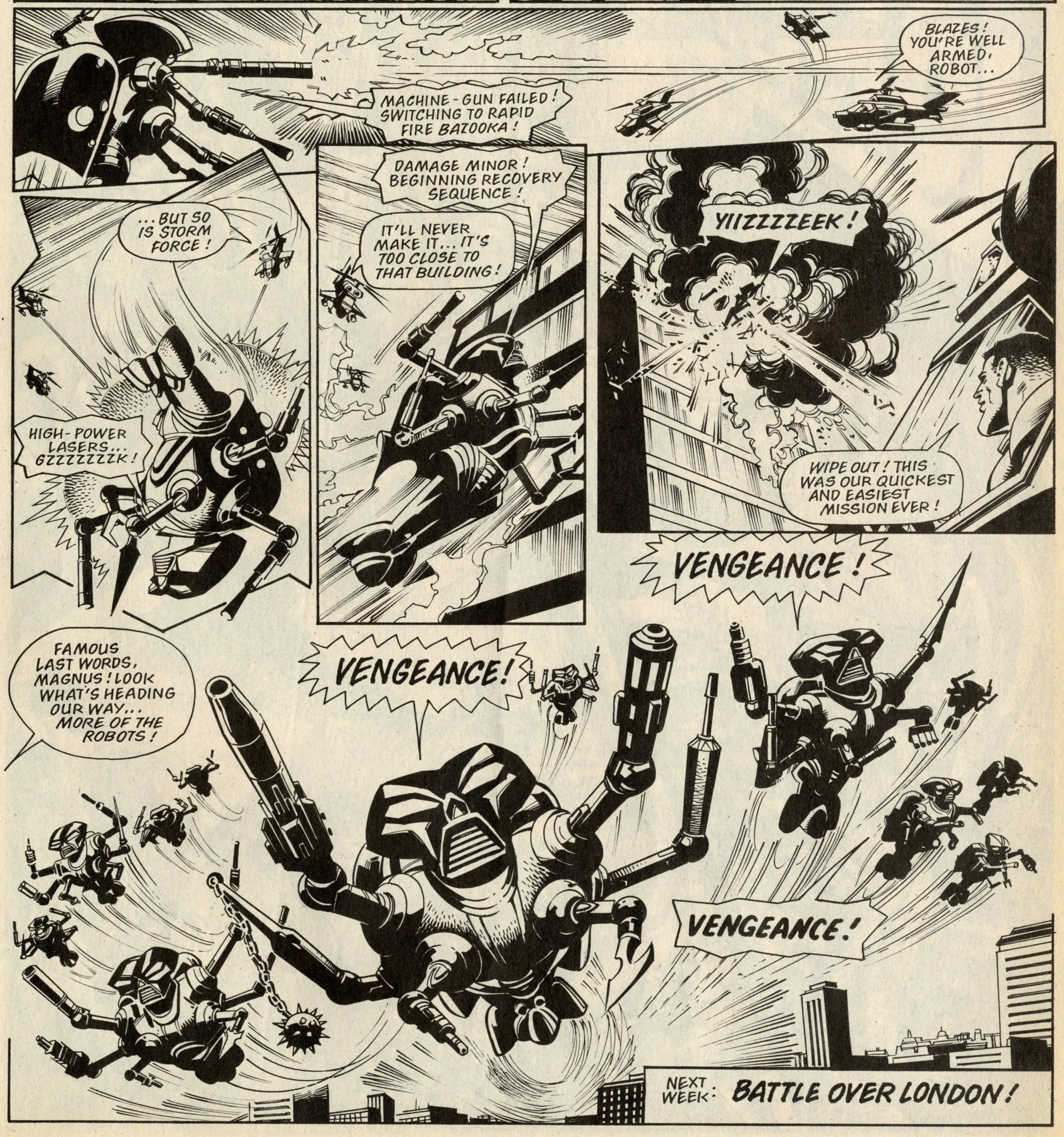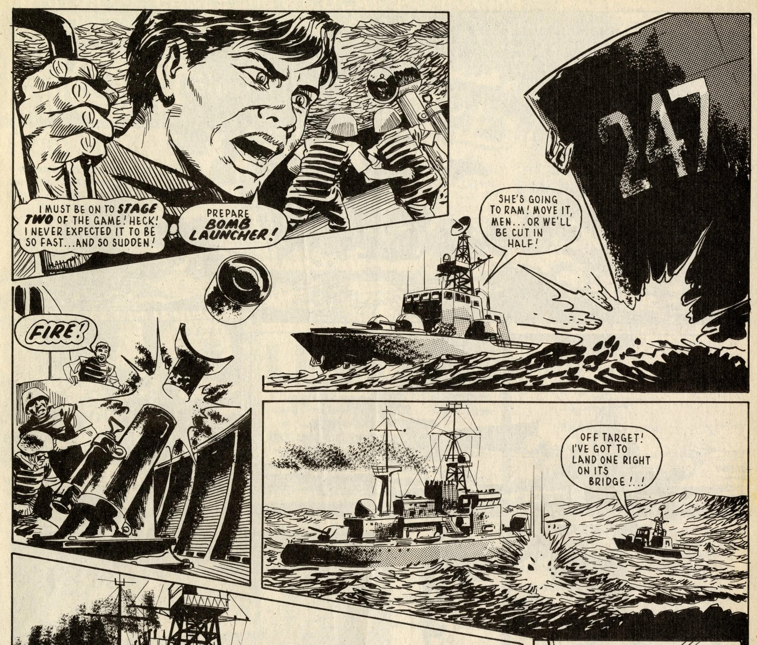 Dan Dare, Doomlord and Computer Warrior were still running strong in Eagle in the final year of the 1980s. Storm Force – which had joined after the merge with Battle a year previously – was the other original strip, and the comic was completed by reprints of two classic Battle favourites, Charley’s War and Johnny Red. By now, Eagle, like most of the Fleetway Publications range, had a slightly-wider-than-A4 format which didn’t scale up from the traditional IPC tabloid size in which Charley and Johnny originally had been printed. When these reprints first started to appear they were noticeably and awkwardly vertically-stretched to fit the page. The editorial team’s solution to this problem was to run along the base of each page of these strips a feature called The Wall – essentially a pre-digital Twitter for which readers sent in their brief exclamations of commentary on life or messages for friends and family. There was a ten-week notice period before messages could appear, but as The Wall had started in early January 1989, there is a good chance that those shown here are from actual readers rather than made up by Eagle staff.